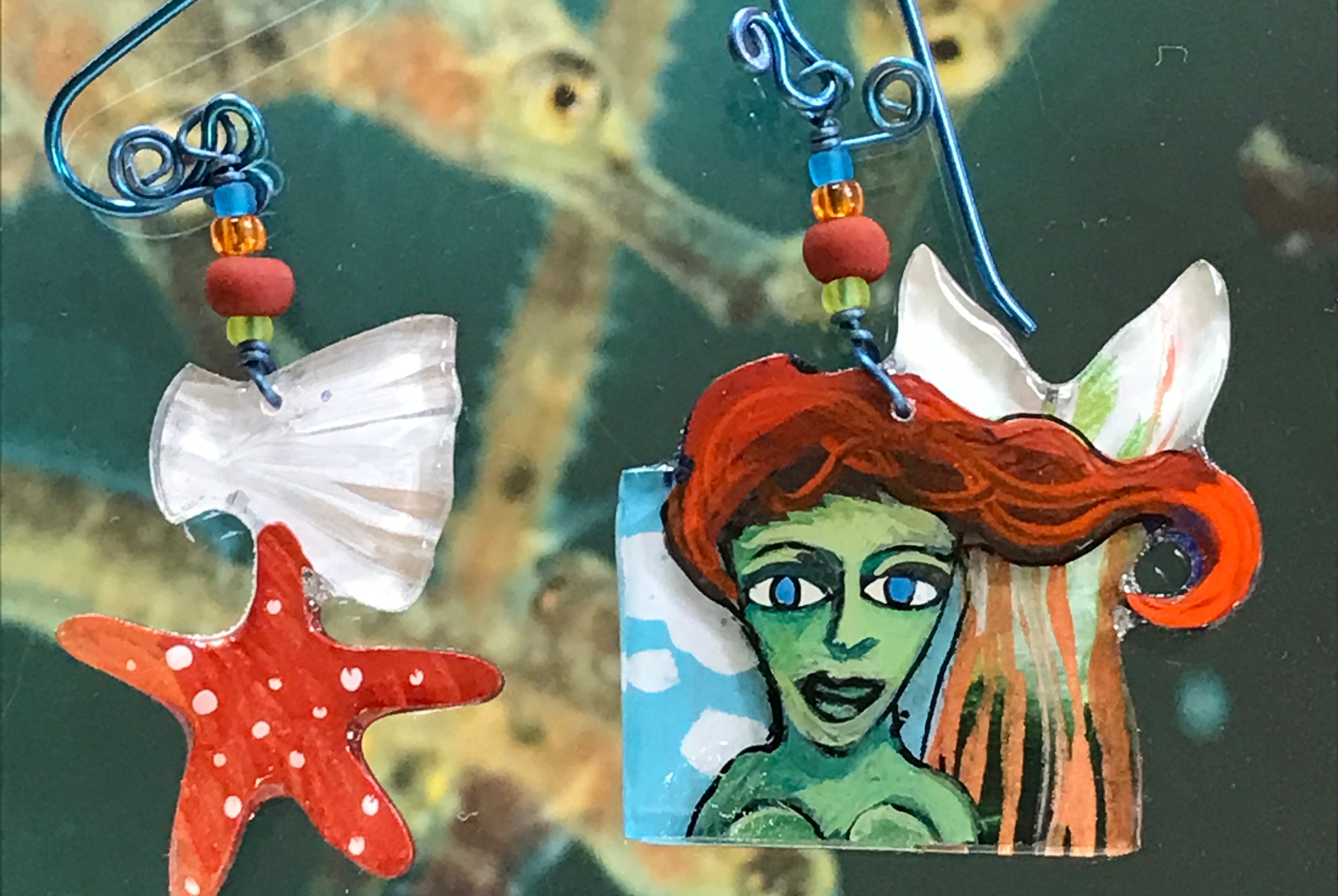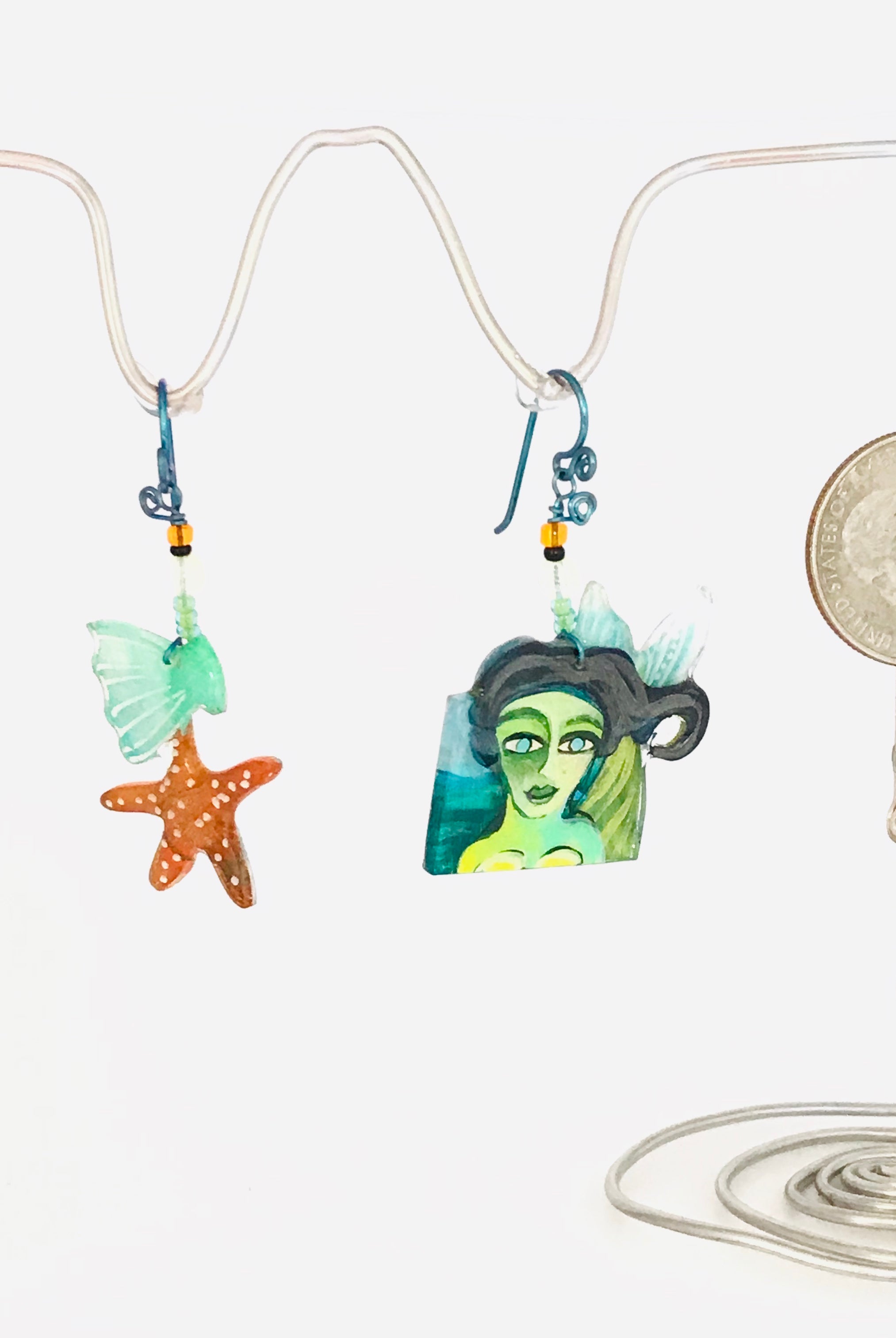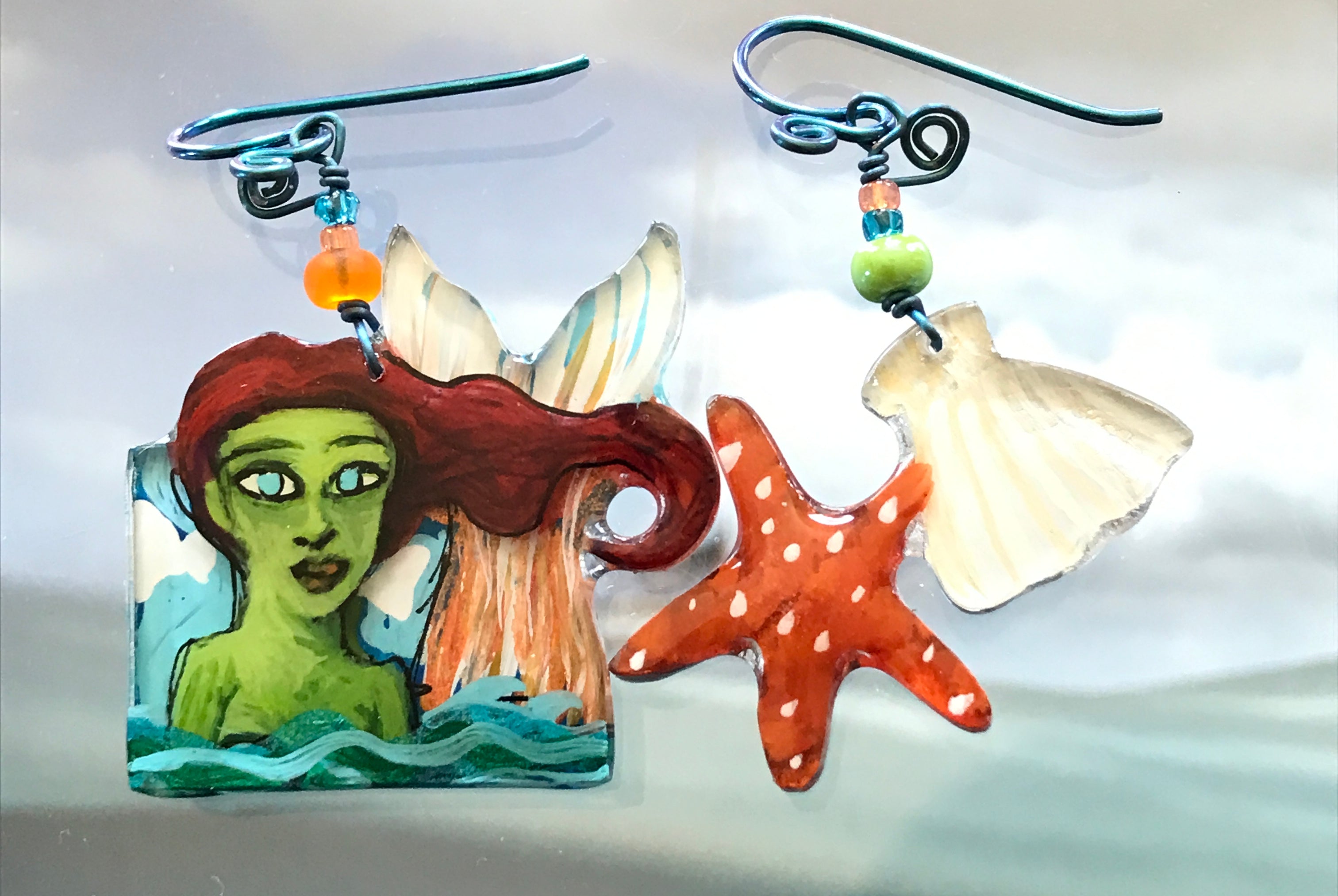 The handpainted earrings are the most challenging. Making a little painting in such a tiny place! But the results are so satisfying. Most all of the ear wires are made of Niobium, a metal all on its own on the Periodic Scale. They are safer for sensitive ears, than gold or silver. A few are sterling silver, noted in the descriptions.