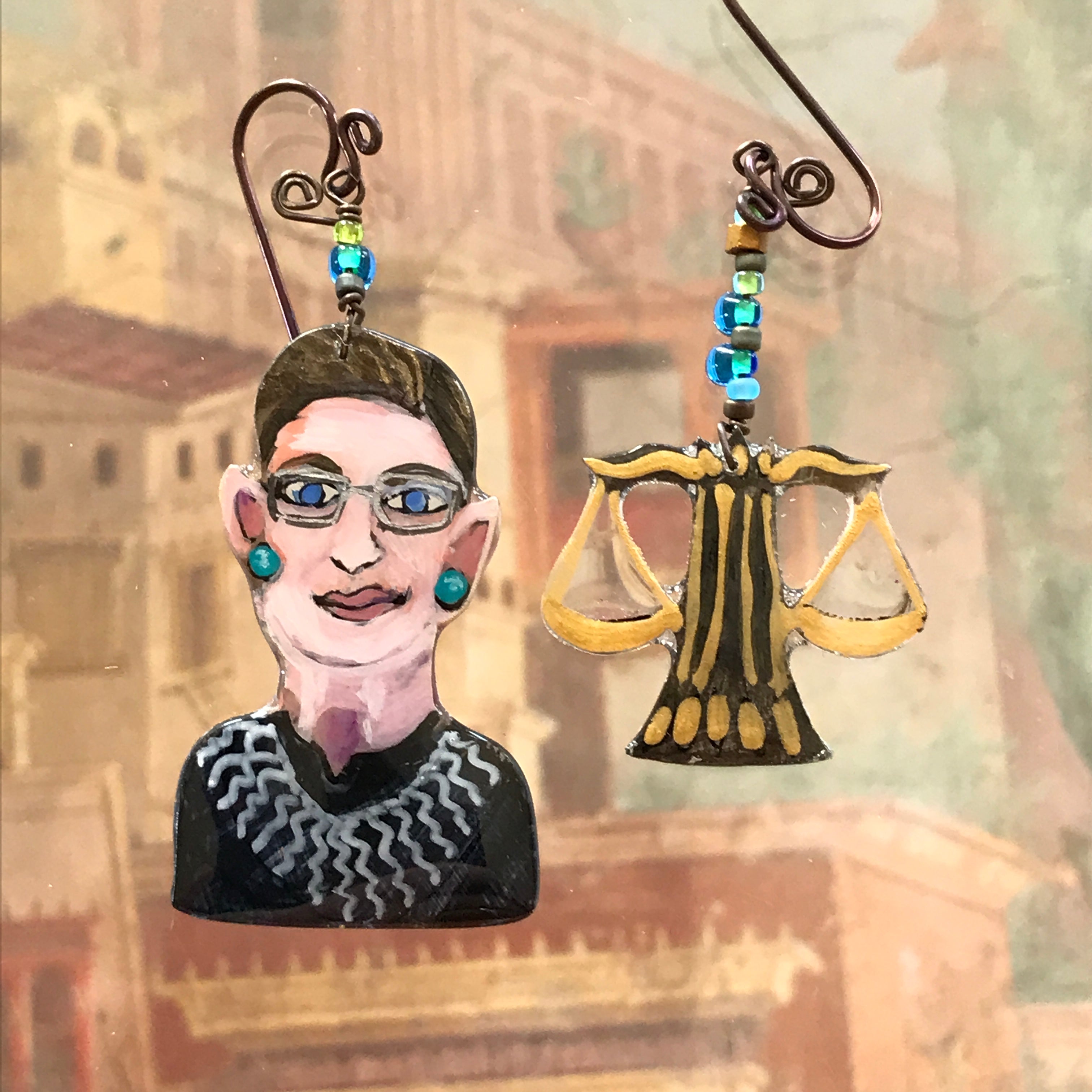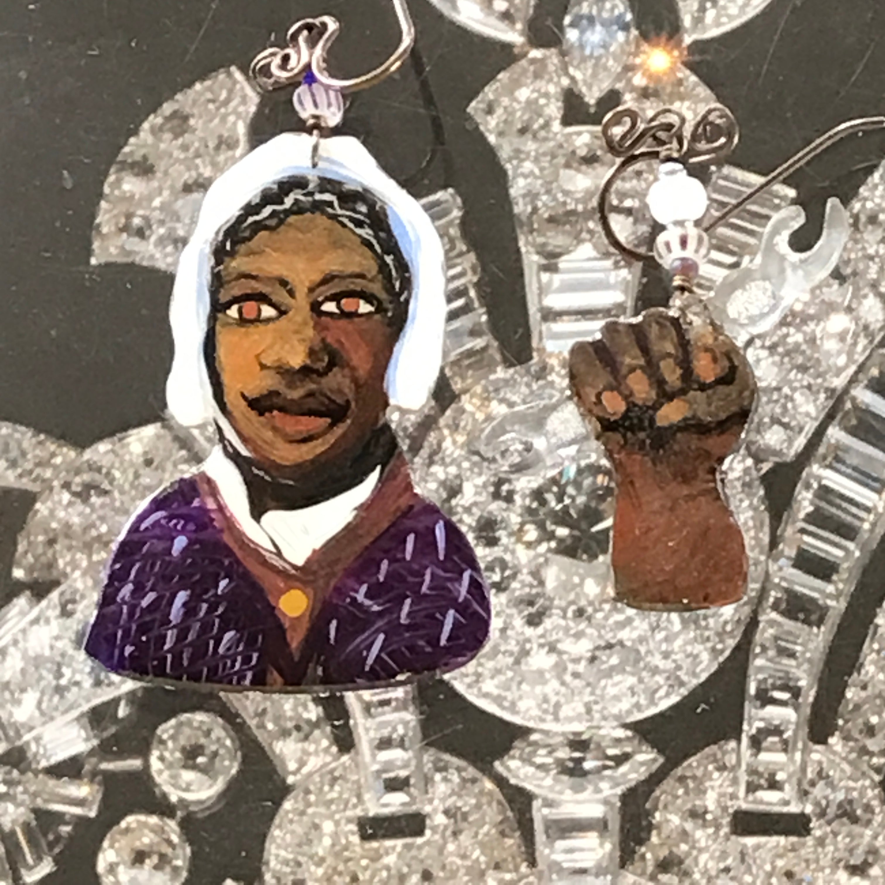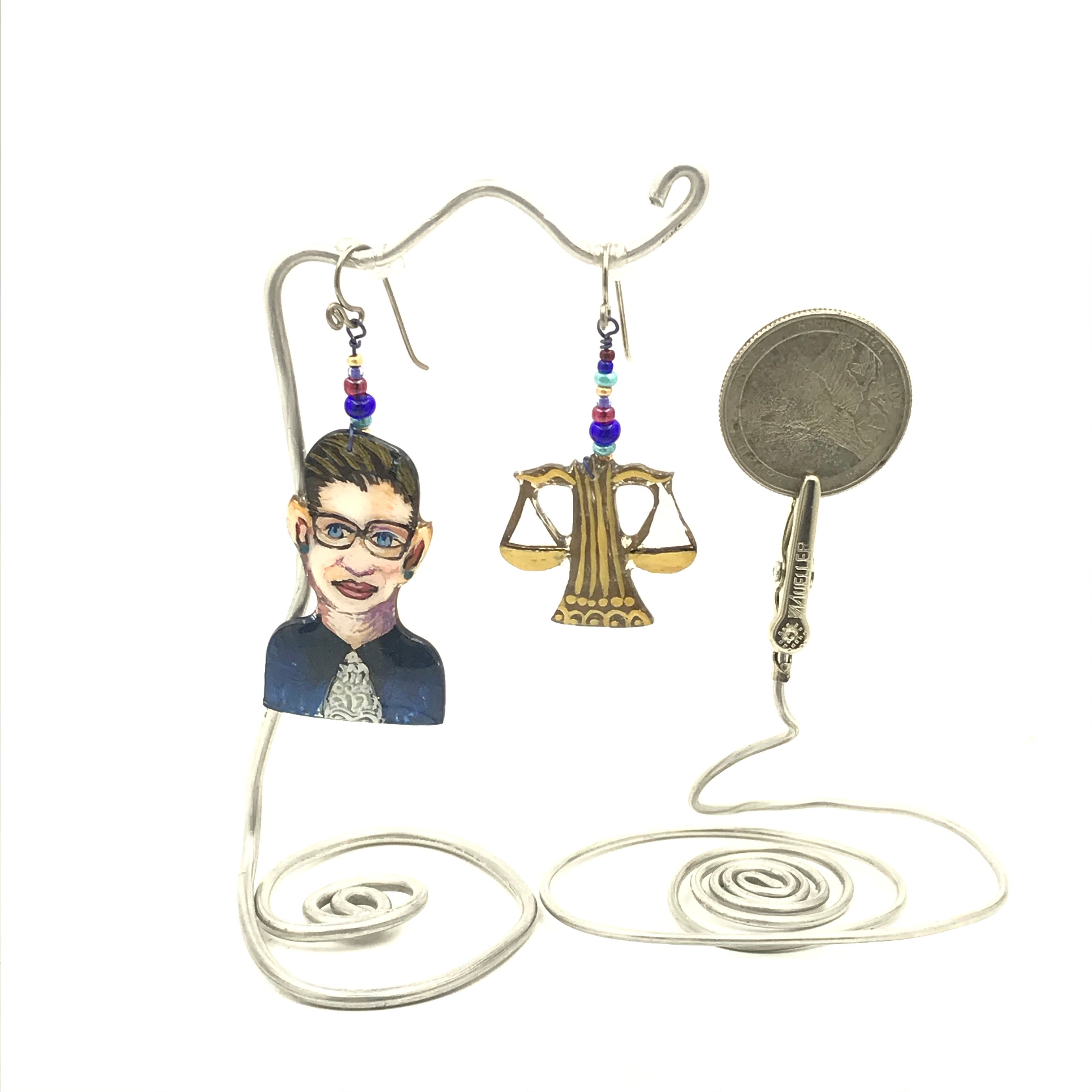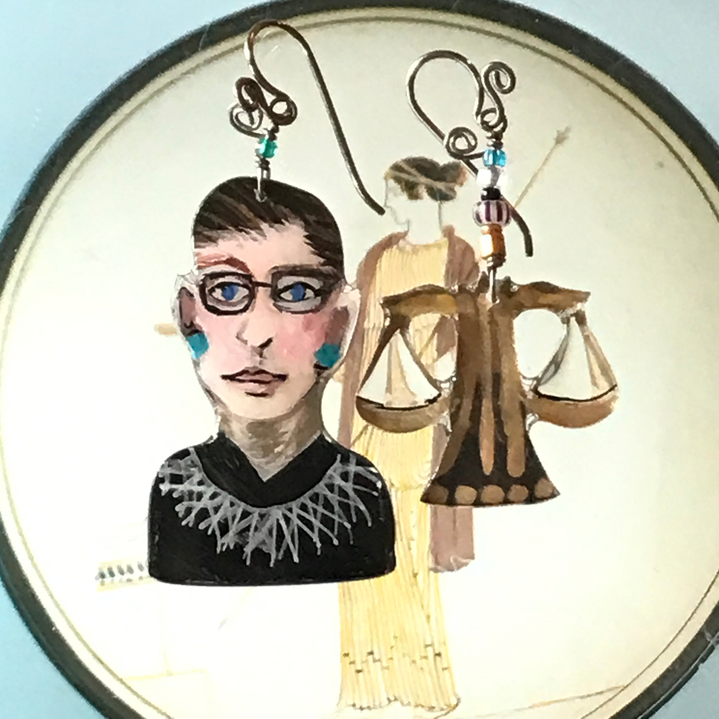 Dolores Huertas was the true leader of the Farm Labor movement. Frida Kahlo has always been an inspiration, I made this as homage to her great talent and humanity.  I believe you Anita Hill is still my mantra. Not just for her but for all women who let themselves be seen, and bravely face the music. Joan of Arc led the French Army to victory.  She heard voices that provided motivation to this diminutive woman. Sojourner Truth, along with Harriet Tubman worked tirelessly to move the enslaved out of the oppressive, racist environments that still existed after the civil war. She was a powerful writer and speaker.  She lived a long life of service to those in need. One earring is her portrait, the other a hand holding a broken chain. Ruth Bader Ginsburg, our hero from the Supreme Court. Kamala Harris, who bravely ran for president.