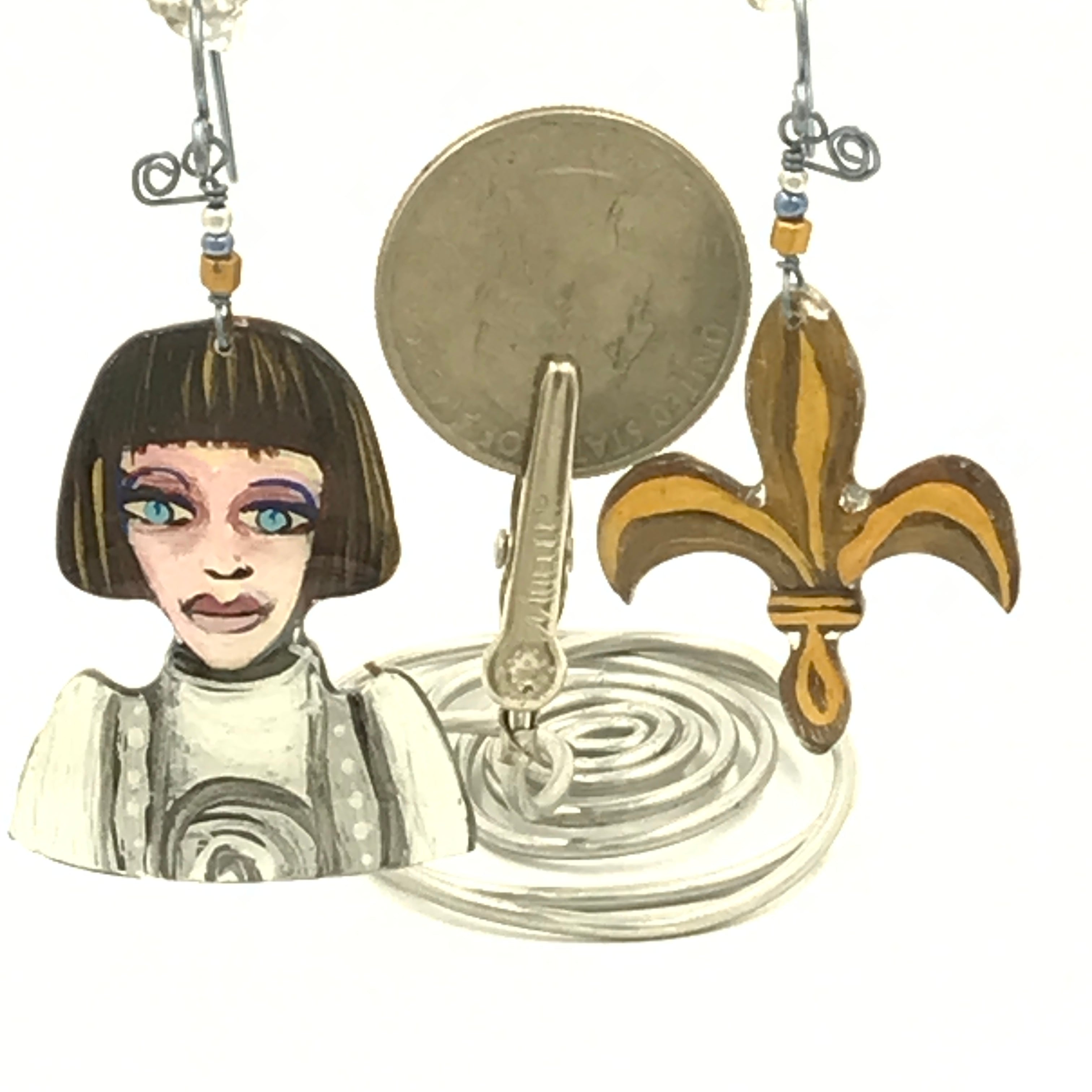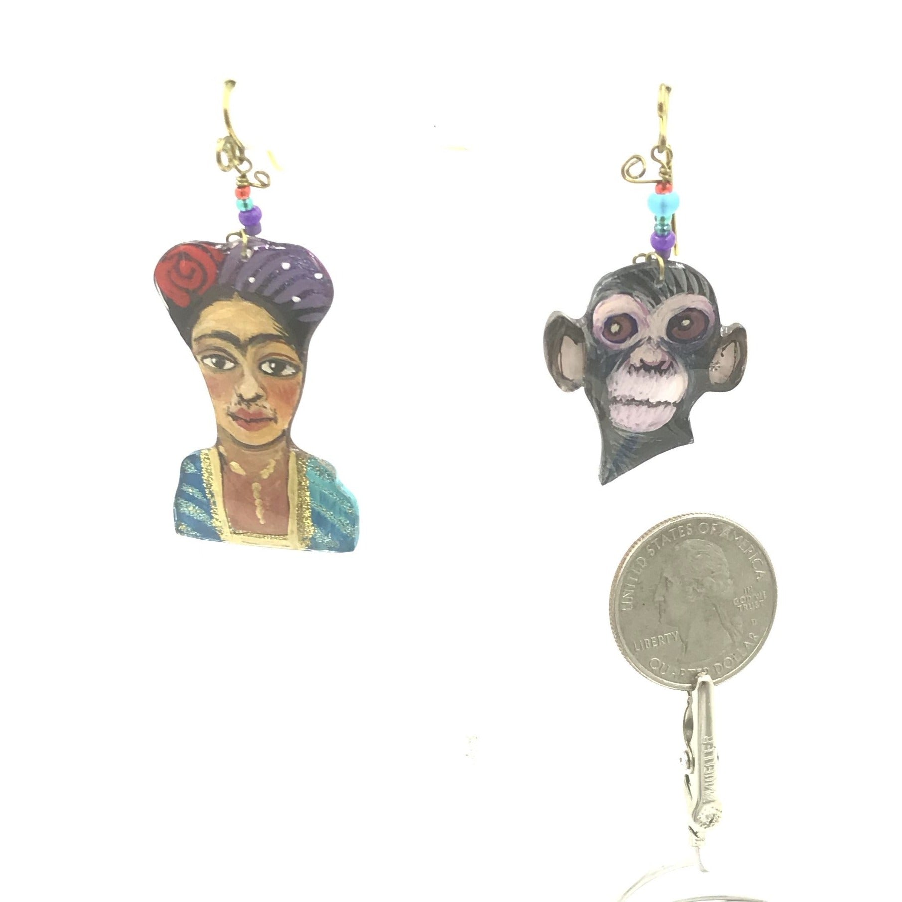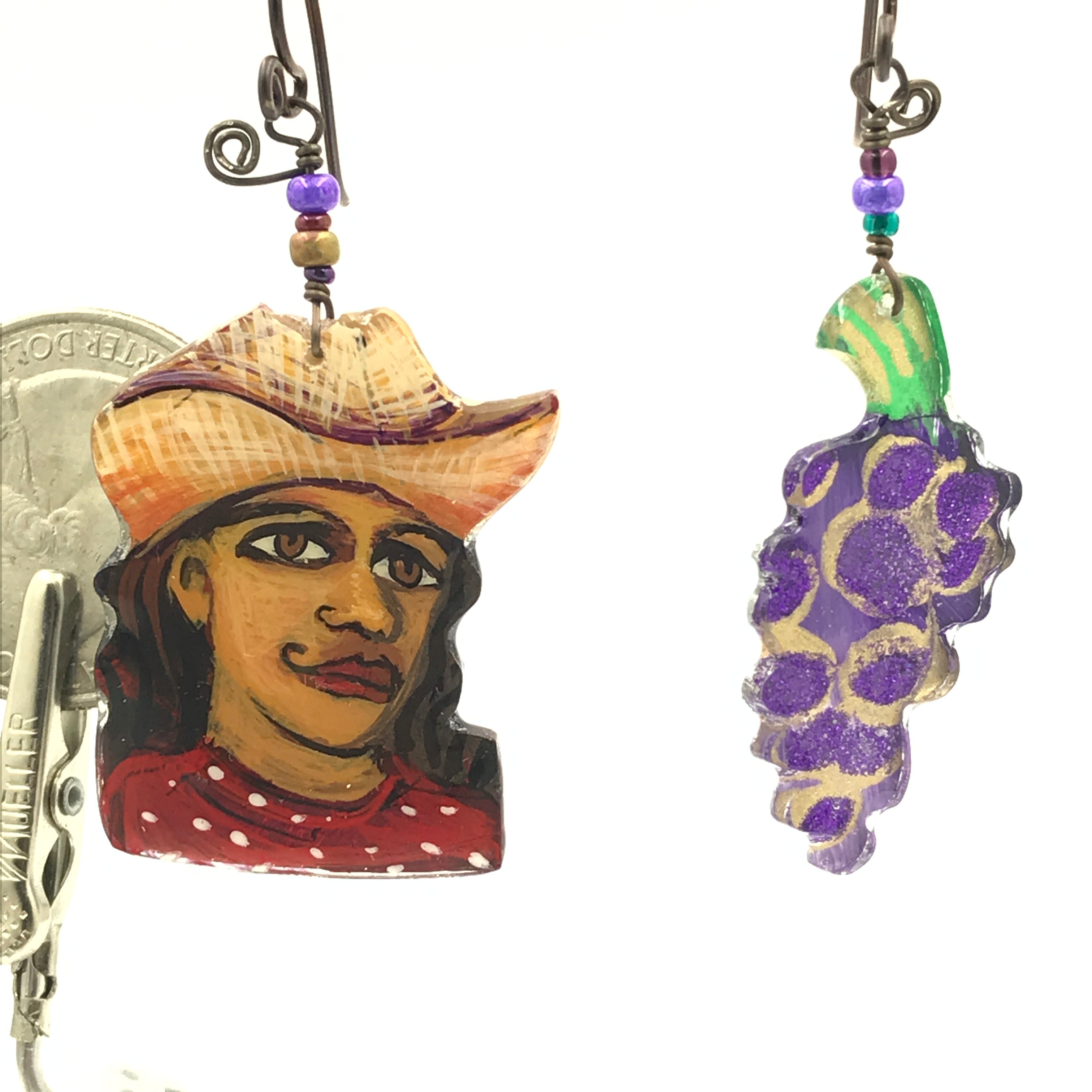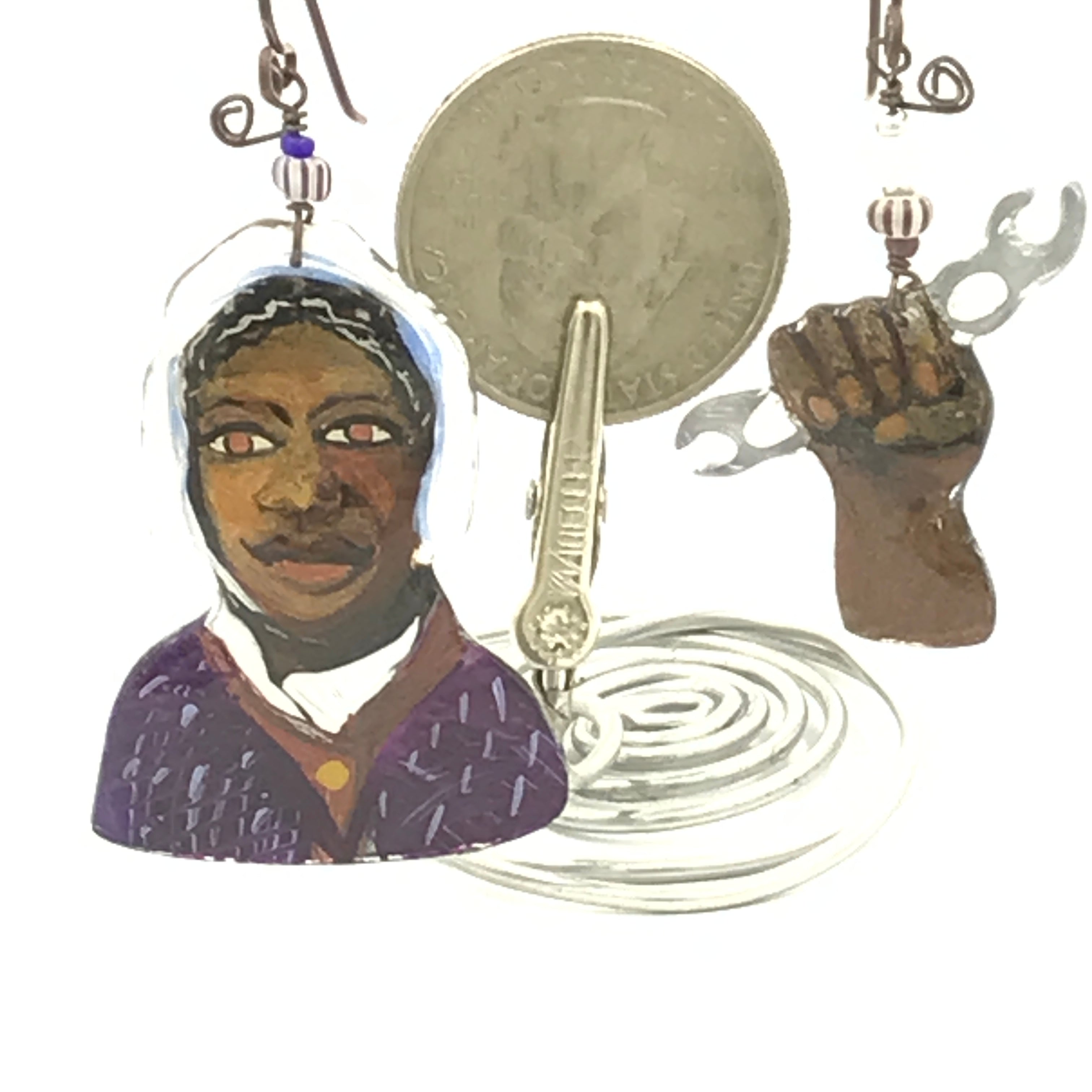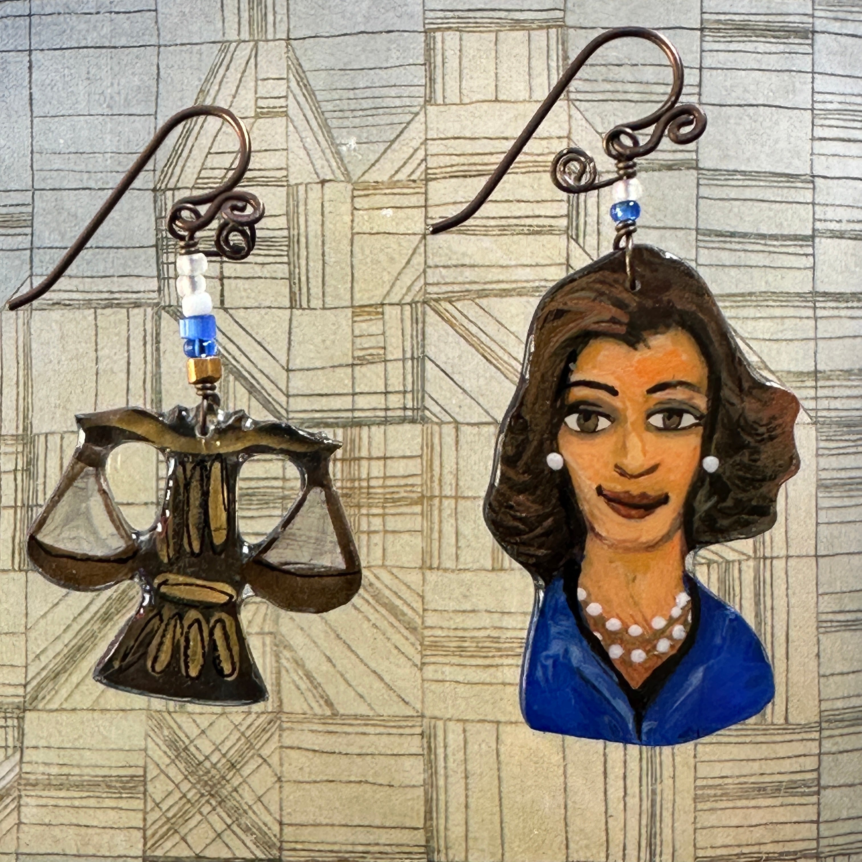 Dolores Huertas was the true leader of the Farm Labor movement. Frida Kahlo has always been an inspiration, I made this as homage to her great talent and humanity.  I believe you Anita Hill is still my mantra. Not just for her but for all women who let themselves be seen, and bravely face the music. Joan of Arc led the French Army to victory.  She heard voices that provided motivation to this diminutive woman. Sojourner Truth, along with Harriet Tubman worked tirelessly to move the enslaved out of the oppressive, racist environments that still existed after the civil war. She was a powerful writer and speaker.  She lived a long life of service to those in need. One earring is her portrait, the other a hand holding a broken chain. Ruth Bader Ginsburg, our hero from the Supreme Court. Kamala Harris, who bravely ran for president.