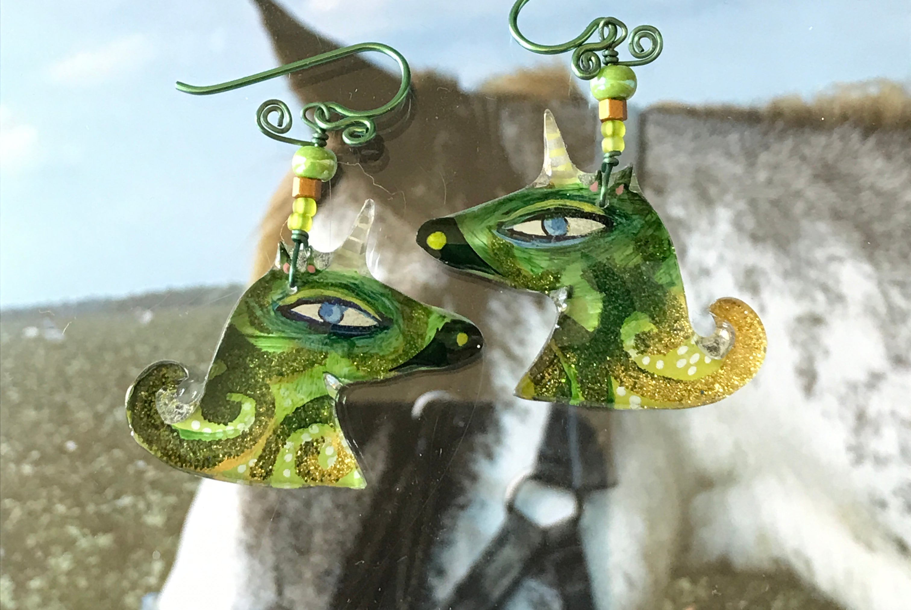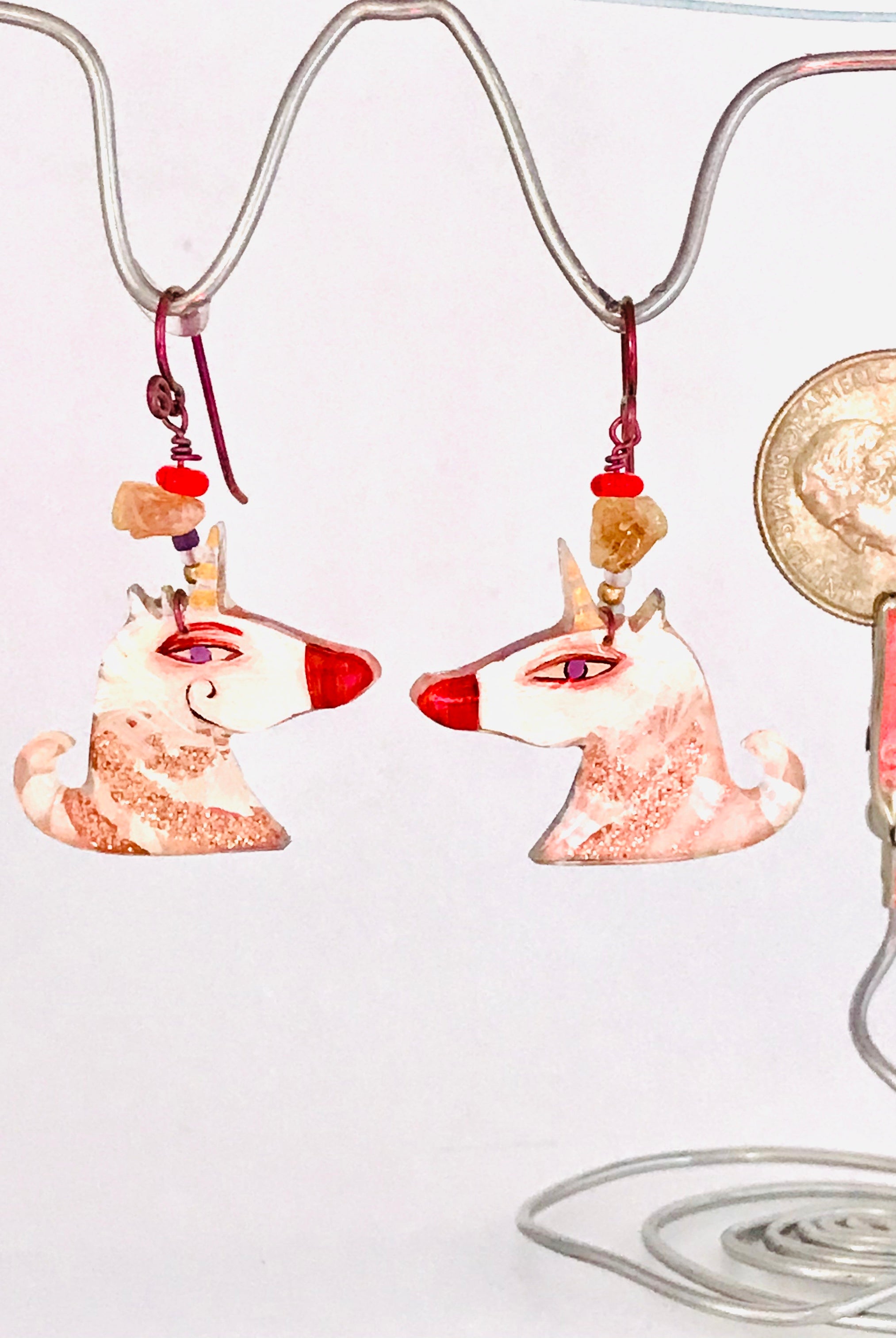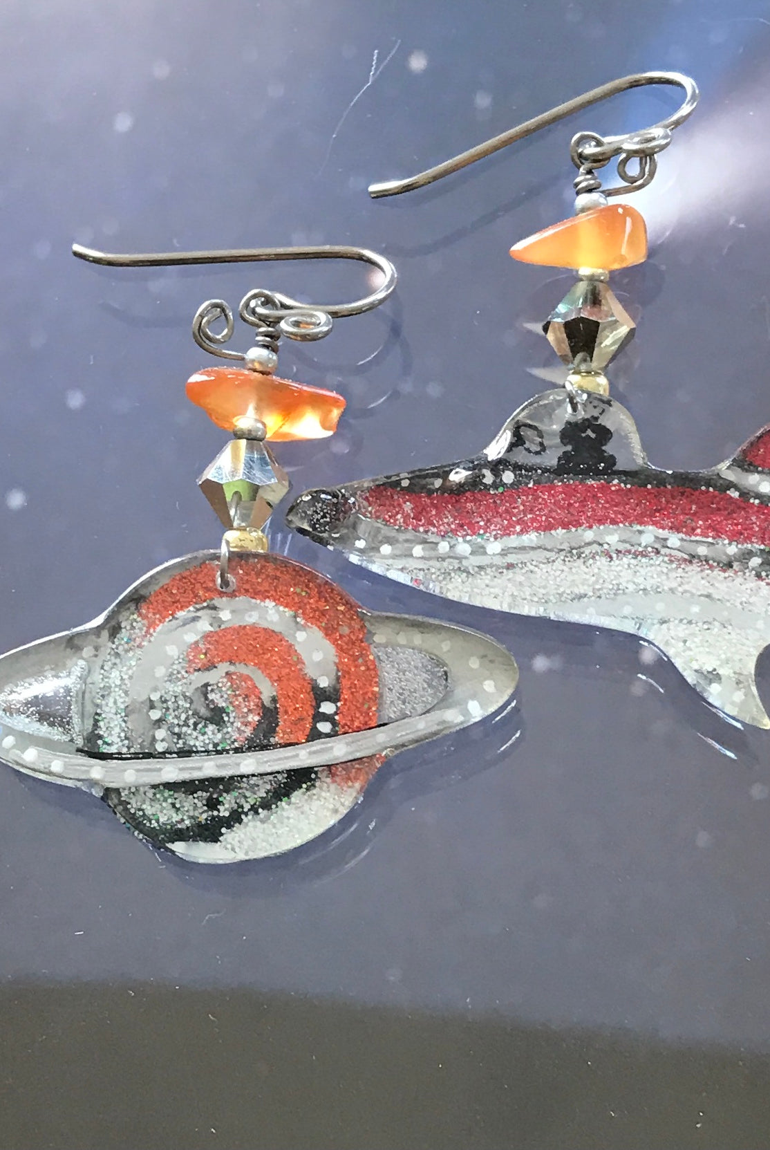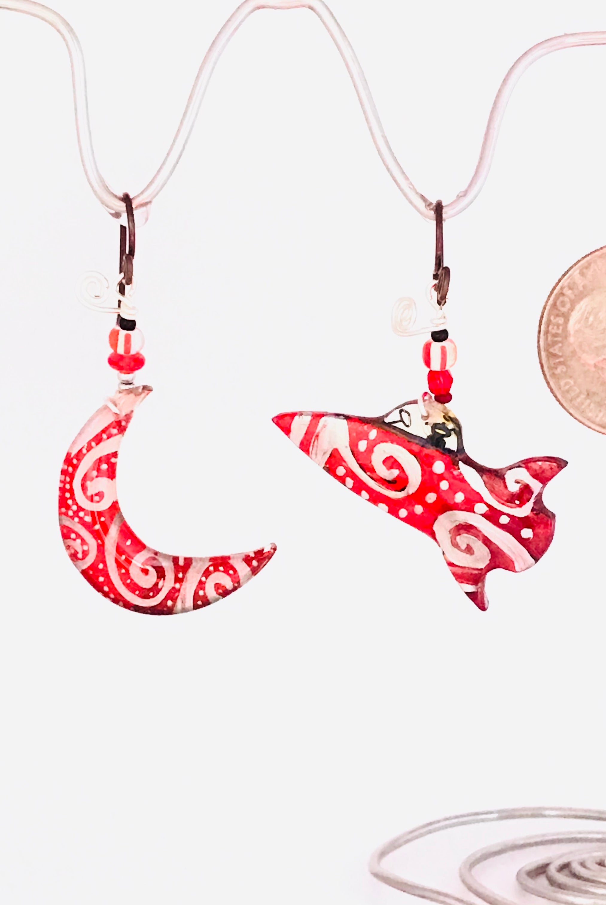 The handpainted earrings are the most challenging. Making a little painting in such a tiny place! But the results are so satisfying. Most all of the ear wires are made of Niobium, a metal all on its own on the Periodic Scale. They are safer for sensitive ears, than gold or silver. A few are sterling silver, noted in the descriptions.