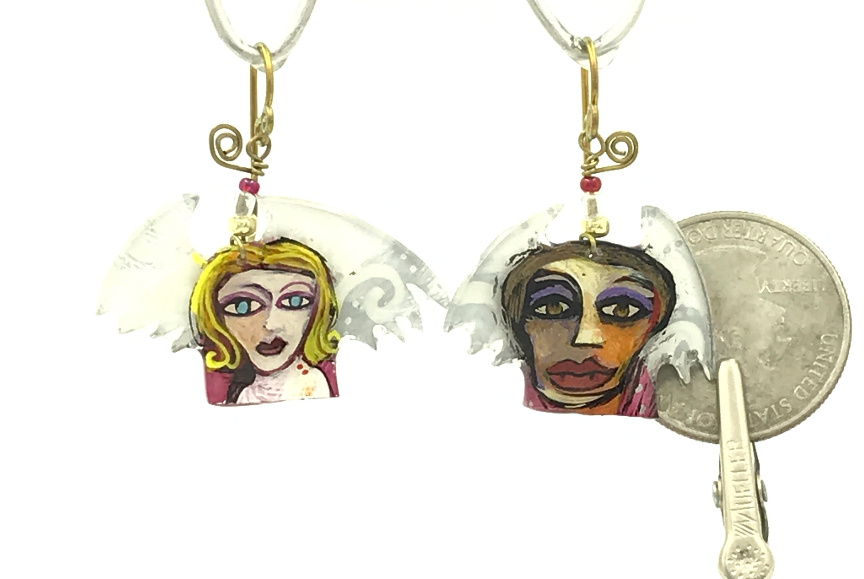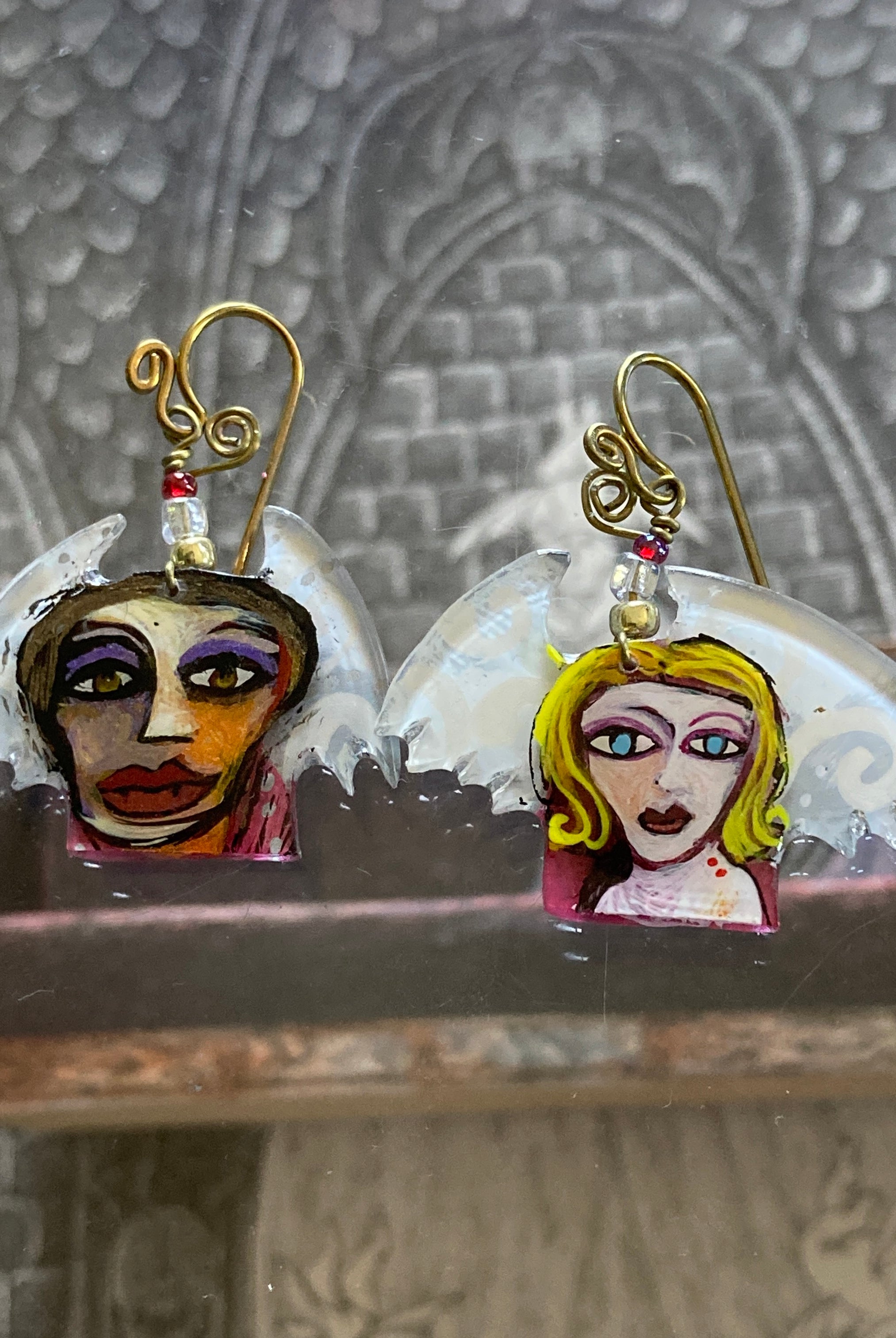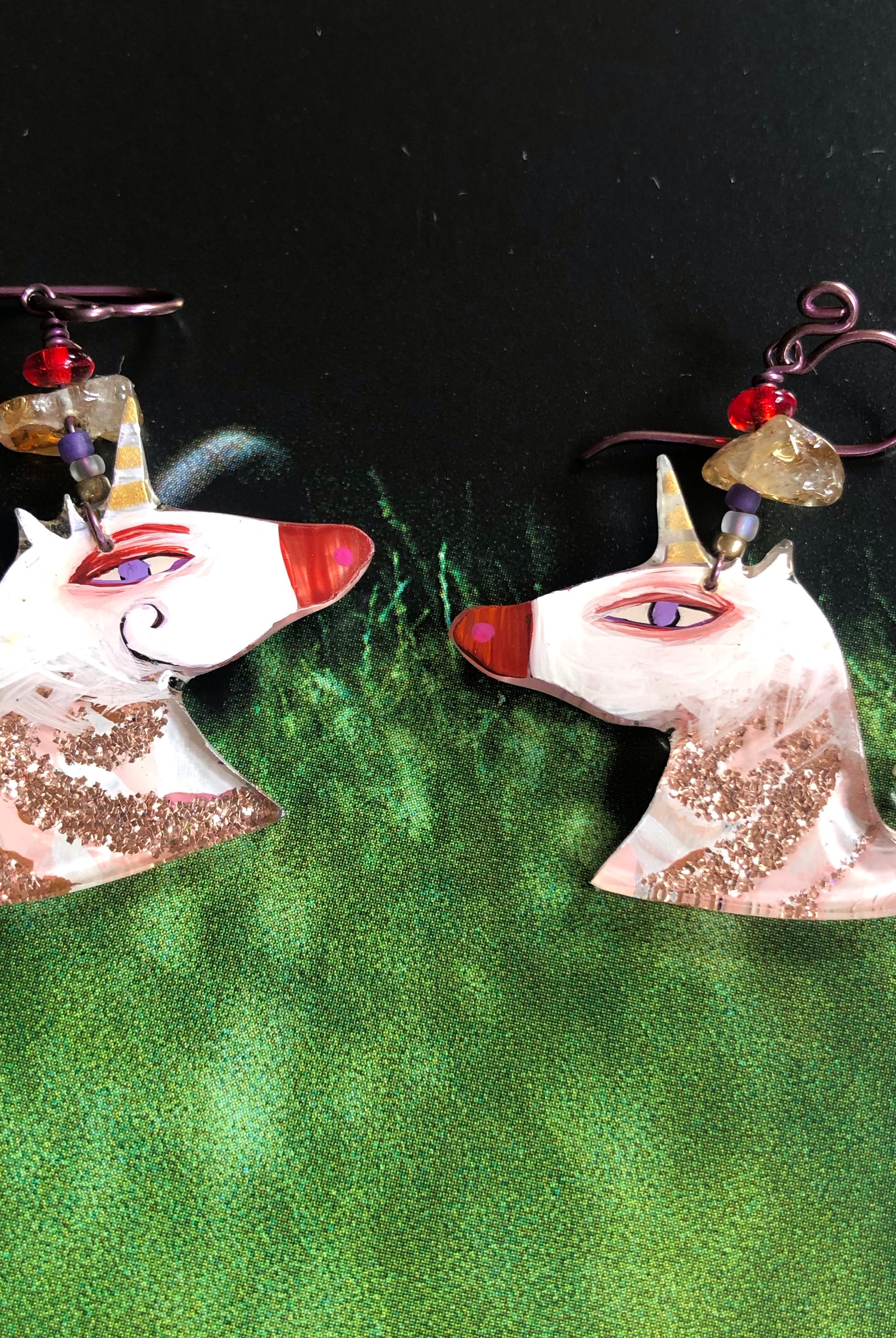 The handpainted earrings are the most challenging. Making a little painting in such a tiny place! But the results are so satisfying. Most all of the ear wires are made of Niobium, a metal all on its own on the Periodic Scale. They are safer for sensitive ears, than gold or silver. A few are sterling silver, noted in the descriptions.