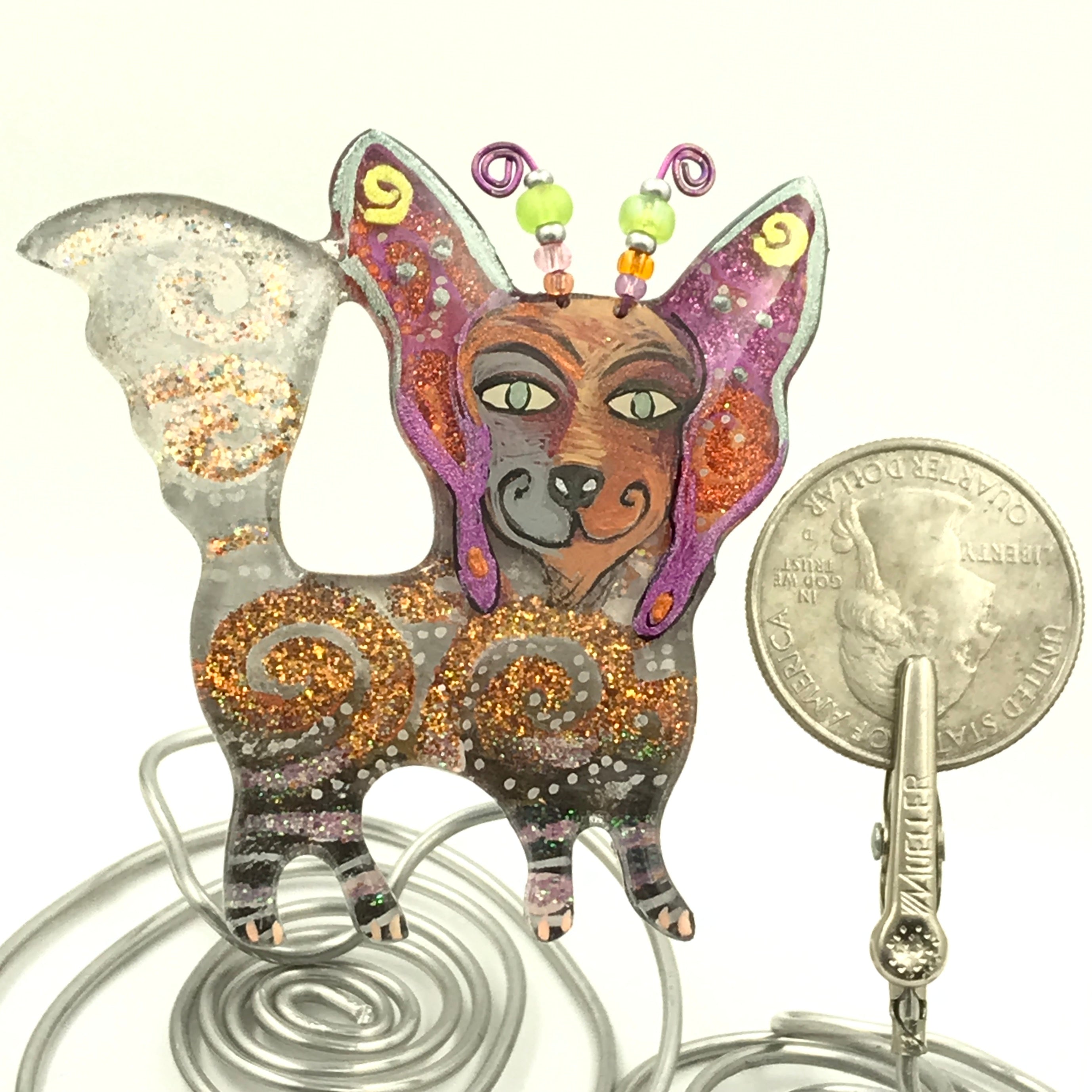 If you are pin challenged, you can have a complimentary stand that will clip on the pinback, just indicate in your special instructions. It’s a little work of art, there are lots of ways to display it.