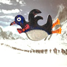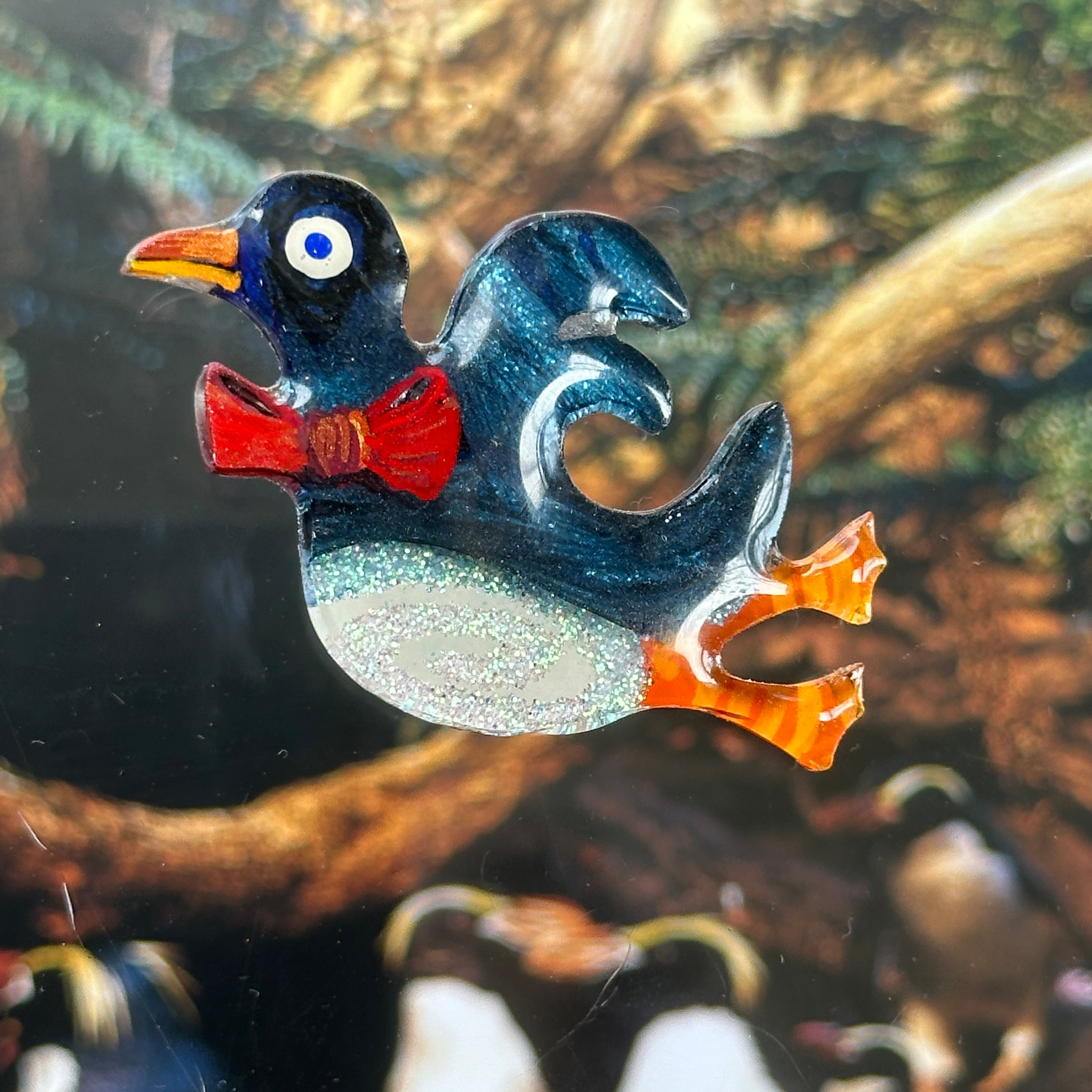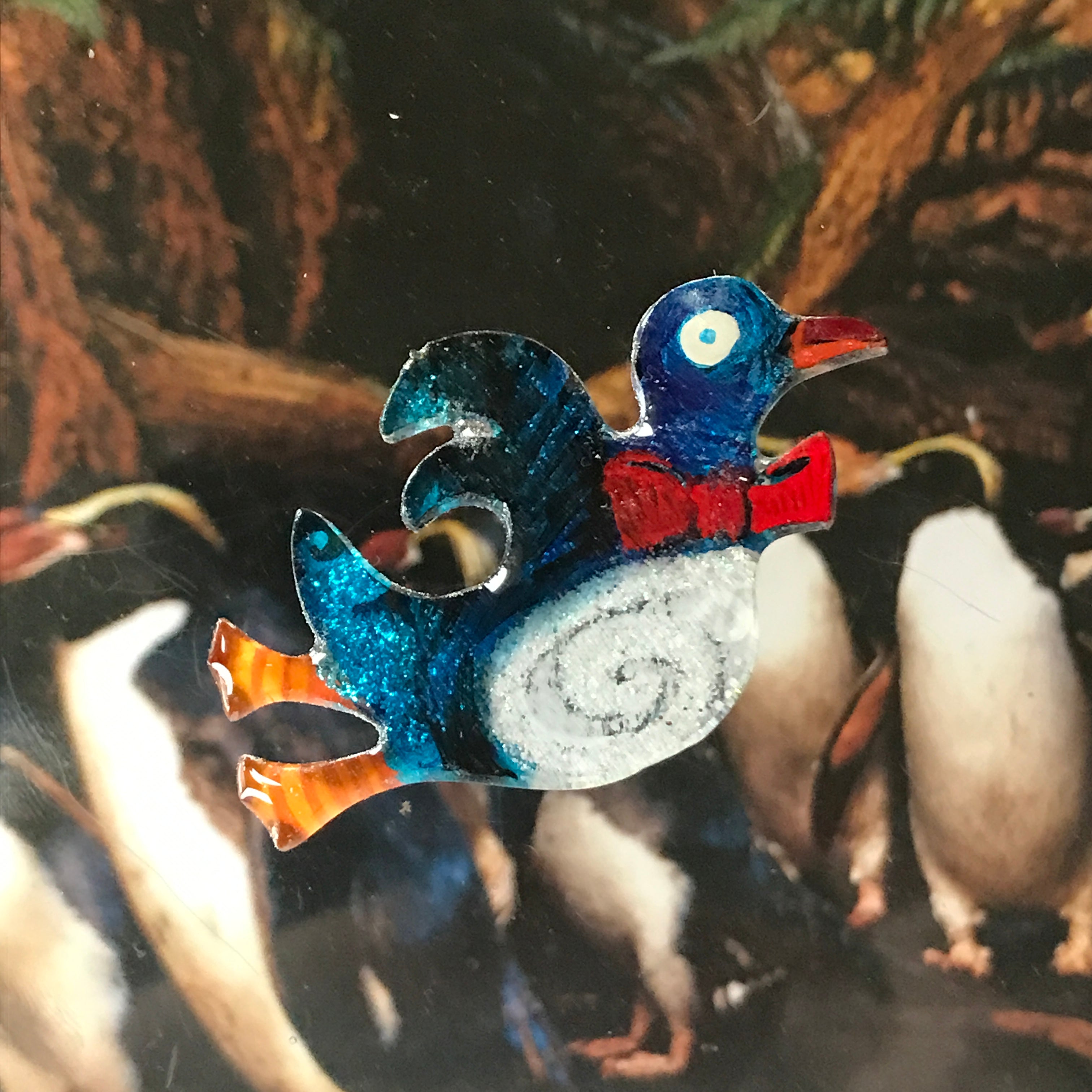 The penguin with the coffee cup shape comes from a painting I did of a penguin wearing high heels. I love the way penguins lift their heads in what looks like a superior way to us humans. Well at least this human:) The flying penguin comes from visits to the penguin exhibit at the San Diego Zoo.