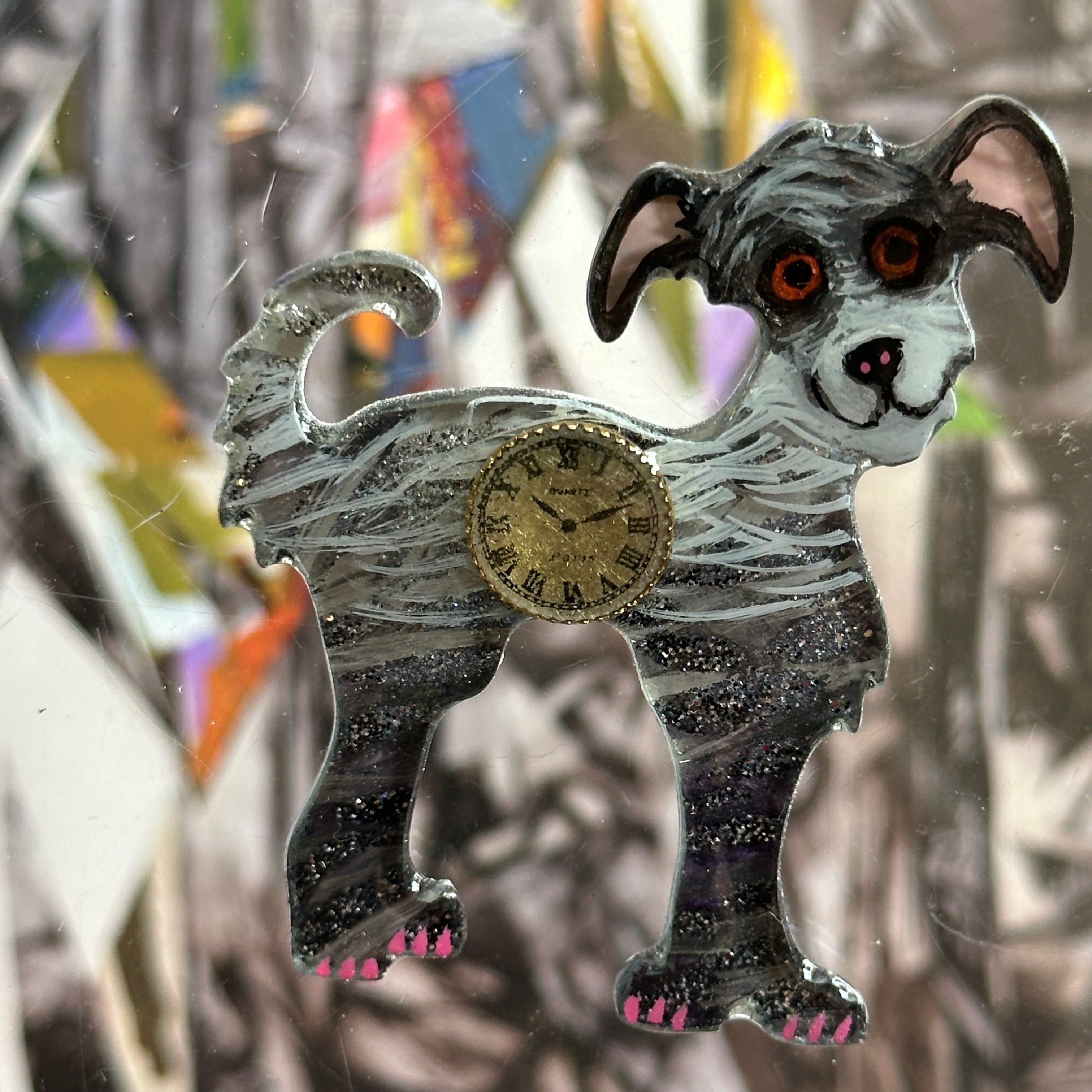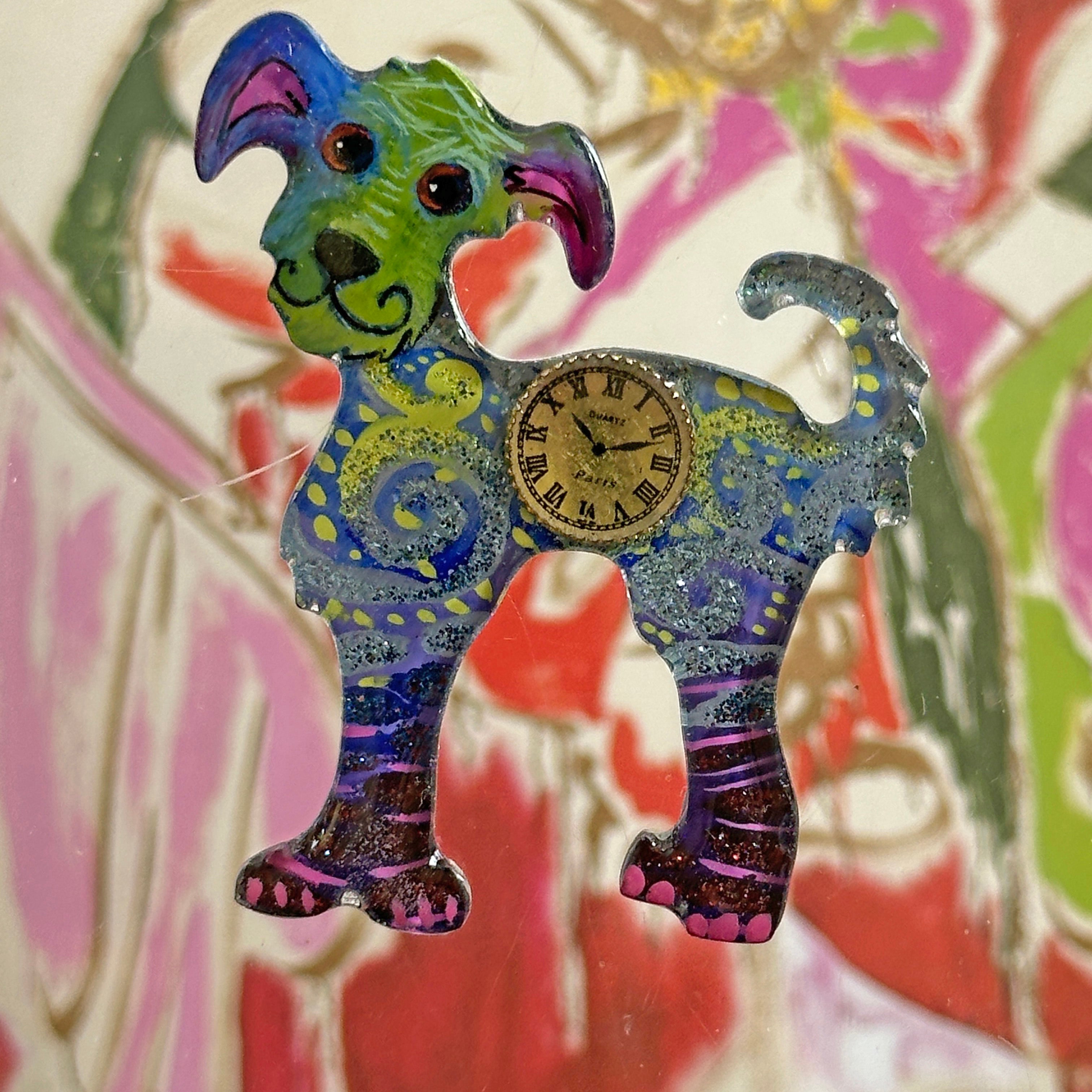 The mains of the one of a kind art pins are the birds, cat and dogs.