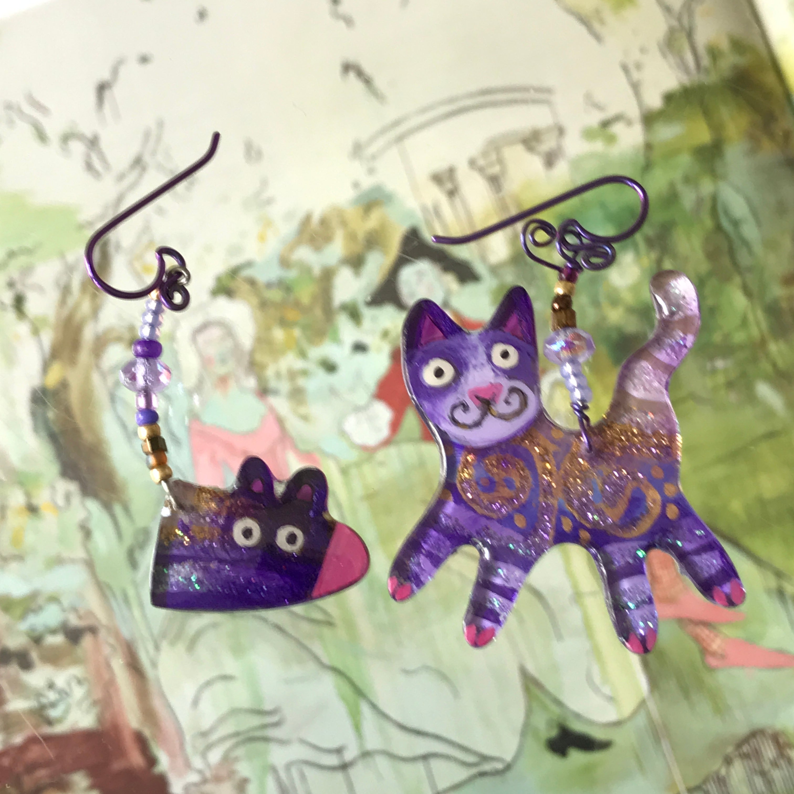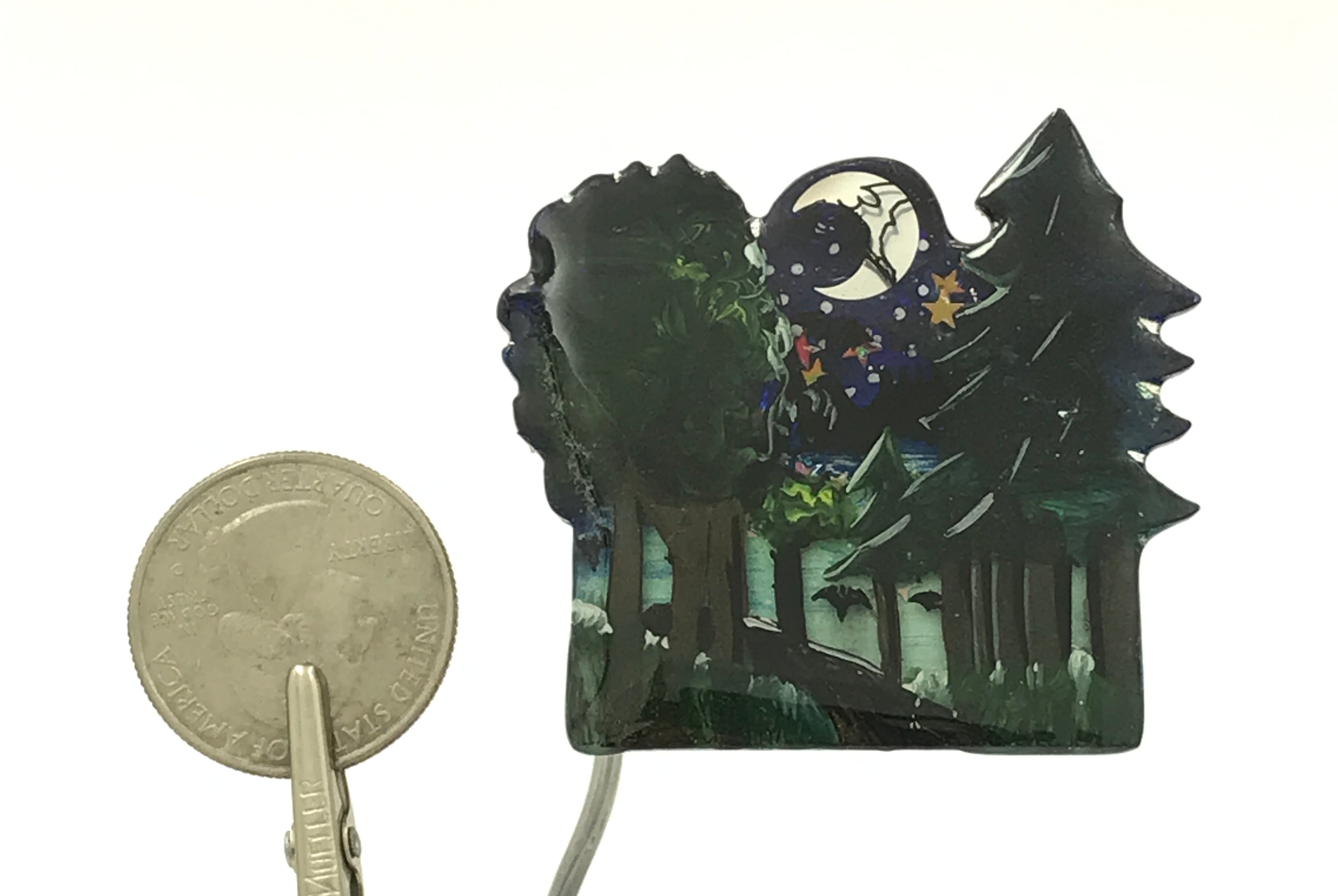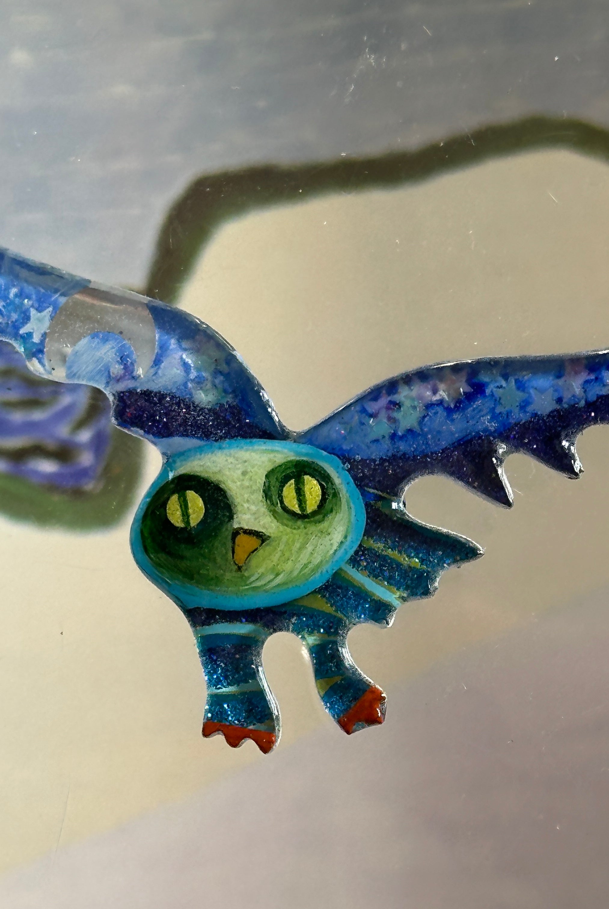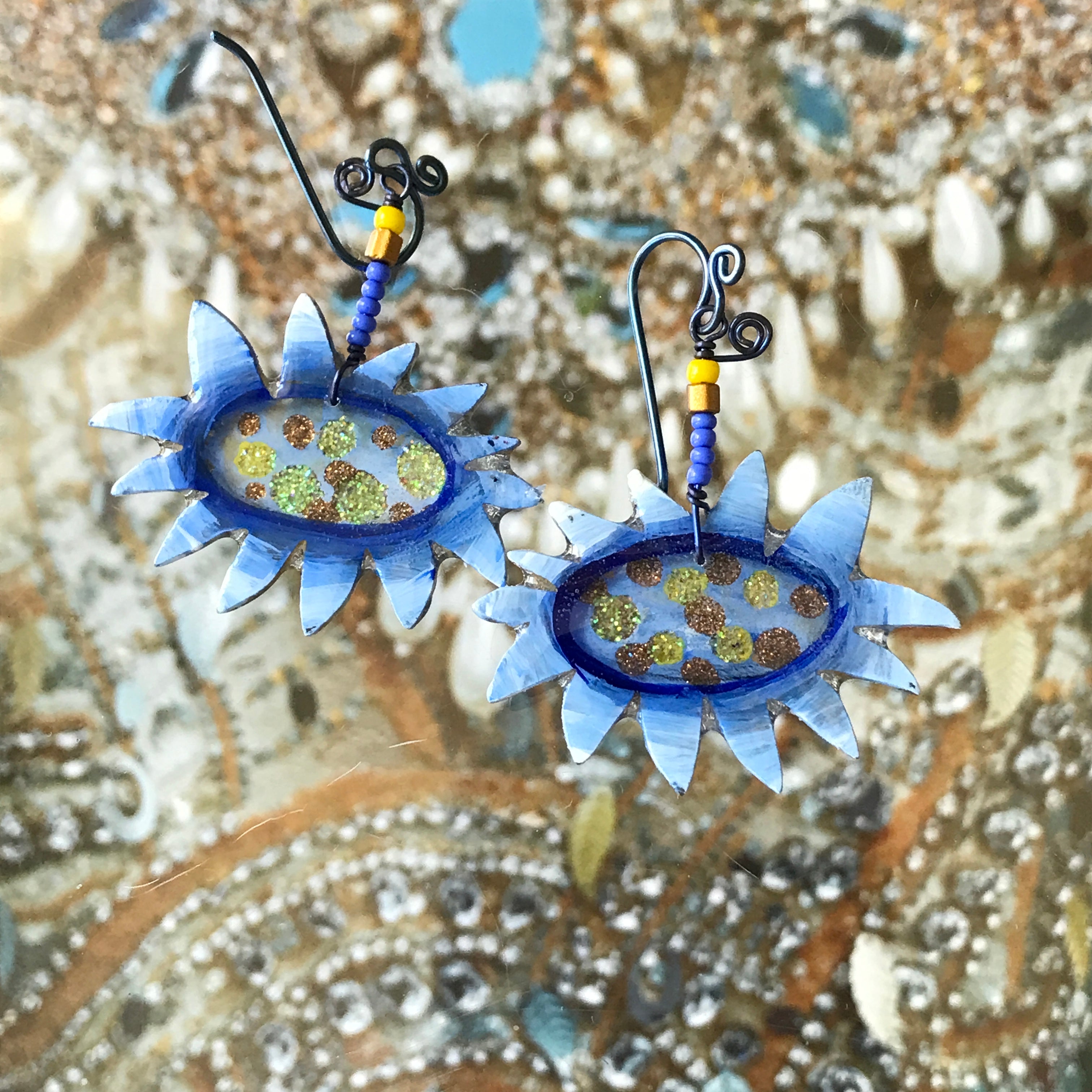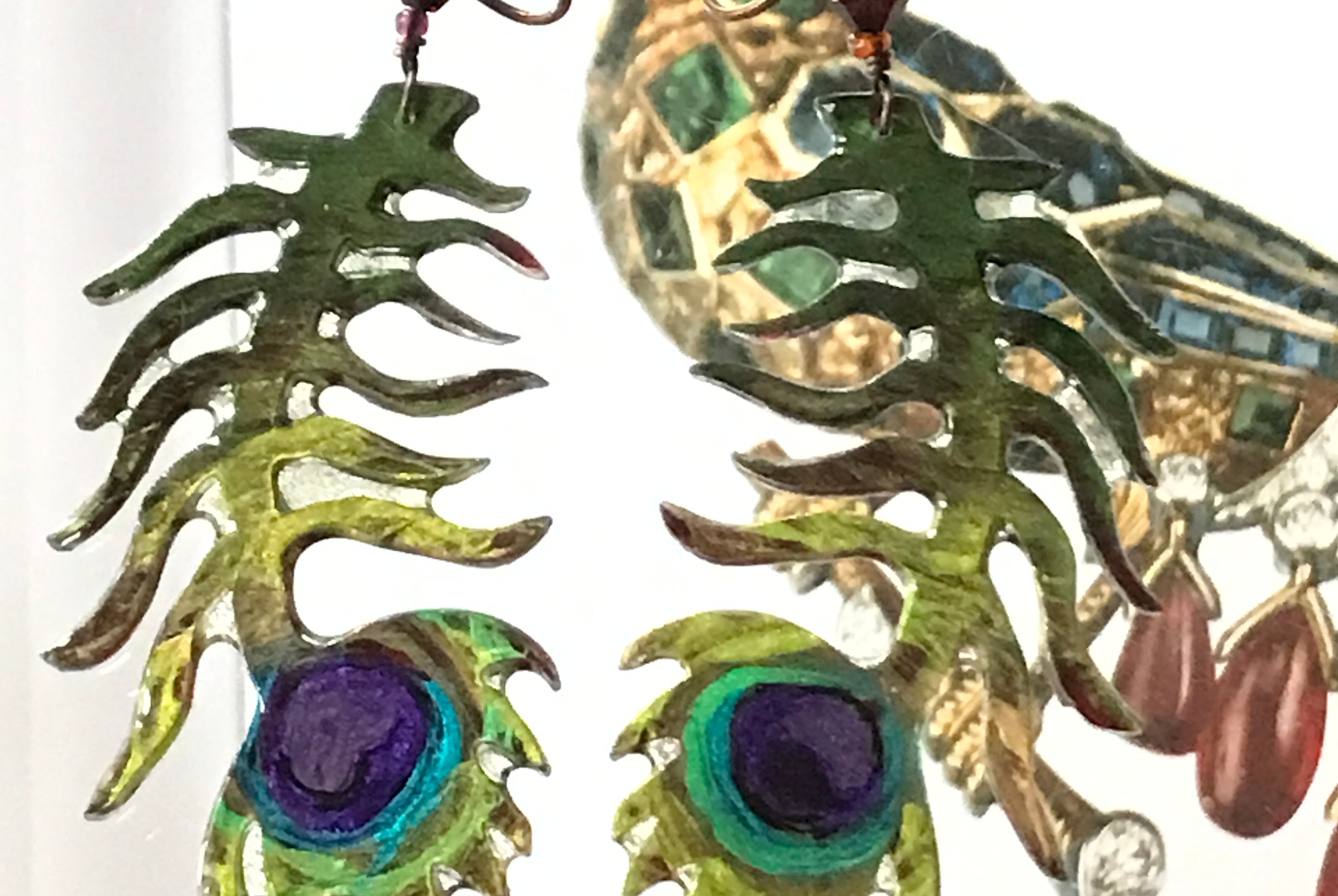 For me, these are little paintings that you can wear. If you are thinking of shrinky-dinks, I'm sure that was in my mind when I came up with lasercutting the shapes and then painting with the same paints I use on canvas. It's a multi layered process that takes a long time. The painting takes the longest, but it is the most rewarding. They are coated with a thick and sturdy glaze that brings out the depth and color.