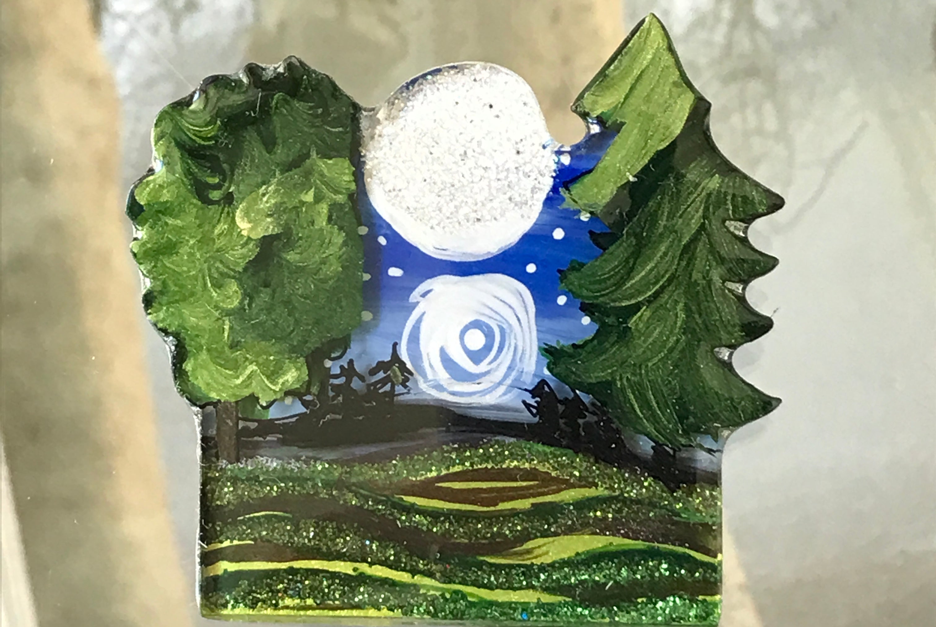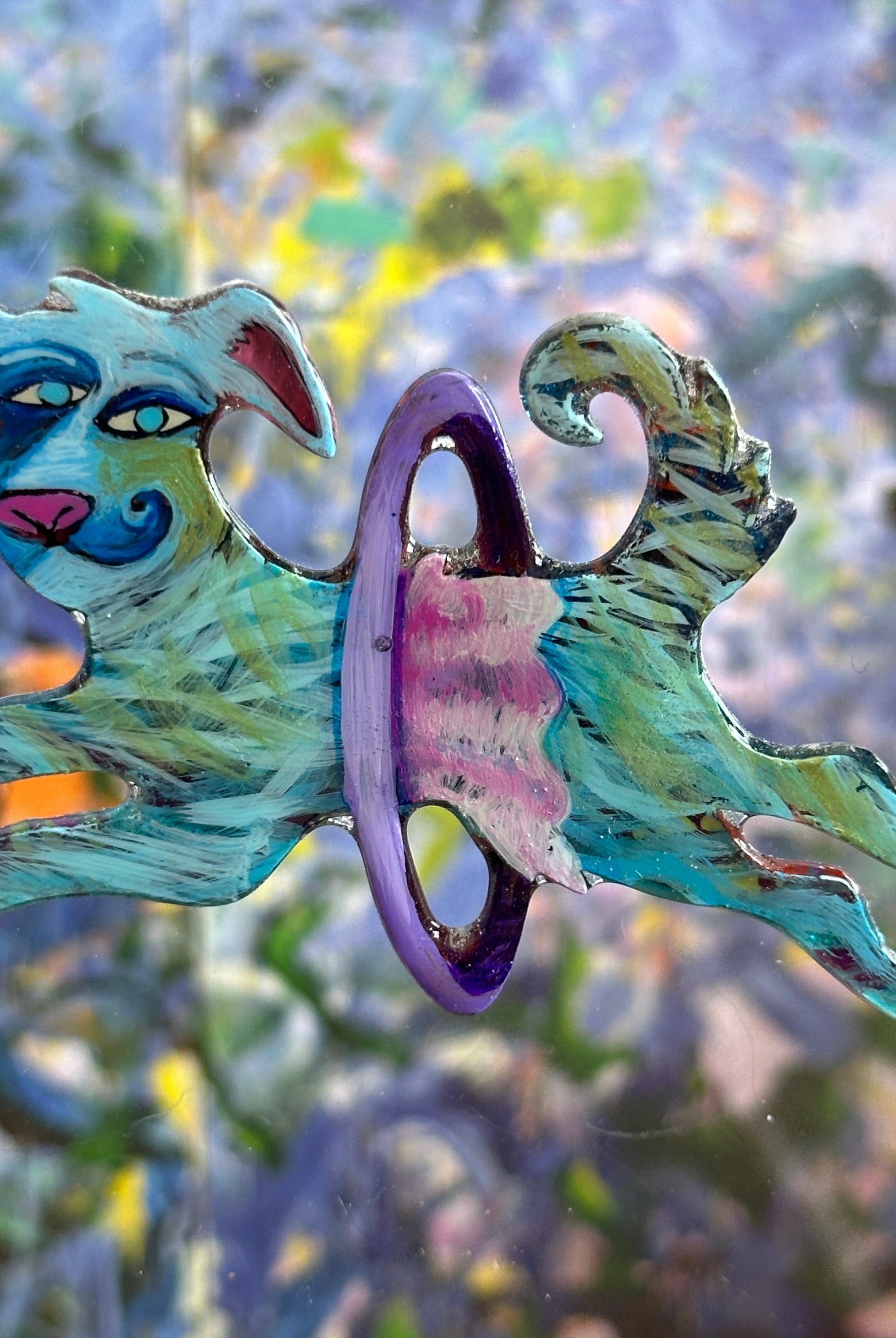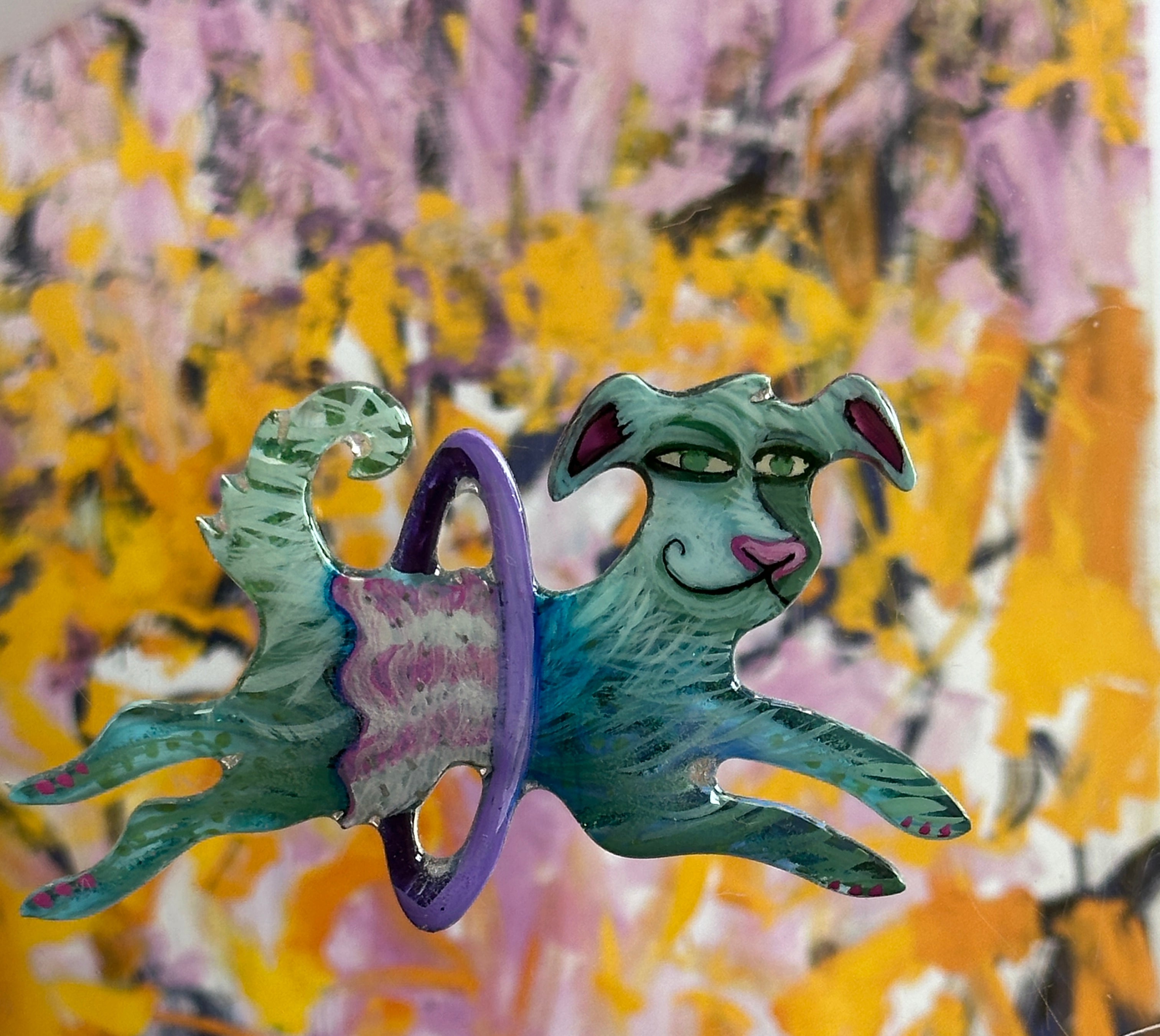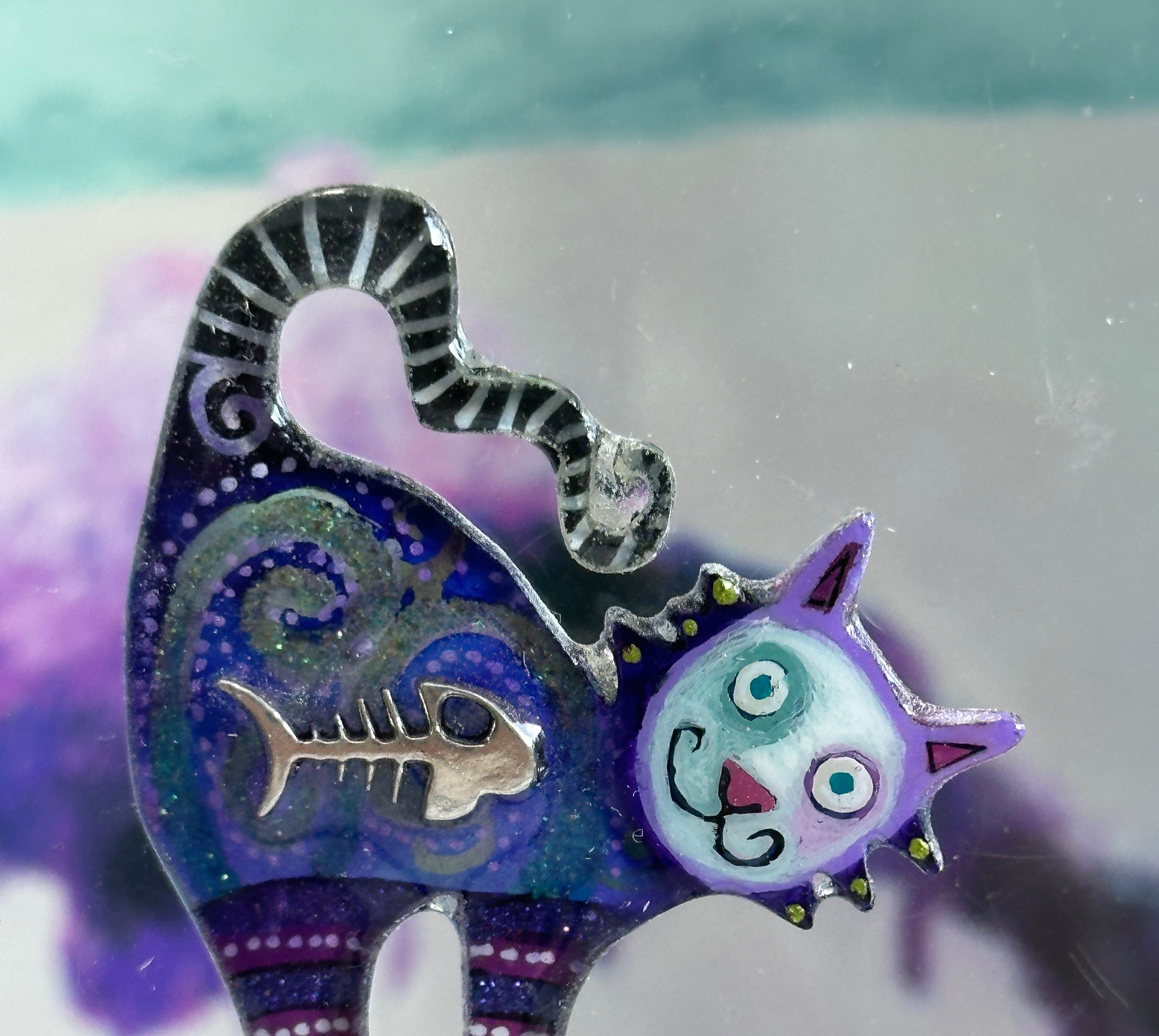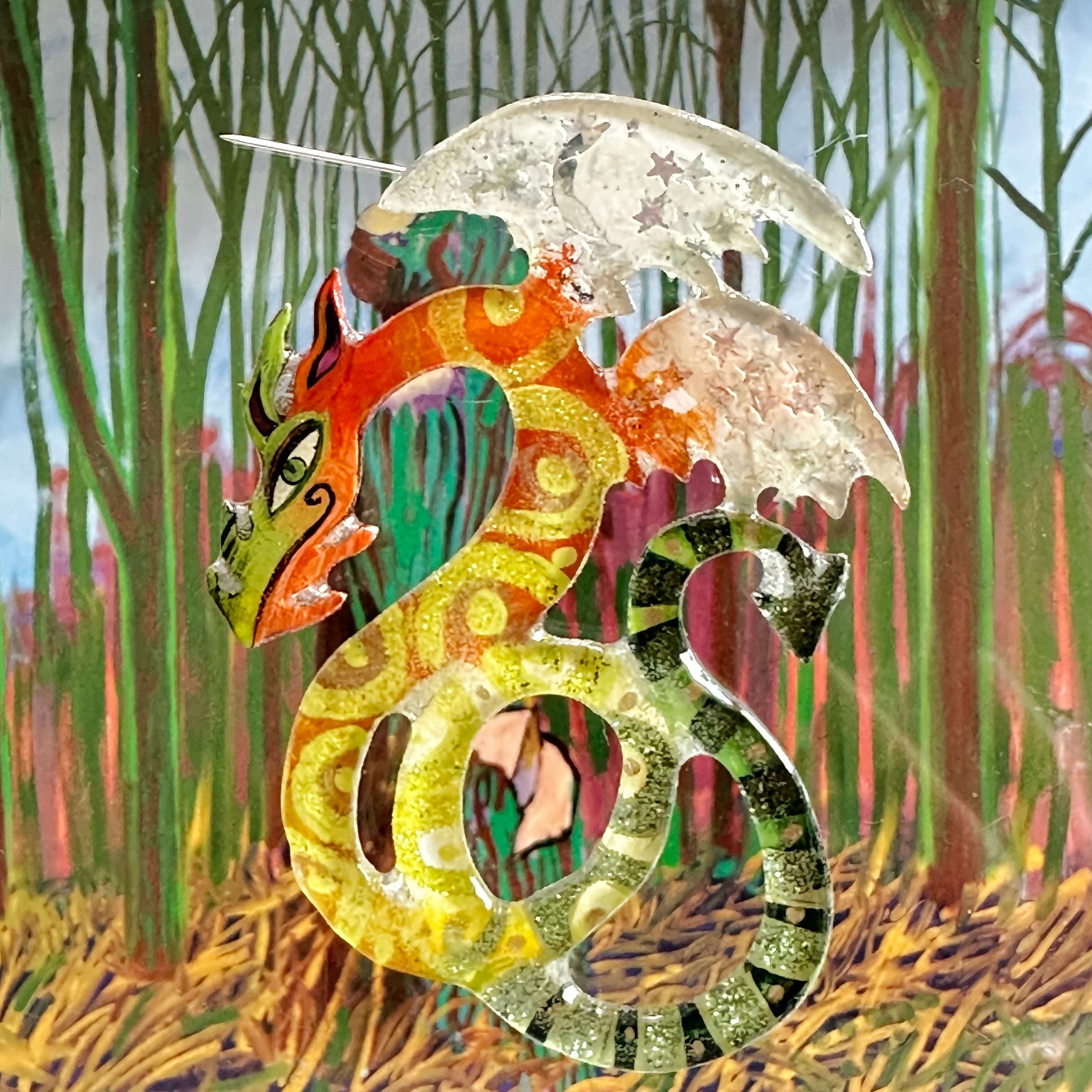 For me, these are little paintings that you can wear. If you are thinking of shrinky-dinks, I'm sure that was in my mind when I came up with lasercutting the shapes and then painting with the same paints I use on canvas. It's a multi layered process that takes a long time. The painting takes the longest, but it is the most rewarding. They are coated with a thick and sturdy glaze that brings out the depth and color.