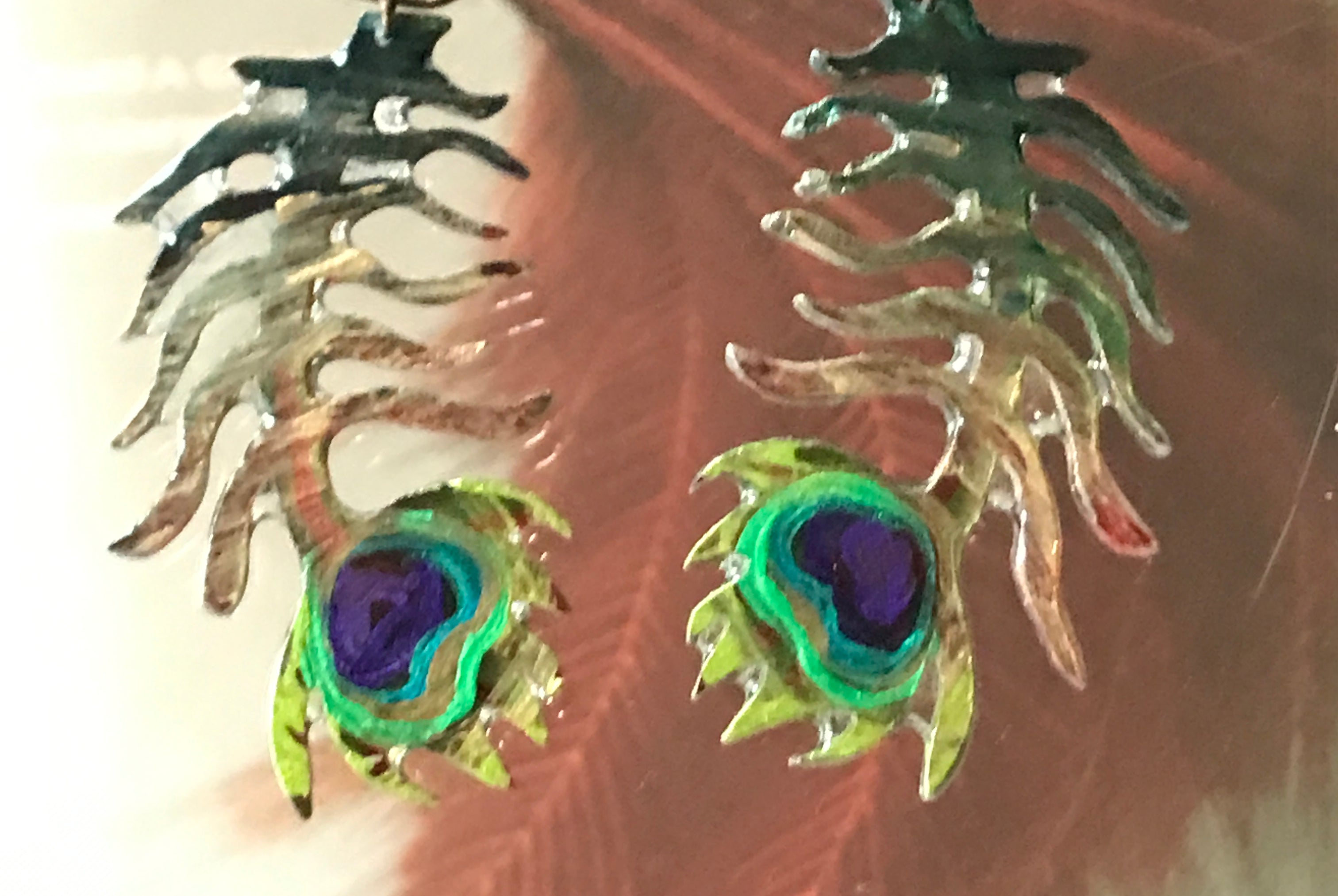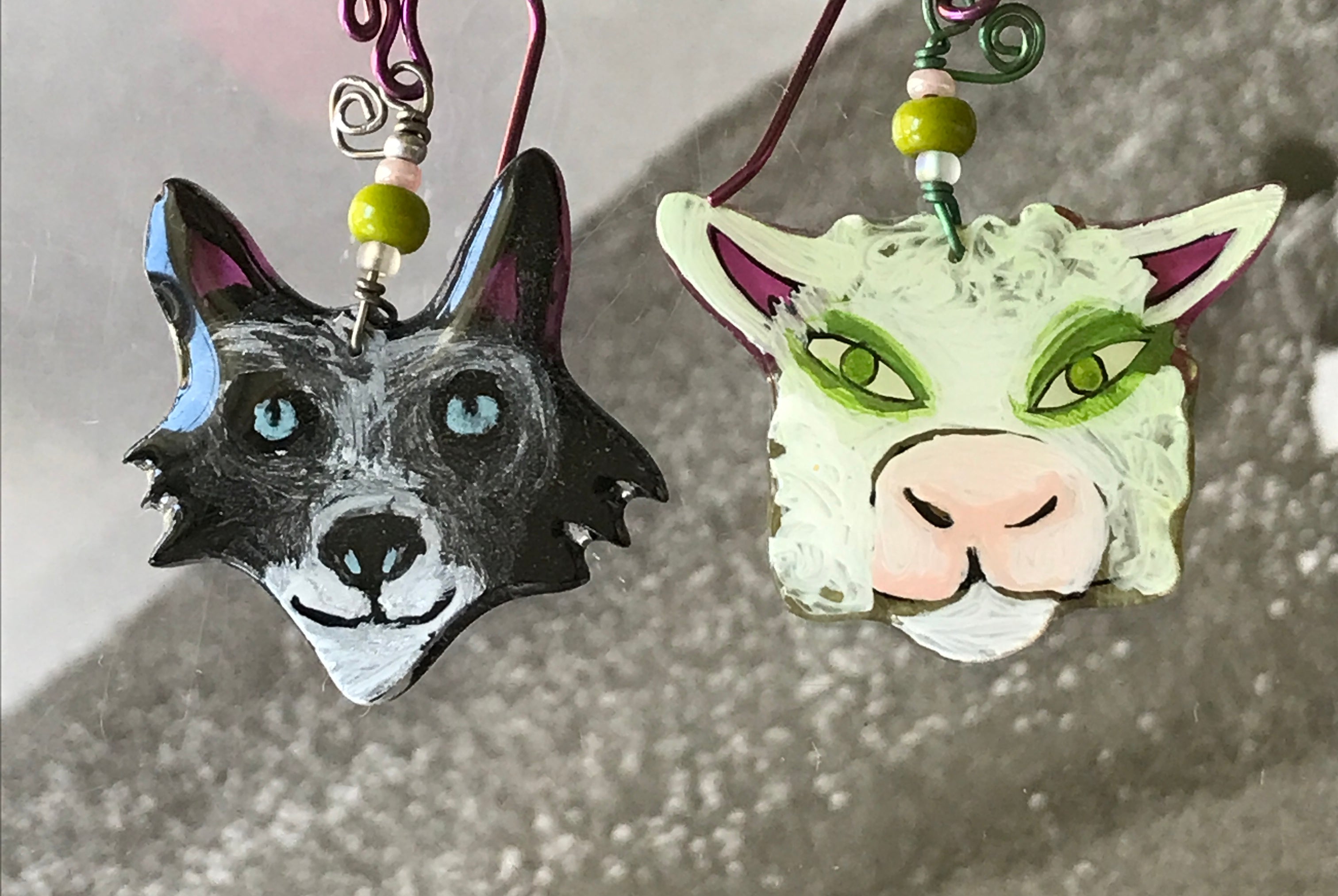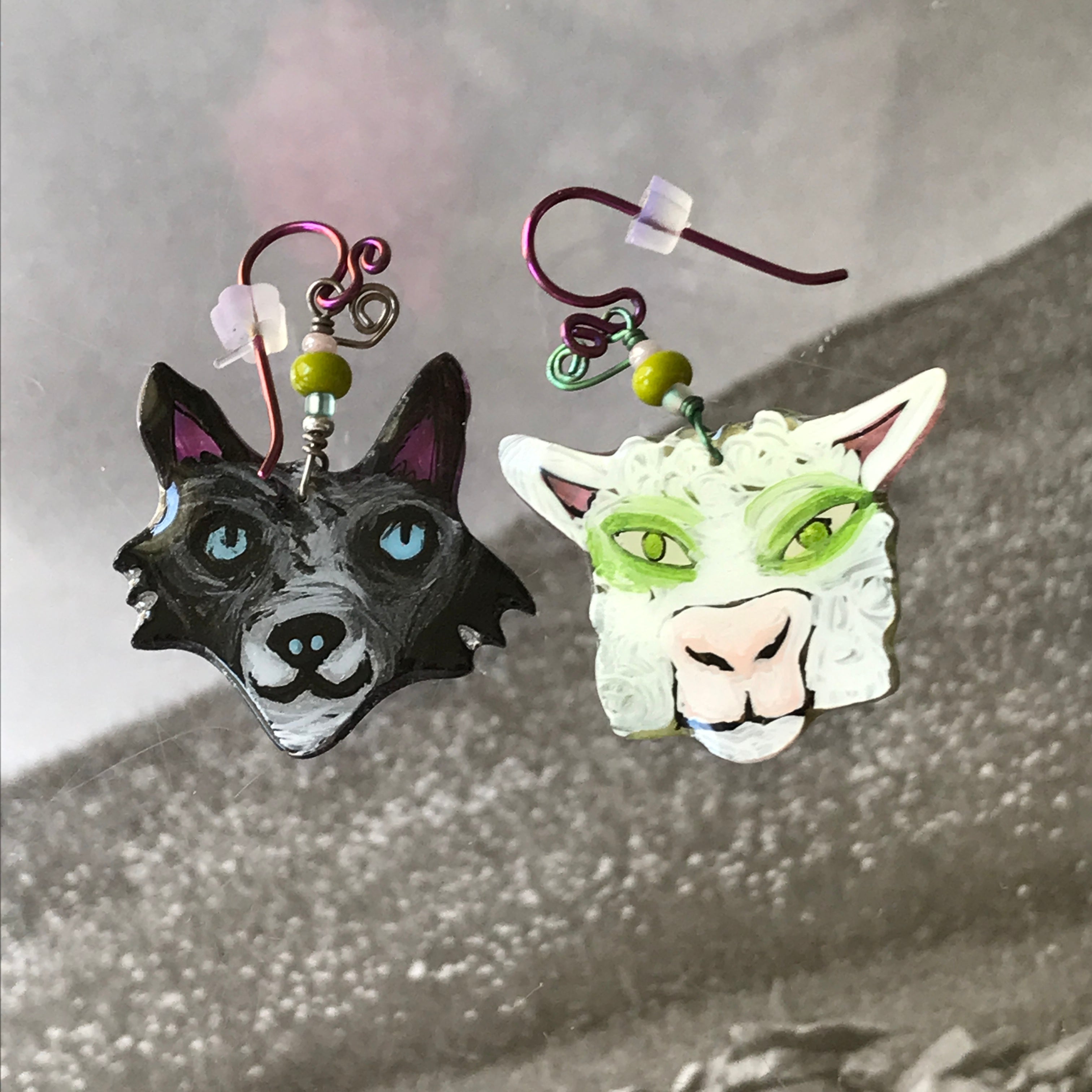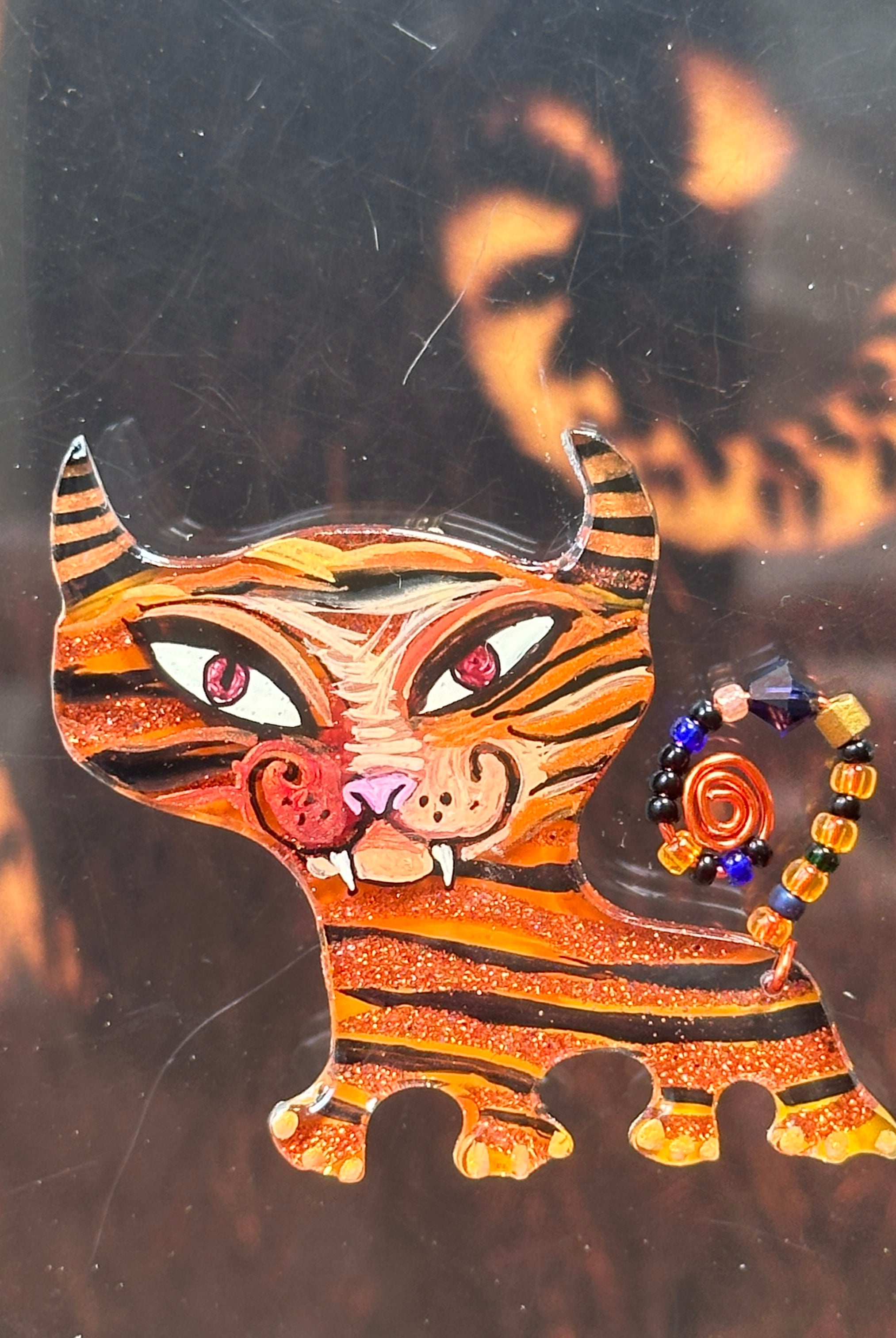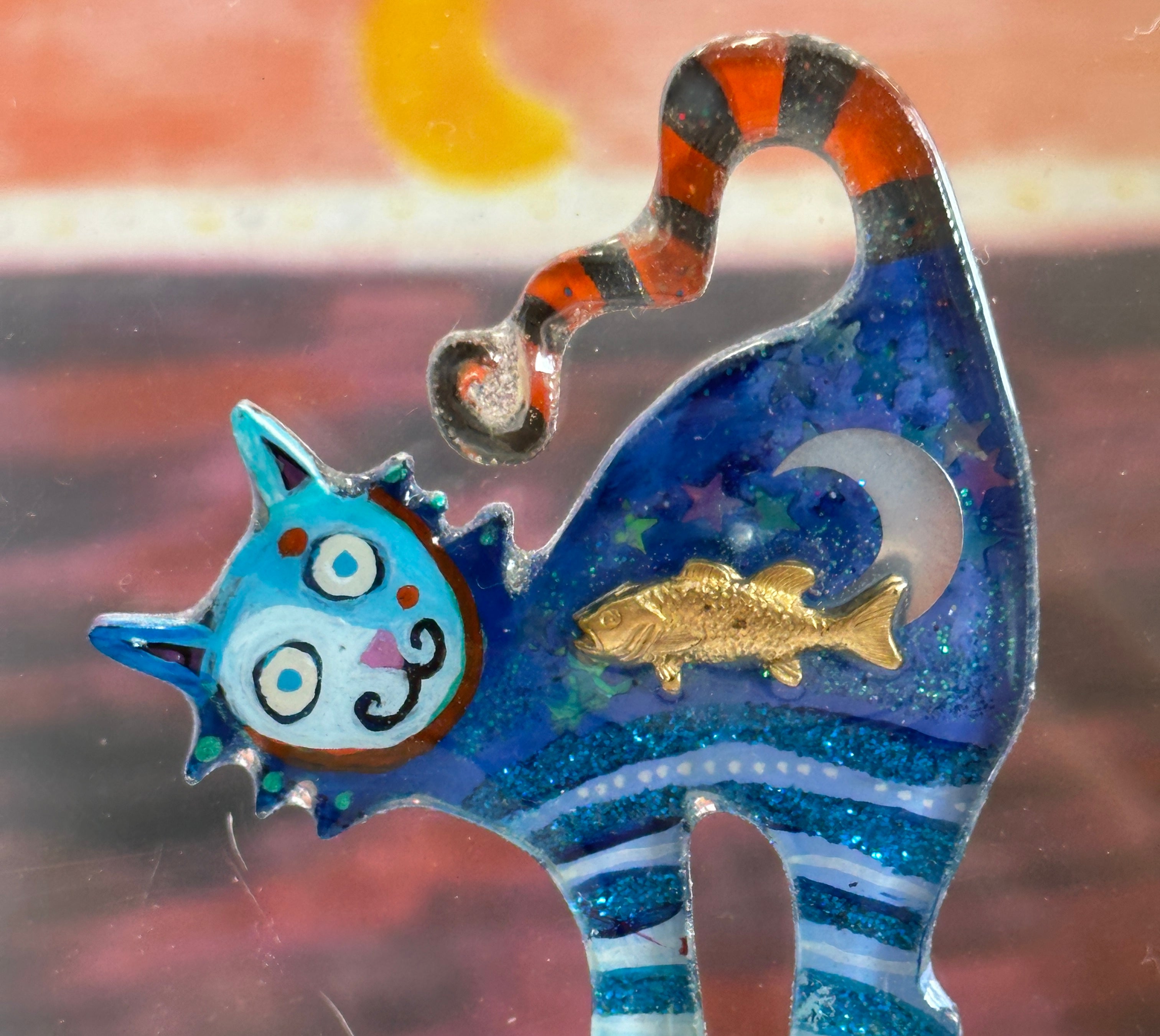 For me, these are little paintings that you can wear. If you are thinking of shrinky-dinks, I'm sure that was in my mind when I came up with lasercutting the shapes and then painting with the same paints I use on canvas. It's a multi layered process that takes a long time. The painting takes the longest, but it is the most rewarding. They are coated with a thick and sturdy glaze that brings out the depth and color.