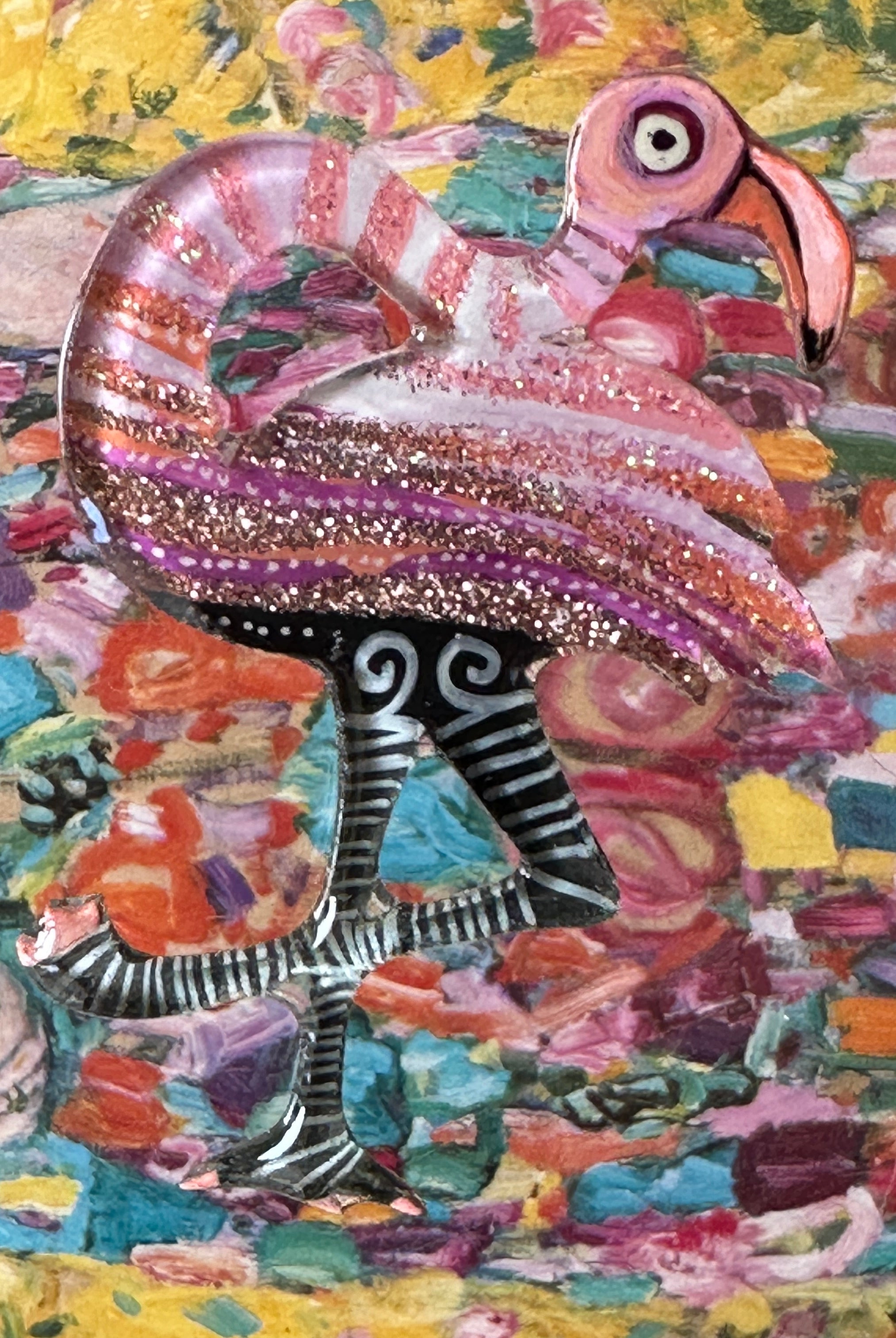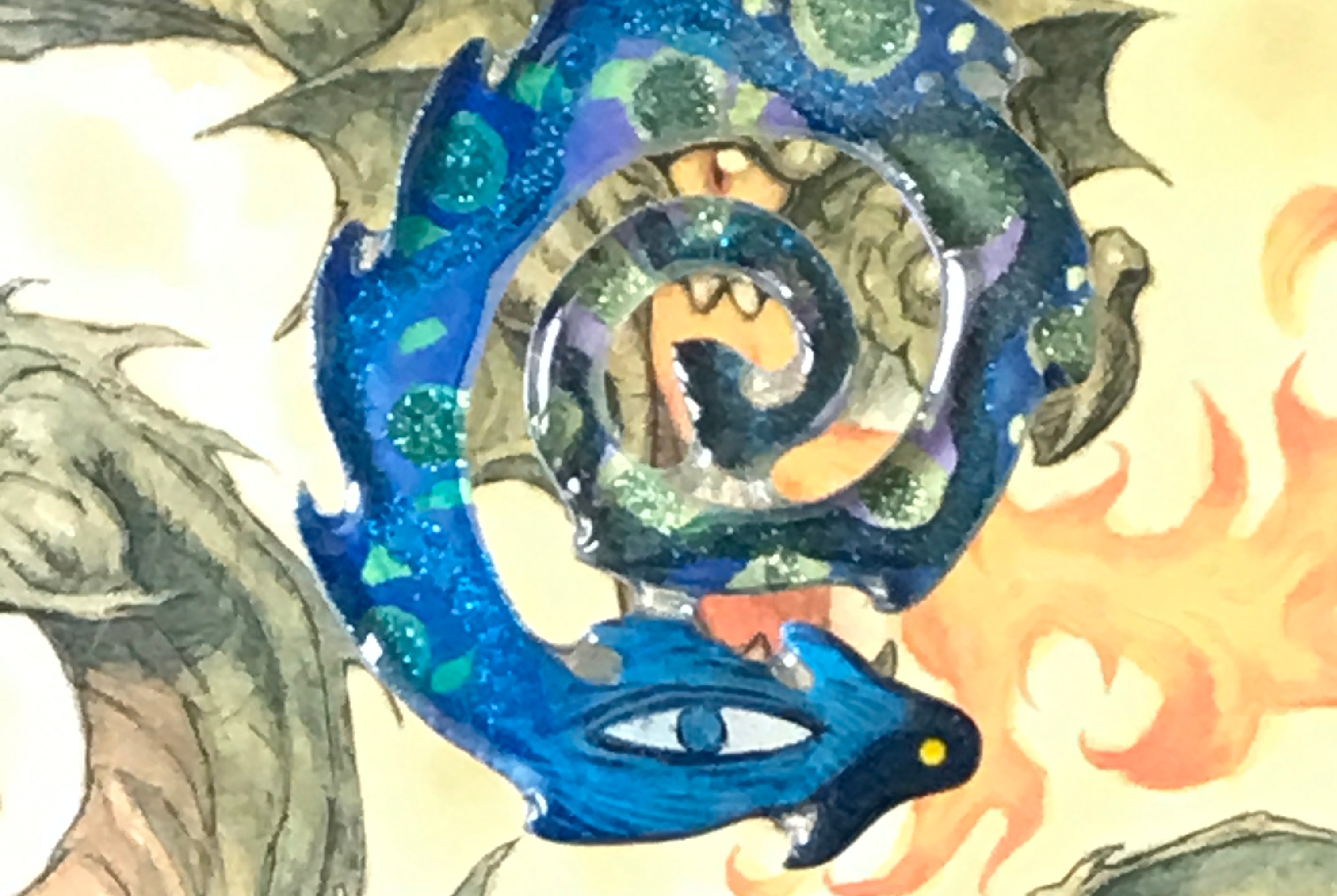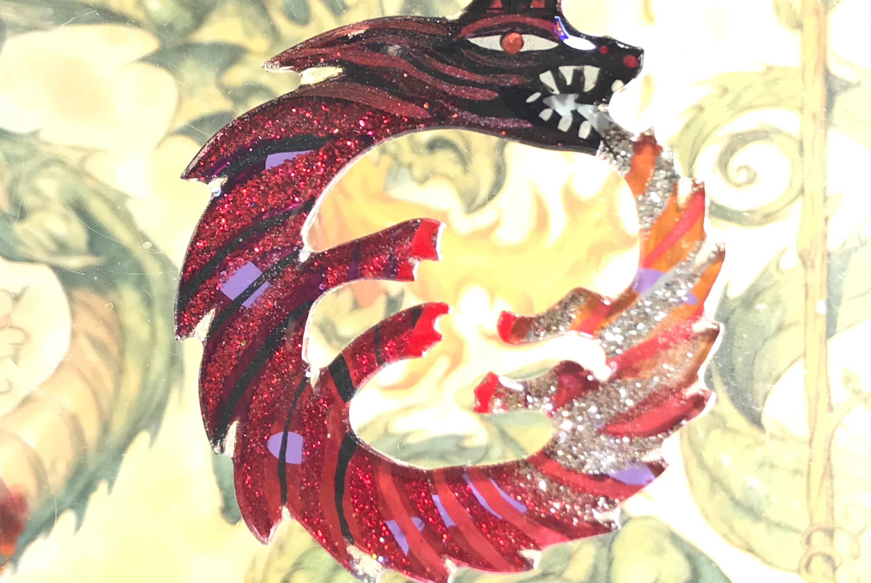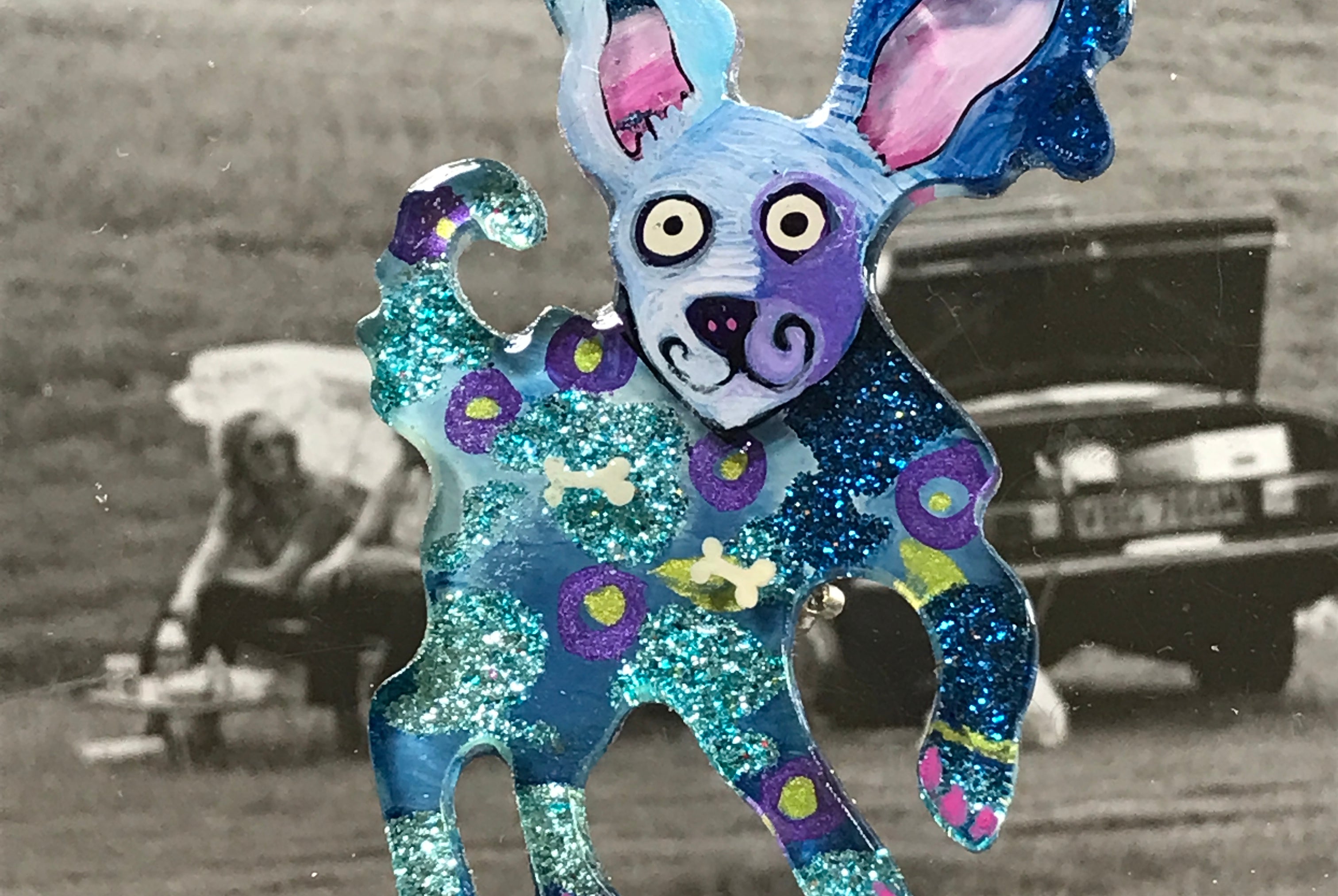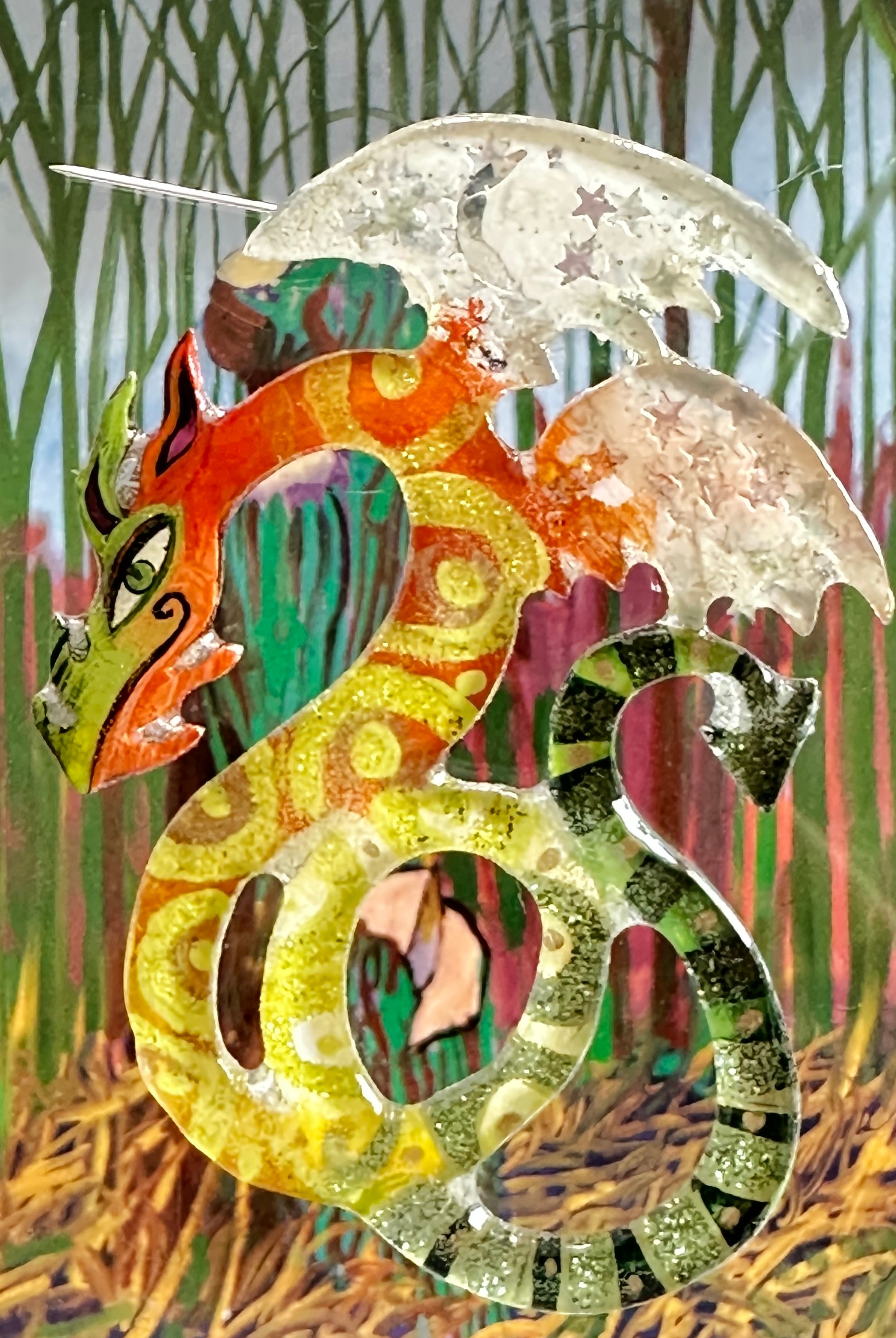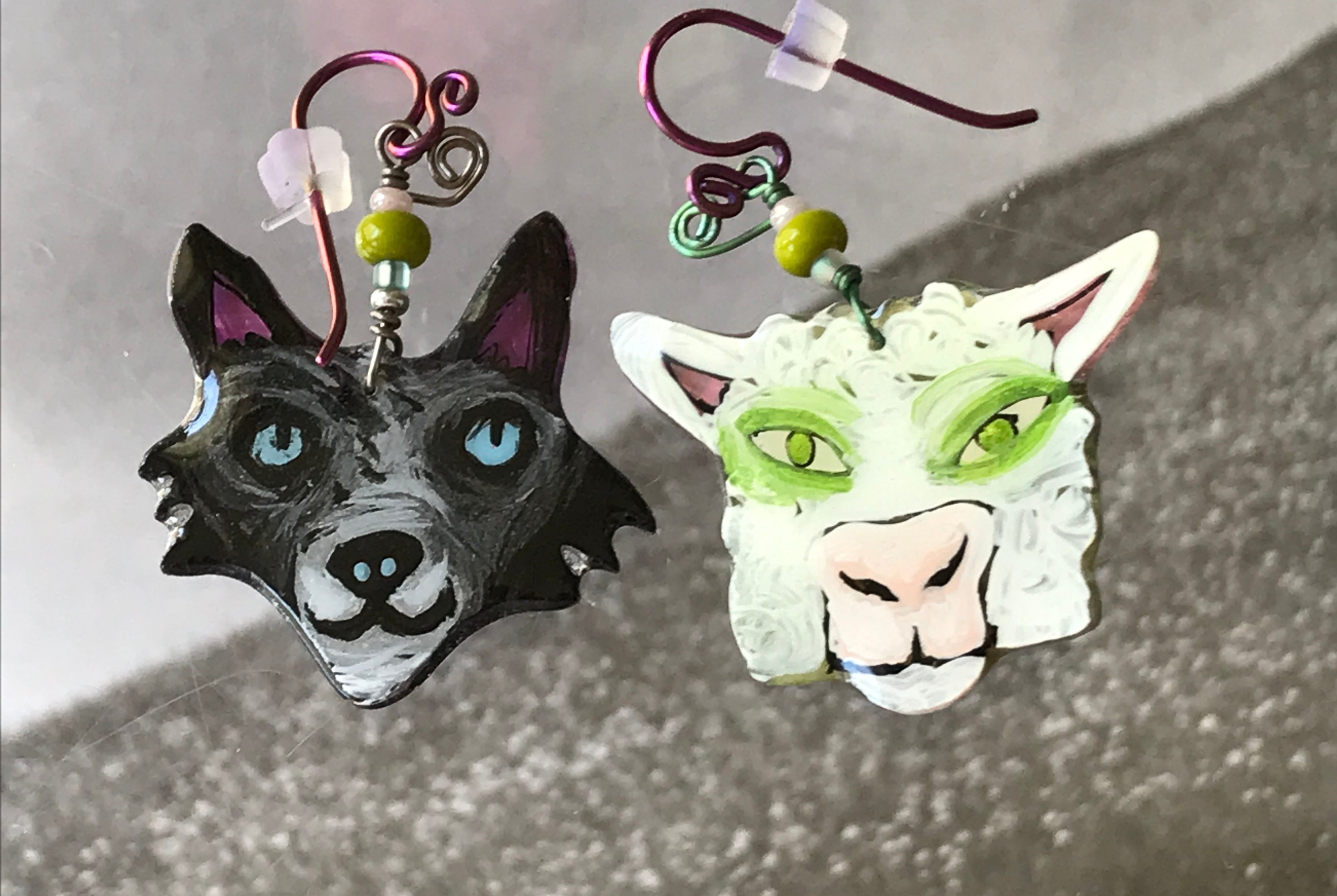 For me, these are little paintings that you can wear. If you are thinking of shrinky-dinks, I'm sure that was in my mind when I came up with lasercutting the shapes and then painting with the same paints I use on canvas. It's a multi layered process that takes a long time. The painting takes the longest, but it is the most rewarding. They are coated with a thick and sturdy glaze that brings out the depth and color.