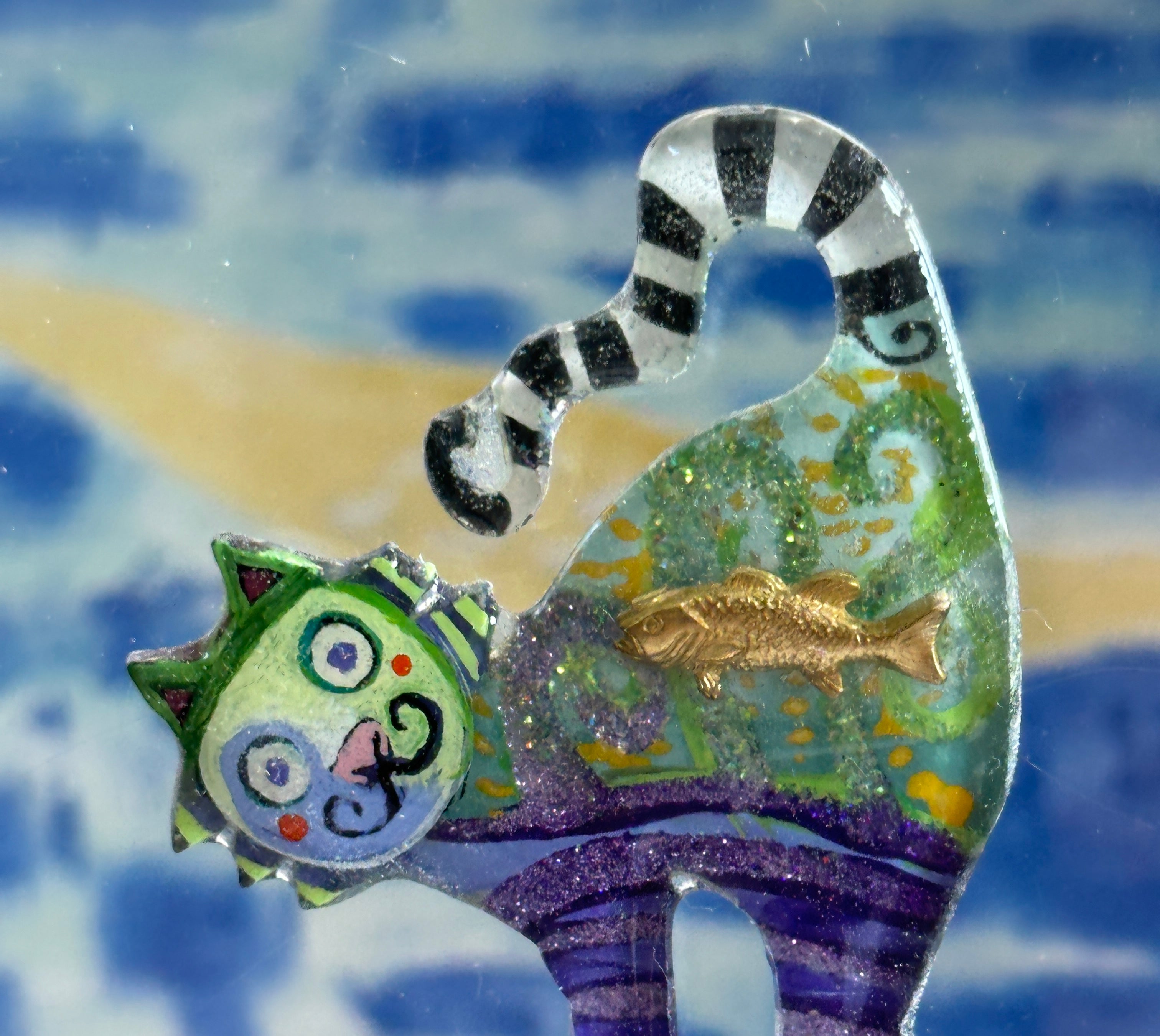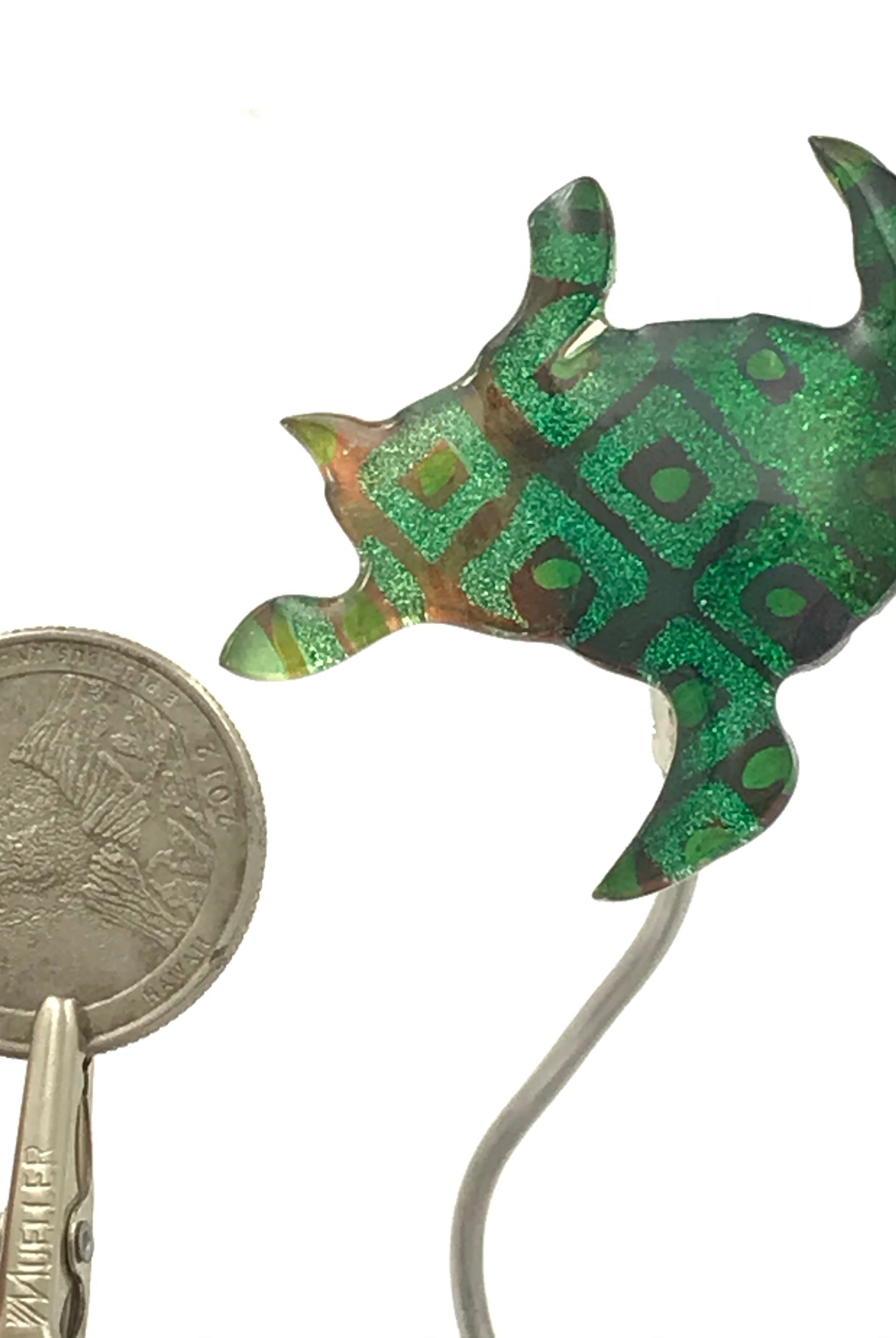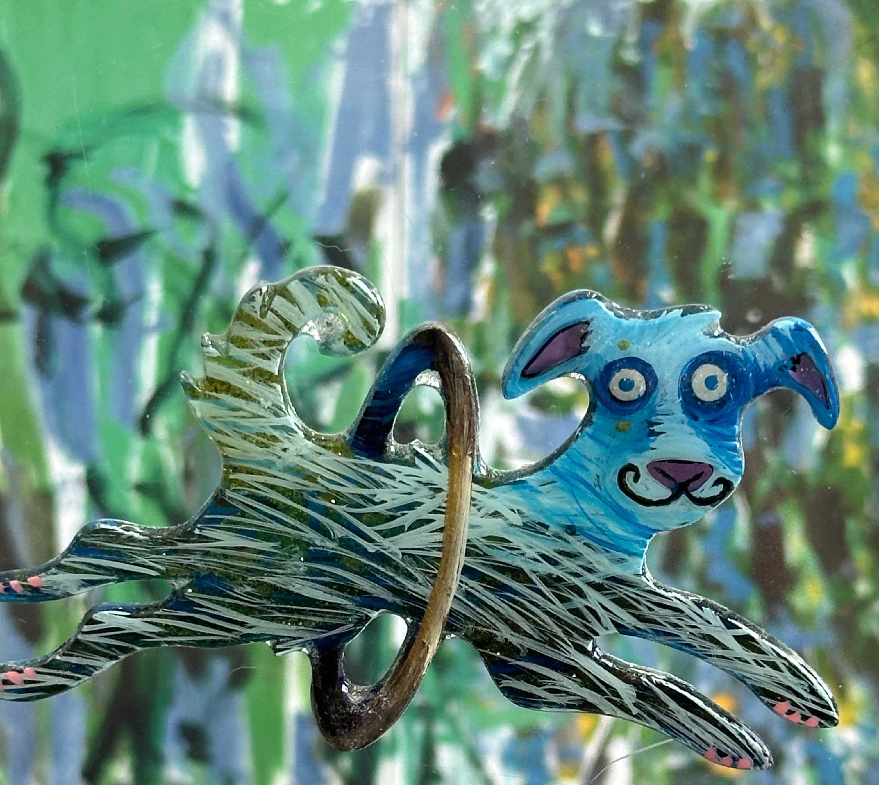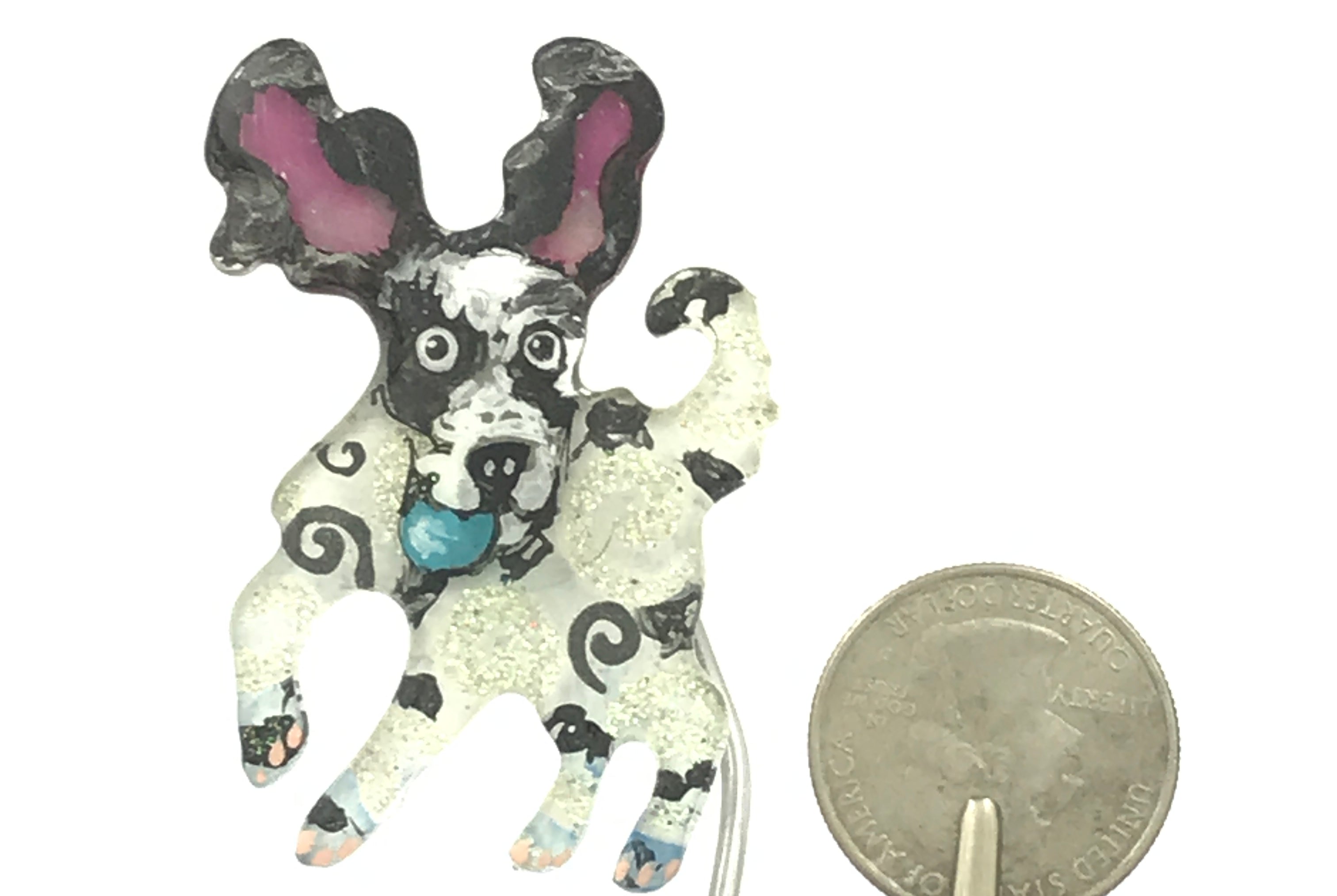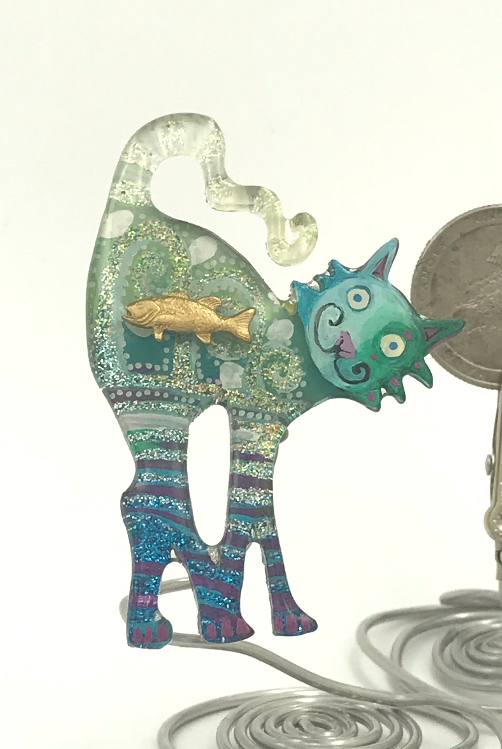 For me, these are little paintings that you can wear. If you are thinking of shrinky-dinks, I'm sure that was in my mind when I came up with lasercutting the shapes and then painting with the same paints I use on canvas. It's a multi layered process that takes a long time. The painting takes the longest, but it is the most rewarding. They are coated with a thick and sturdy glaze that brings out the depth and color.