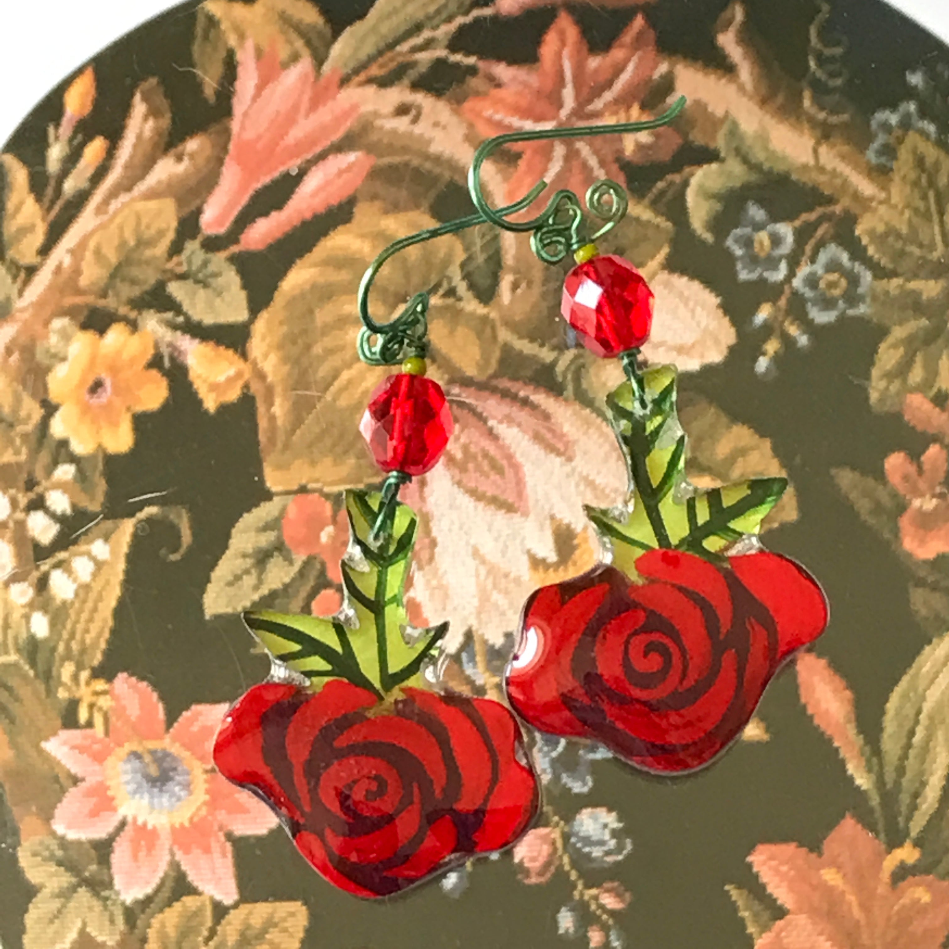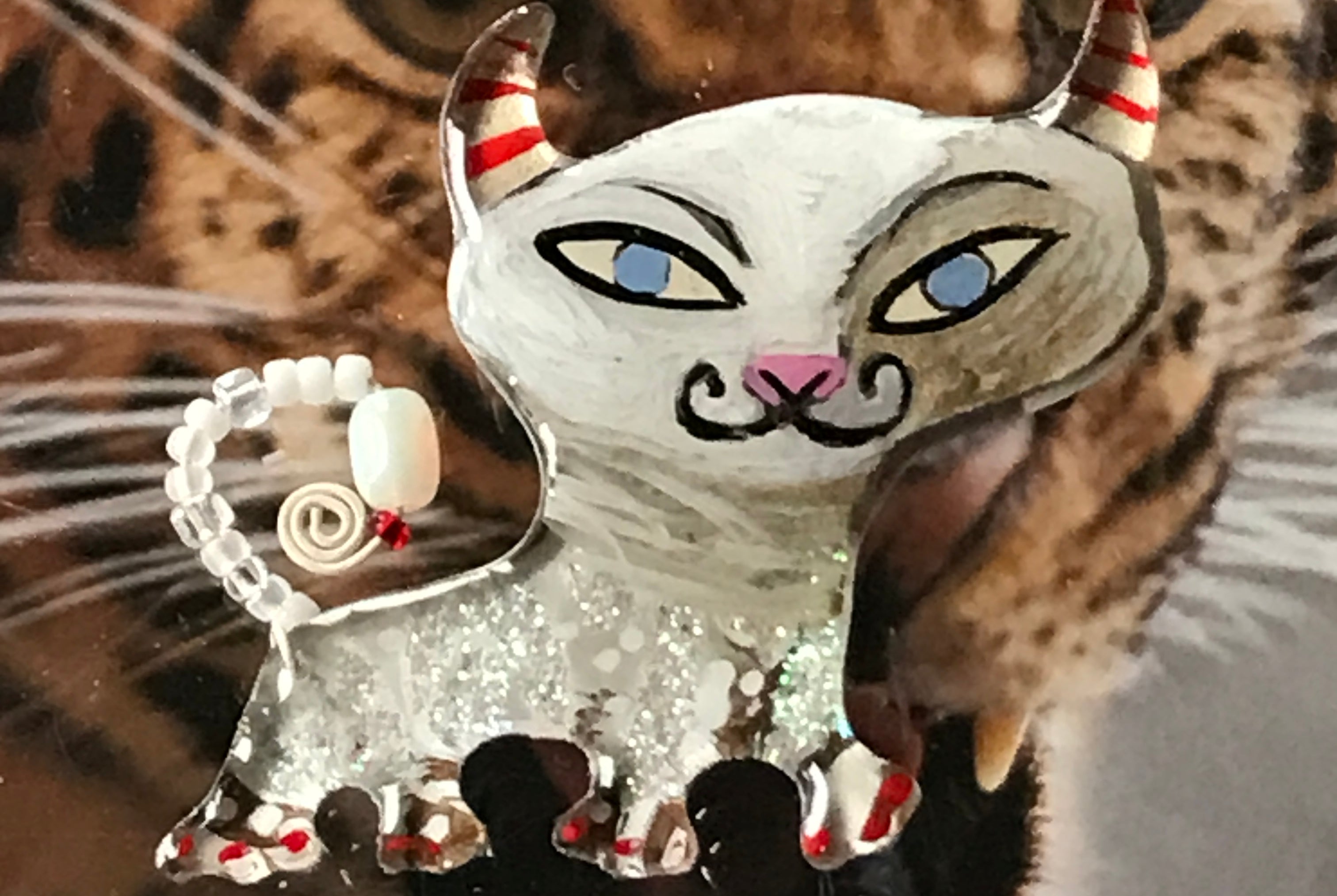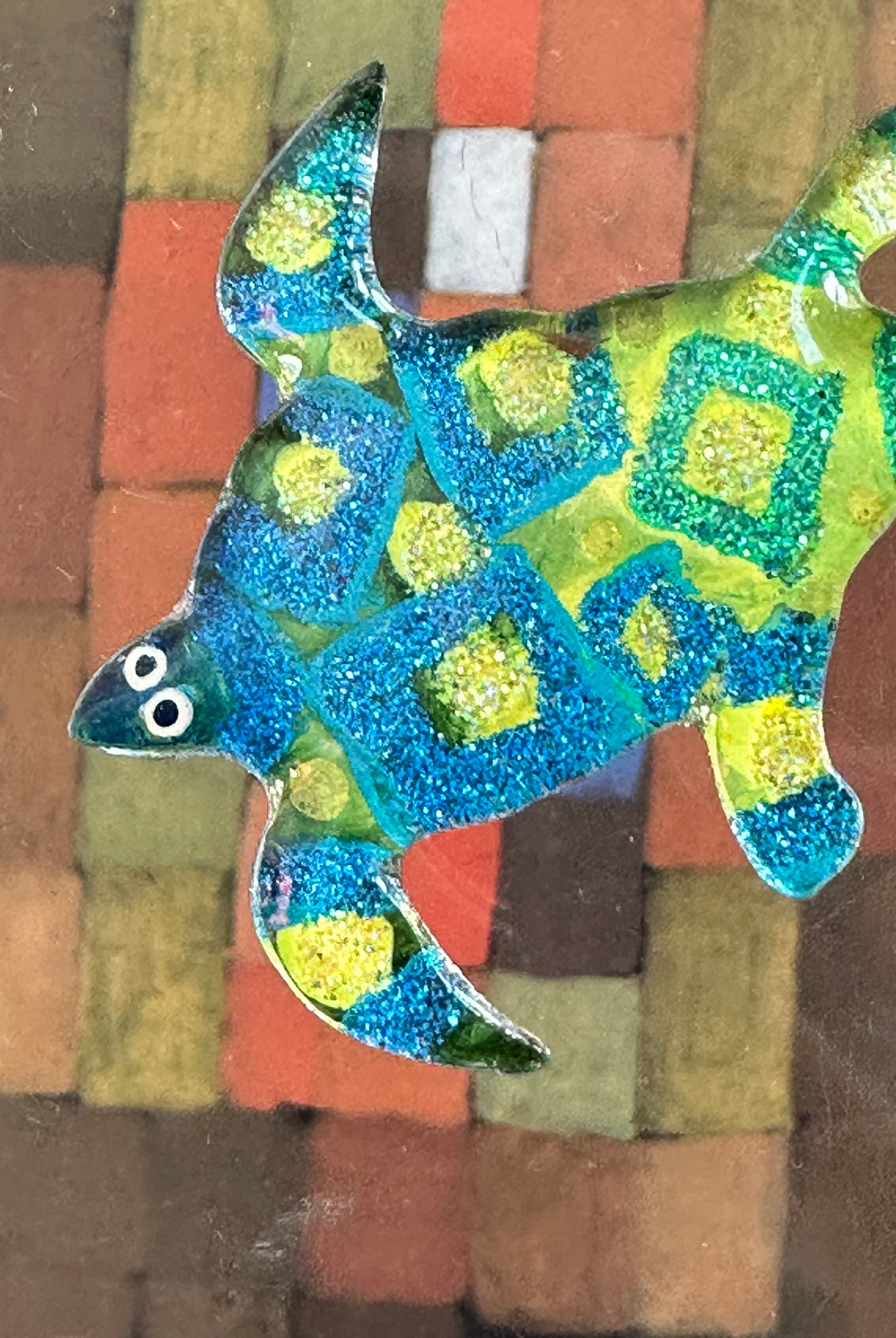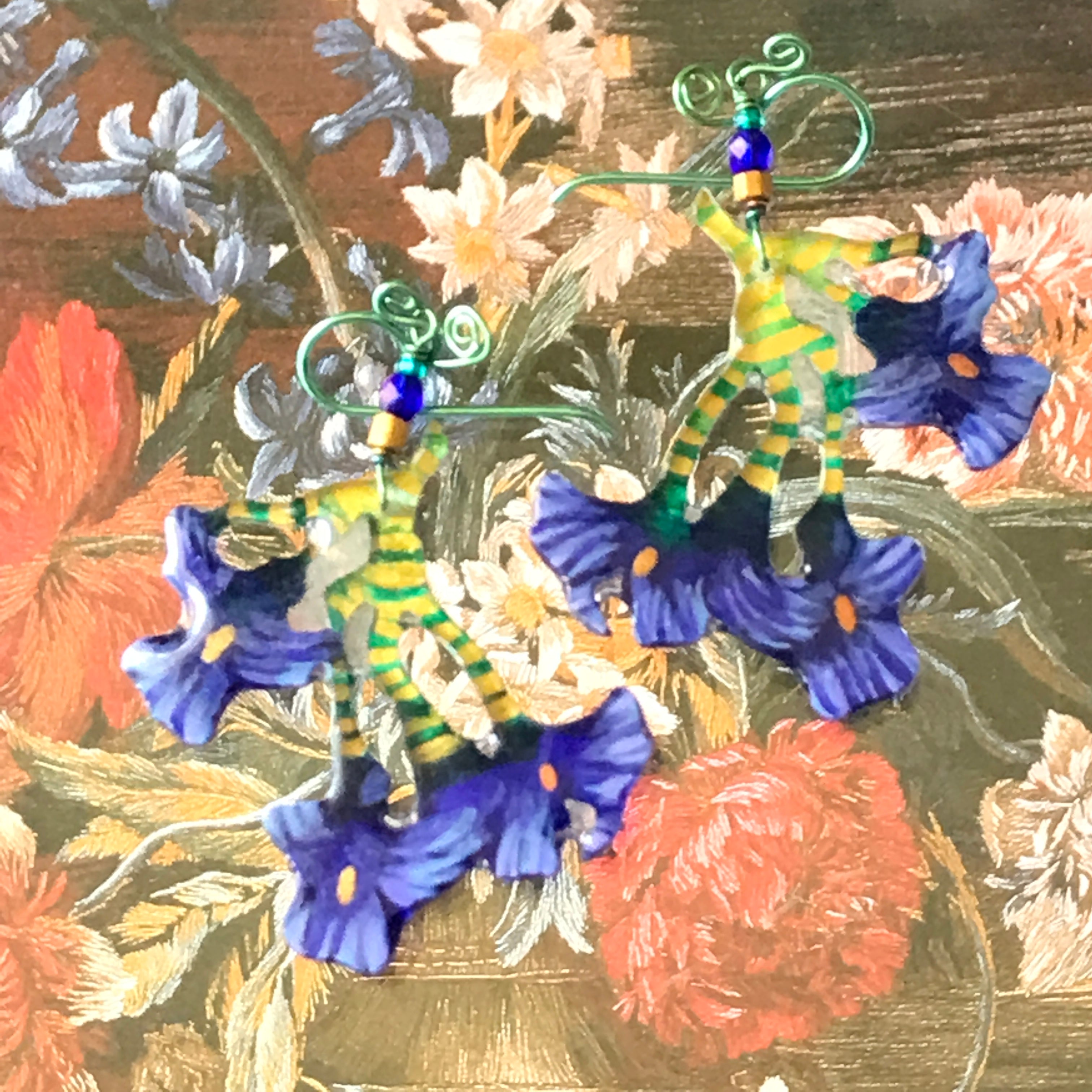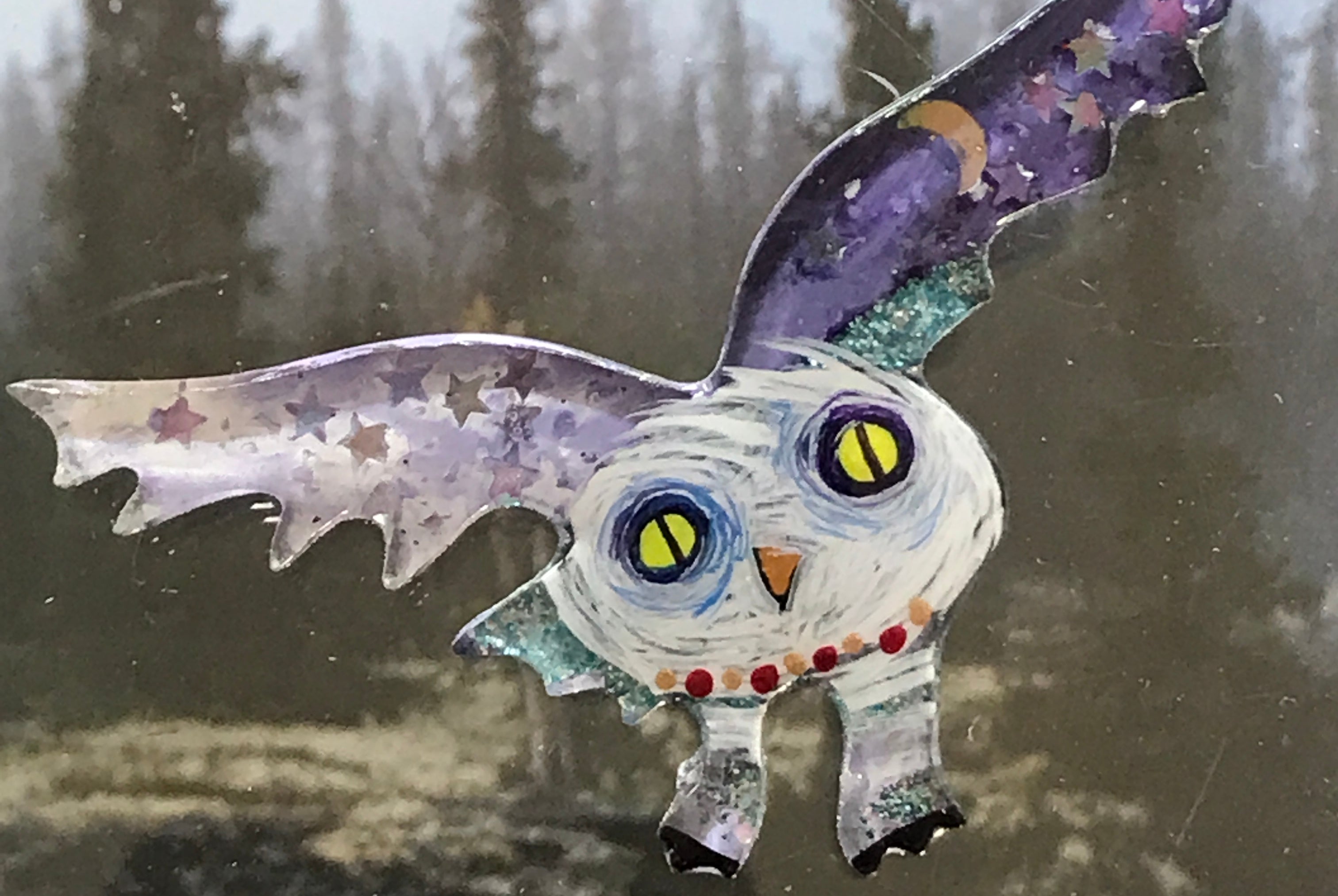 For me, these are little paintings that you can wear. If you are thinking of shrinky-dinks, I'm sure that was in my mind when I came up with lasercutting the shapes and then painting with the same paints I use on canvas. It's a multi layered process that takes a long time. The painting takes the longest, but it is the most rewarding. They are coated with a thick and sturdy glaze that brings out the depth and color.