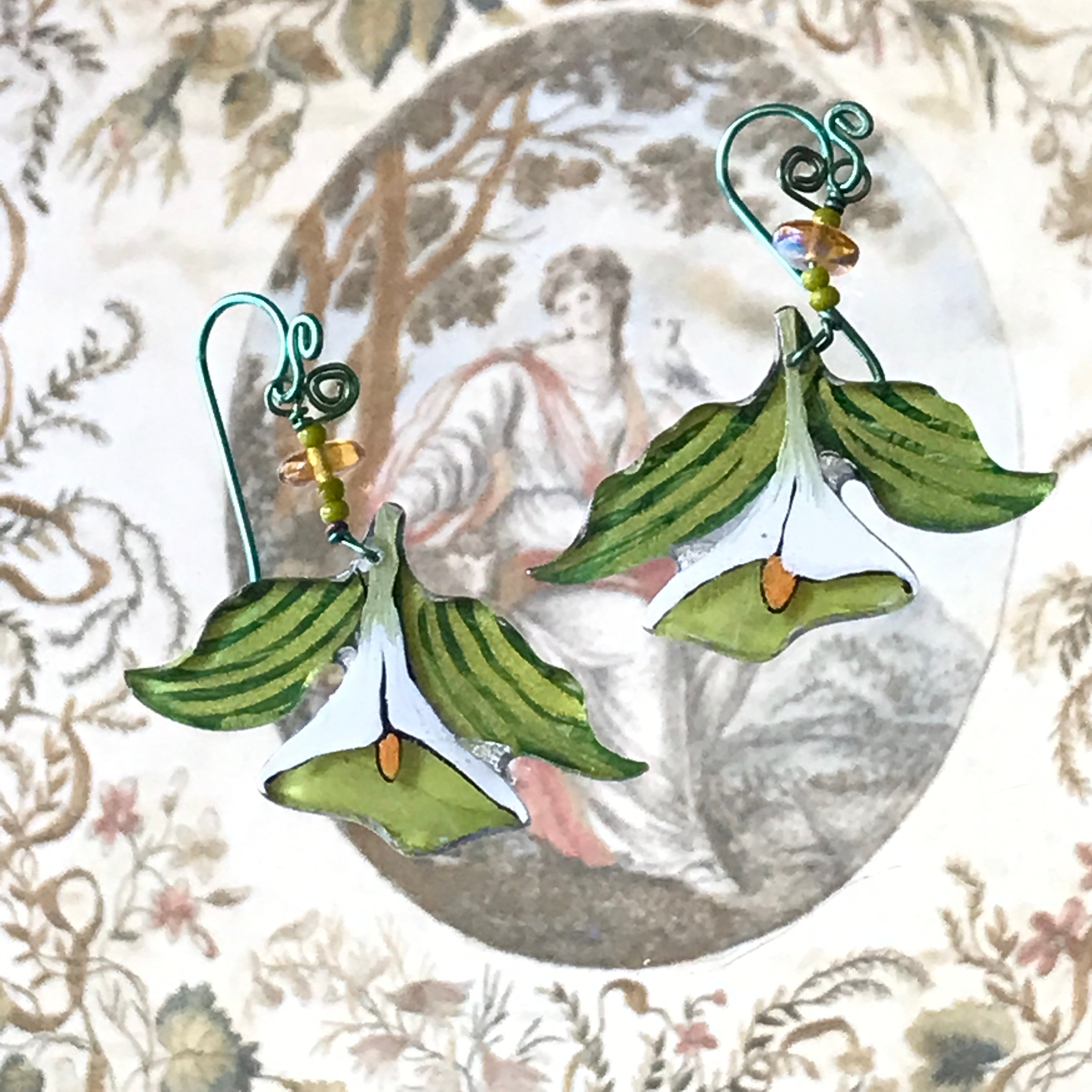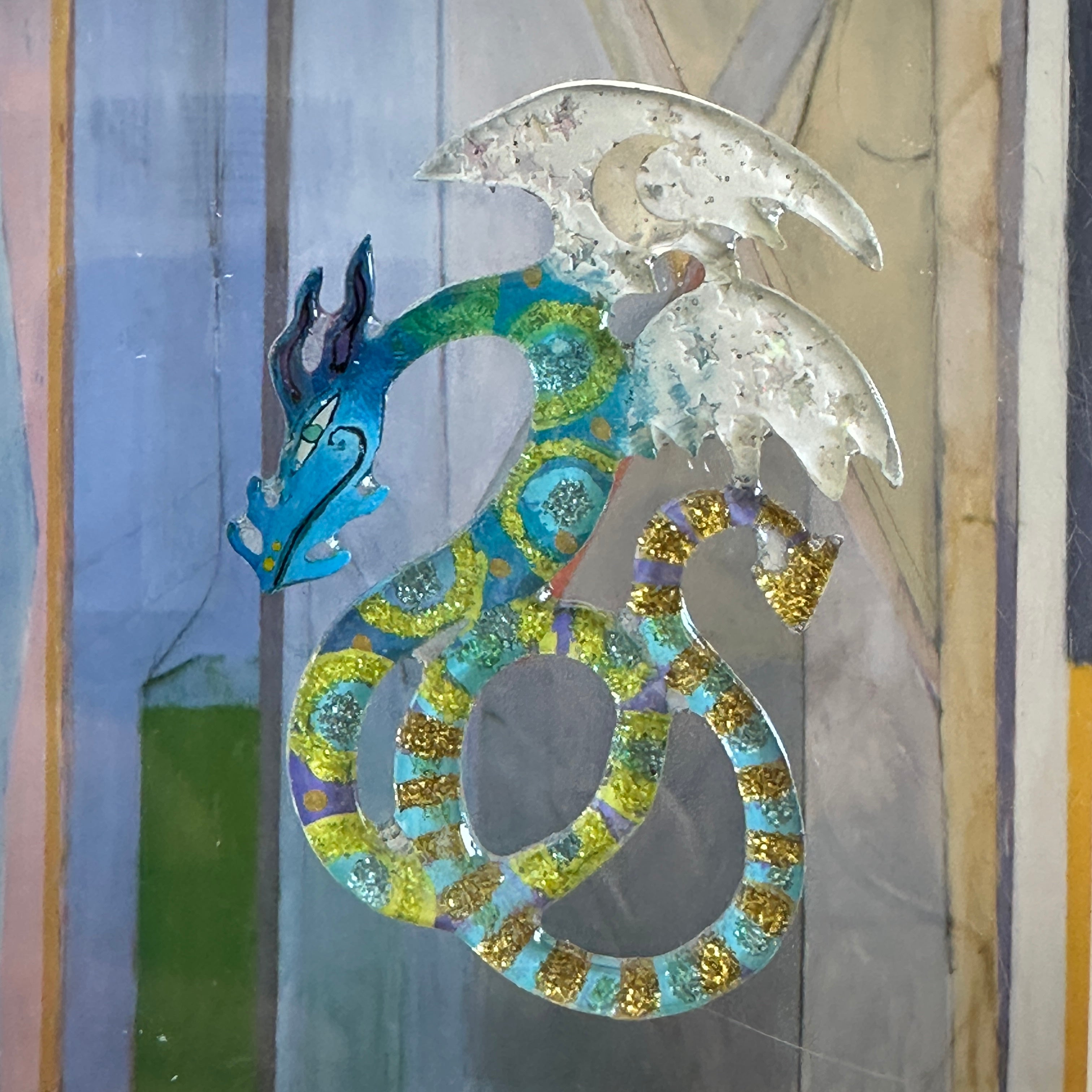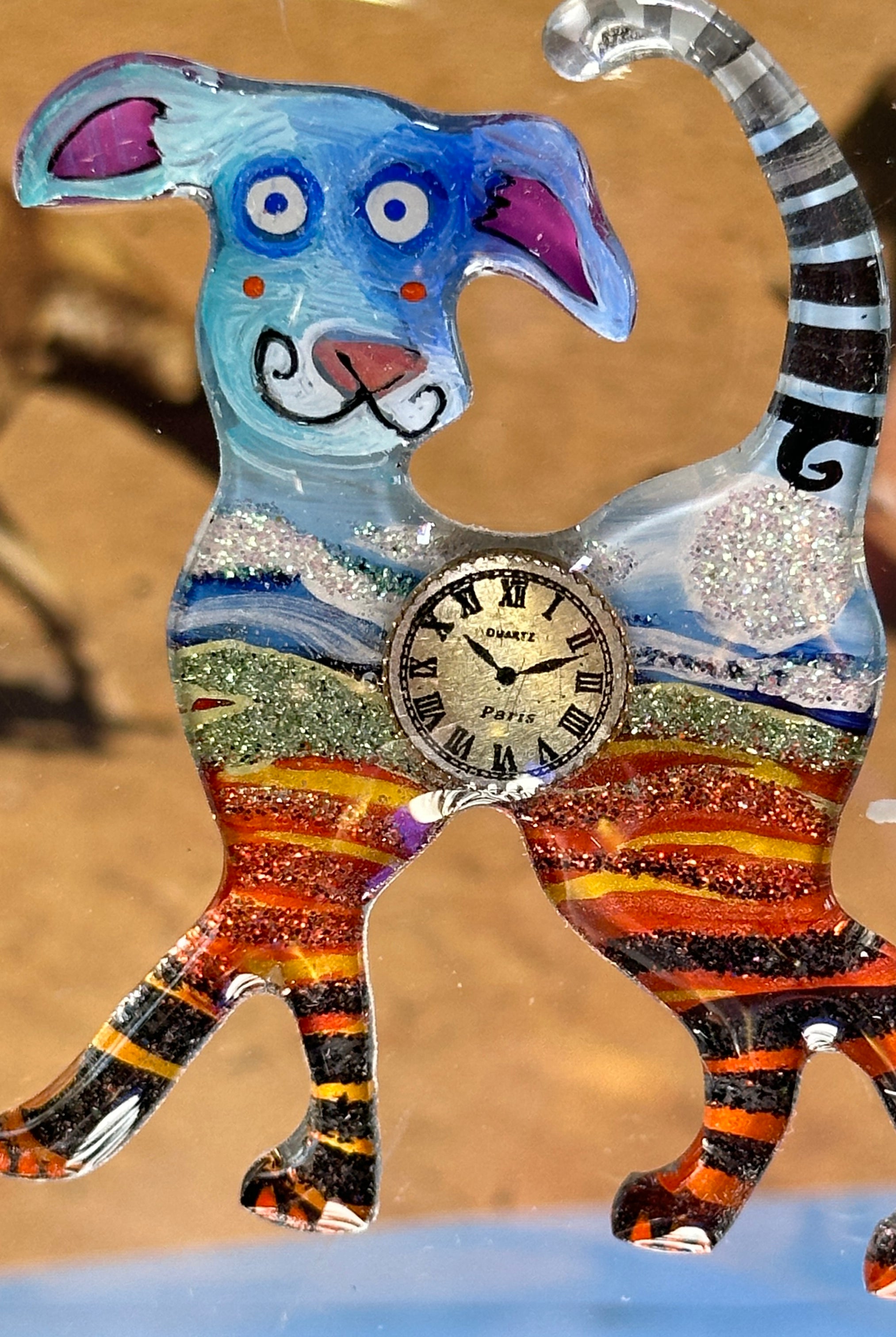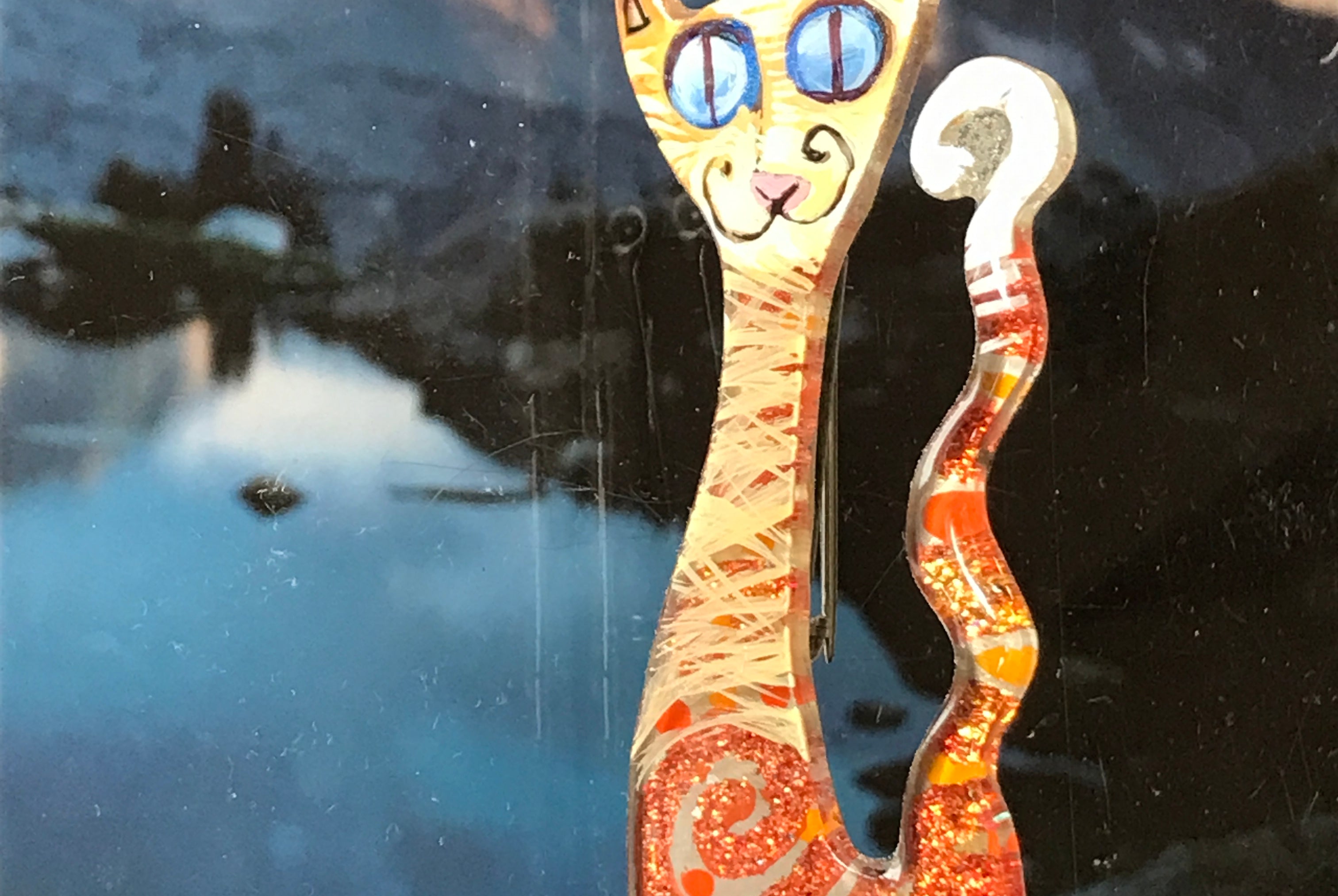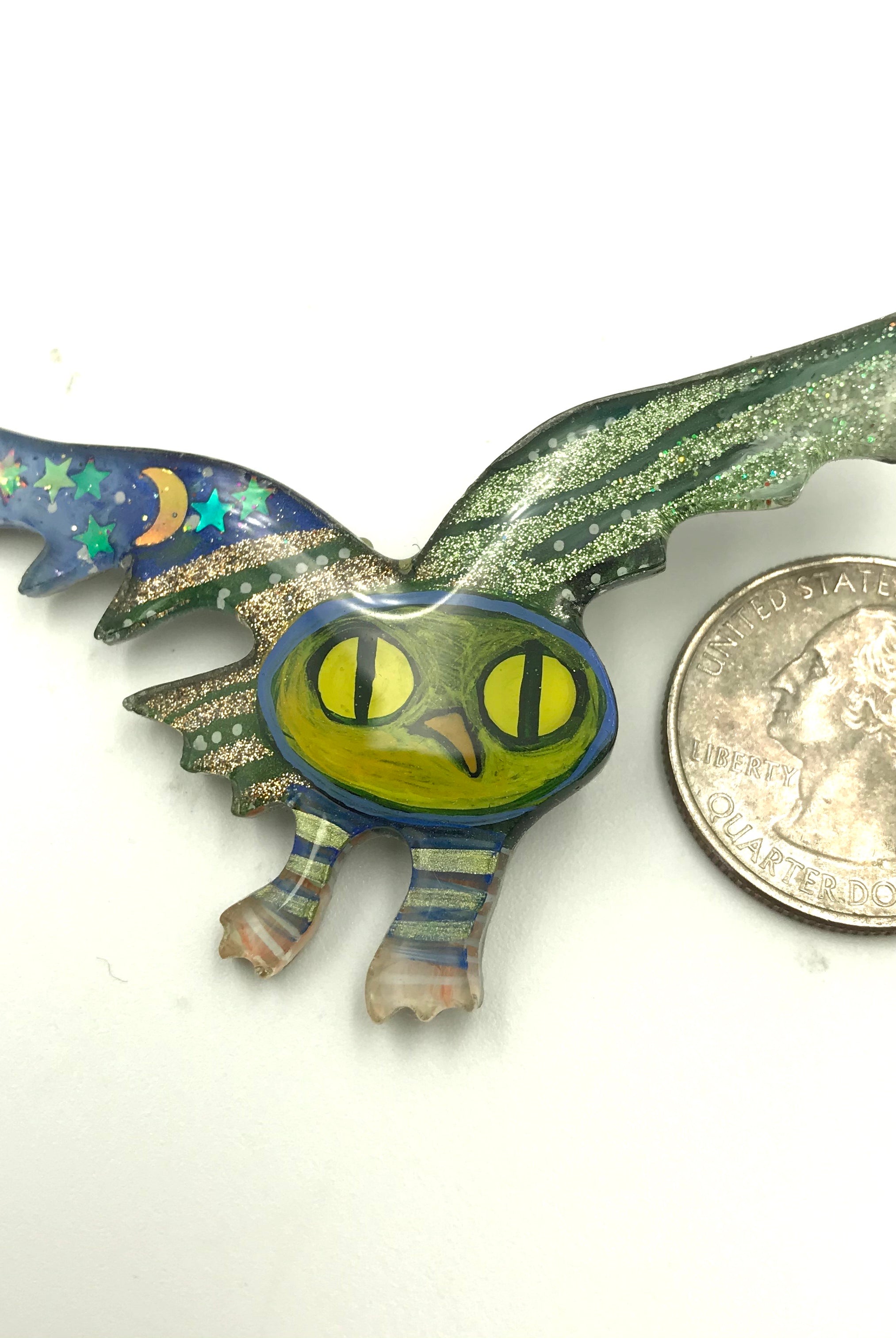 For me, these are little paintings that you can wear. If you are thinking of shrinky-dinks, I'm sure that was in my mind when I came up with lasercutting the shapes and then painting with the same paints I use on canvas. It's a multi layered process that takes a long time. The painting takes the longest, but it is the most rewarding. They are coated with a thick and sturdy glaze that brings out the depth and color.