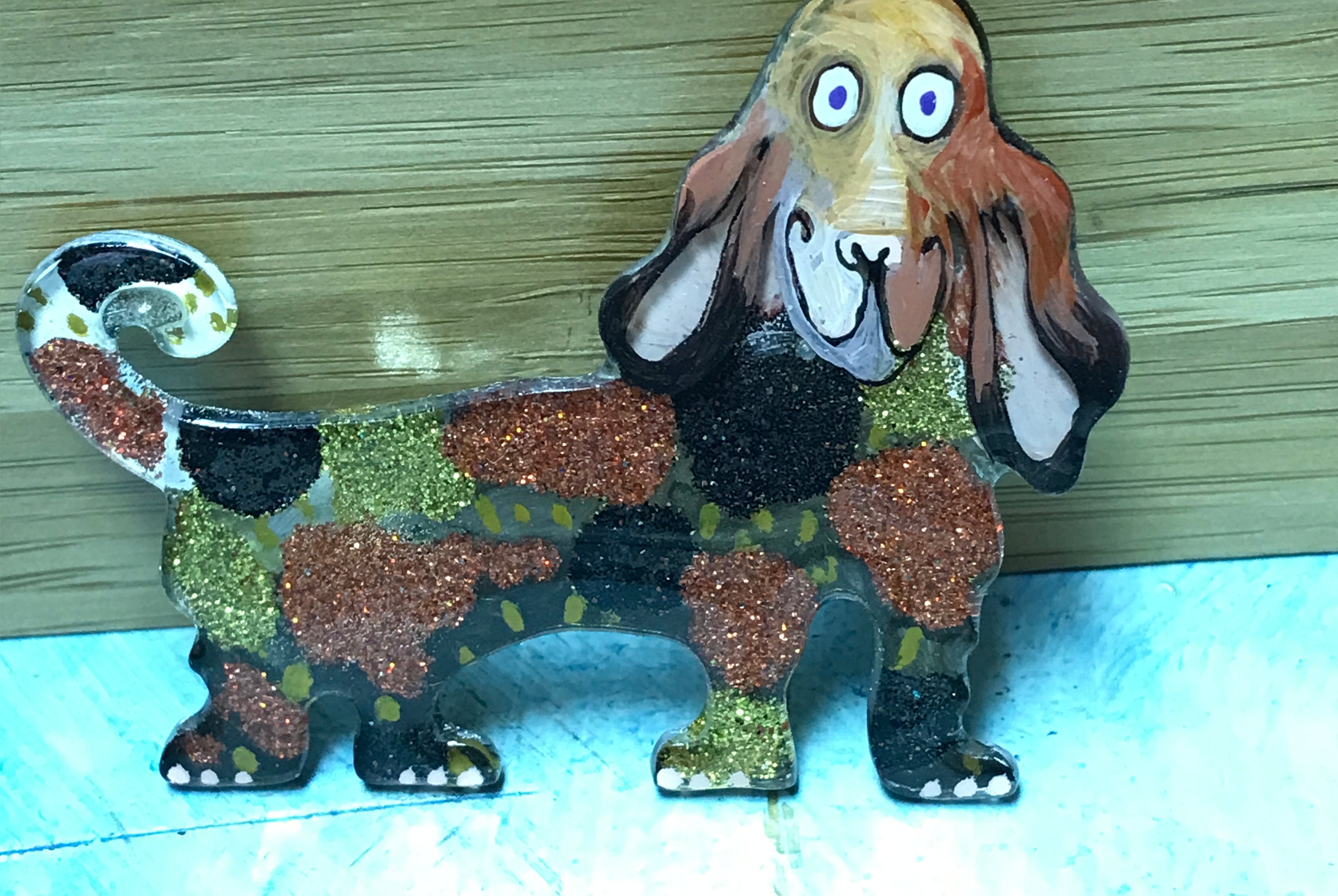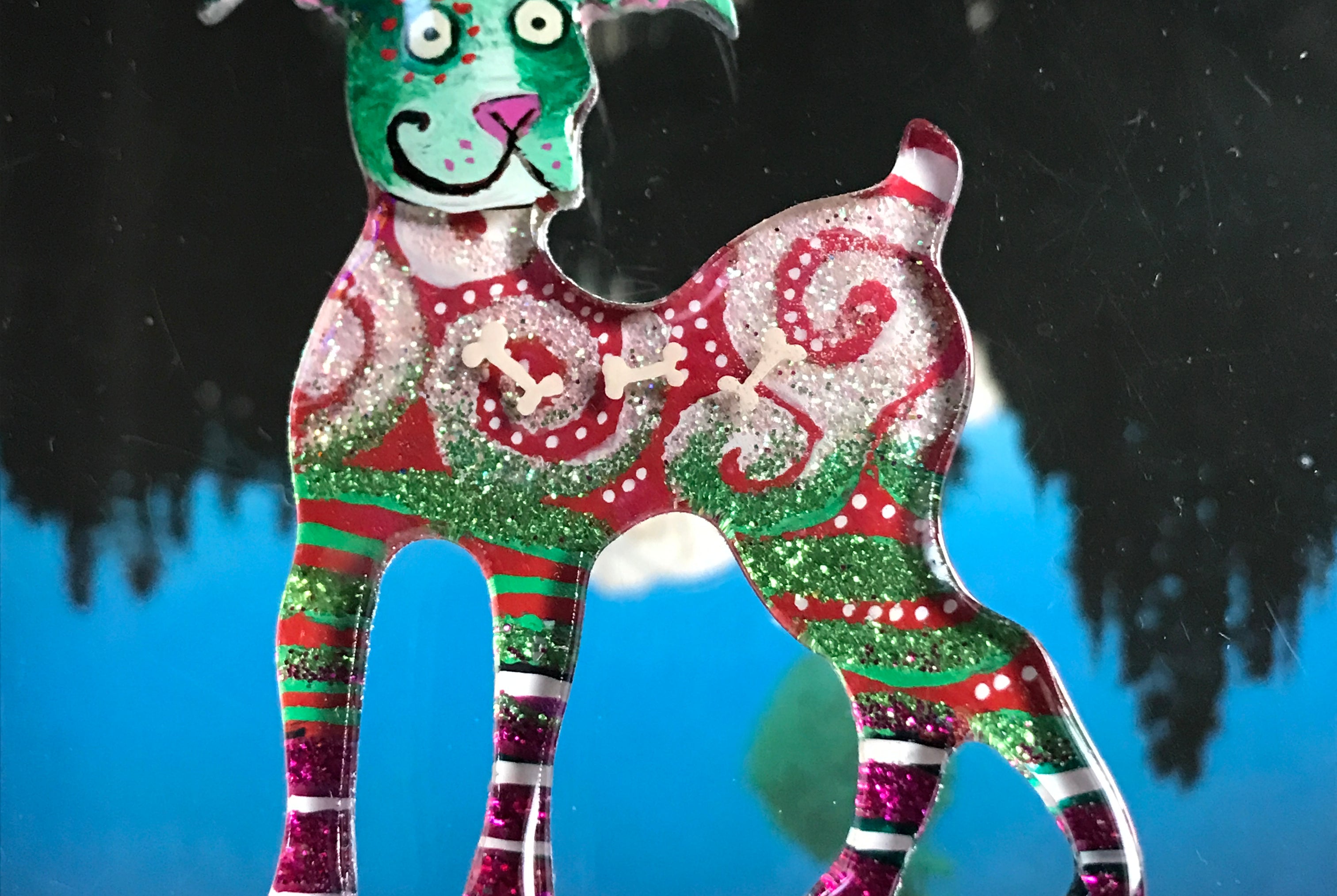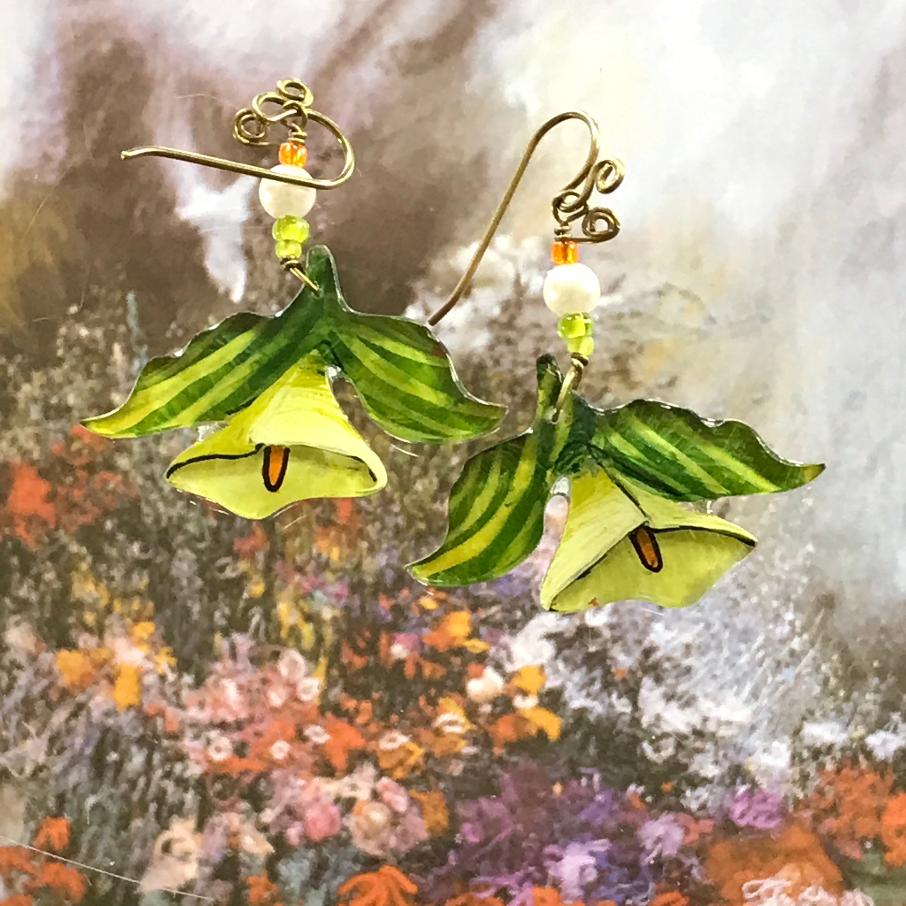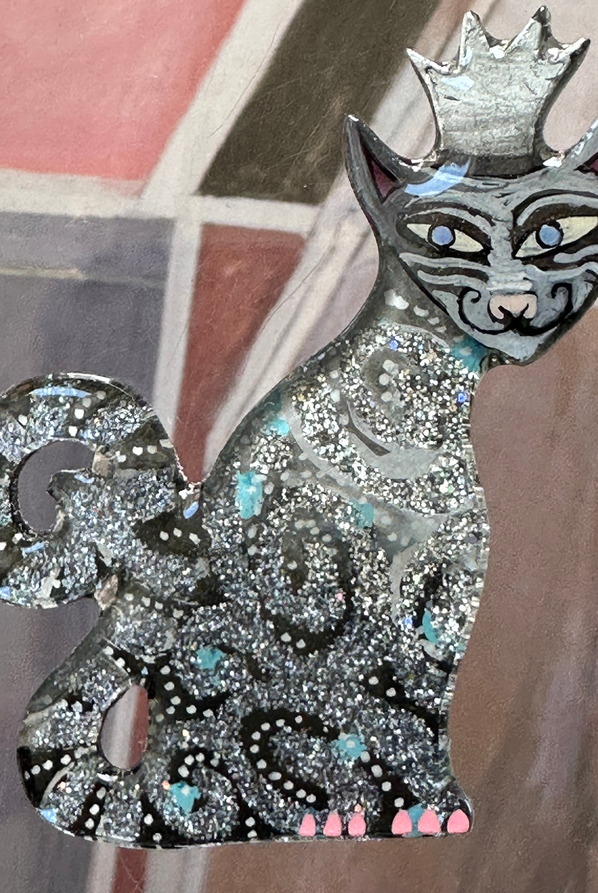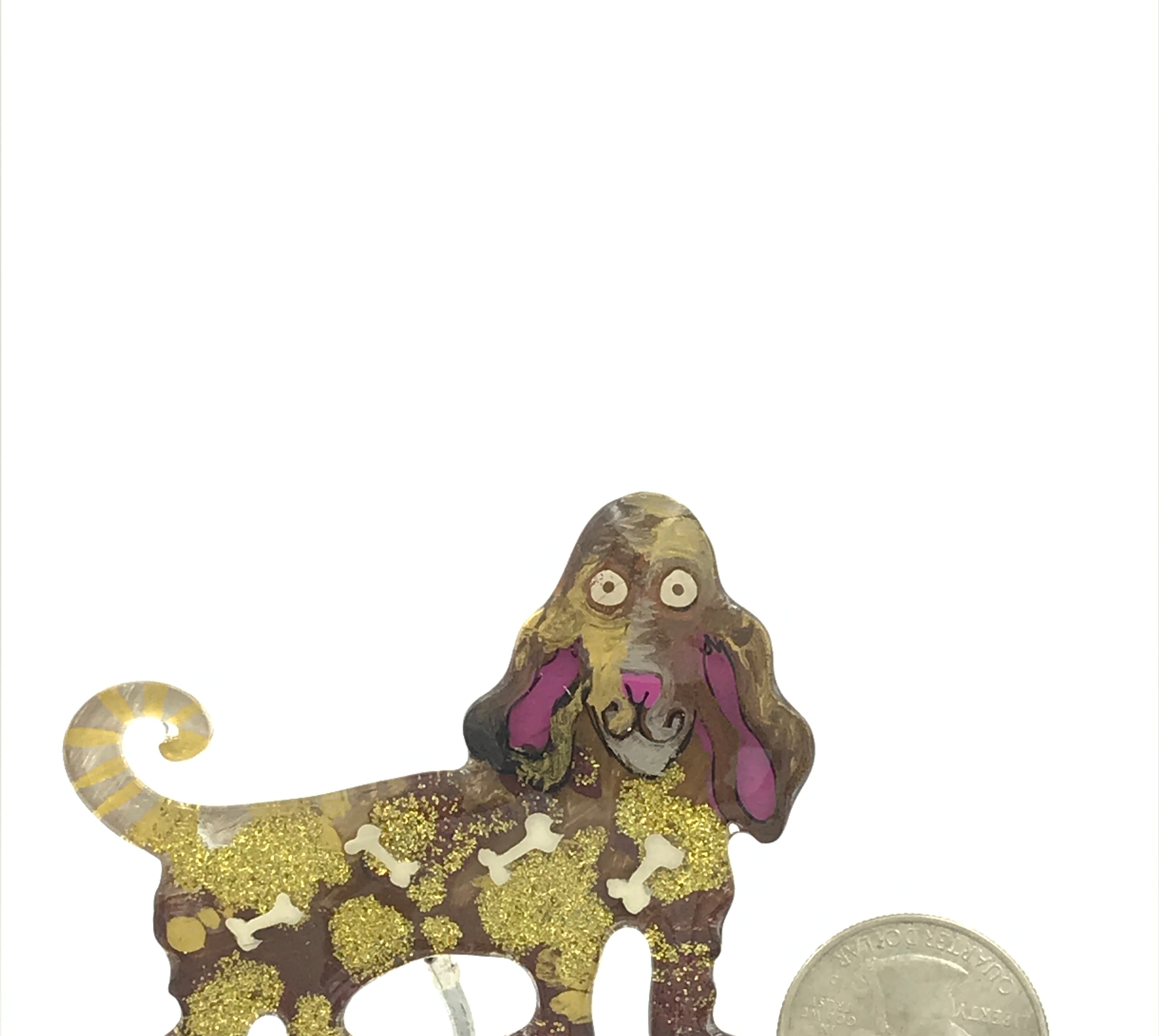 For me, these are little paintings that you can wear. If you are thinking of shrinky-dinks, I'm sure that was in my mind when I came up with lasercutting the shapes and then painting with the same paints I use on canvas. It's a multi layered process that takes a long time. The painting takes the longest, but it is the most rewarding. They are coated with a thick and sturdy glaze that brings out the depth and color.