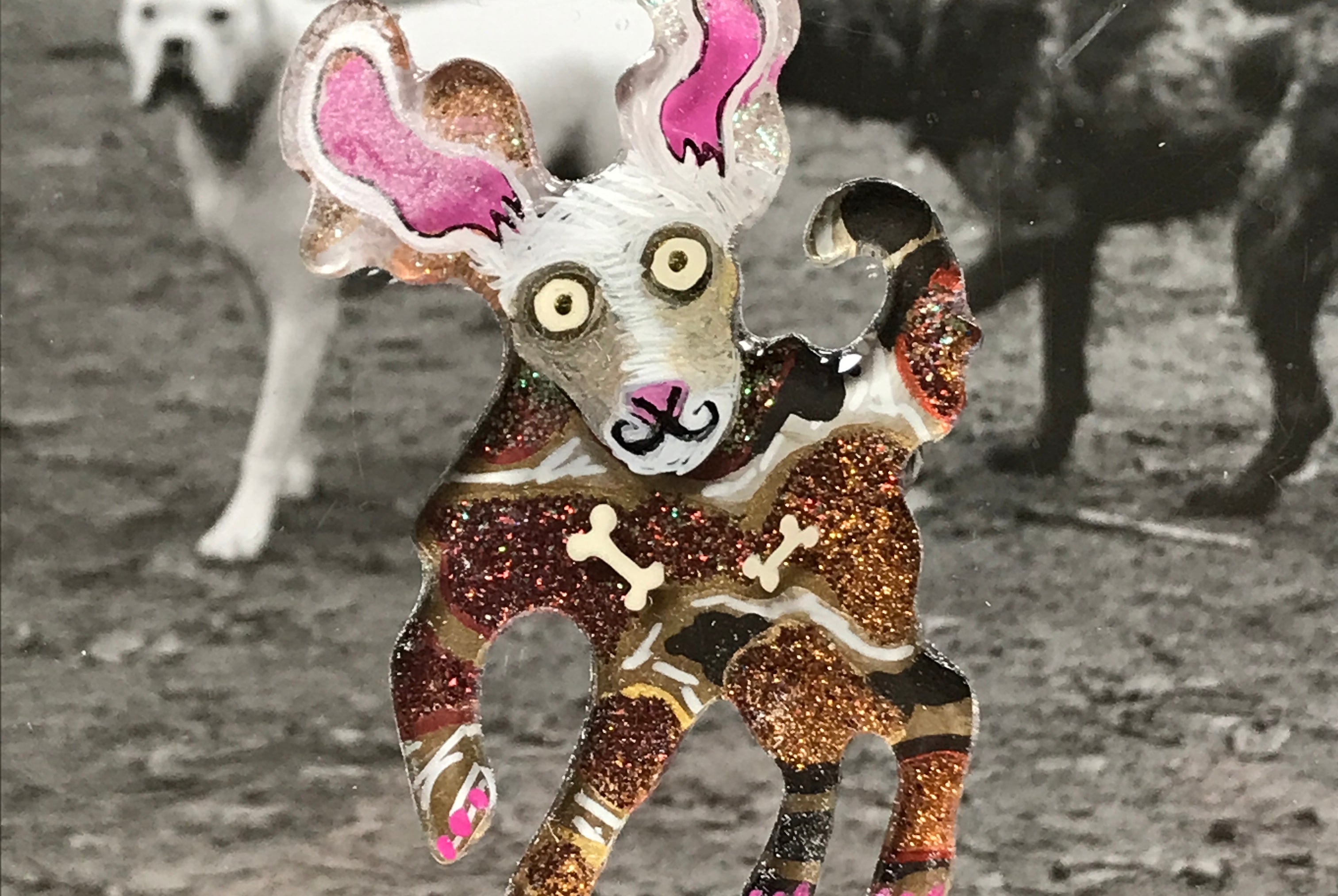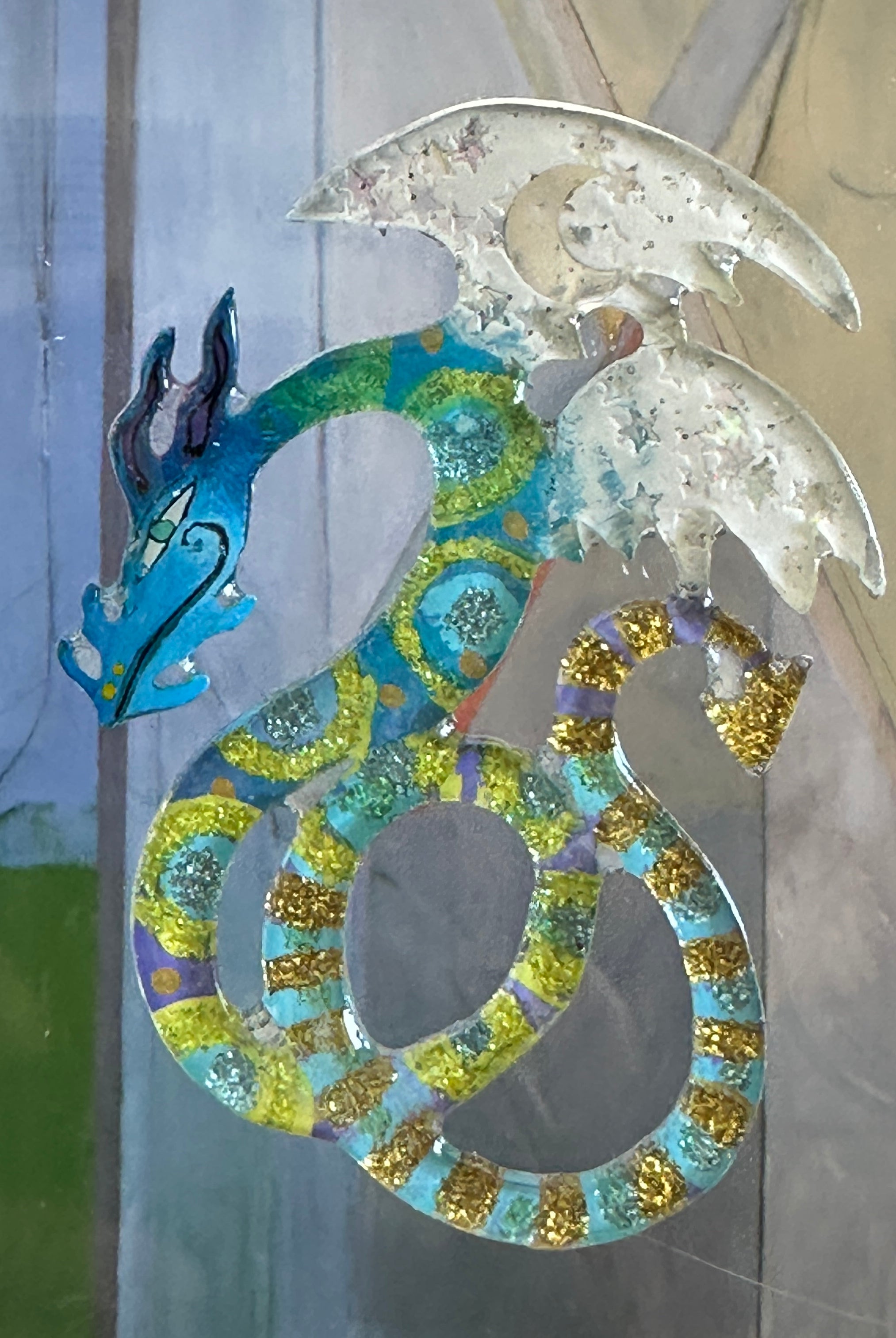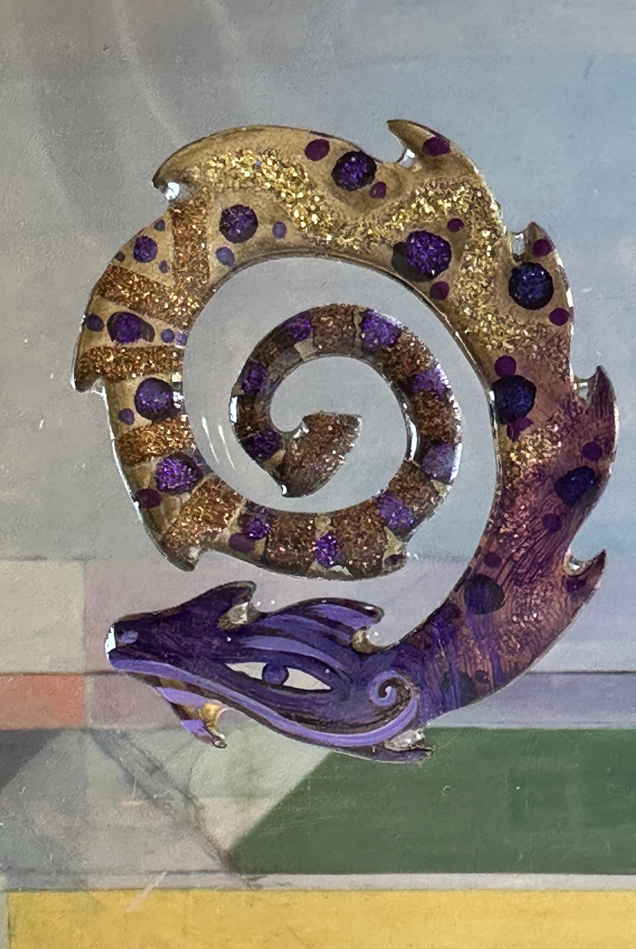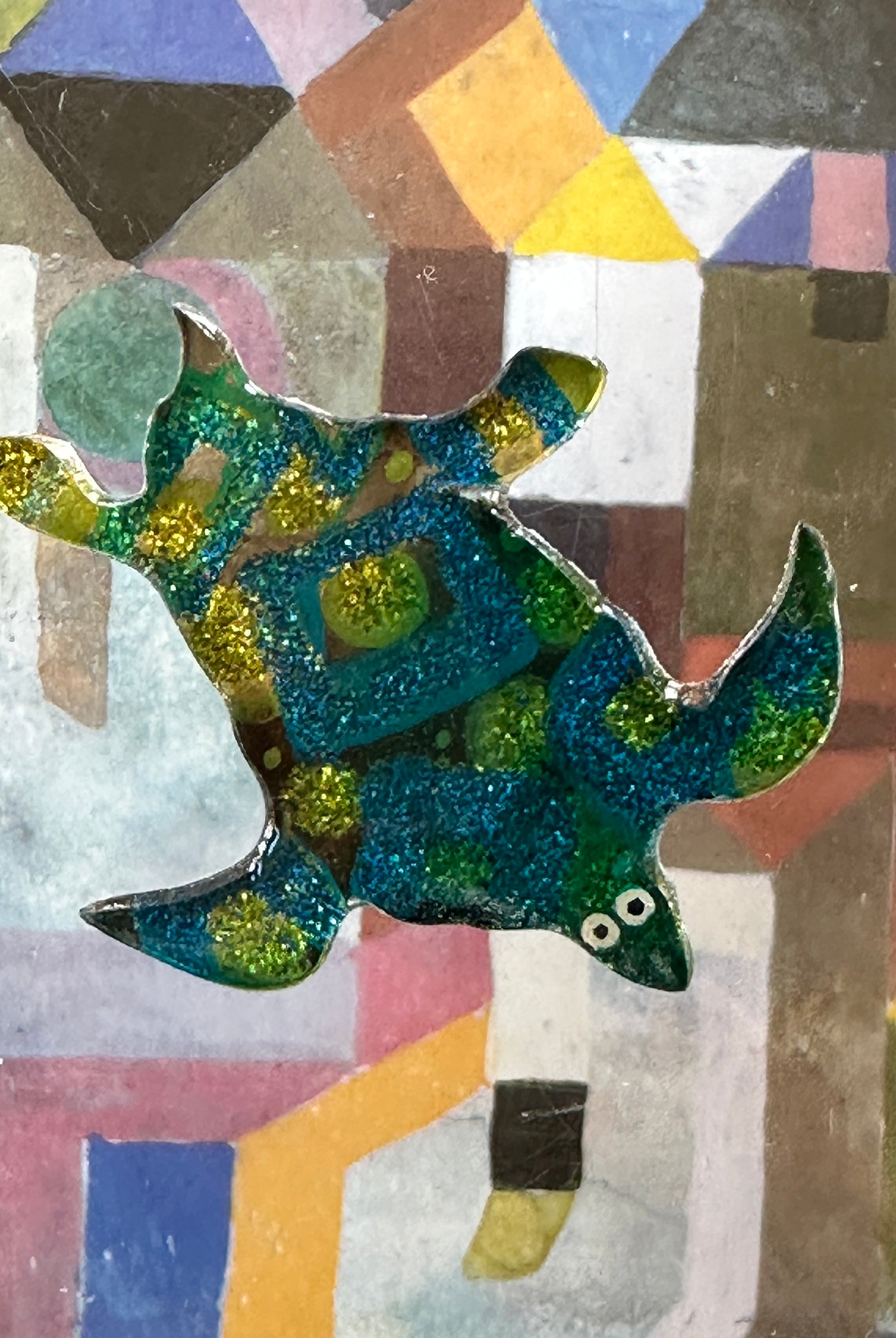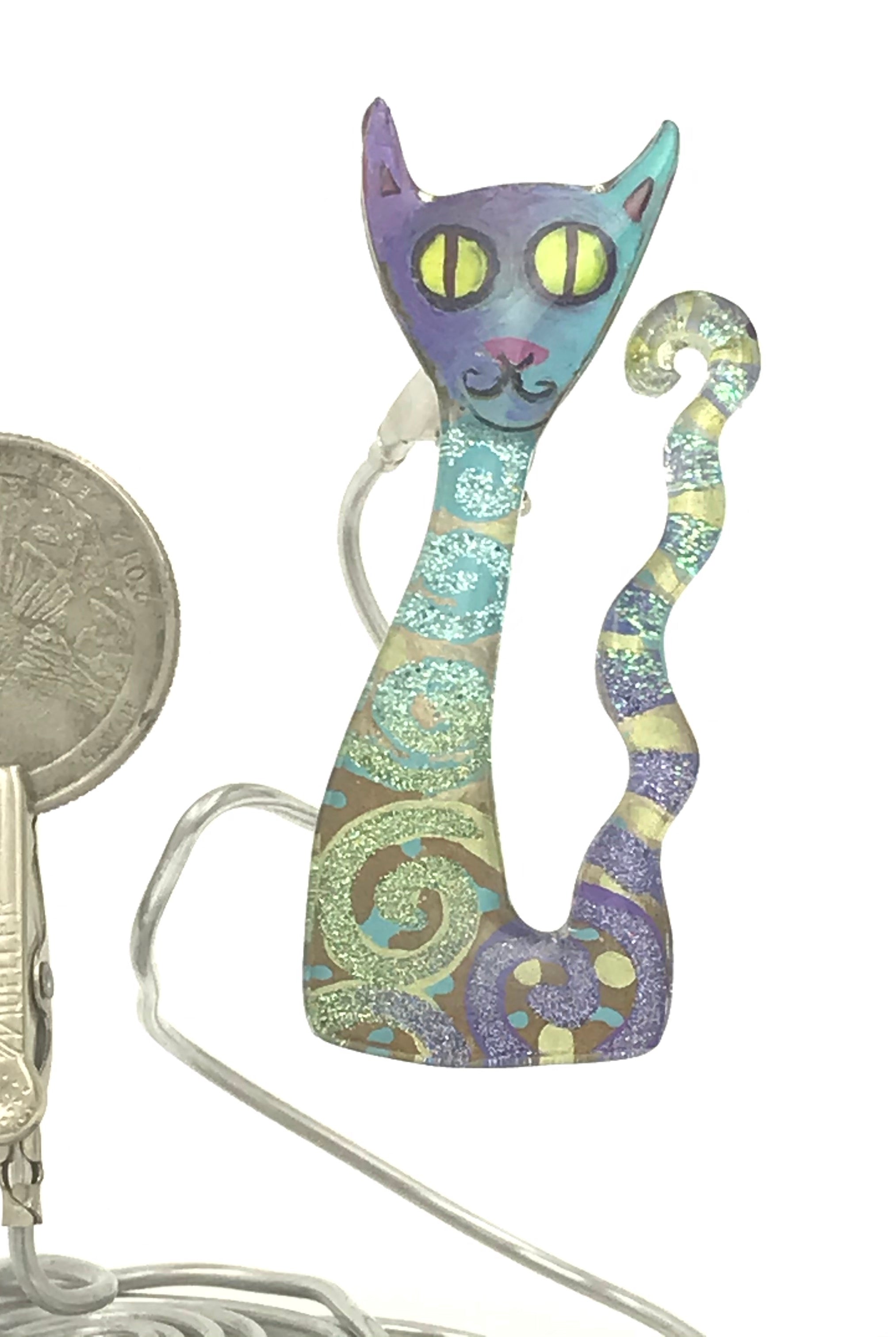 For me, these are little paintings that you can wear. If you are thinking of shrinky-dinks, I'm sure that was in my mind when I came up with lasercutting the shapes and then painting with the same paints I use on canvas. It's a multi layered process that takes a long time. The painting takes the longest, but it is the most rewarding. They are coated with a thick and sturdy glaze that brings out the depth and color.