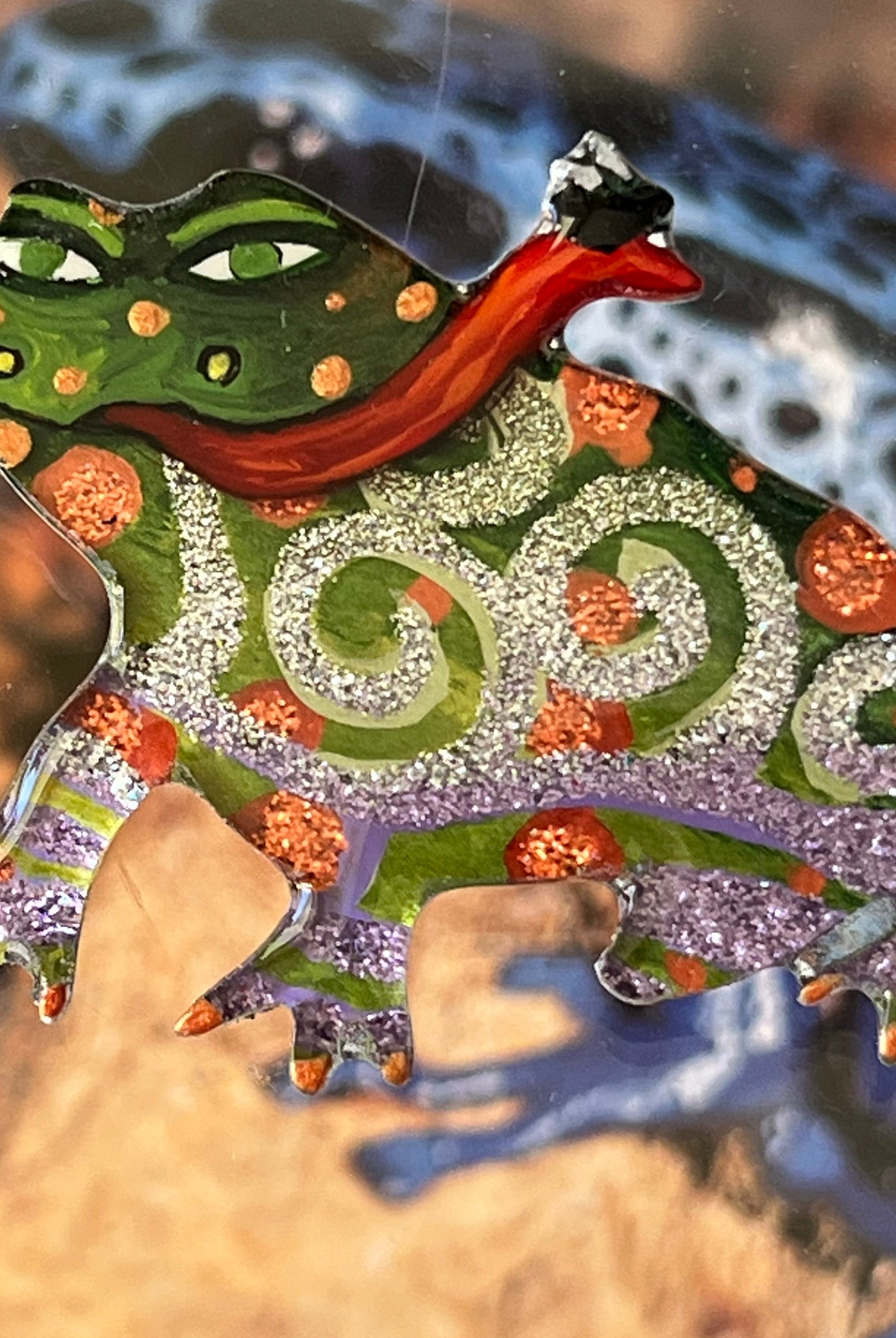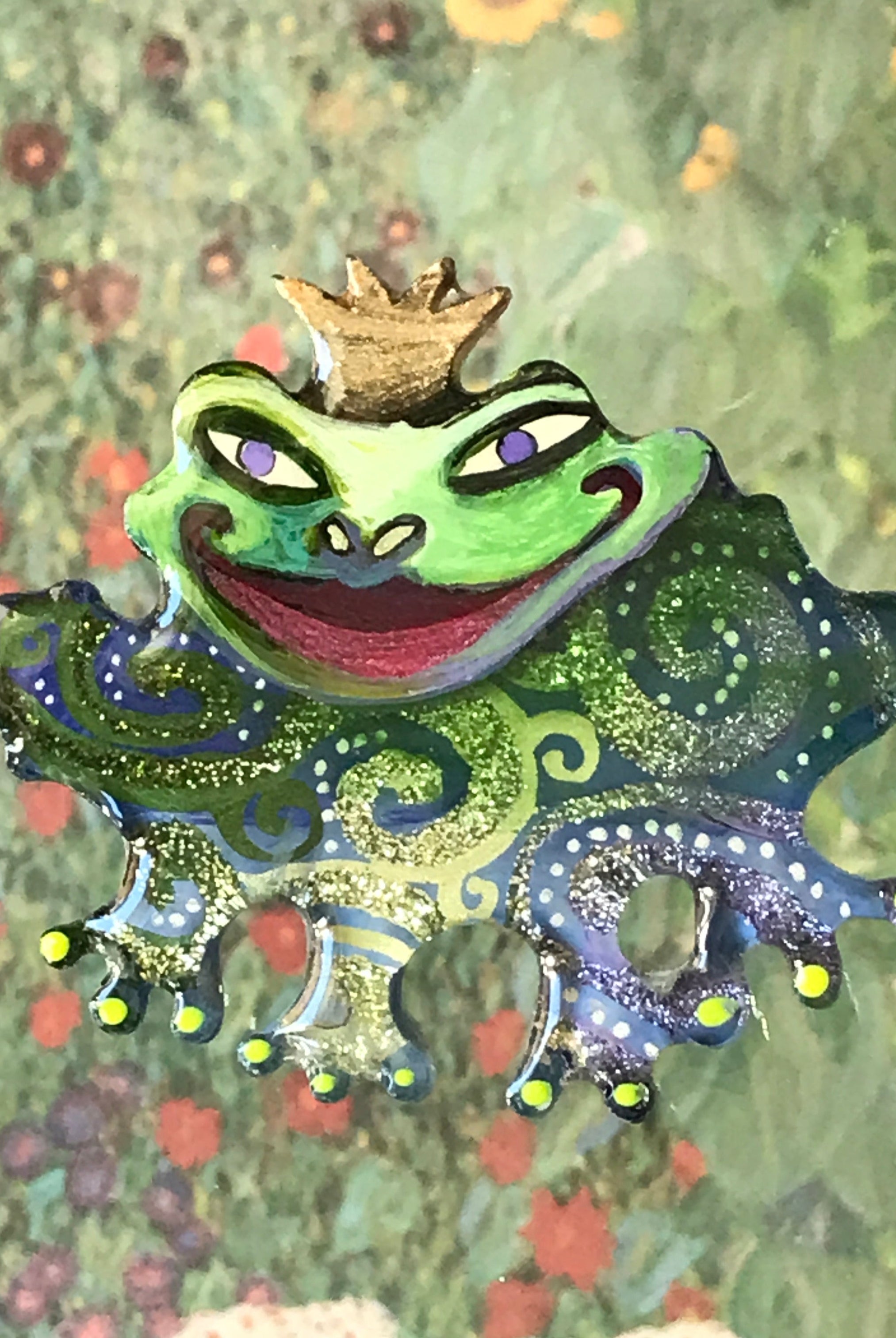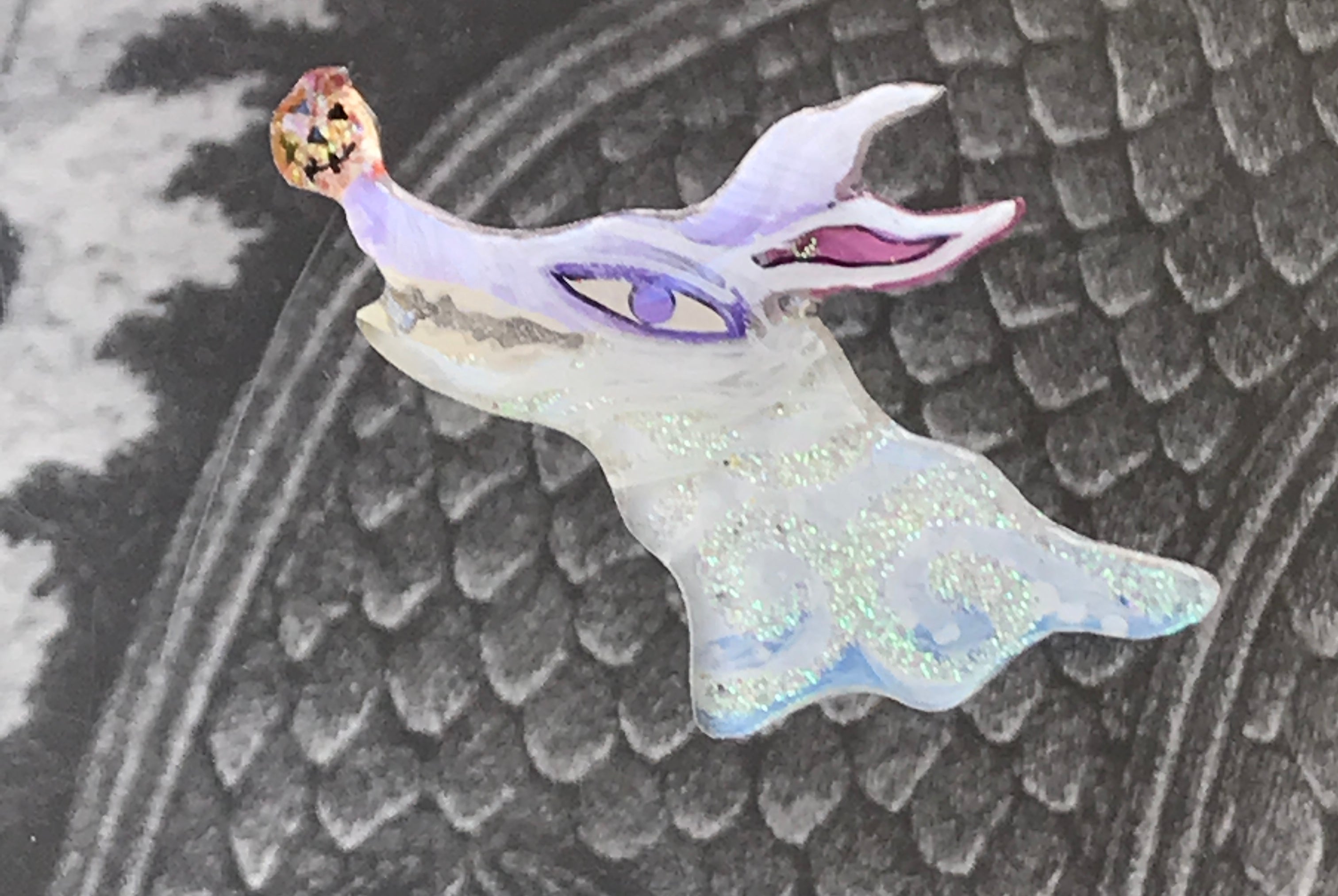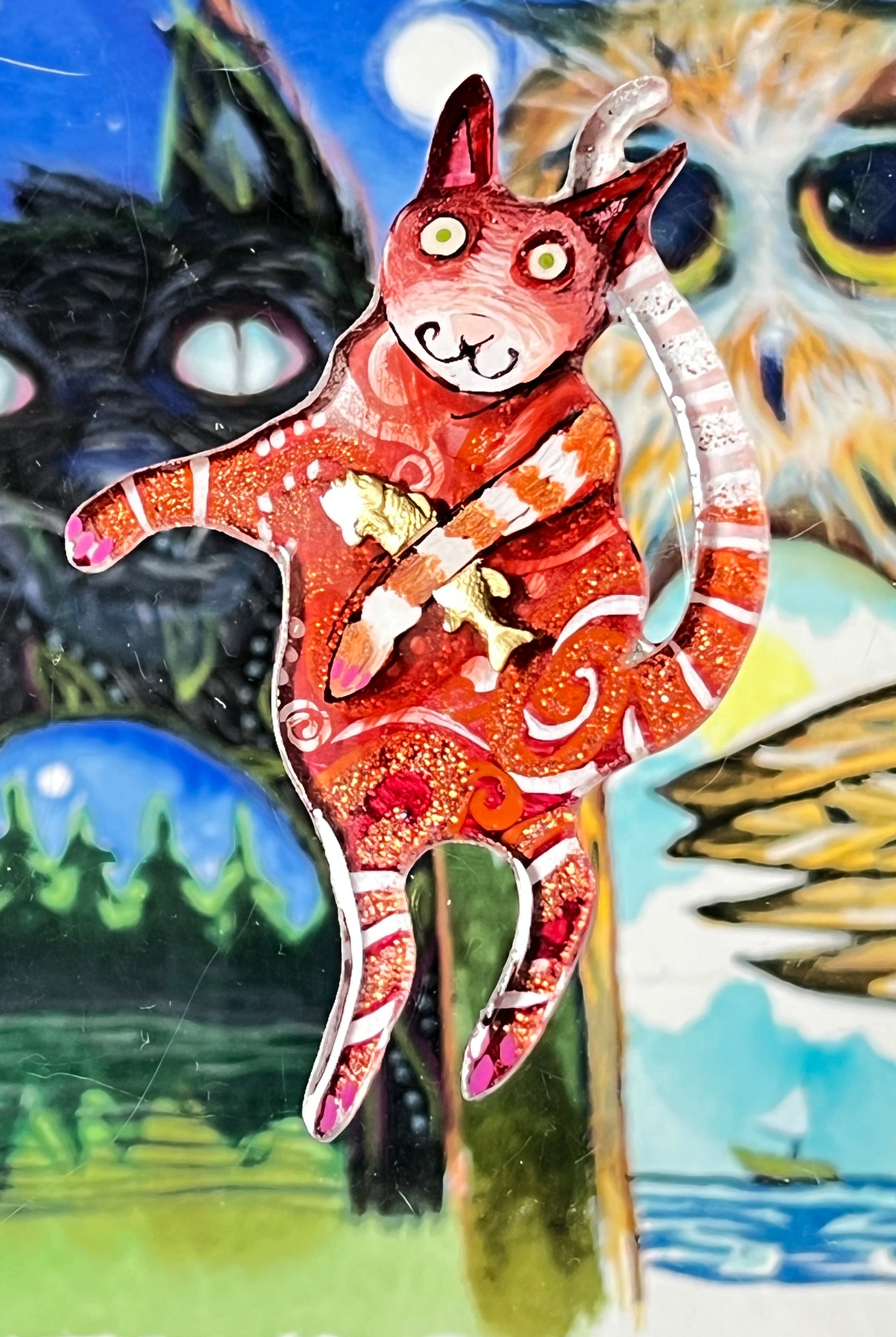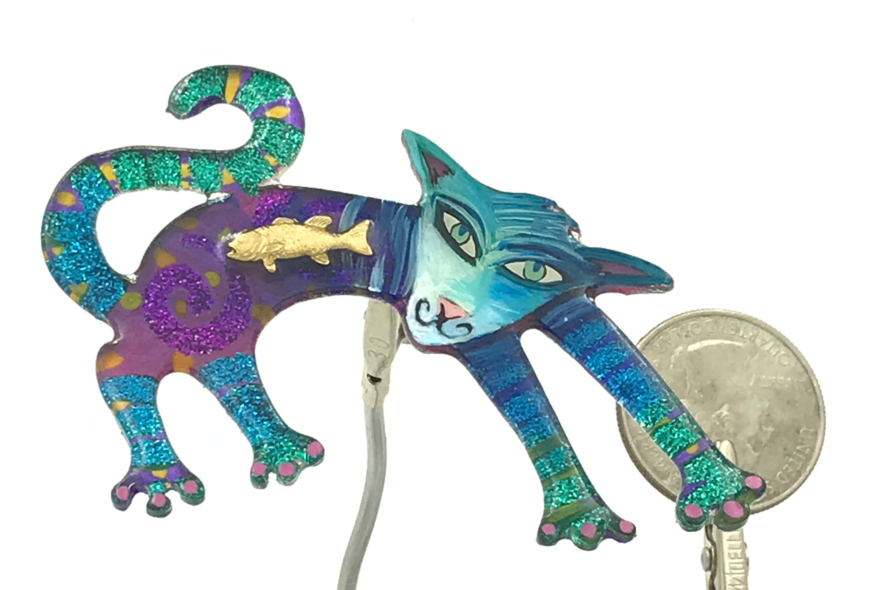 For me, these are little paintings that you can wear. If you are thinking of shrinky-dinks, I'm sure that was in my mind when I came up with lasercutting the shapes and then painting with the same paints I use on canvas. It's a multi layered process that takes a long time. The painting takes the longest, but it is the most rewarding. They are coated with a thick and sturdy glaze that brings out the depth and color.