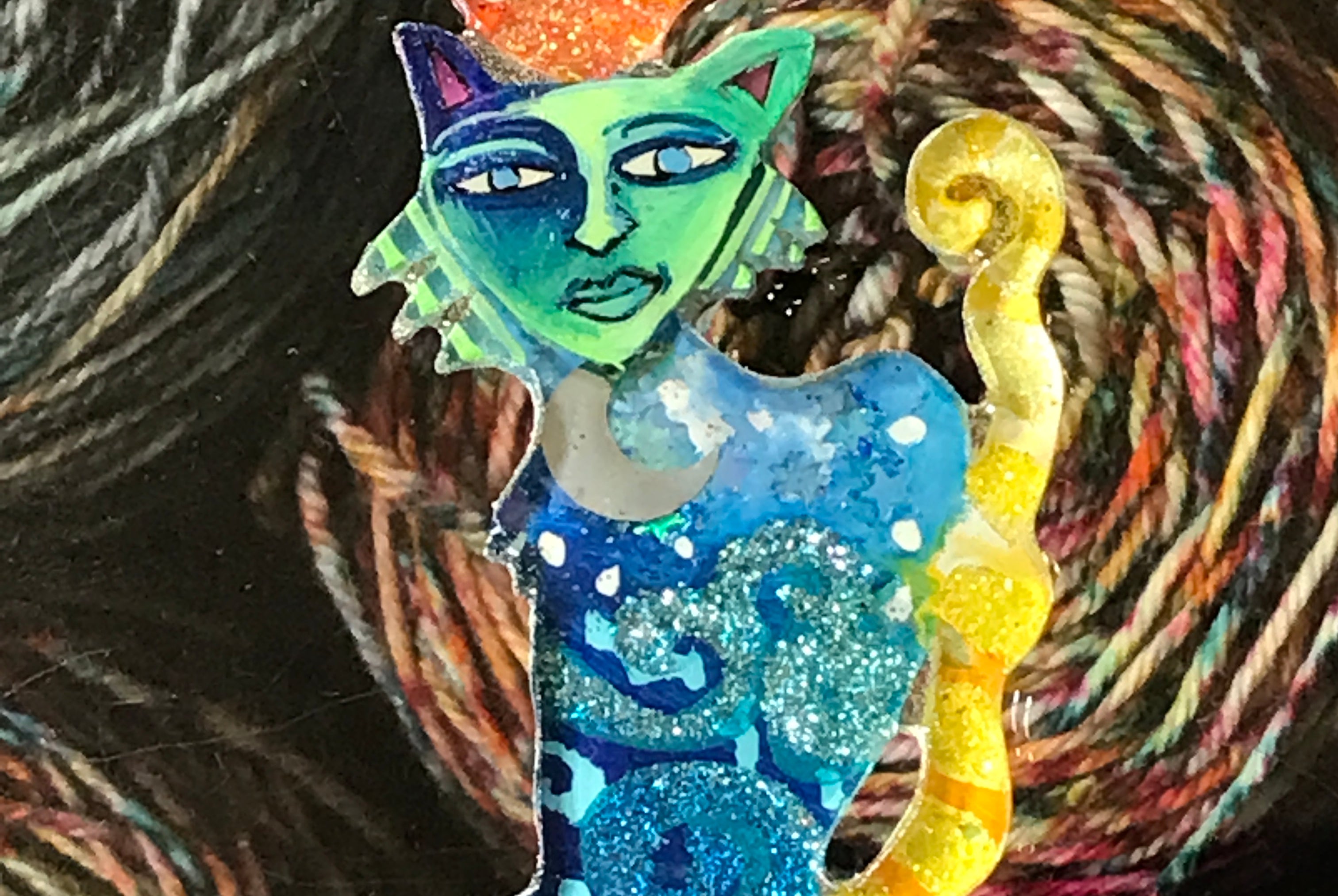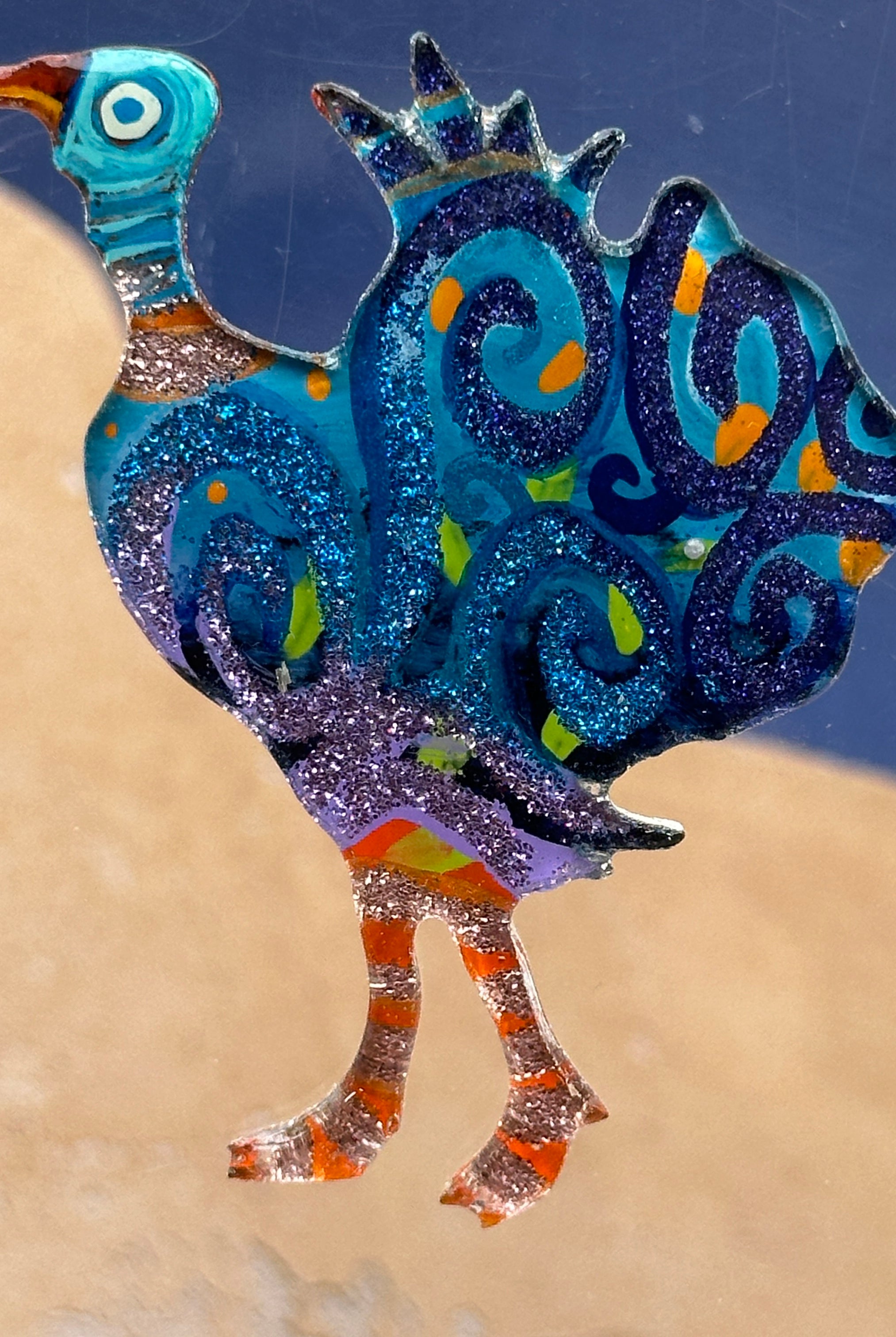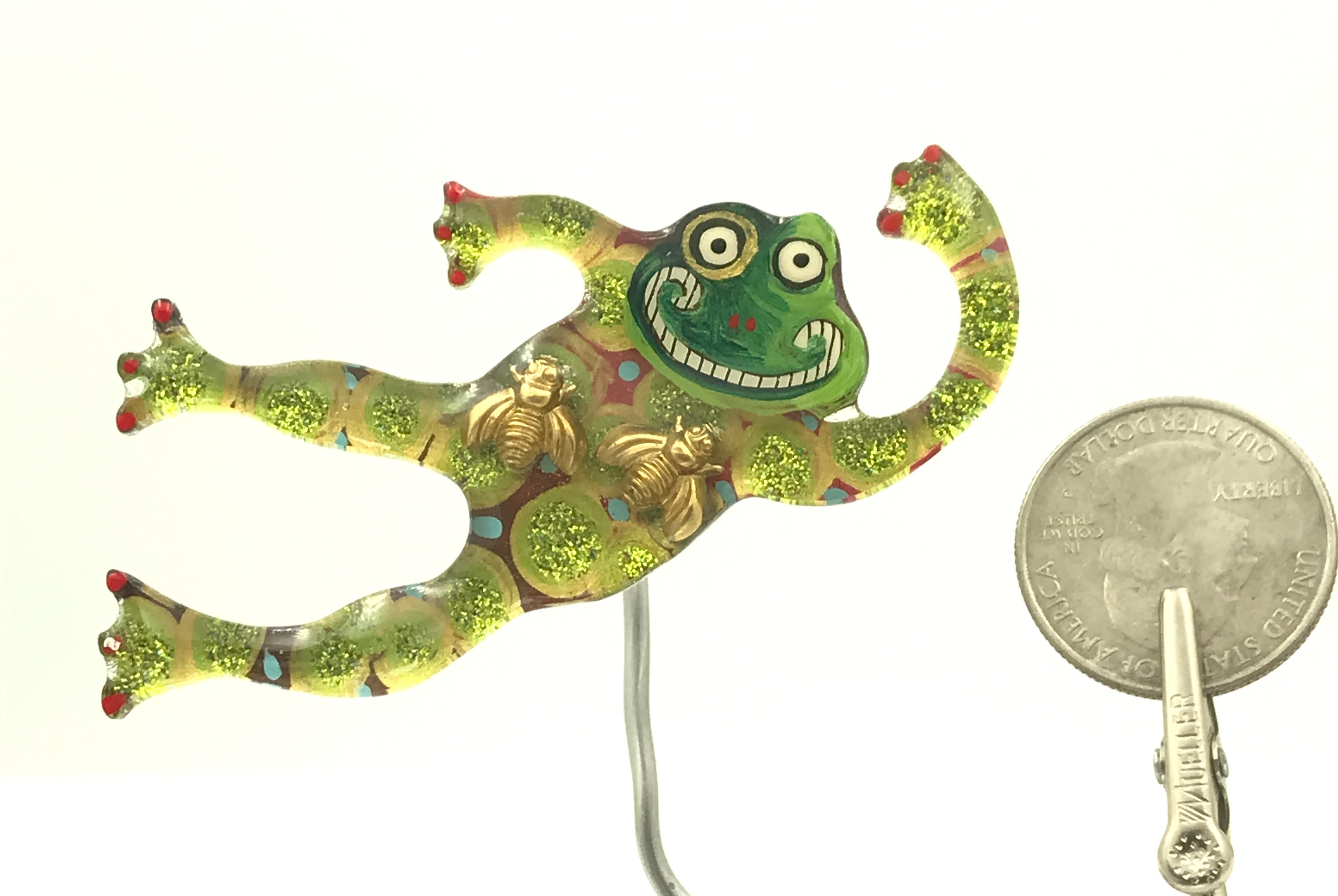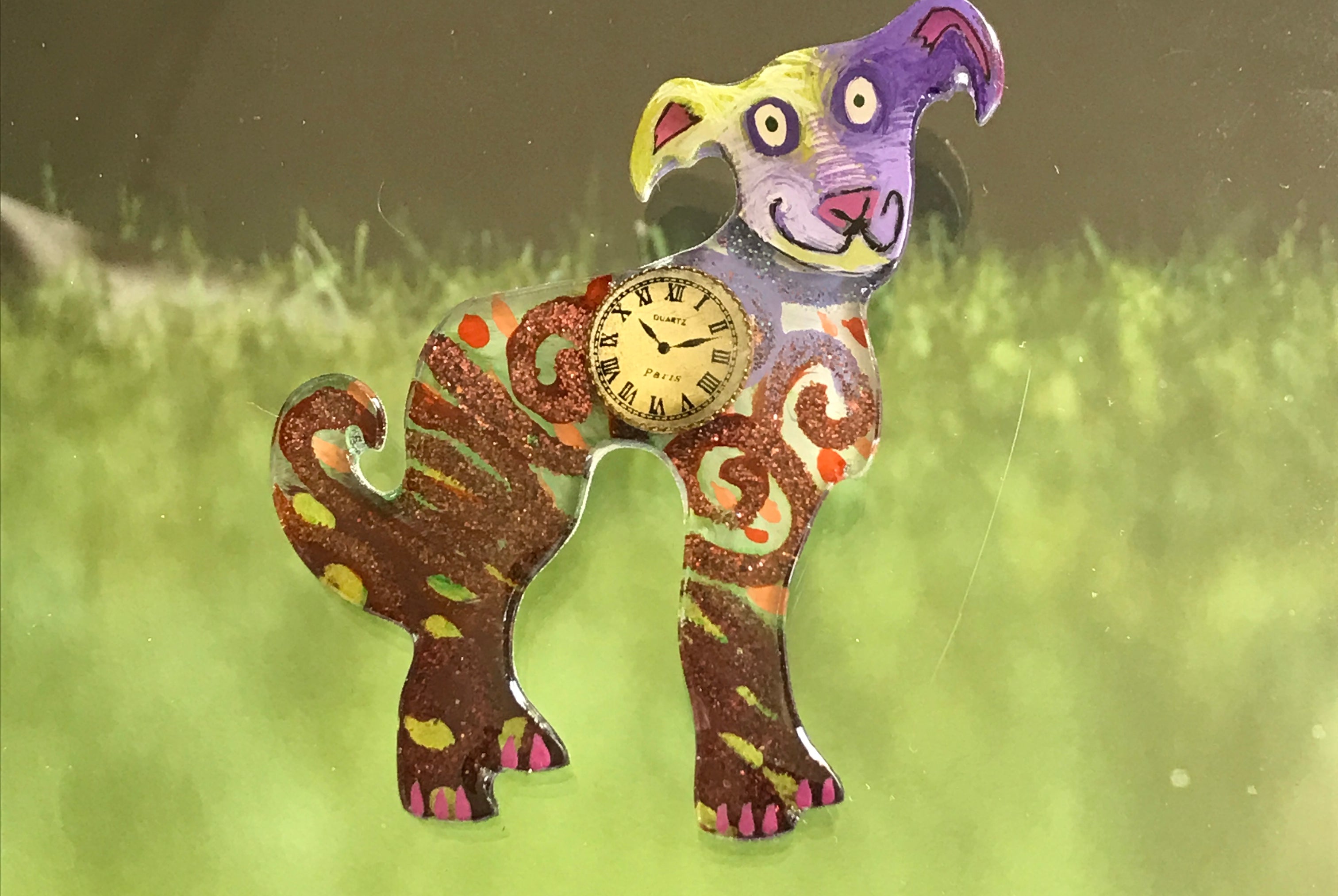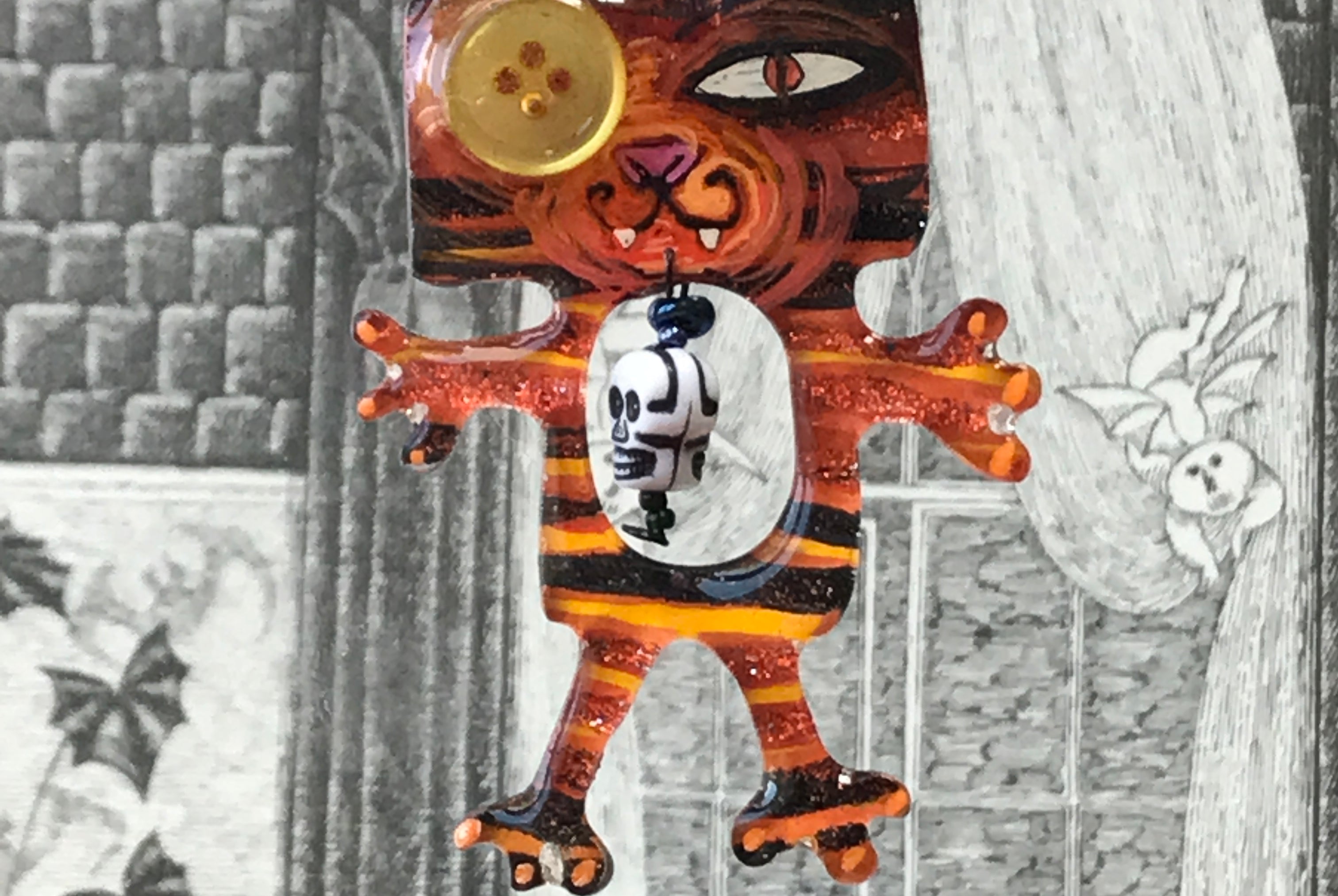 For me, these are little paintings that you can wear. If you are thinking of shrinky-dinks, I'm sure that was in my mind when I came up with lasercutting the shapes and then painting with the same paints I use on canvas. It's a multi layered process that takes a long time. The painting takes the longest, but it is the most rewarding. They are coated with a thick and sturdy glaze that brings out the depth and color.