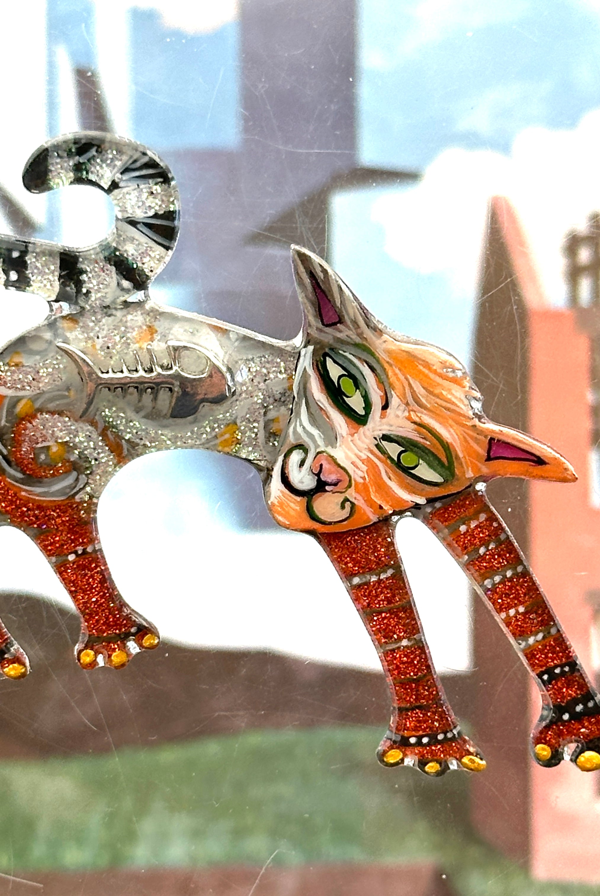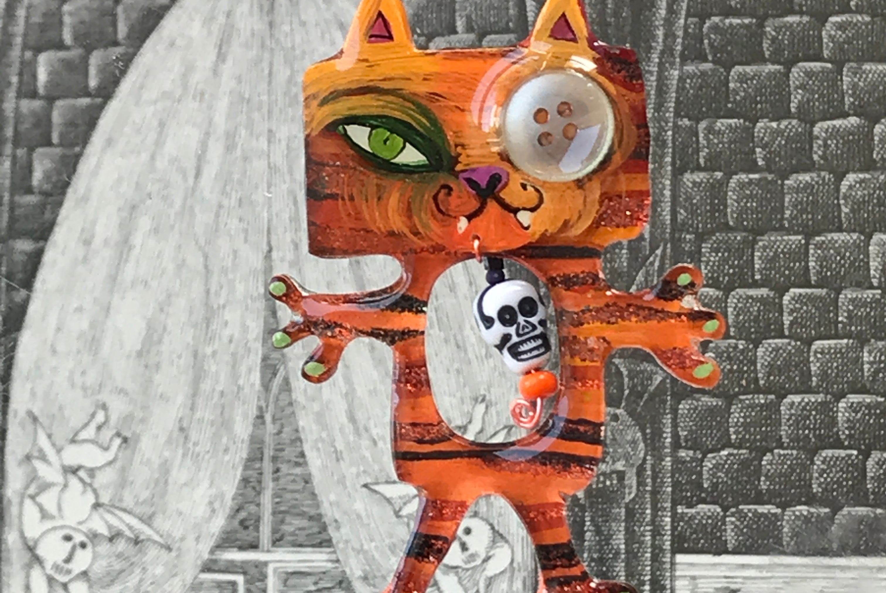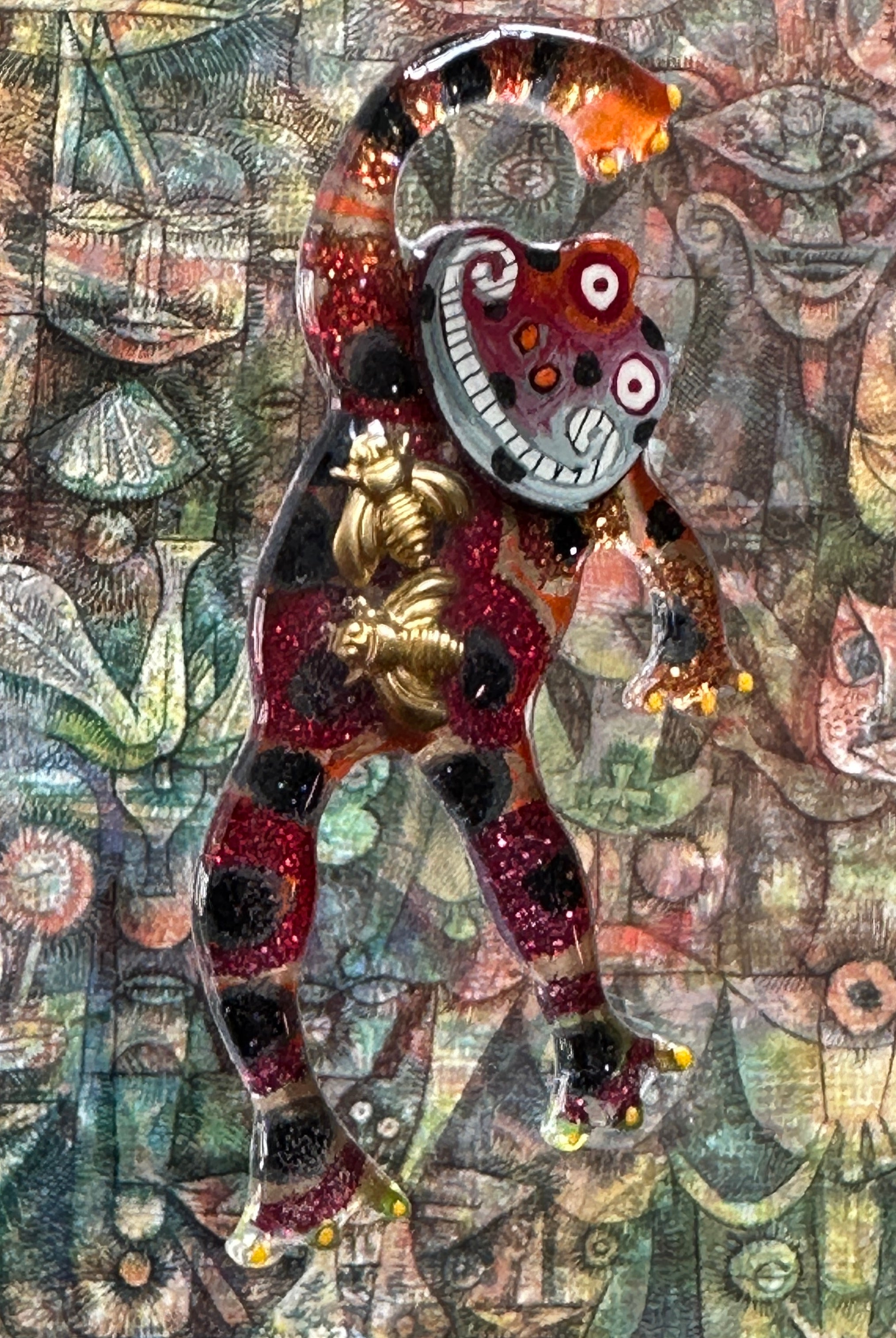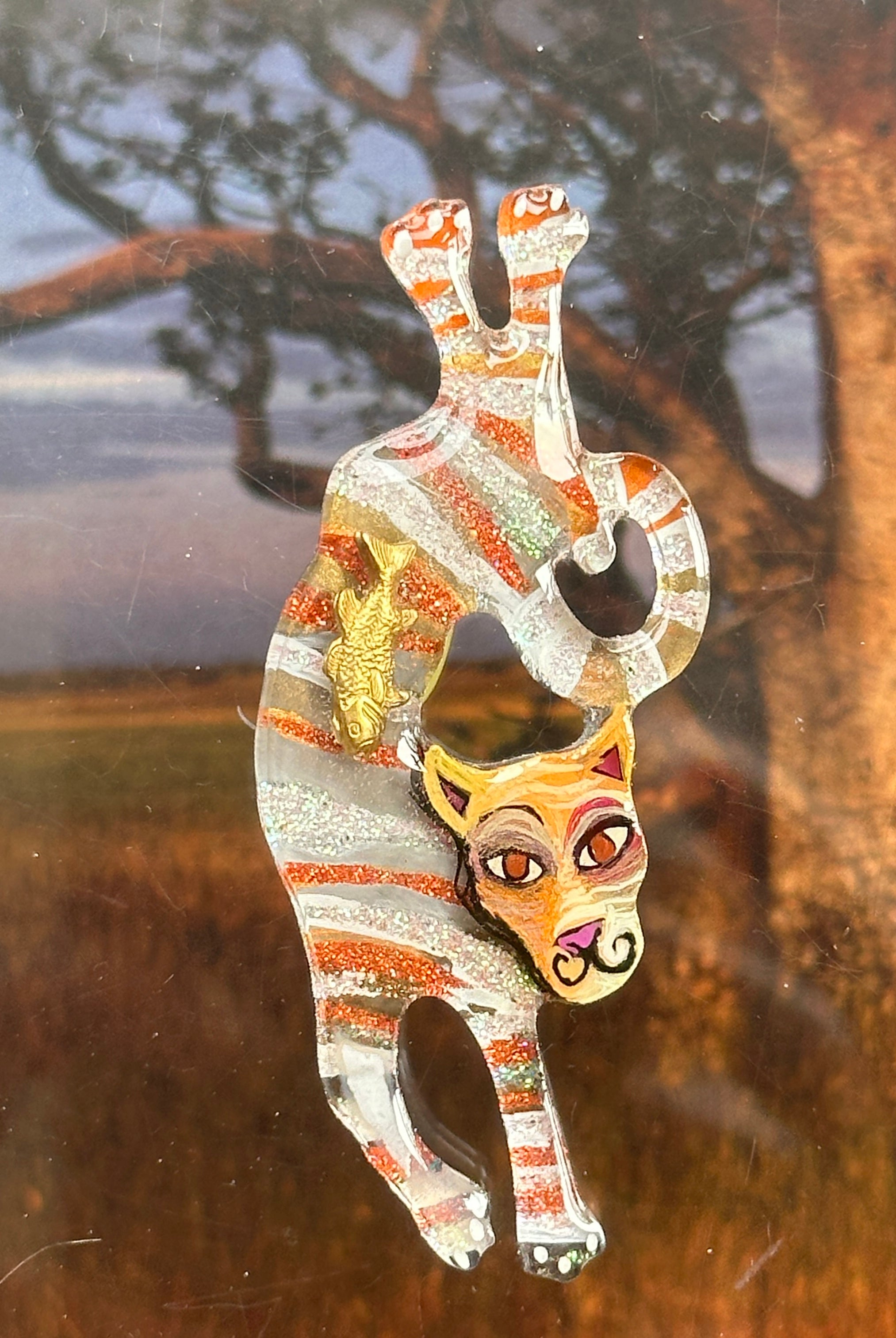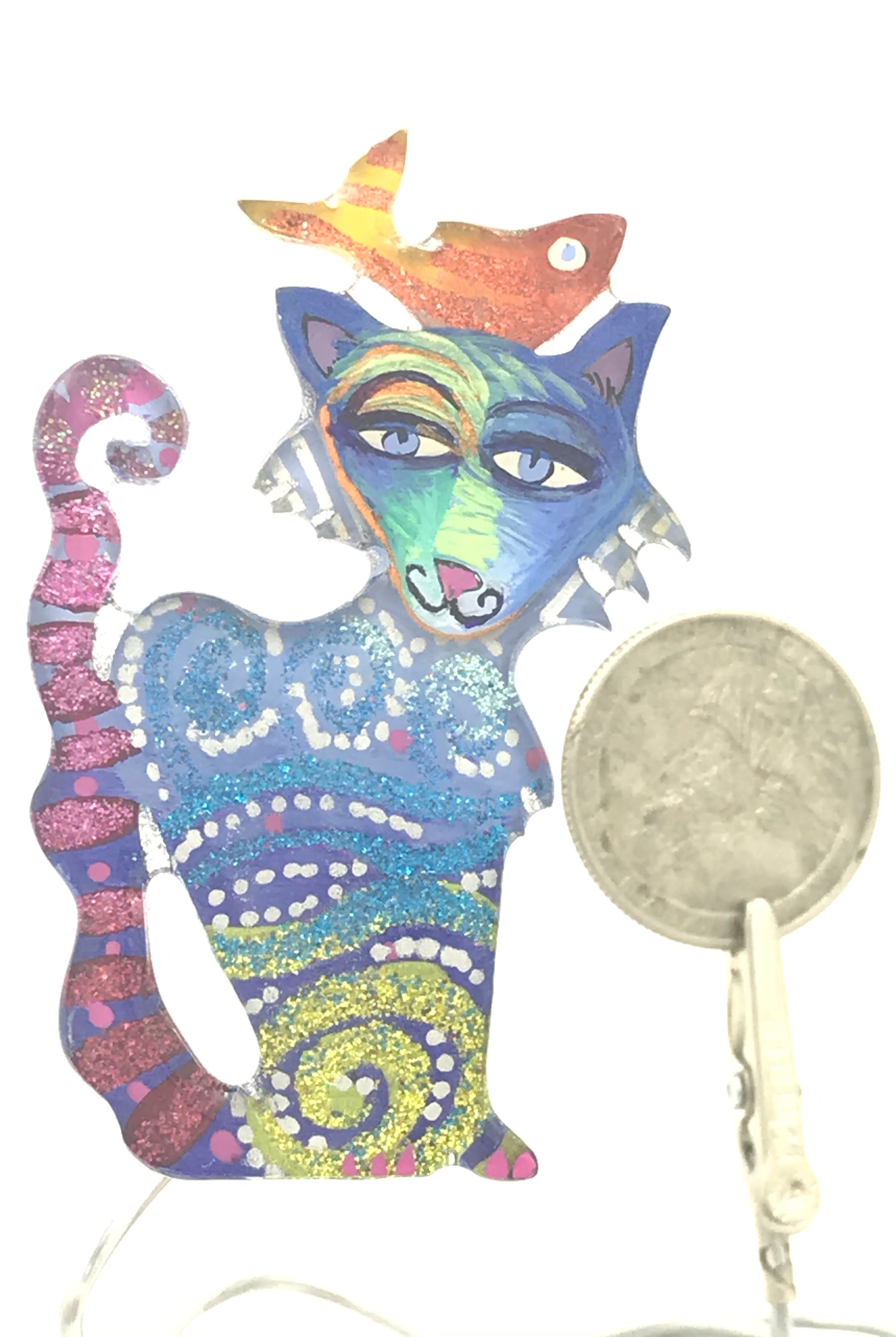 For me, these are little paintings that you can wear. If you are thinking of shrinky-dinks, I'm sure that was in my mind when I came up with lasercutting the shapes and then painting with the same paints I use on canvas. It's a multi layered process that takes a long time. The painting takes the longest, but it is the most rewarding. They are coated with a thick and sturdy glaze that brings out the depth and color.