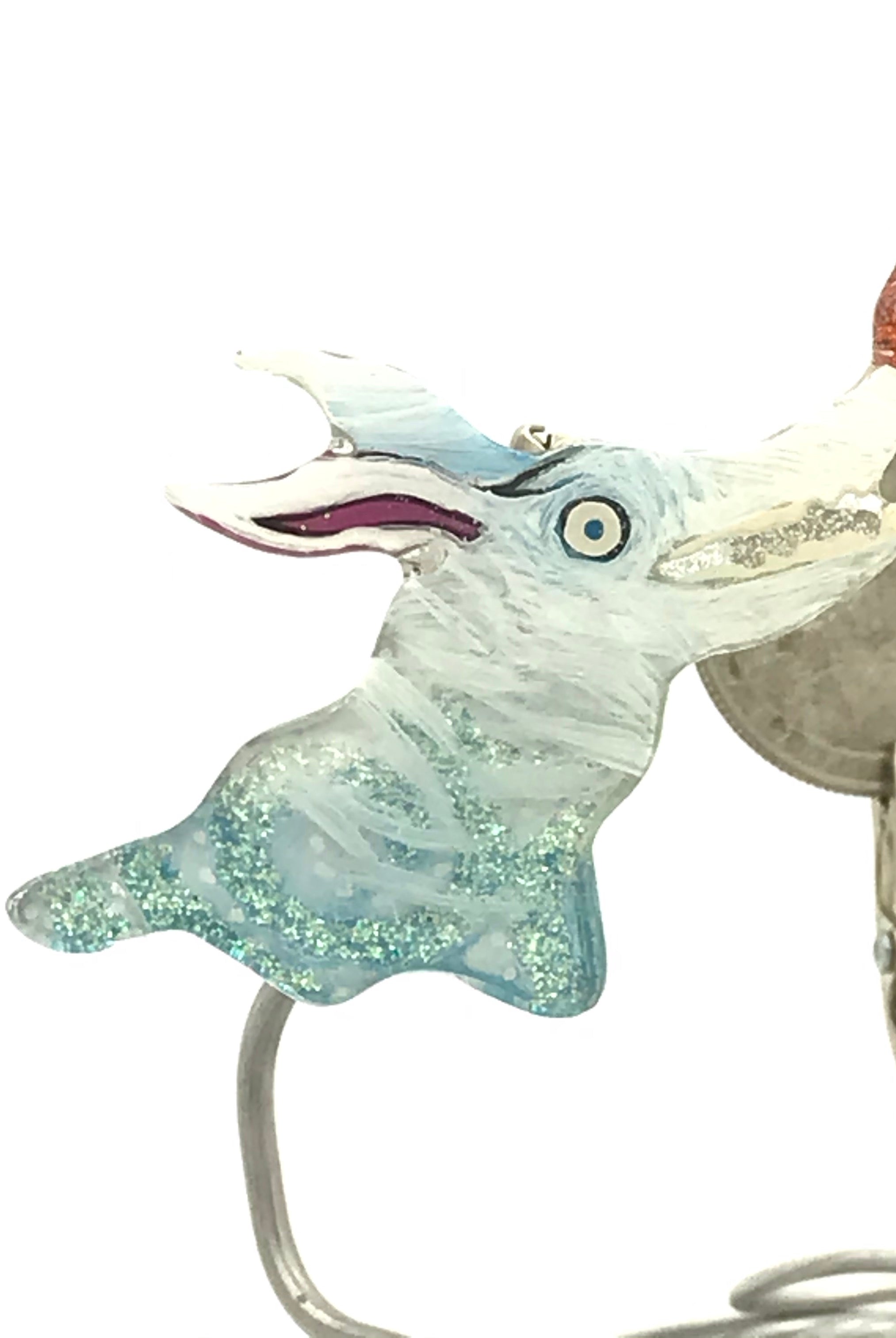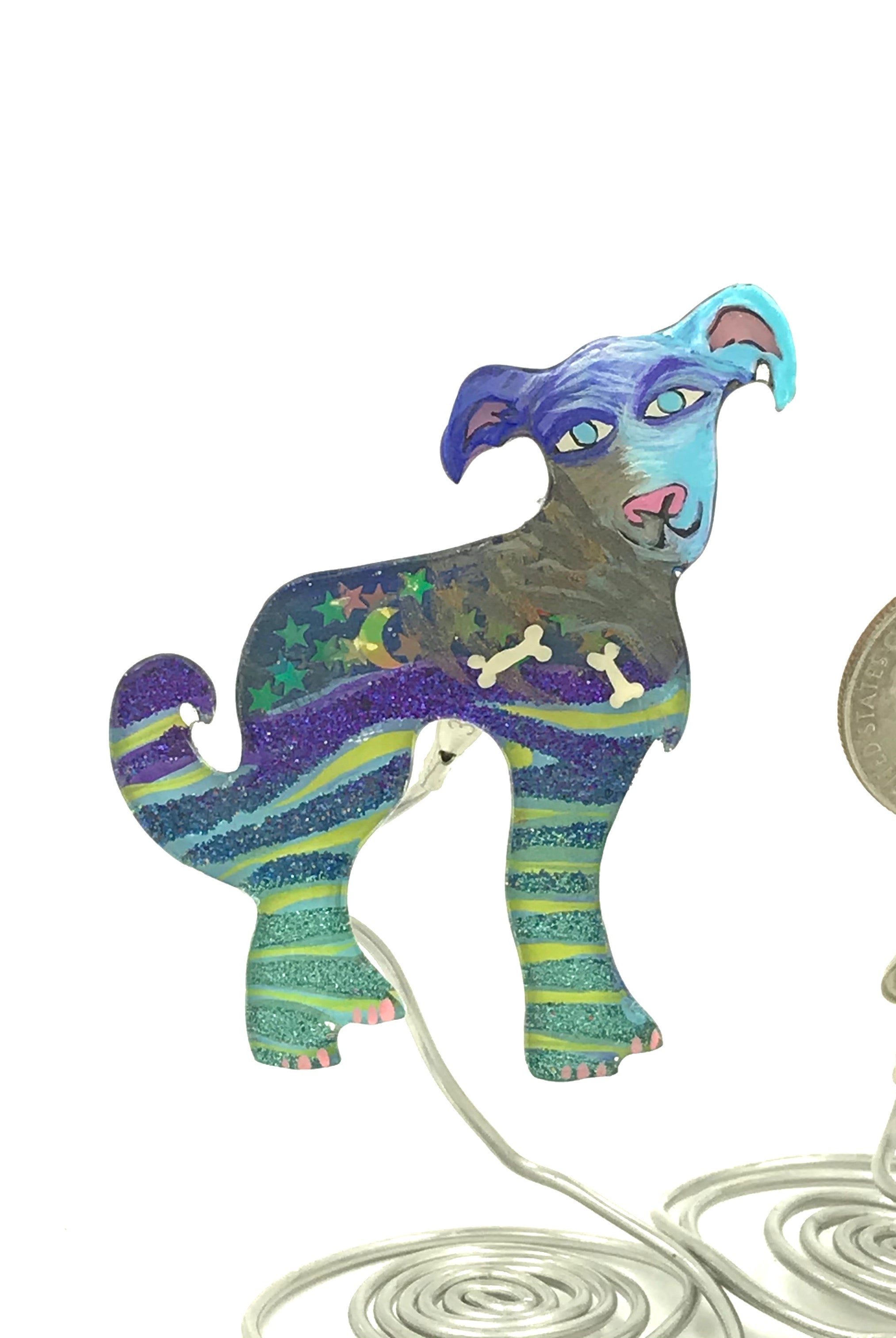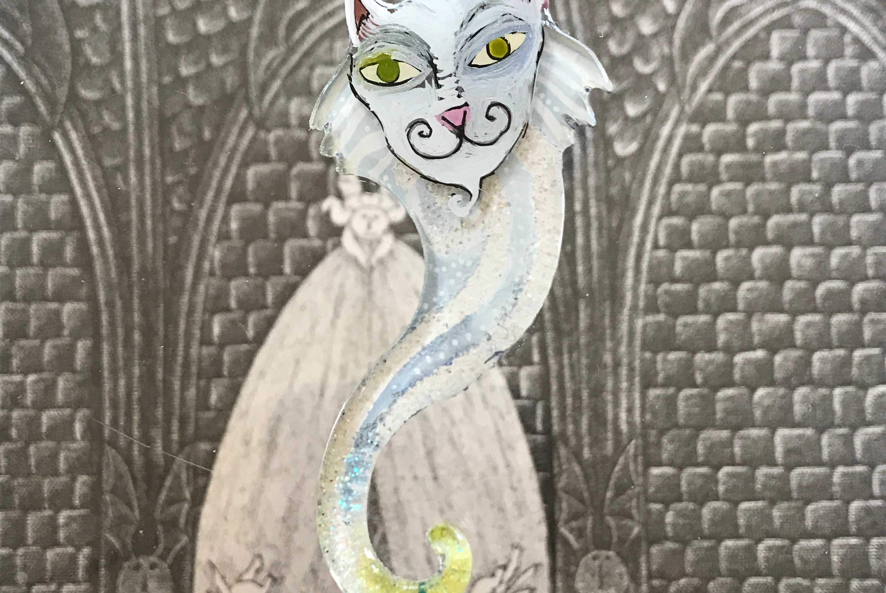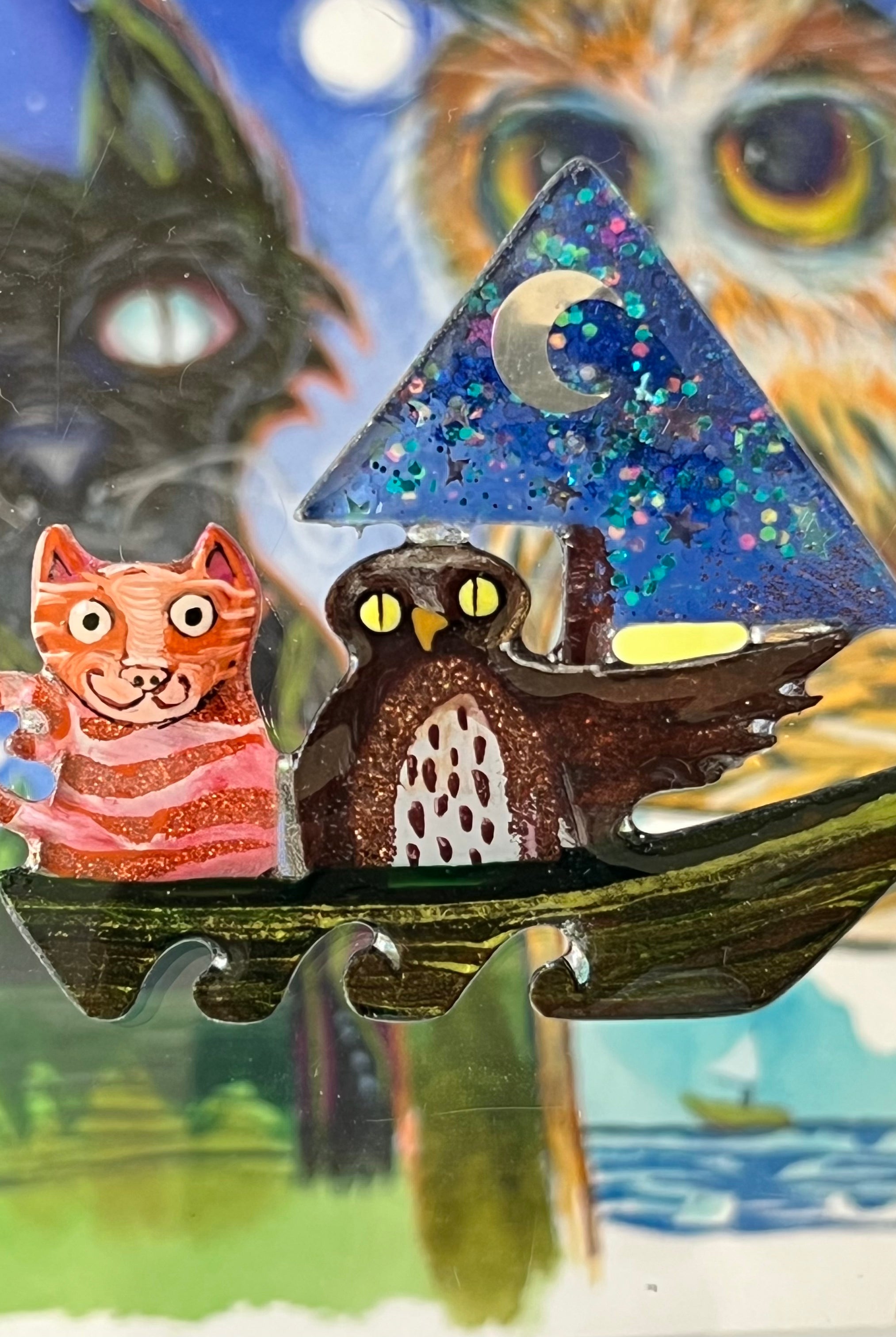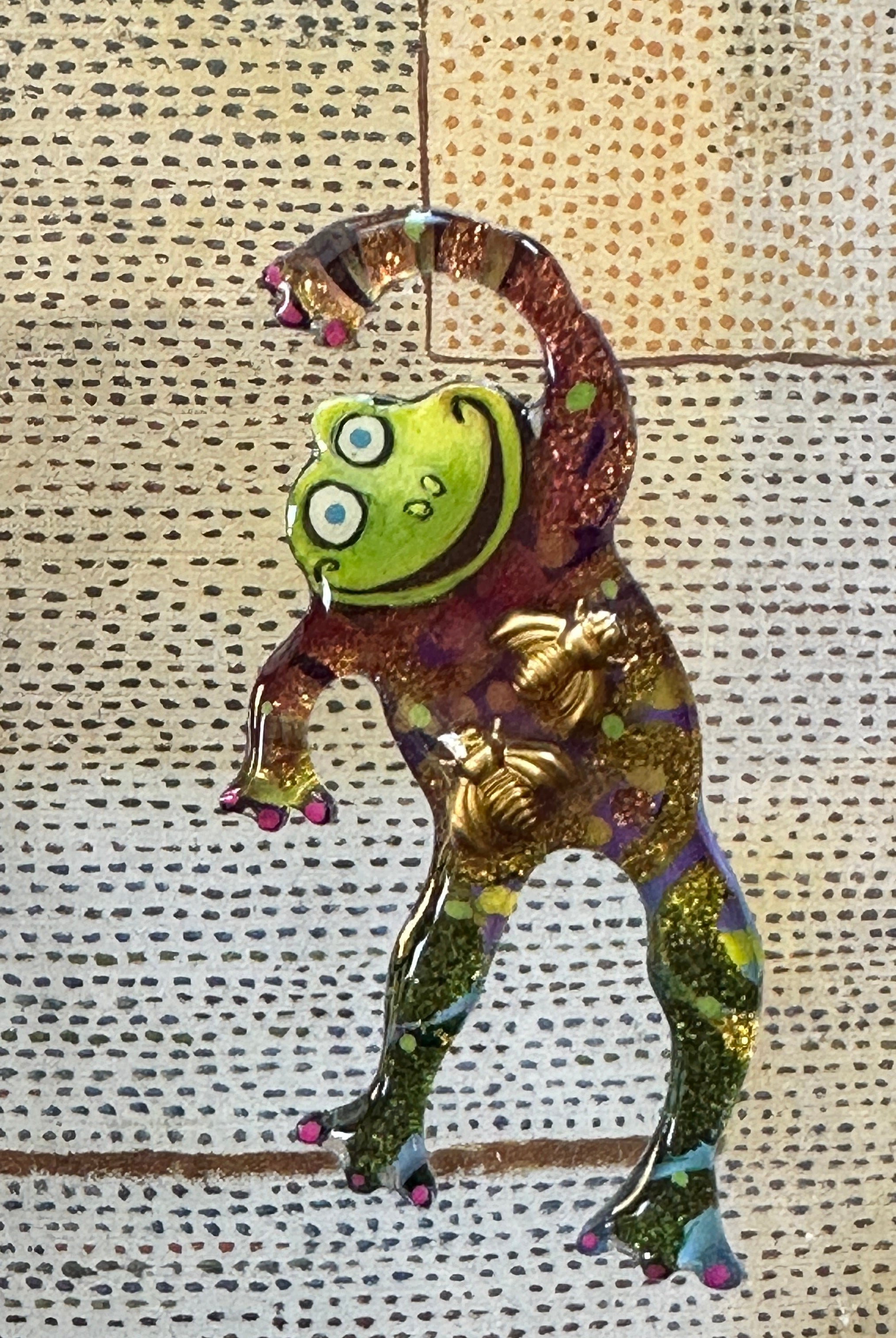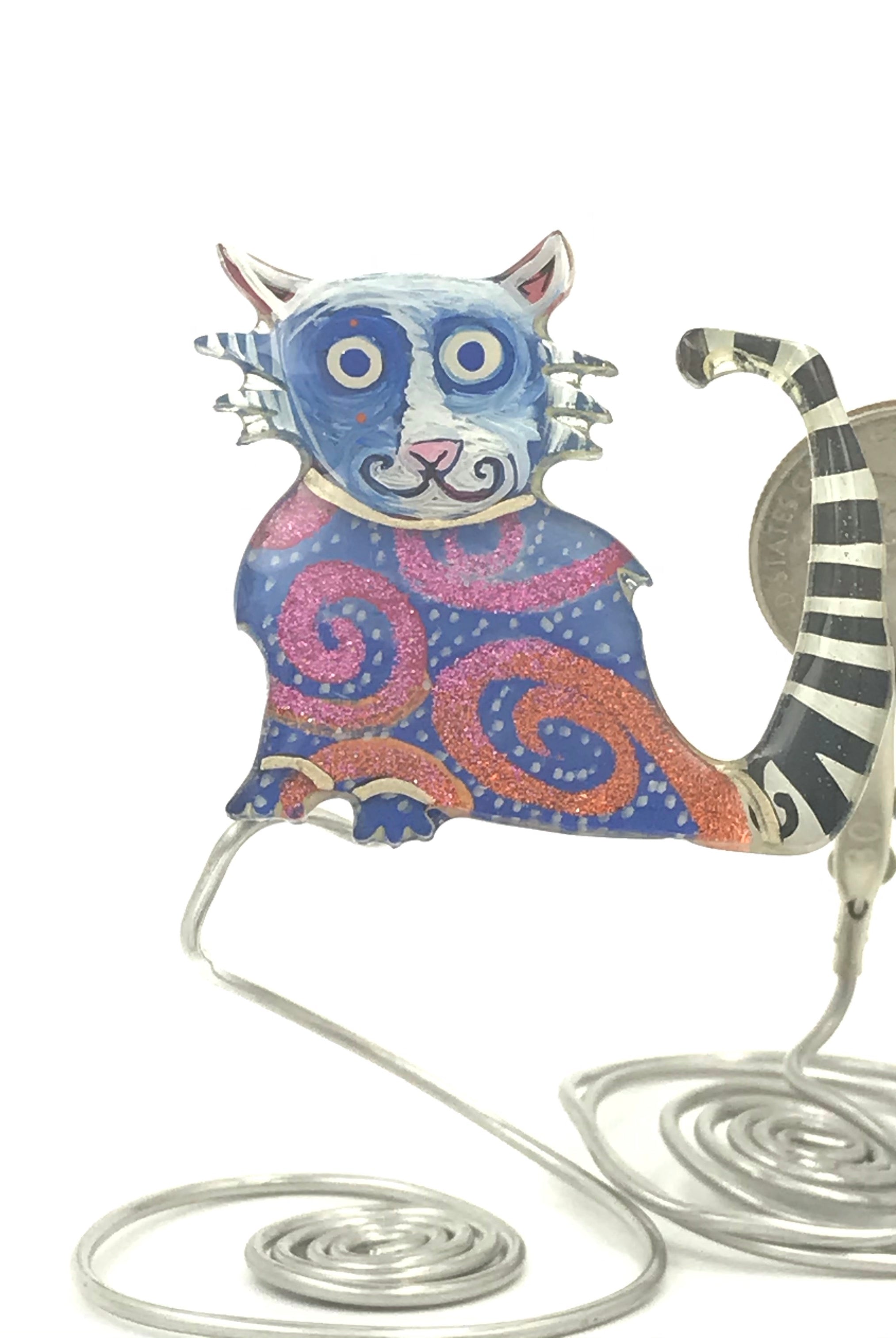 For me, these are little paintings that you can wear. If you are thinking of shrinky-dinks, I'm sure that was in my mind when I came up with lasercutting the shapes and then painting with the same paints I use on canvas. It's a multi layered process that takes a long time. The painting takes the longest, but it is the most rewarding. They are coated with a thick and sturdy glaze that brings out the depth and color.