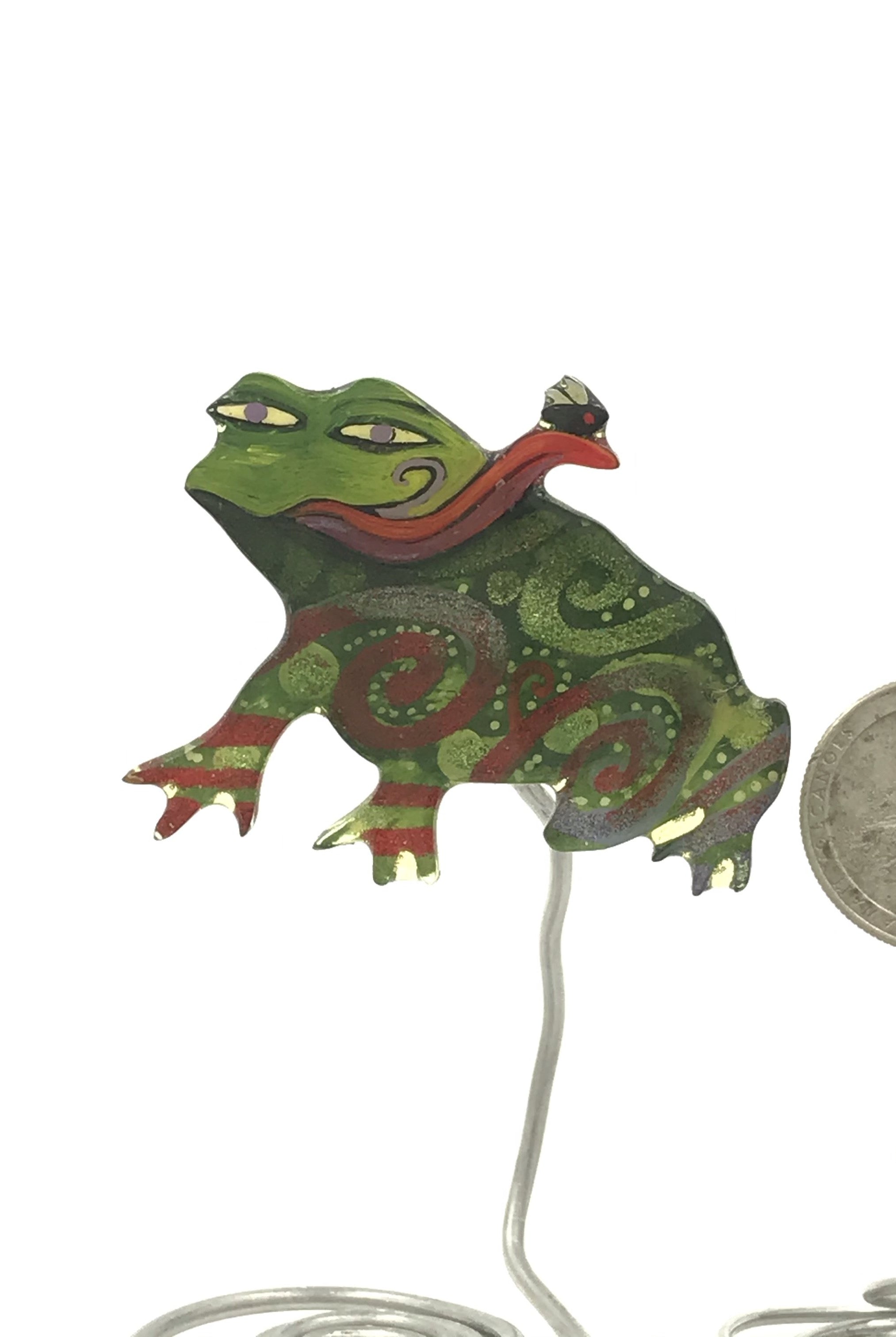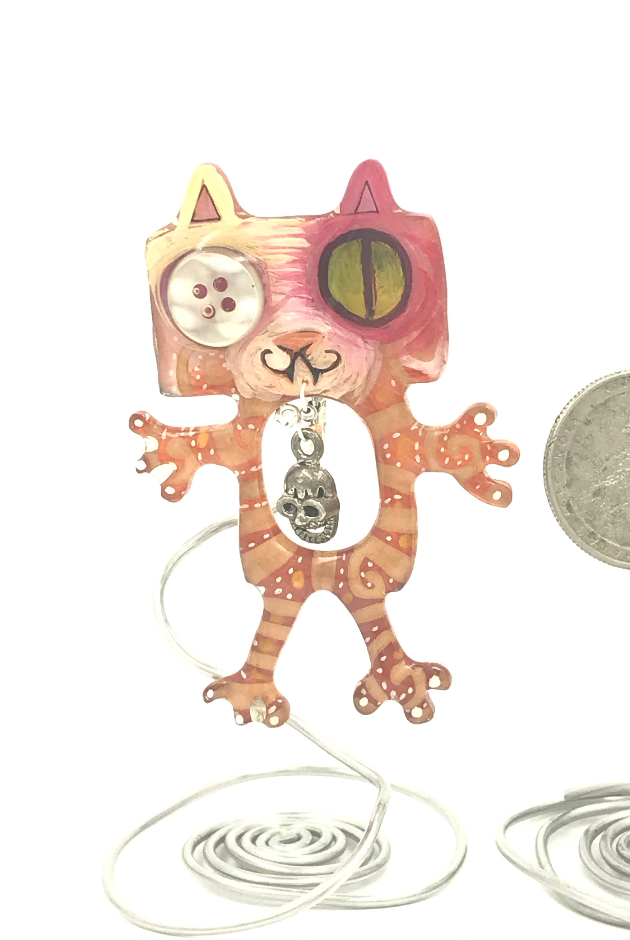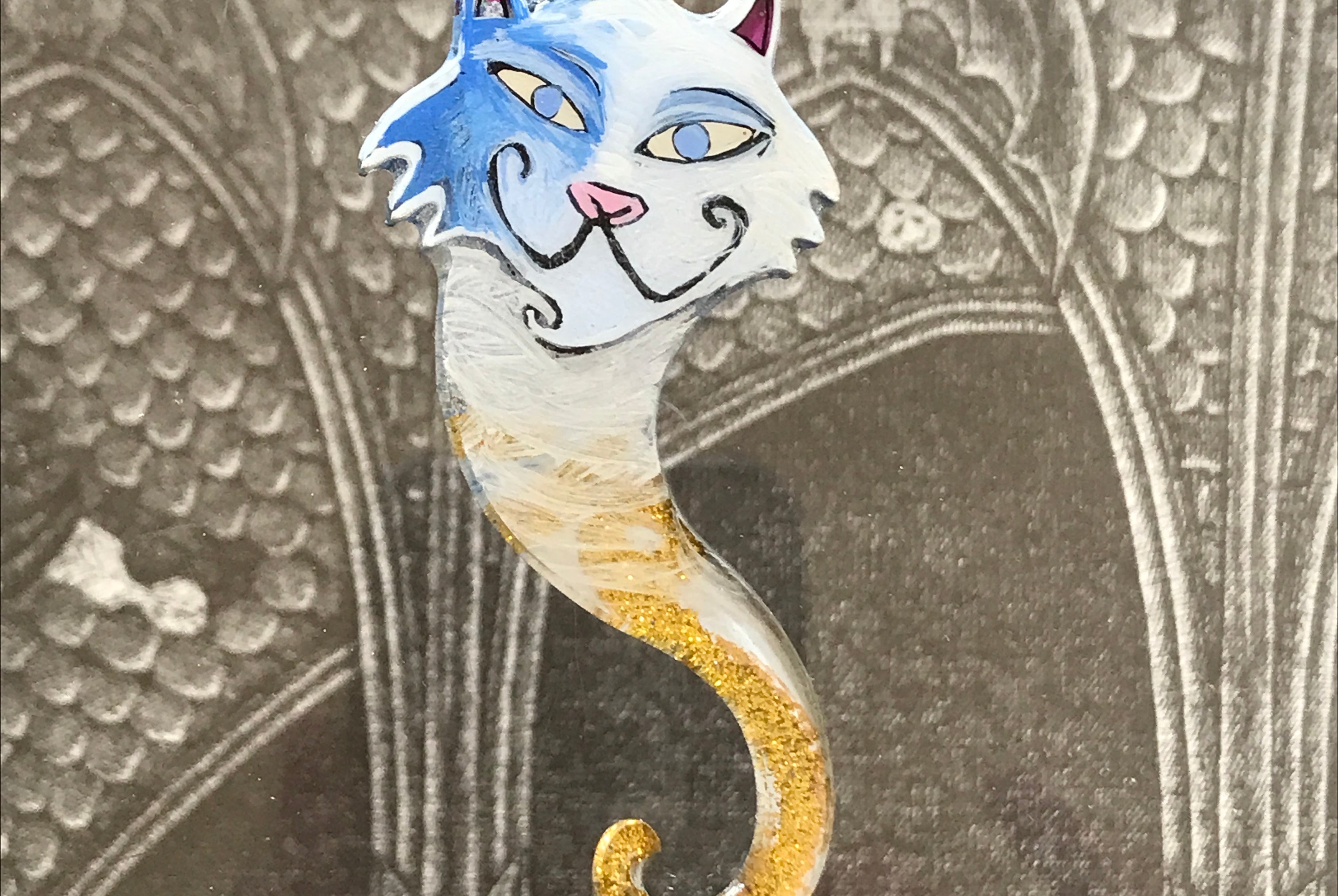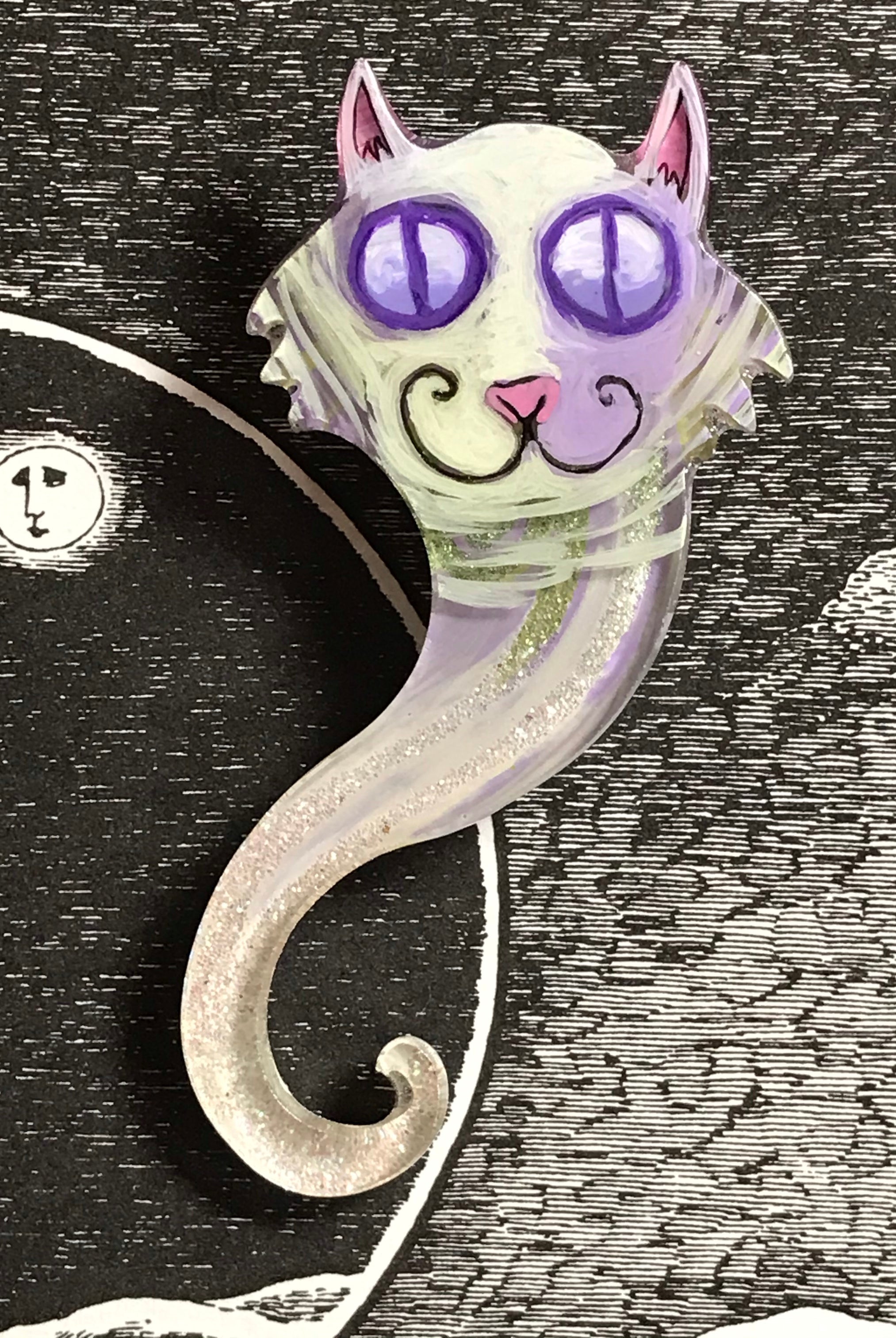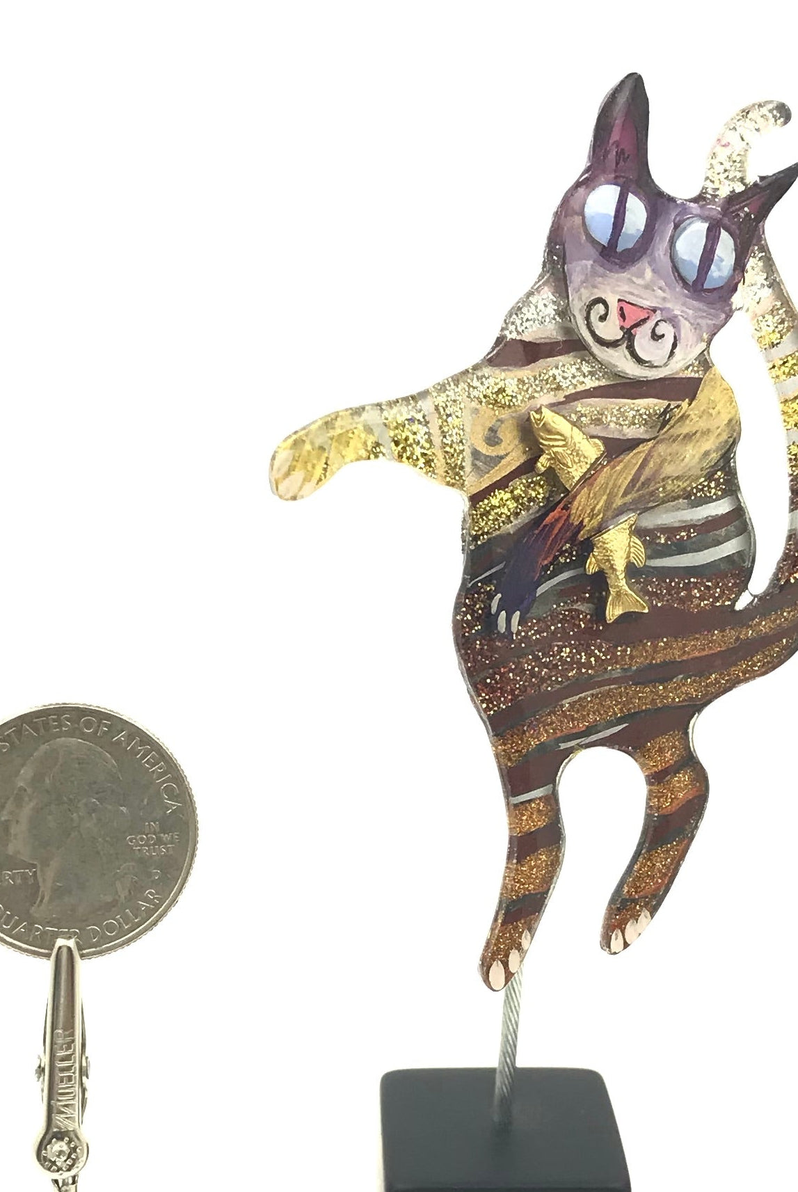For me, these are little paintings that you can wear. If you are thinking of shrinky-dinks, I'm sure that was in my mind when I came up with lasercutting the shapes and then painting with the same paints I use on canvas. It's a multi layered process that takes a long time. The painting takes the longest, but it is the most rewarding. They are coated with a thick and sturdy glaze that brings out the depth and color.
