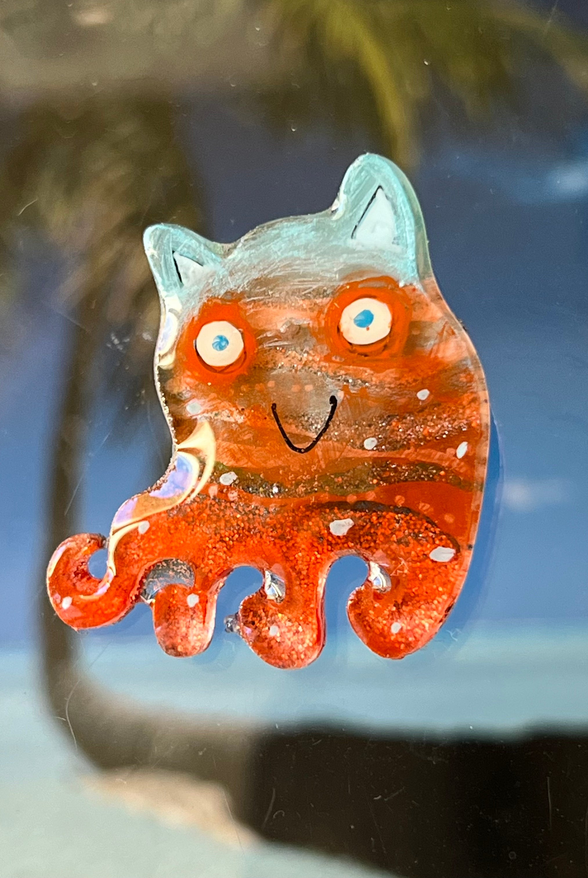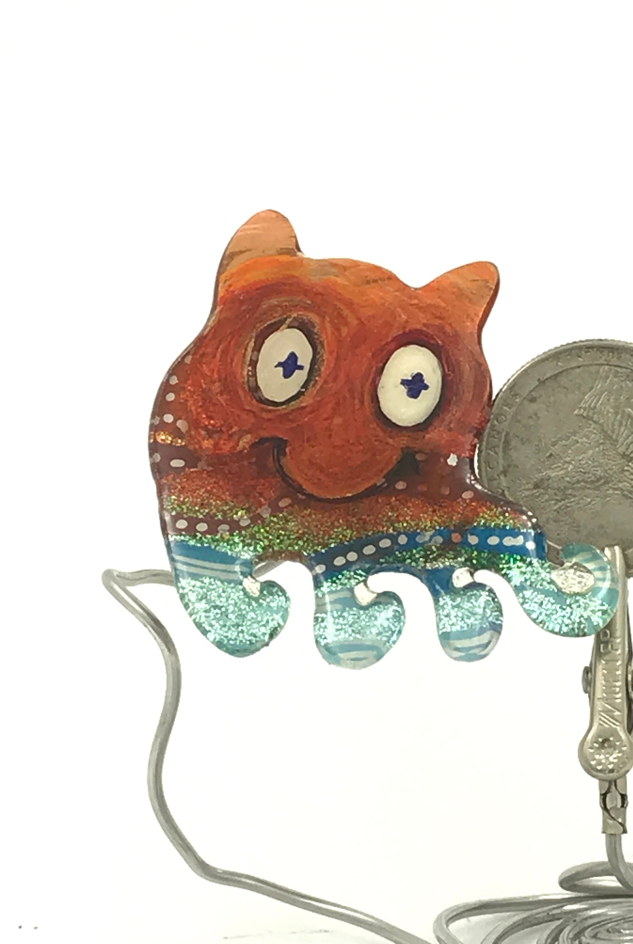 For me, these are little paintings that you can wear. If you are thinking of shrinky-dinks, I'm sure that was in my mind when I came up with lasercutting the shapes and then painting with the same paints I use on canvas. It's a multi layered process that takes a long time. The painting takes the longest, but it is the most rewarding. They are coated with a thick and sturdy glaze that brings out the depth and color.