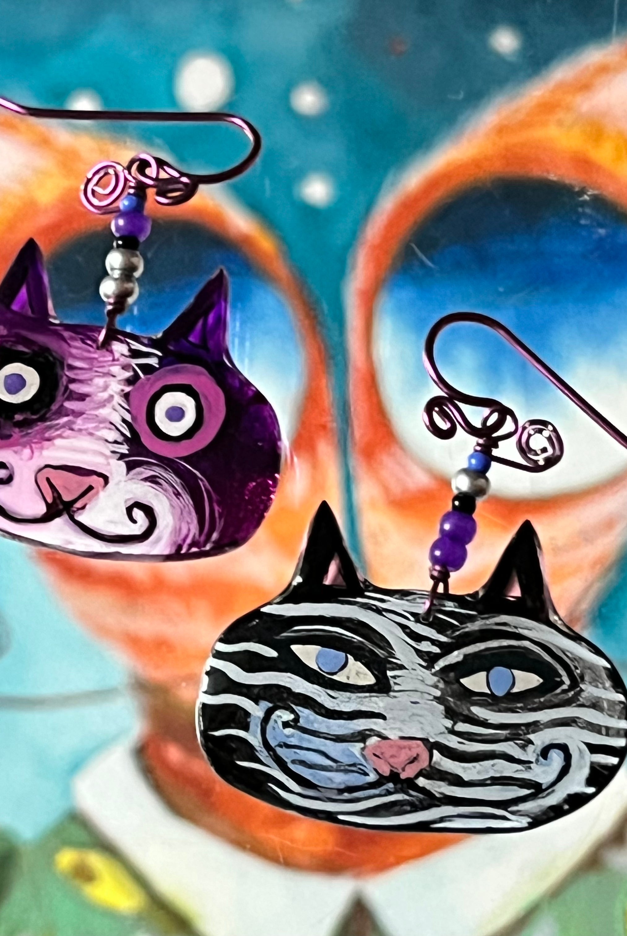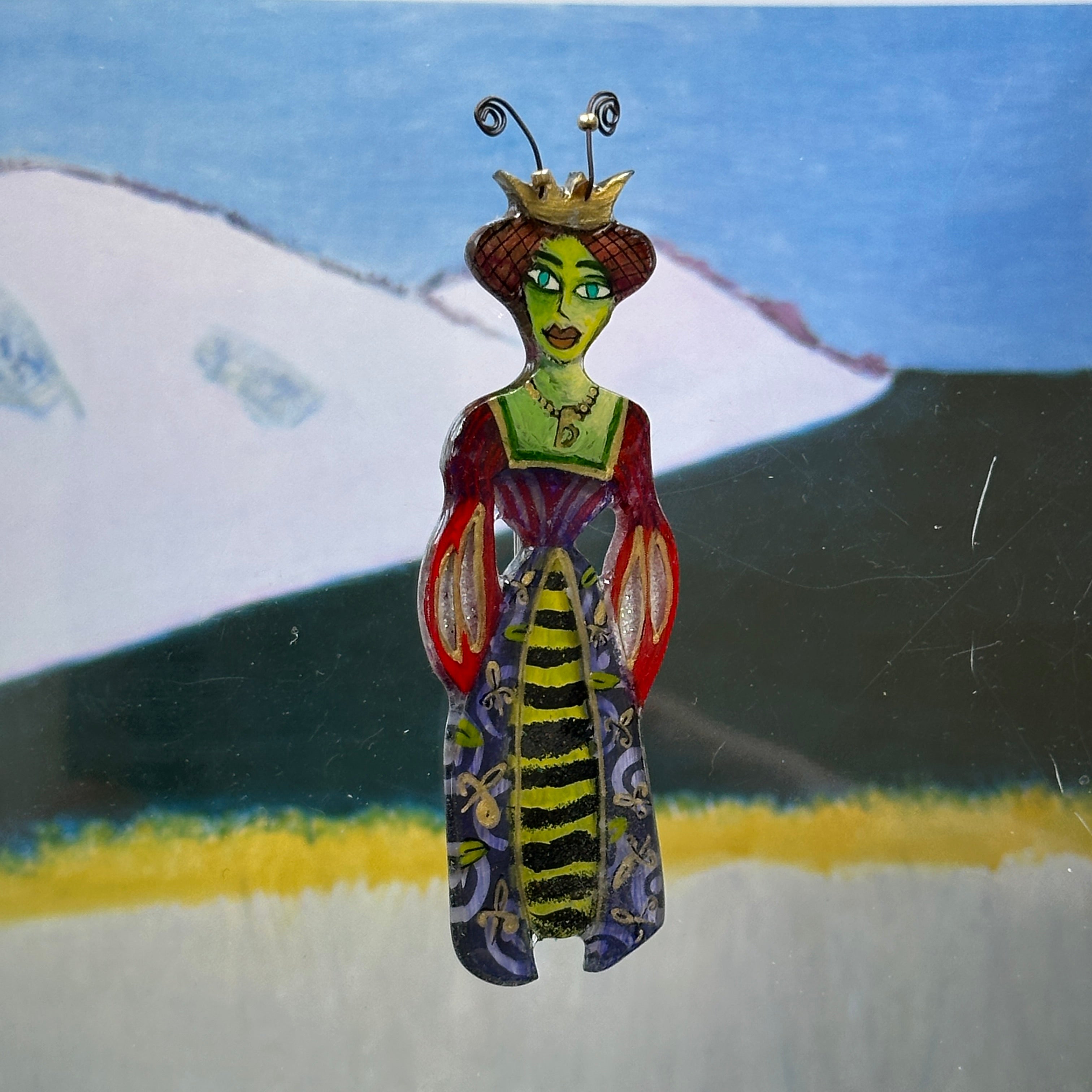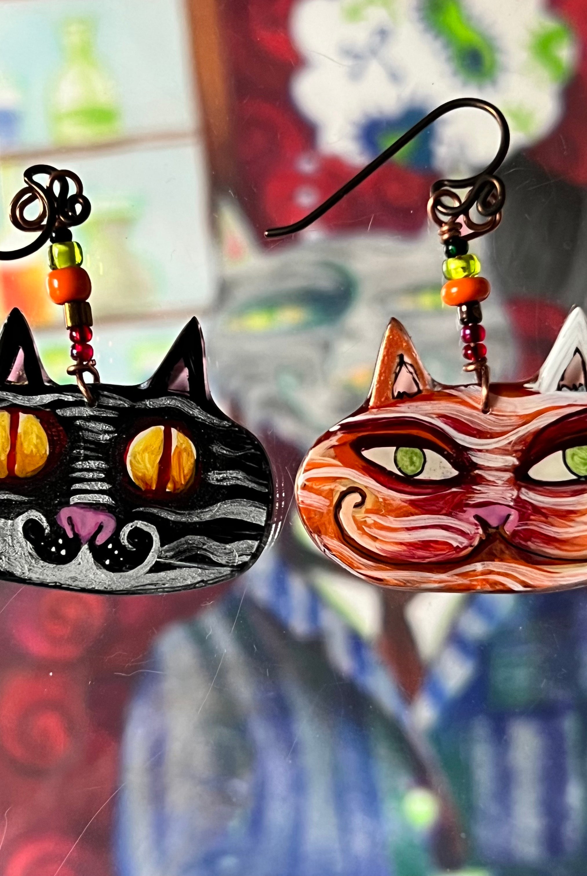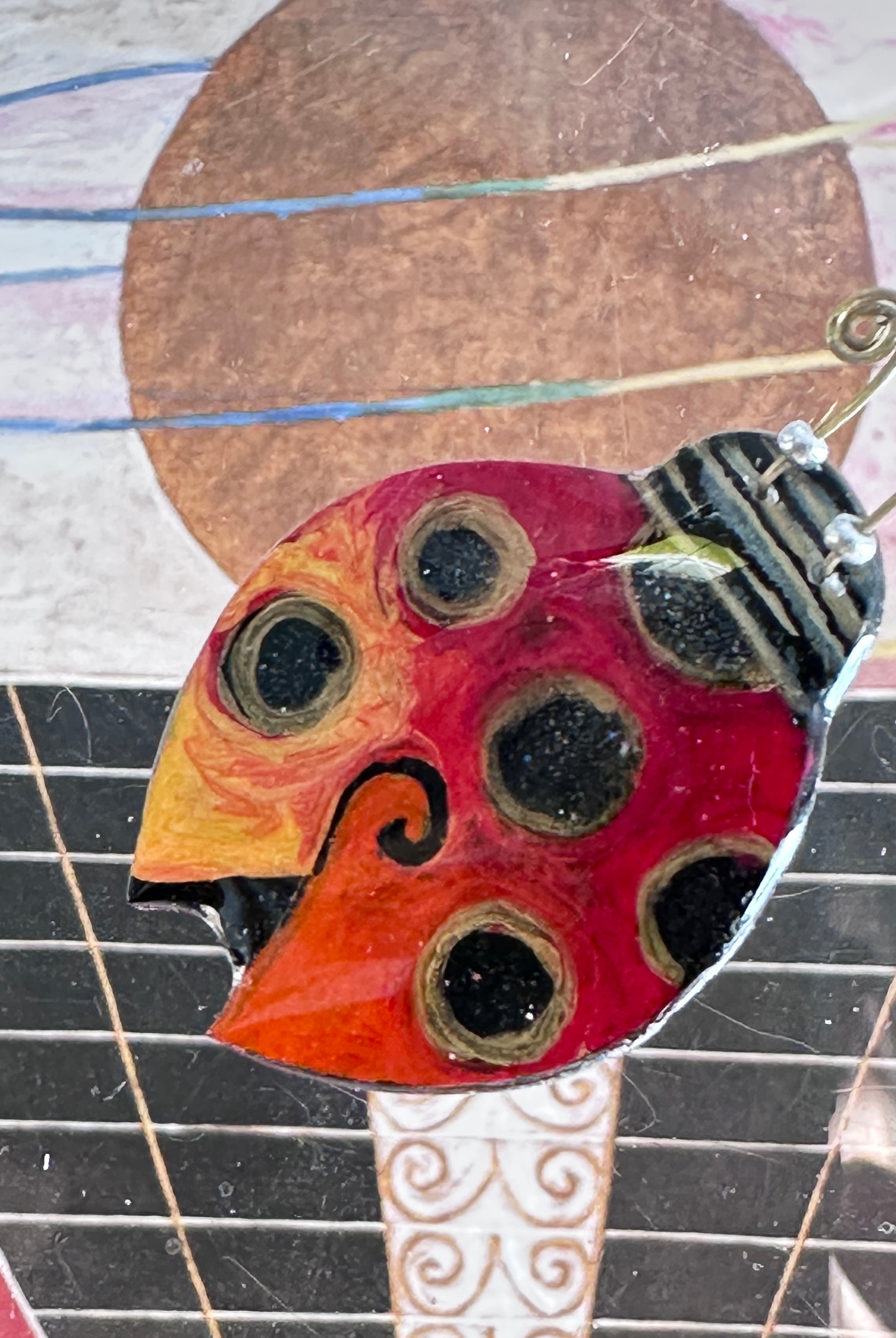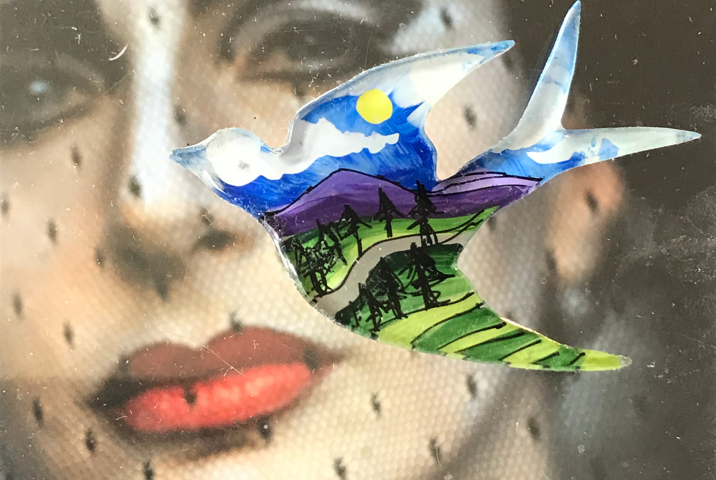 For me, these are little paintings that you can wear. If you are thinking of shrinky-dinks, I'm sure that was in my mind when I came up with lasercutting the shapes and then painting with the same paints I use on canvas. It's a multi layered process that takes a long time. The painting takes the longest, but it is the most rewarding. They are coated with a thick and sturdy glaze that brings out the depth and color.