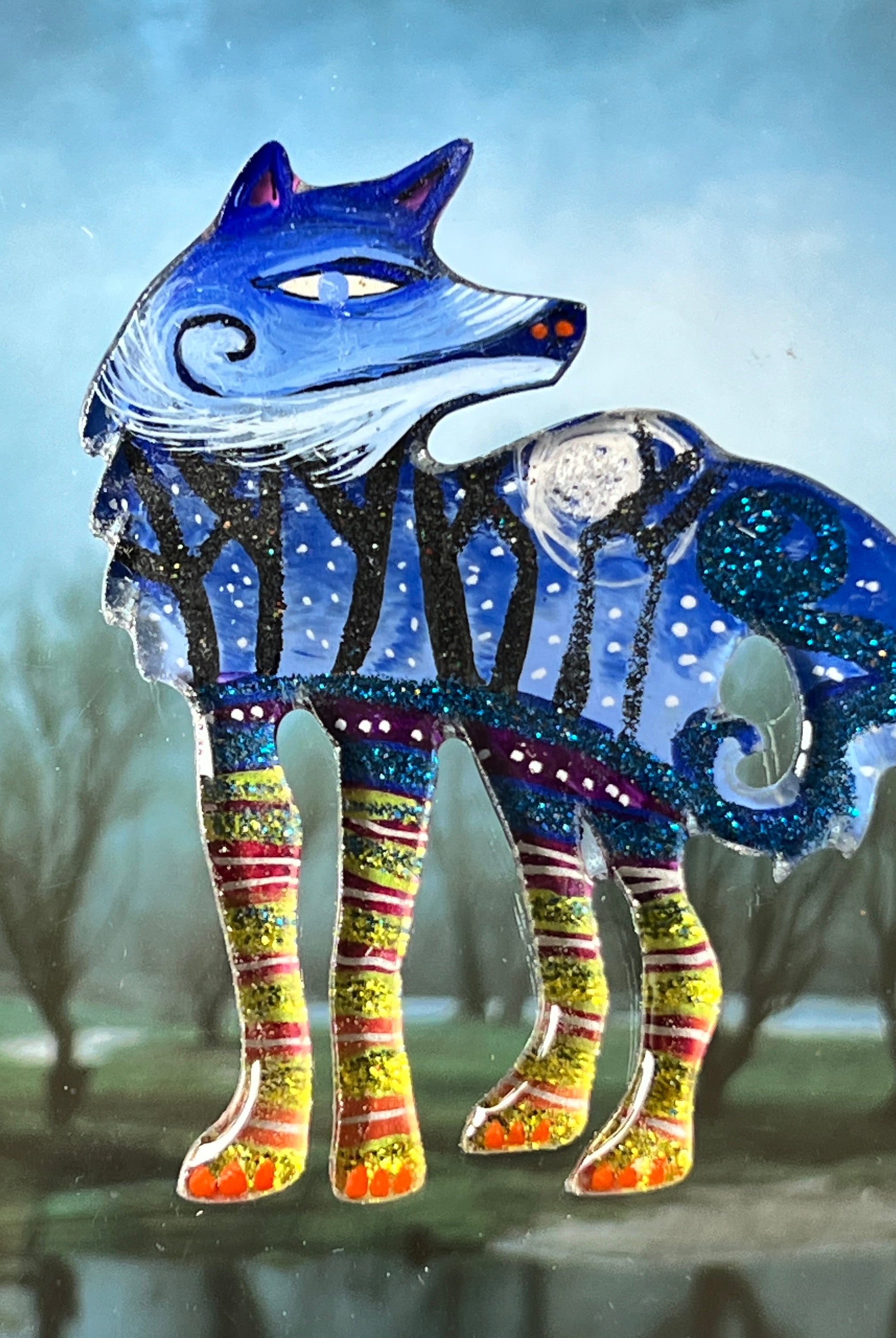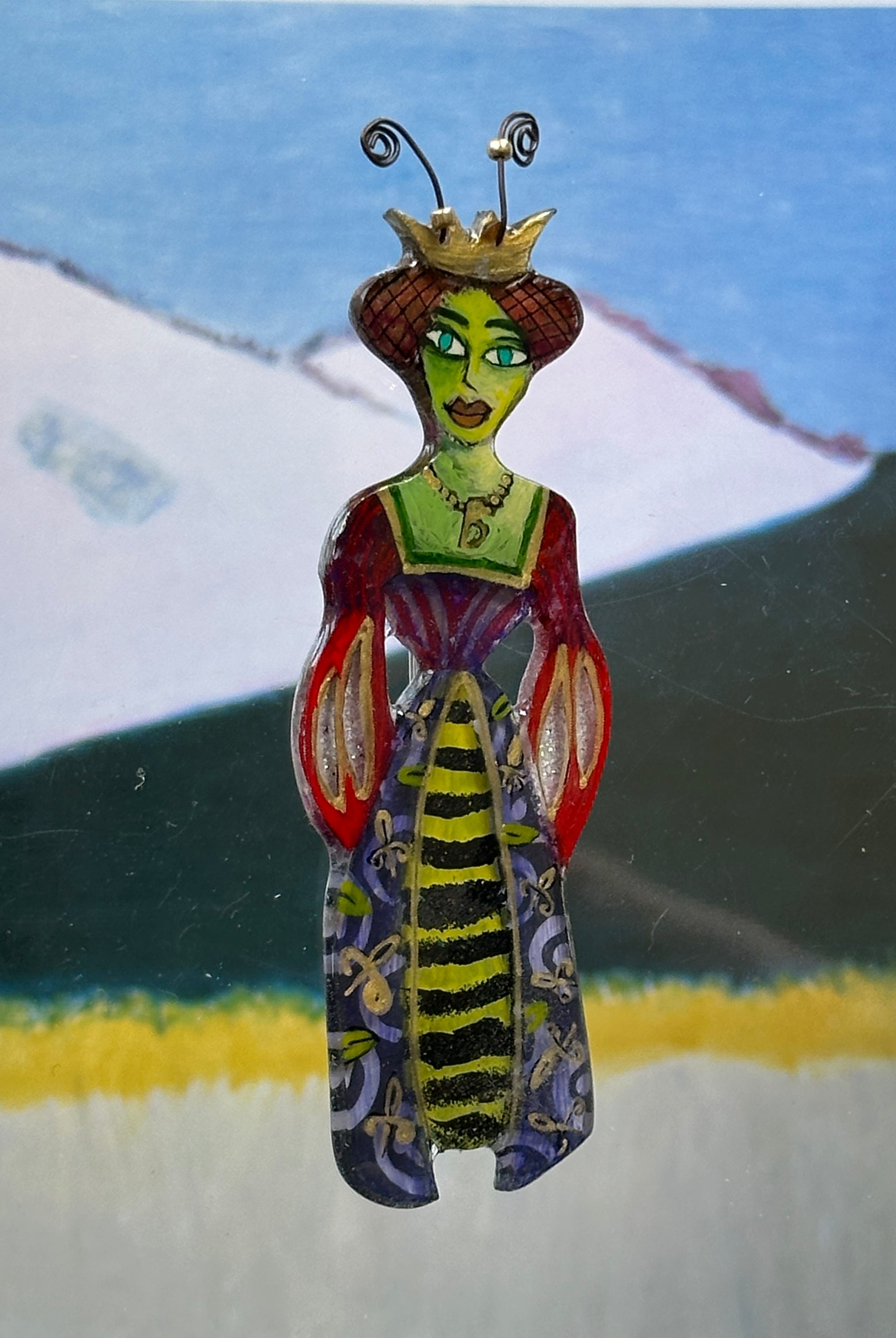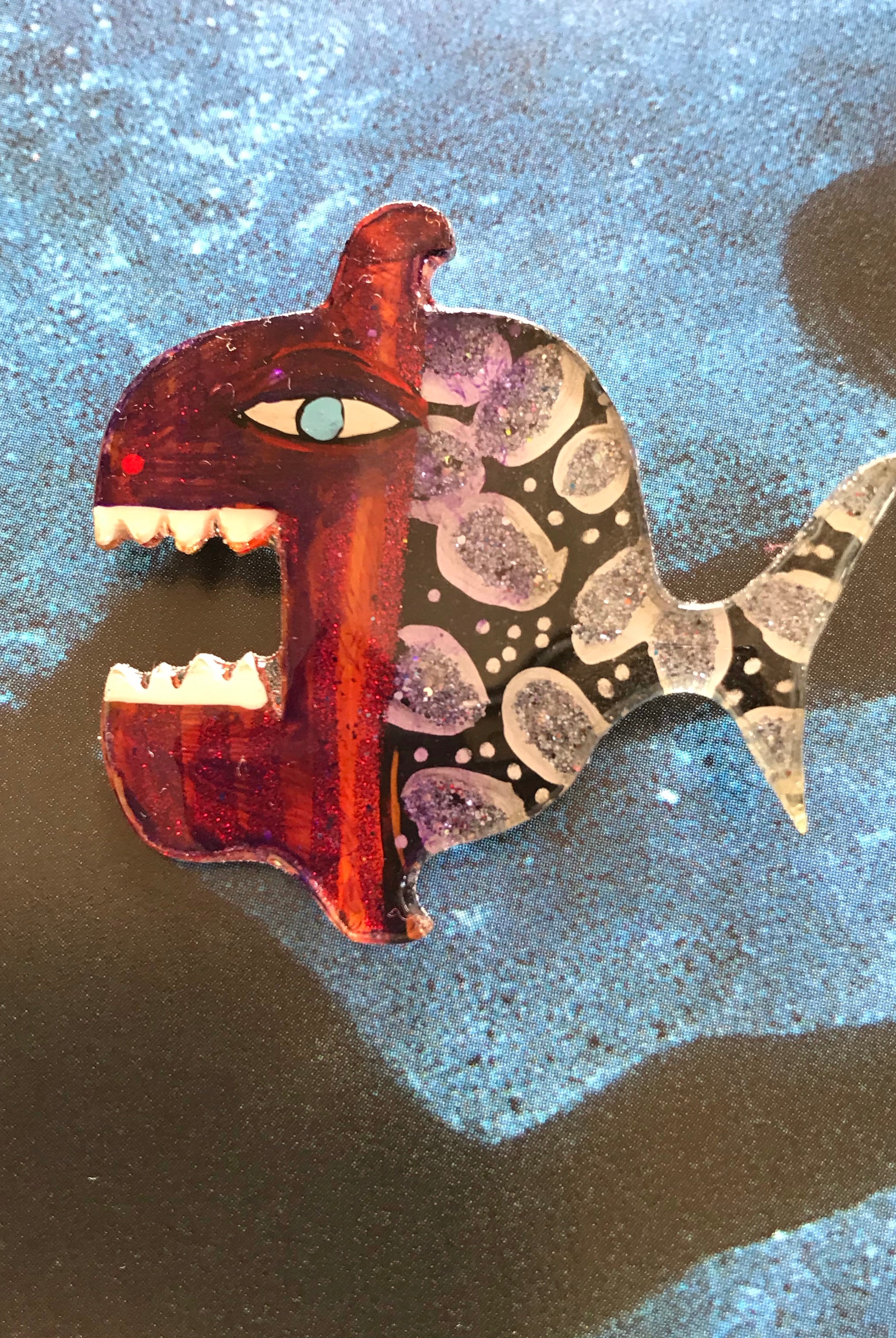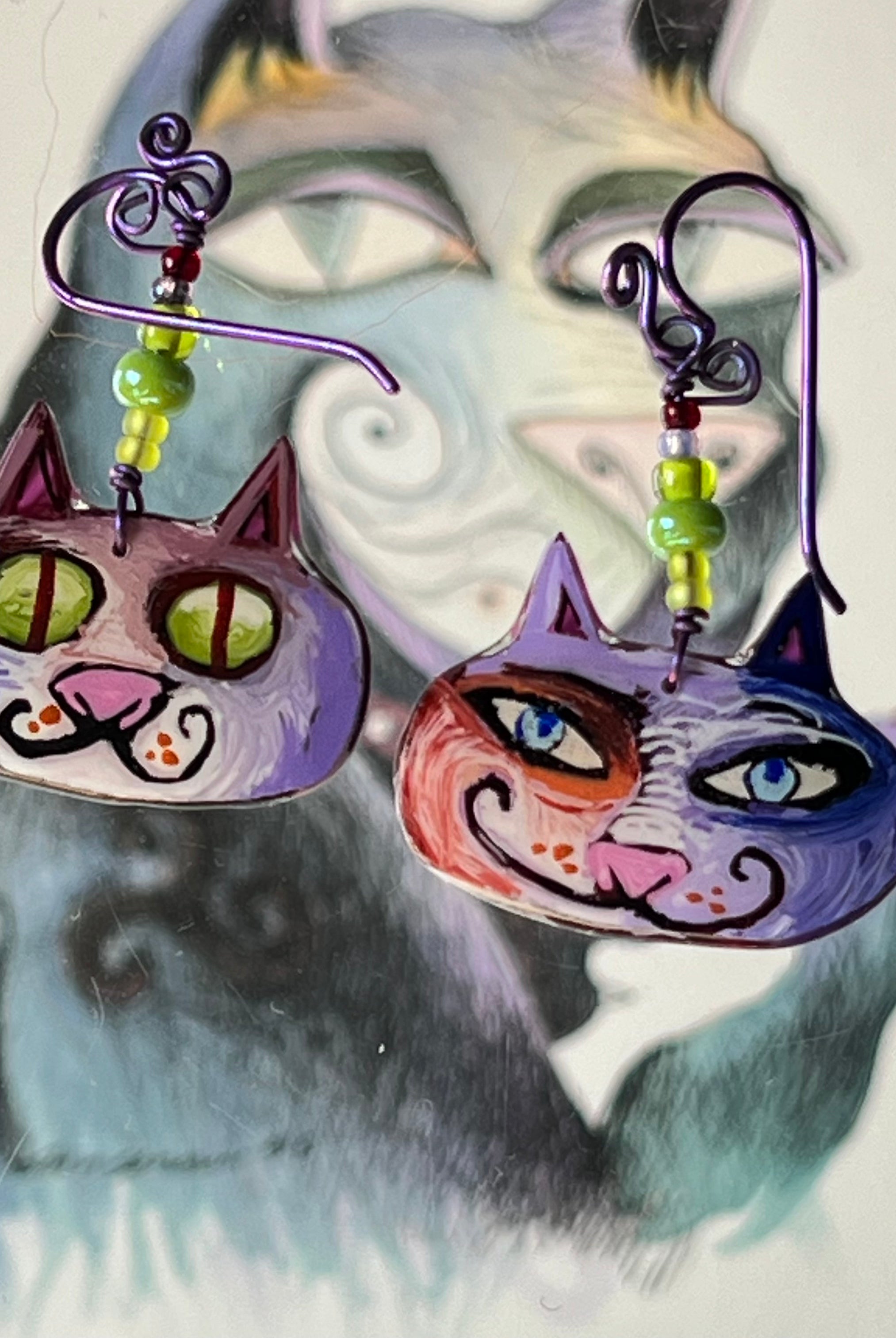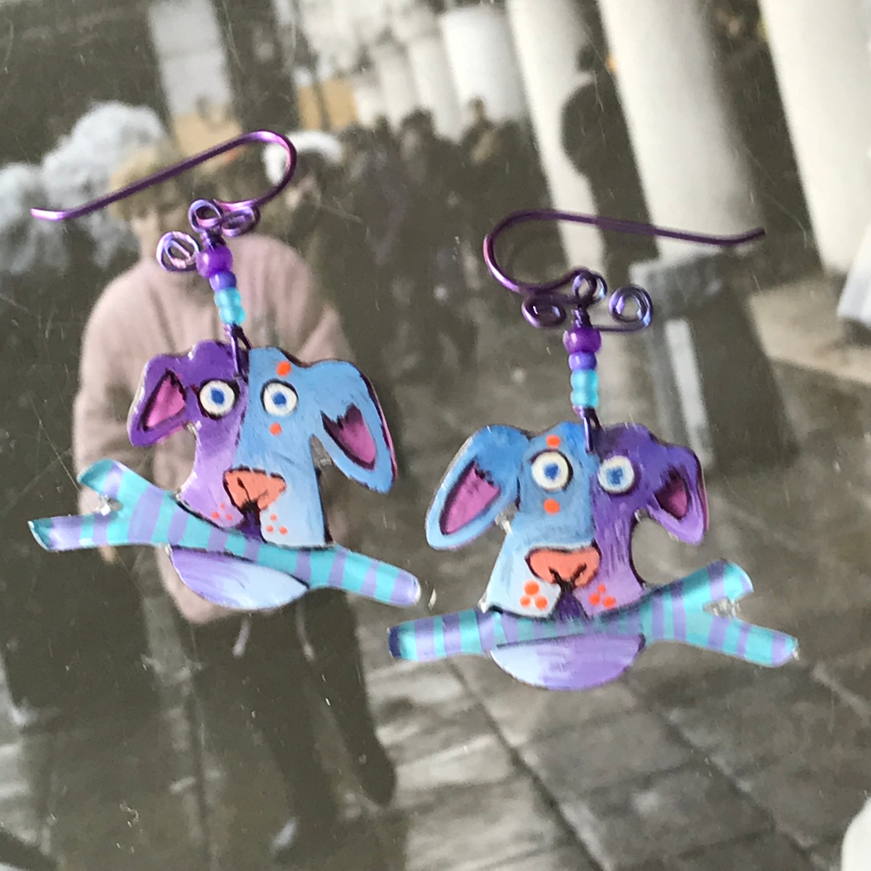 For me, these are little paintings that you can wear. If you are thinking of shrinky-dinks, I'm sure that was in my mind when I came up with lasercutting the shapes and then painting with the same paints I use on canvas. It's a multi layered process that takes a long time. The painting takes the longest, but it is the most rewarding. They are coated with a thick and sturdy glaze that brings out the depth and color.