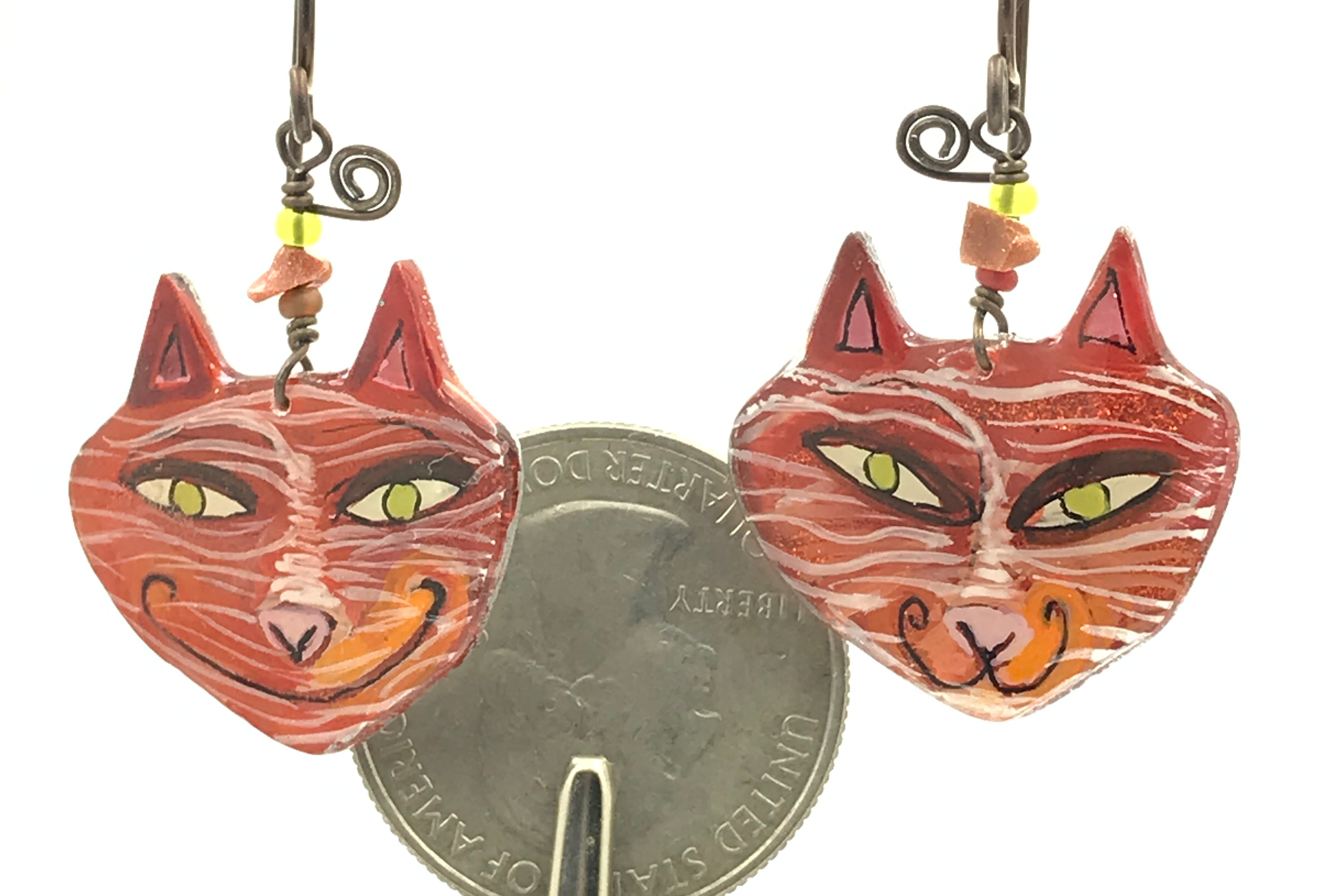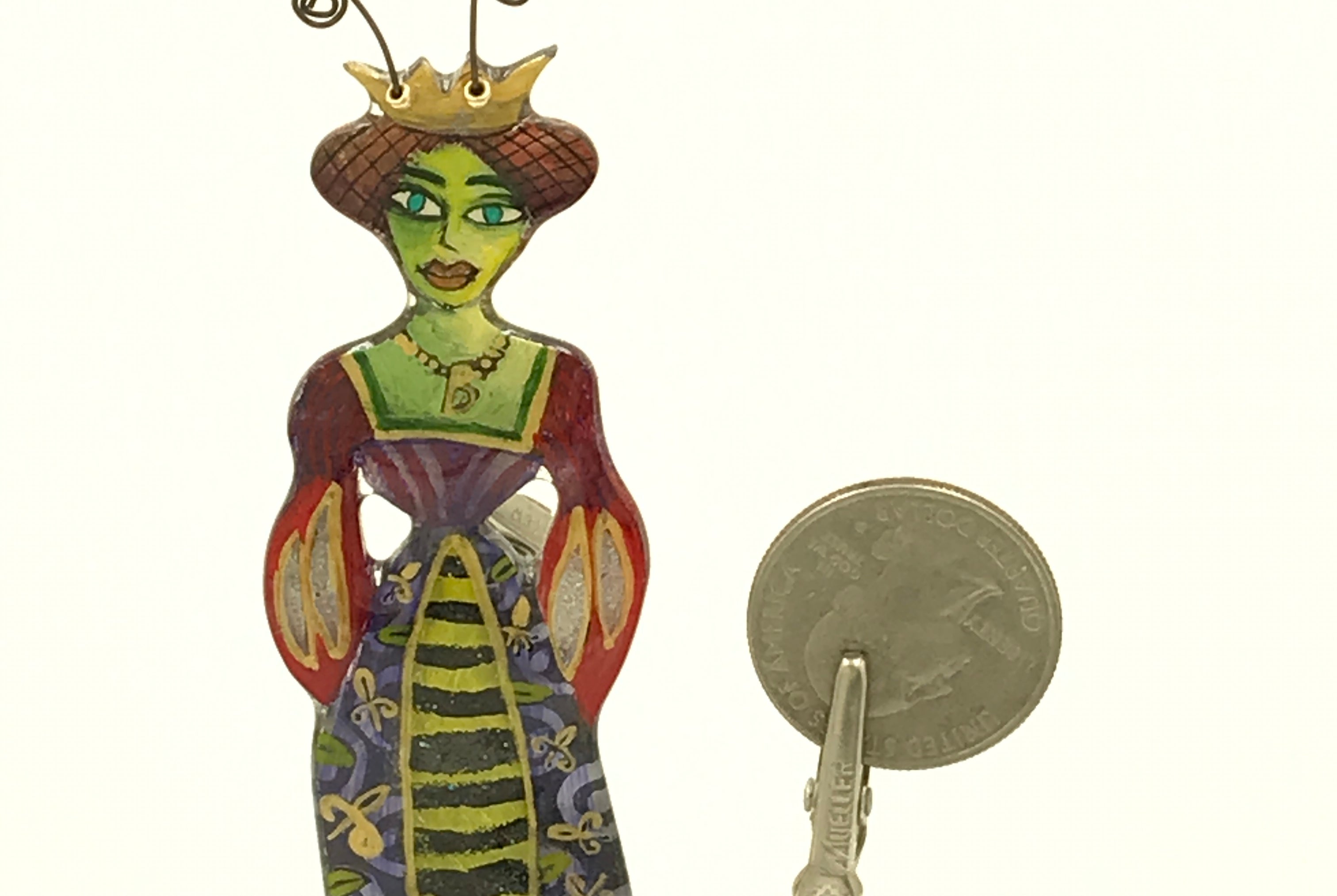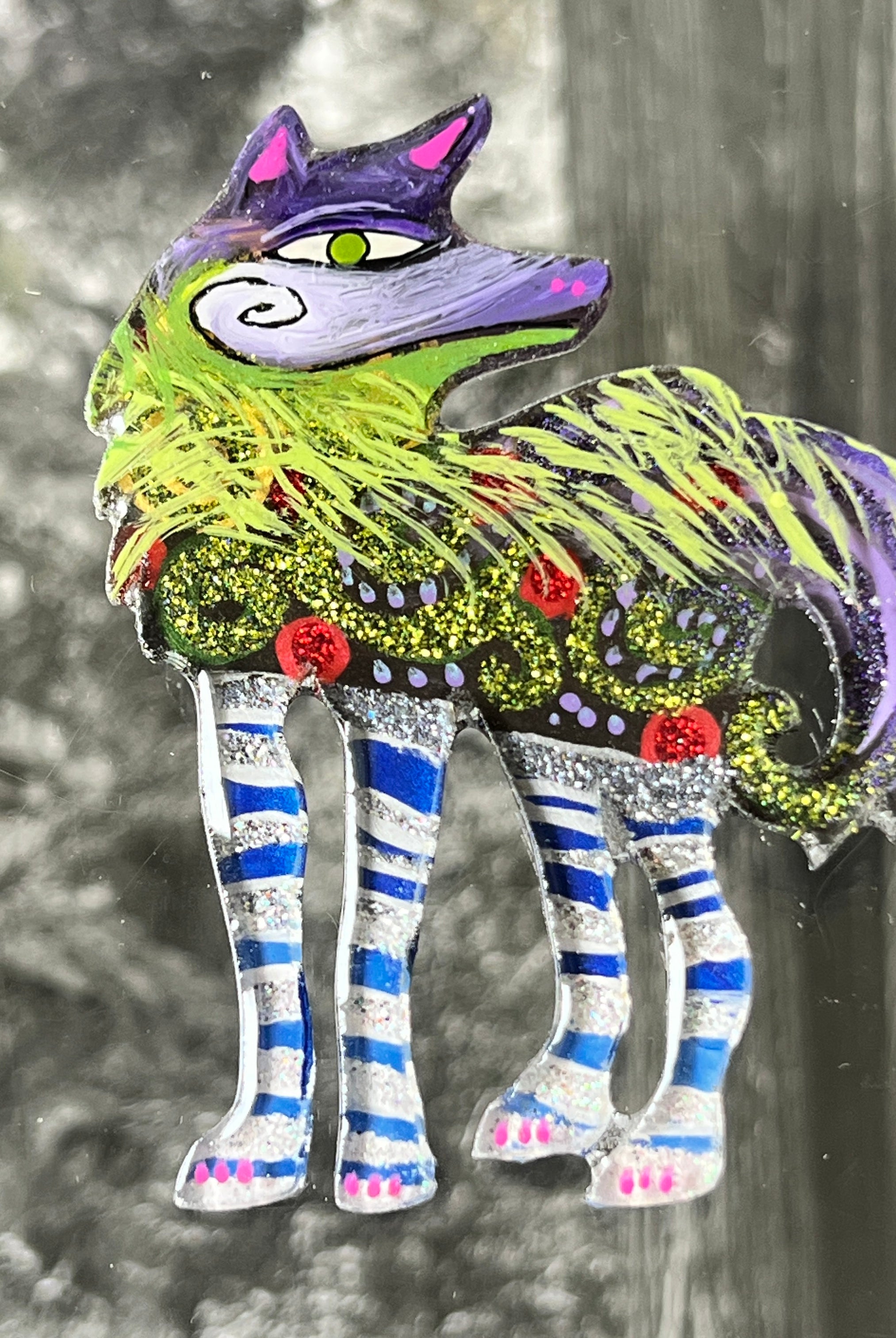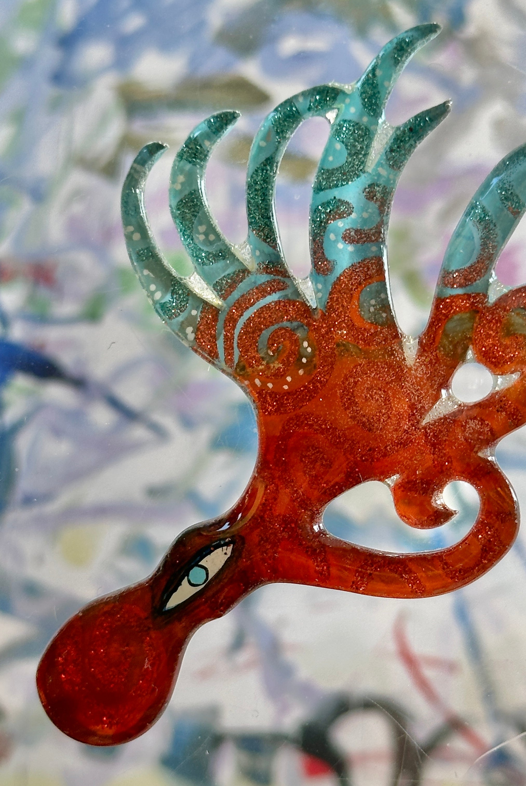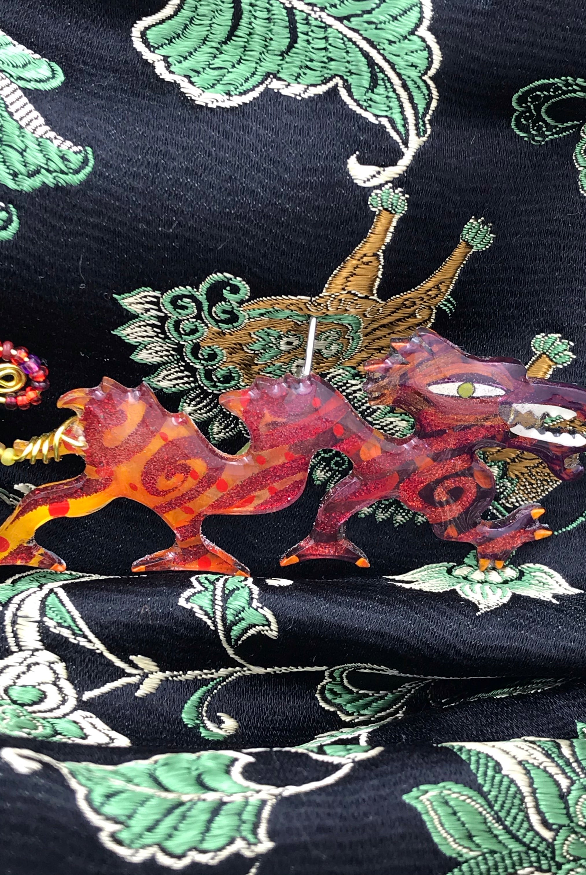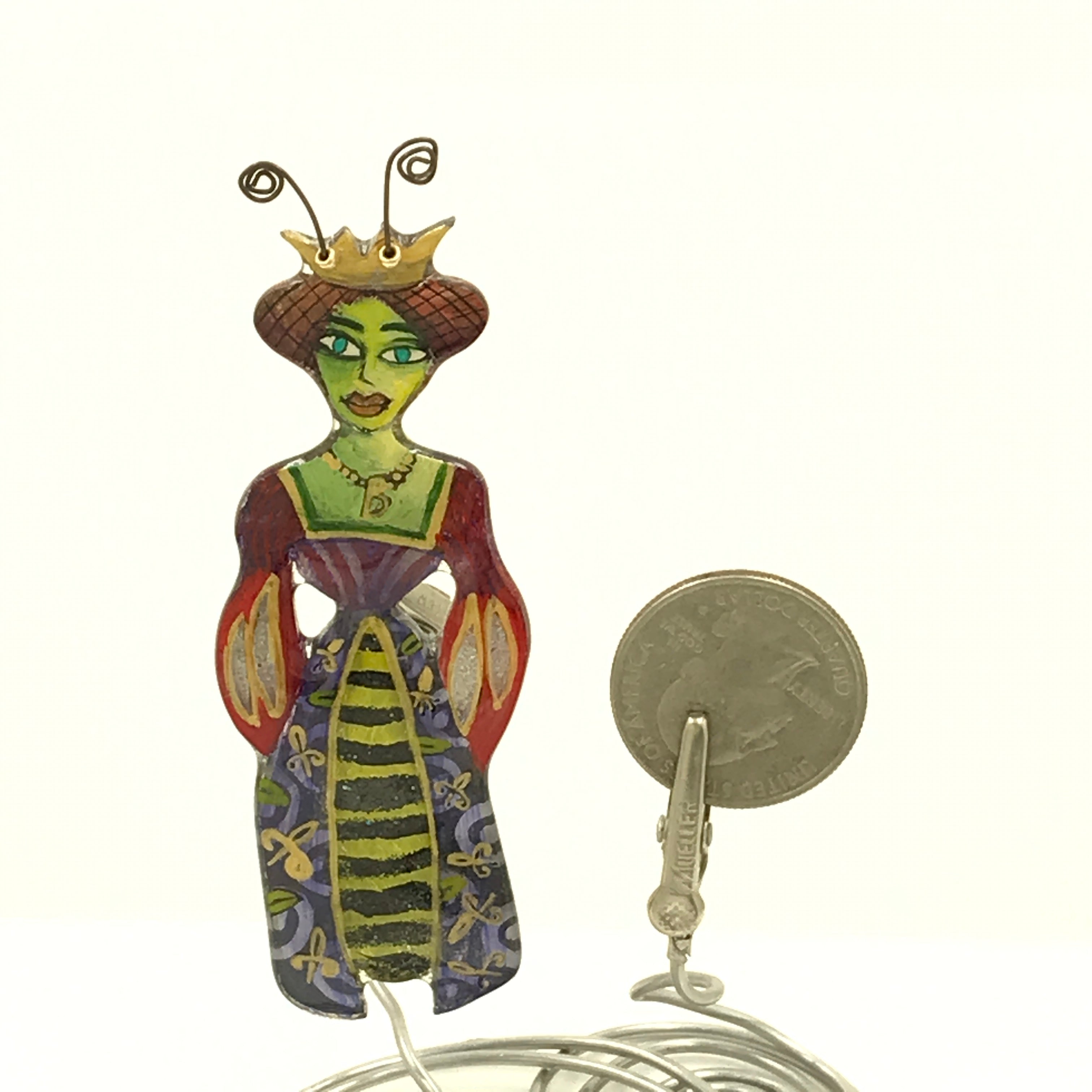 For me, these are little paintings that you can wear. If you are thinking of shrinky-dinks, I'm sure that was in my mind when I came up with lasercutting the shapes and then painting with the same paints I use on canvas. It's a multi layered process that takes a long time. The painting takes the longest, but it is the most rewarding. They are coated with a thick and sturdy glaze that brings out the depth and color.