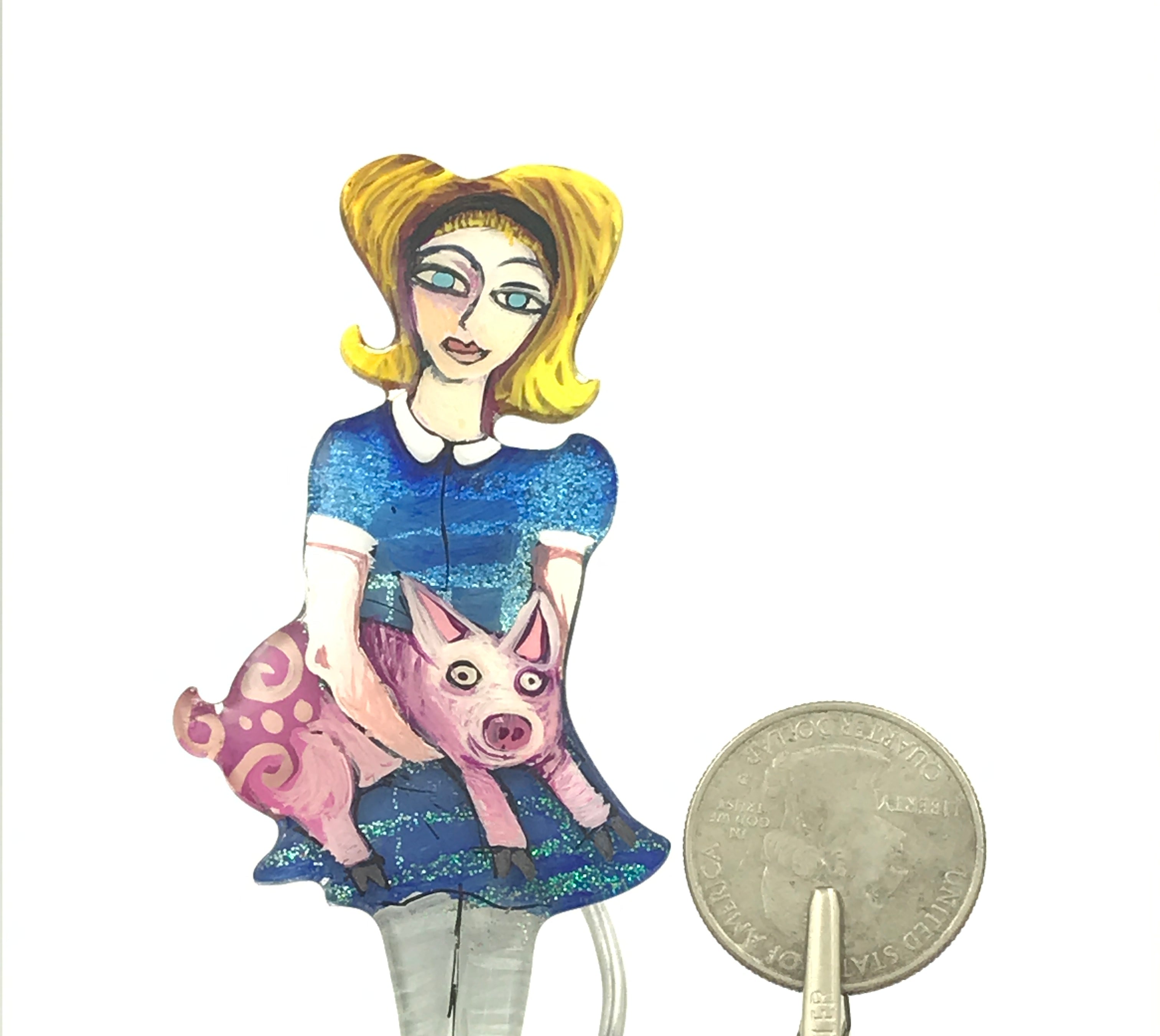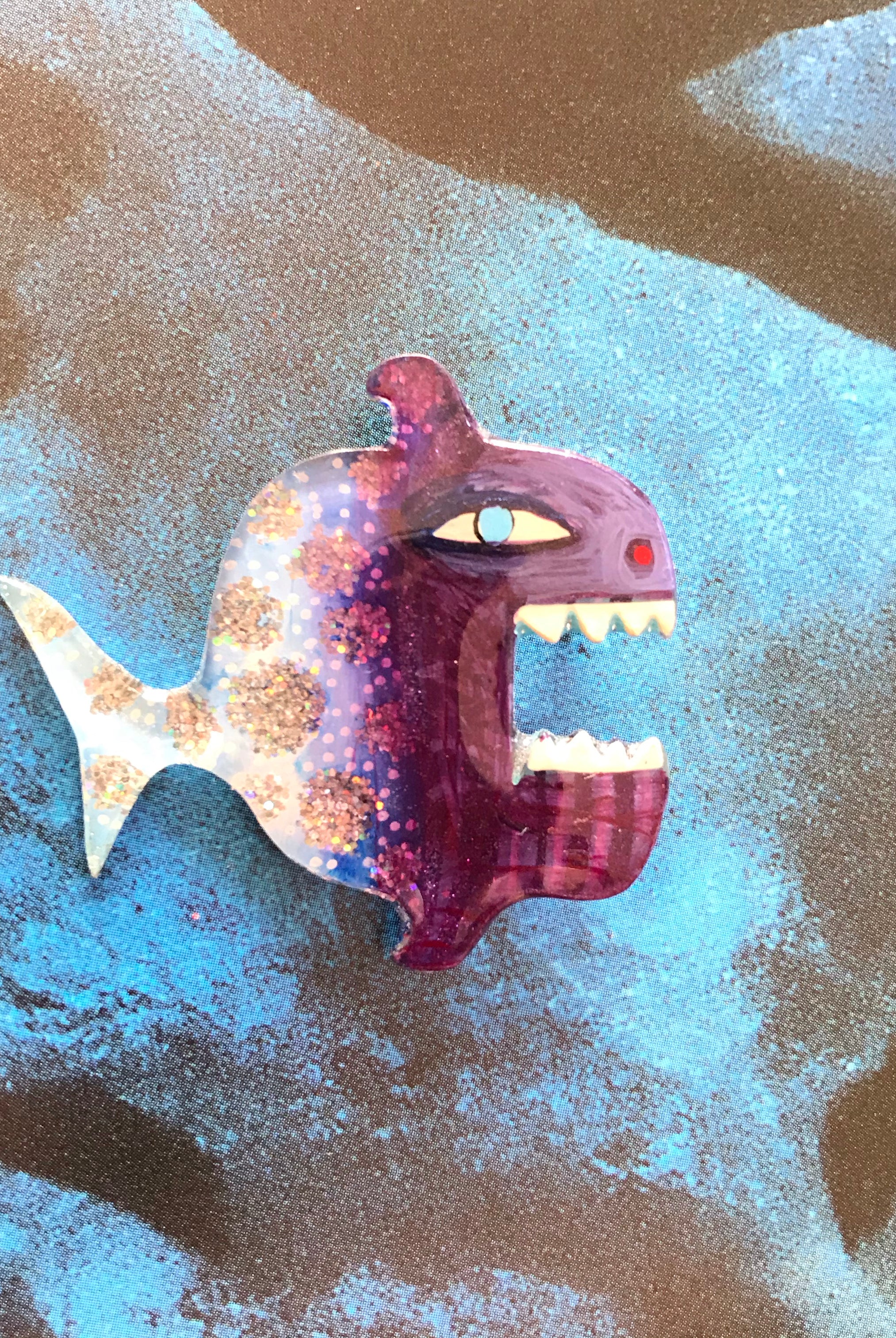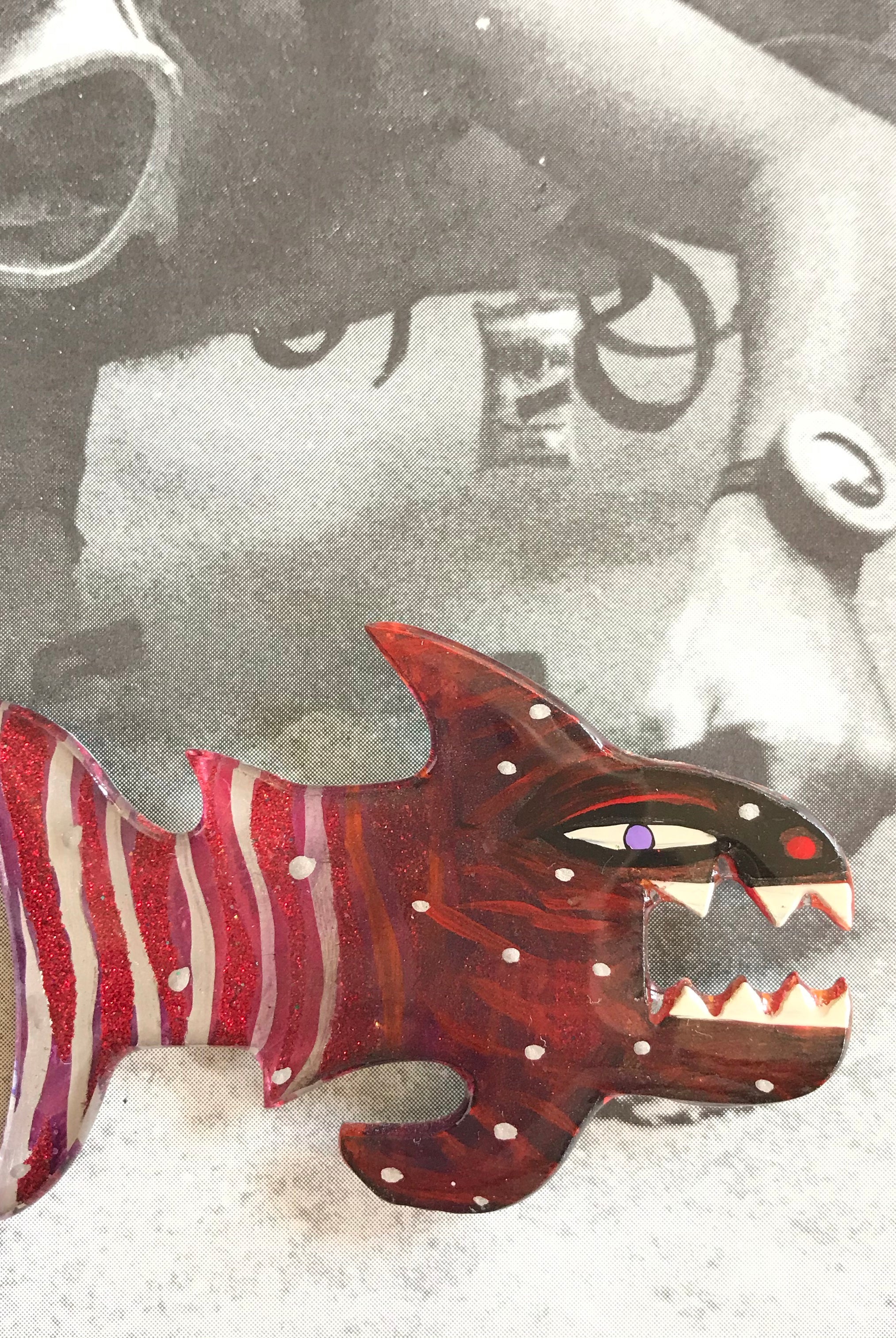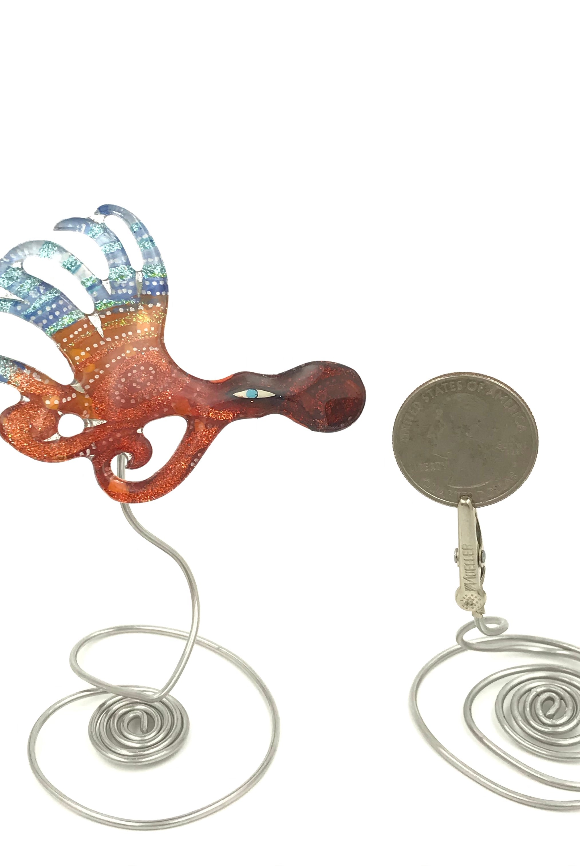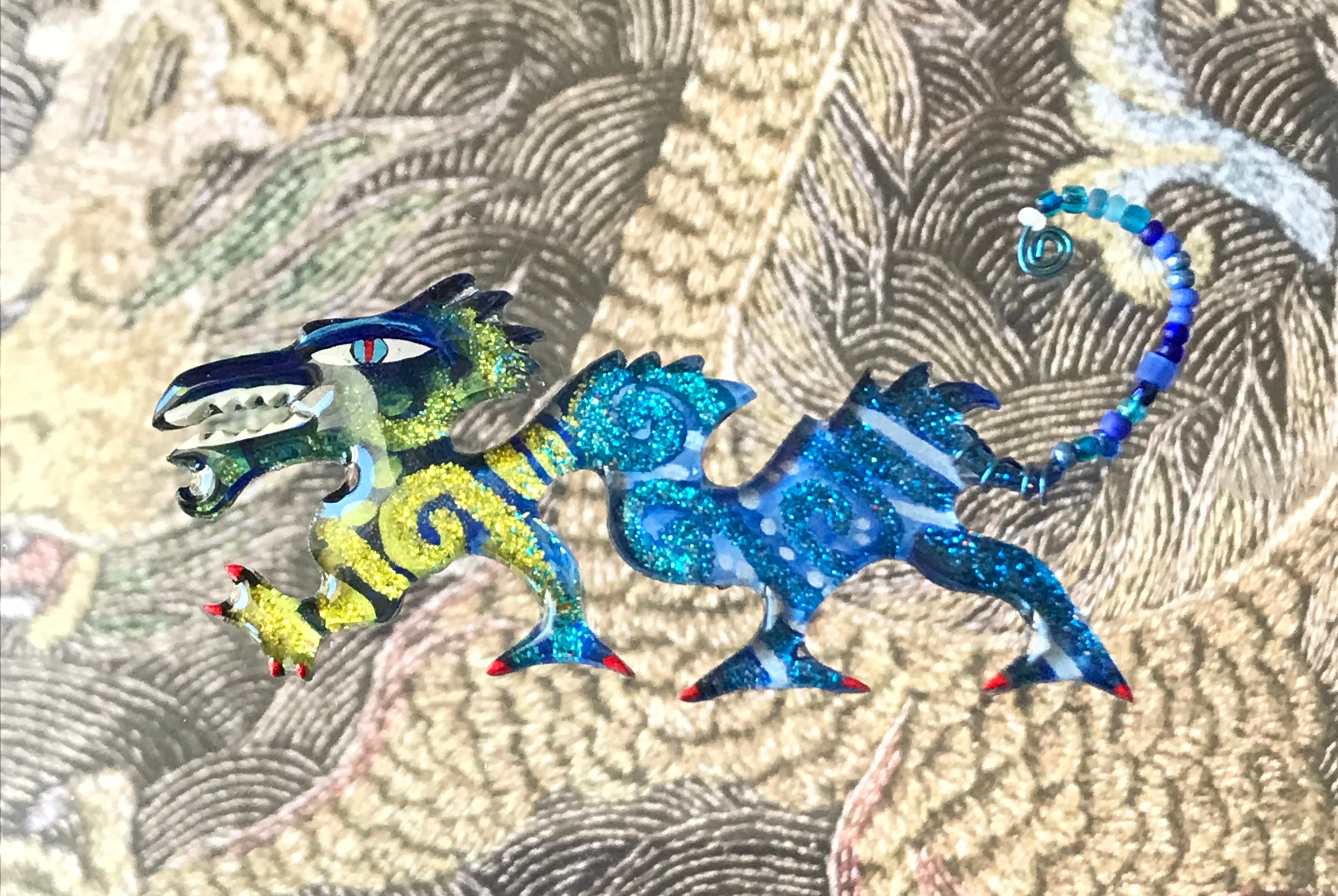 For me, these are little paintings that you can wear. If you are thinking of shrinky-dinks, I'm sure that was in my mind when I came up with lasercutting the shapes and then painting with the same paints I use on canvas. It's a multi layered process that takes a long time. The painting takes the longest, but it is the most rewarding. They are coated with a thick and sturdy glaze that brings out the depth and color.