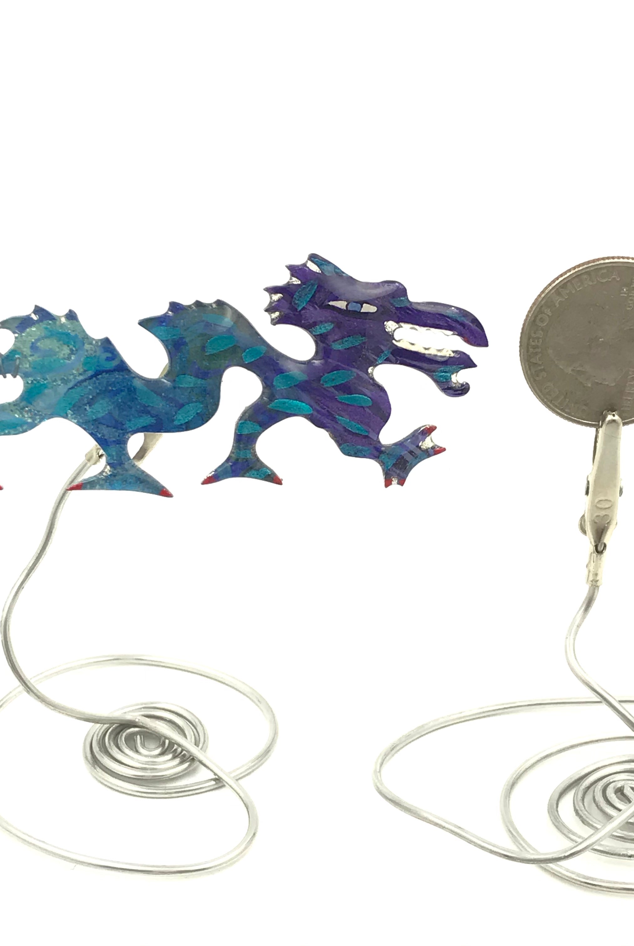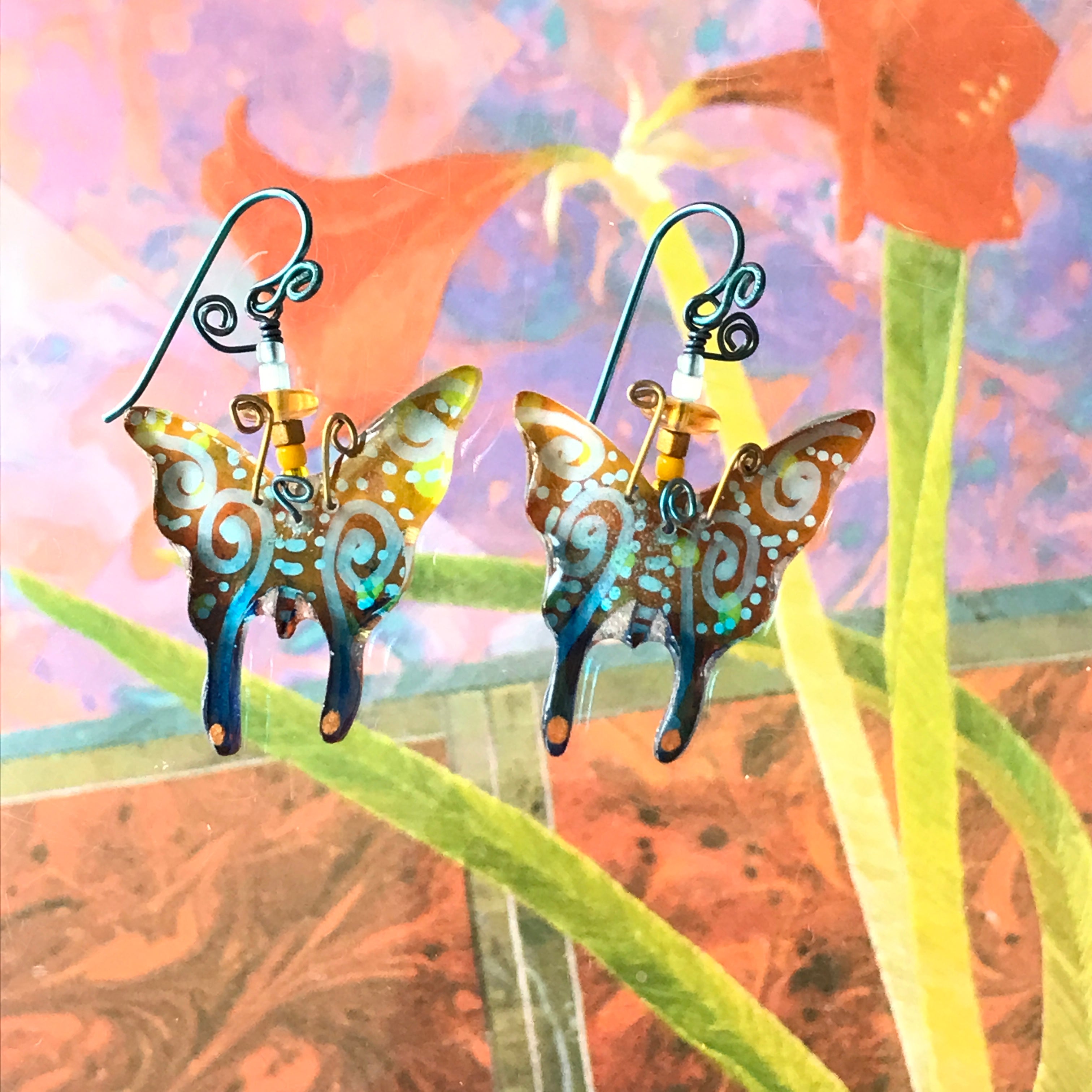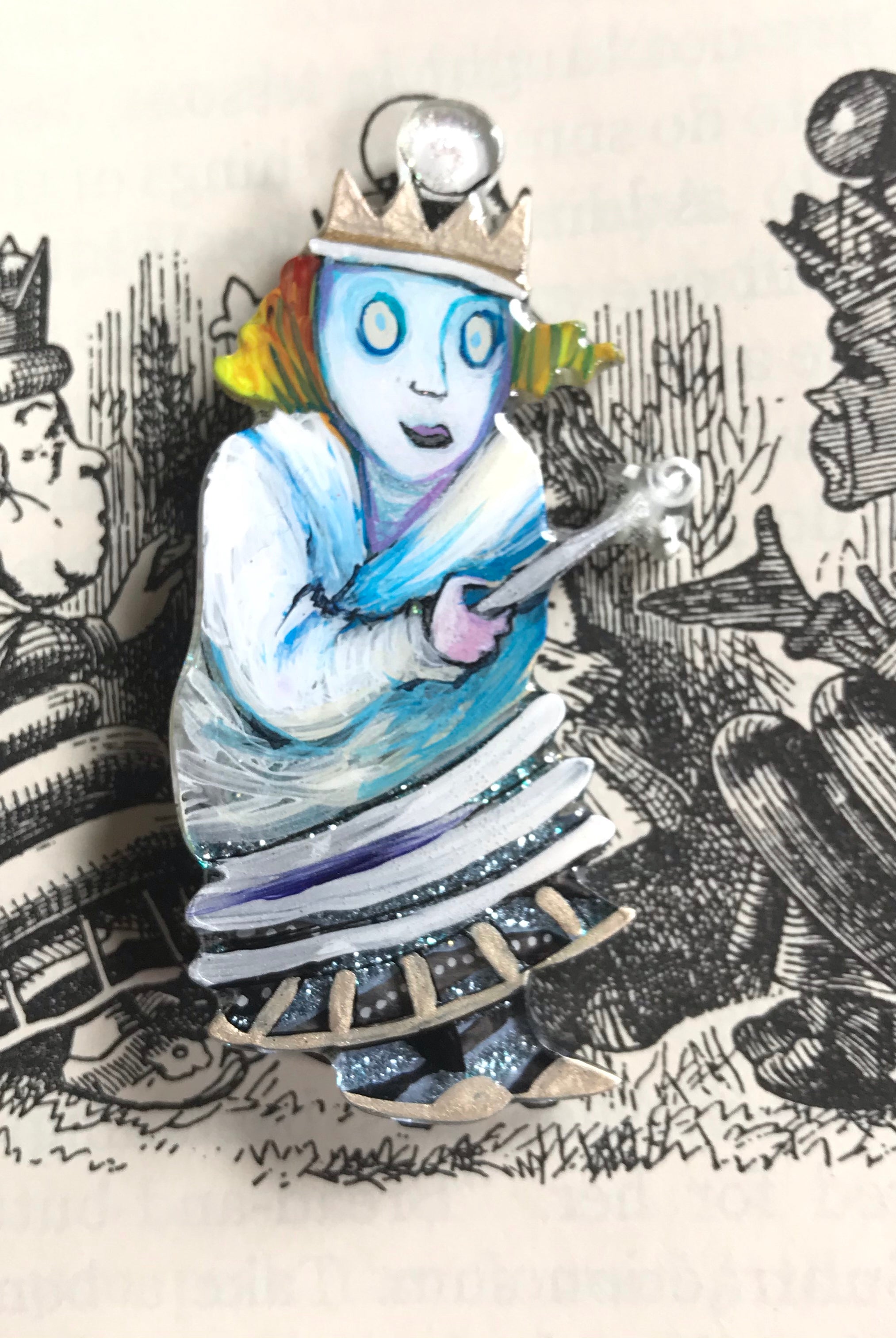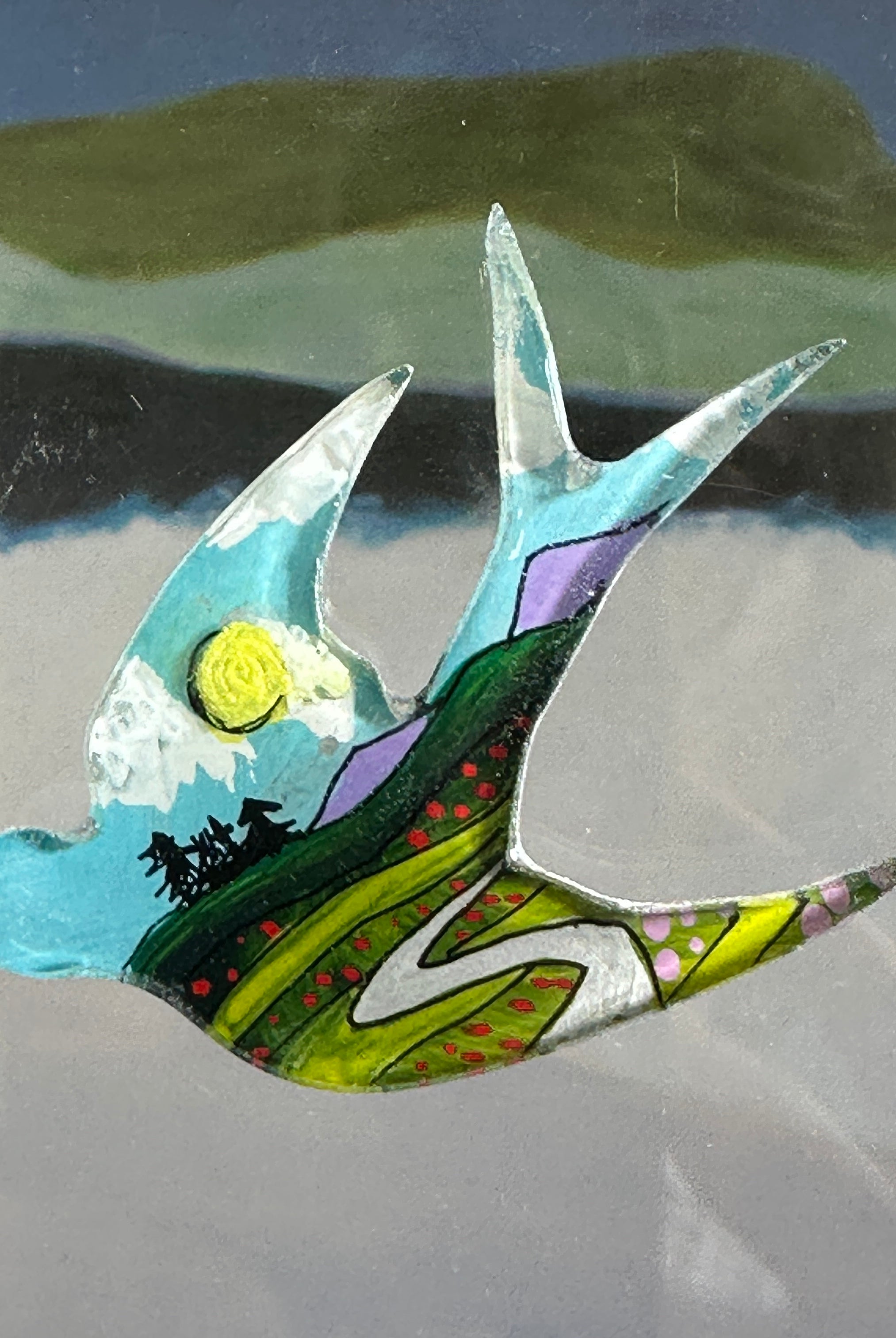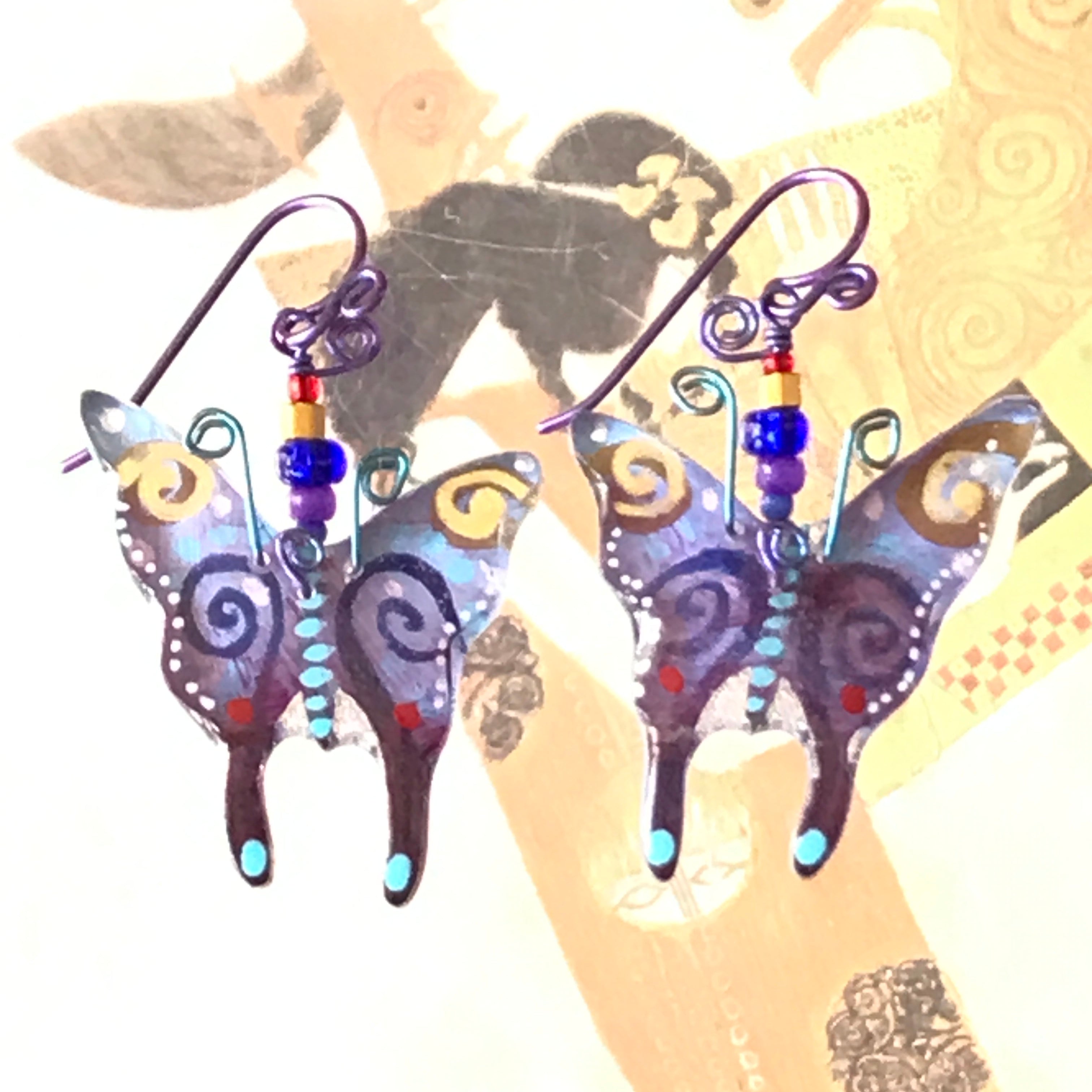 For me, these are little paintings that you can wear. If you are thinking of shrinky-dinks, I'm sure that was in my mind when I came up with lasercutting the shapes and then painting with the same paints I use on canvas. It's a multi layered process that takes a long time. The painting takes the longest, but it is the most rewarding. They are coated with a thick and sturdy glaze that brings out the depth and color.