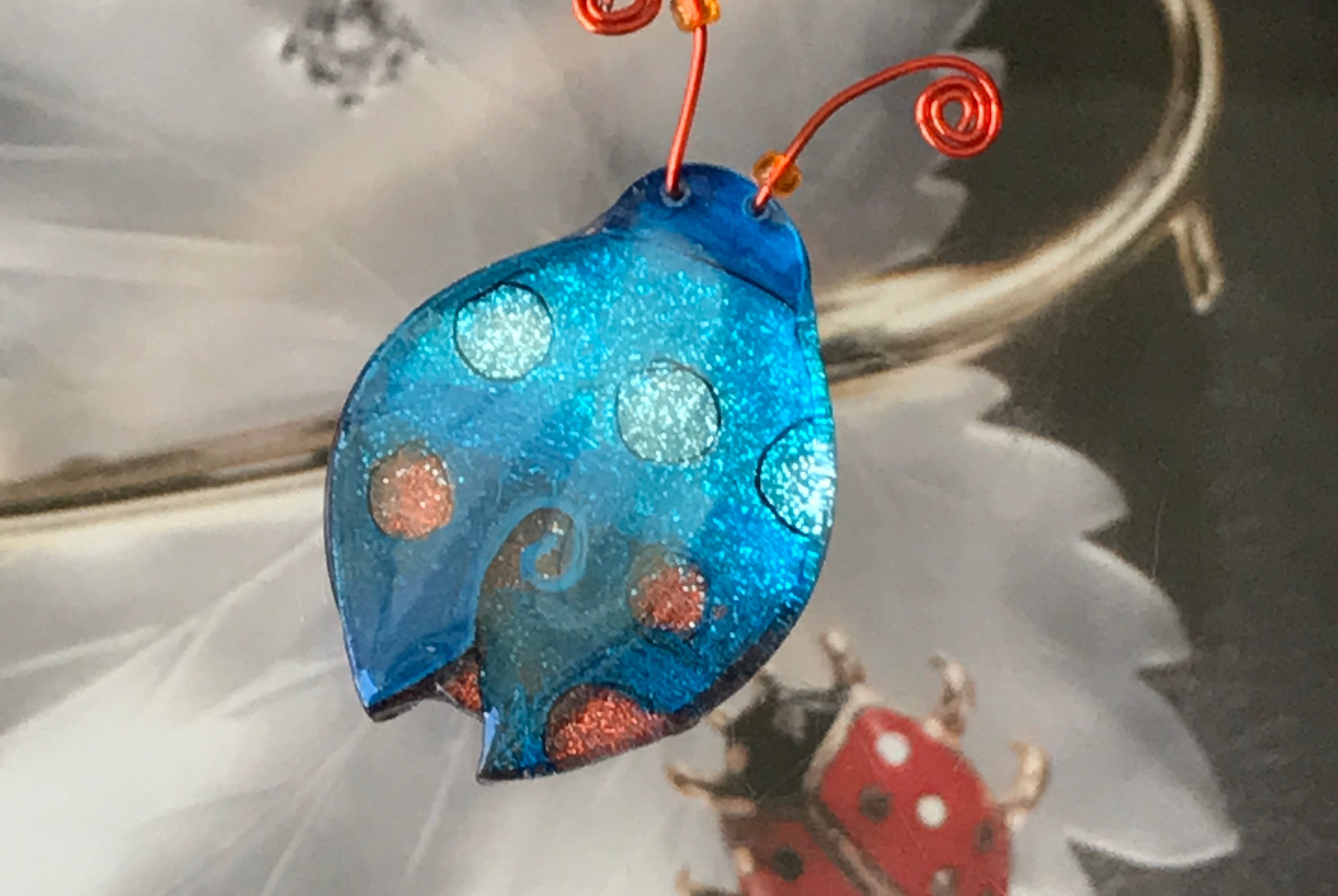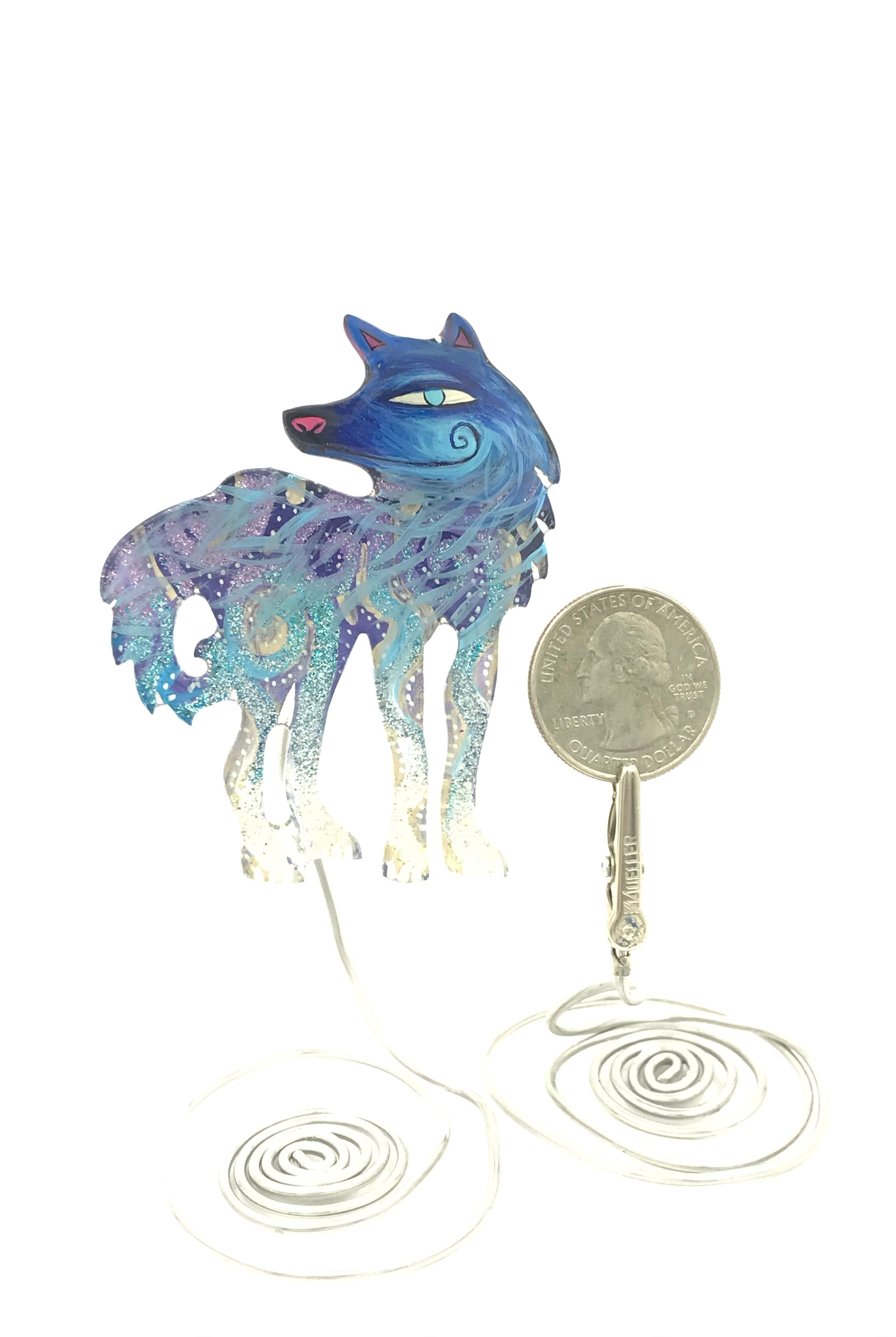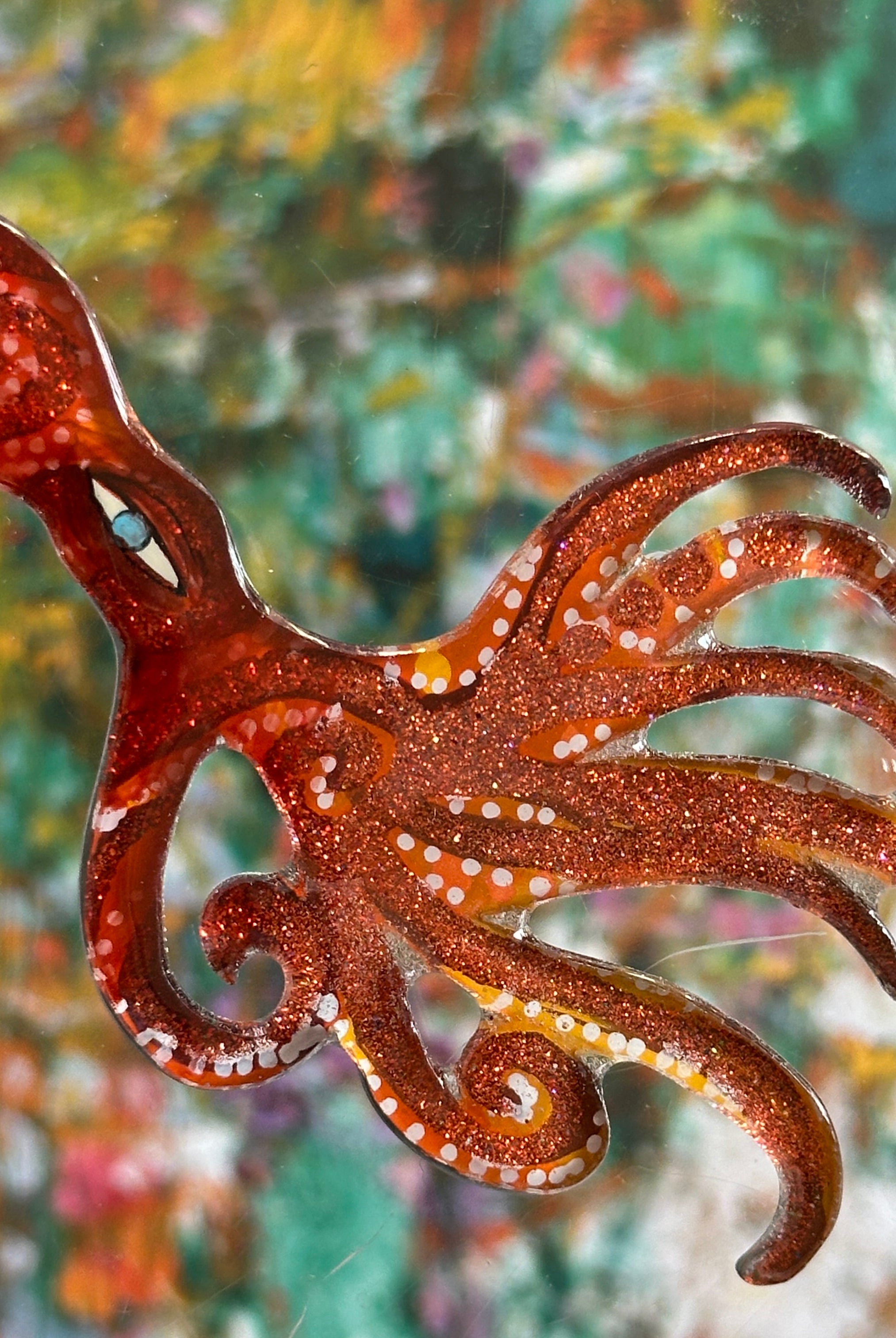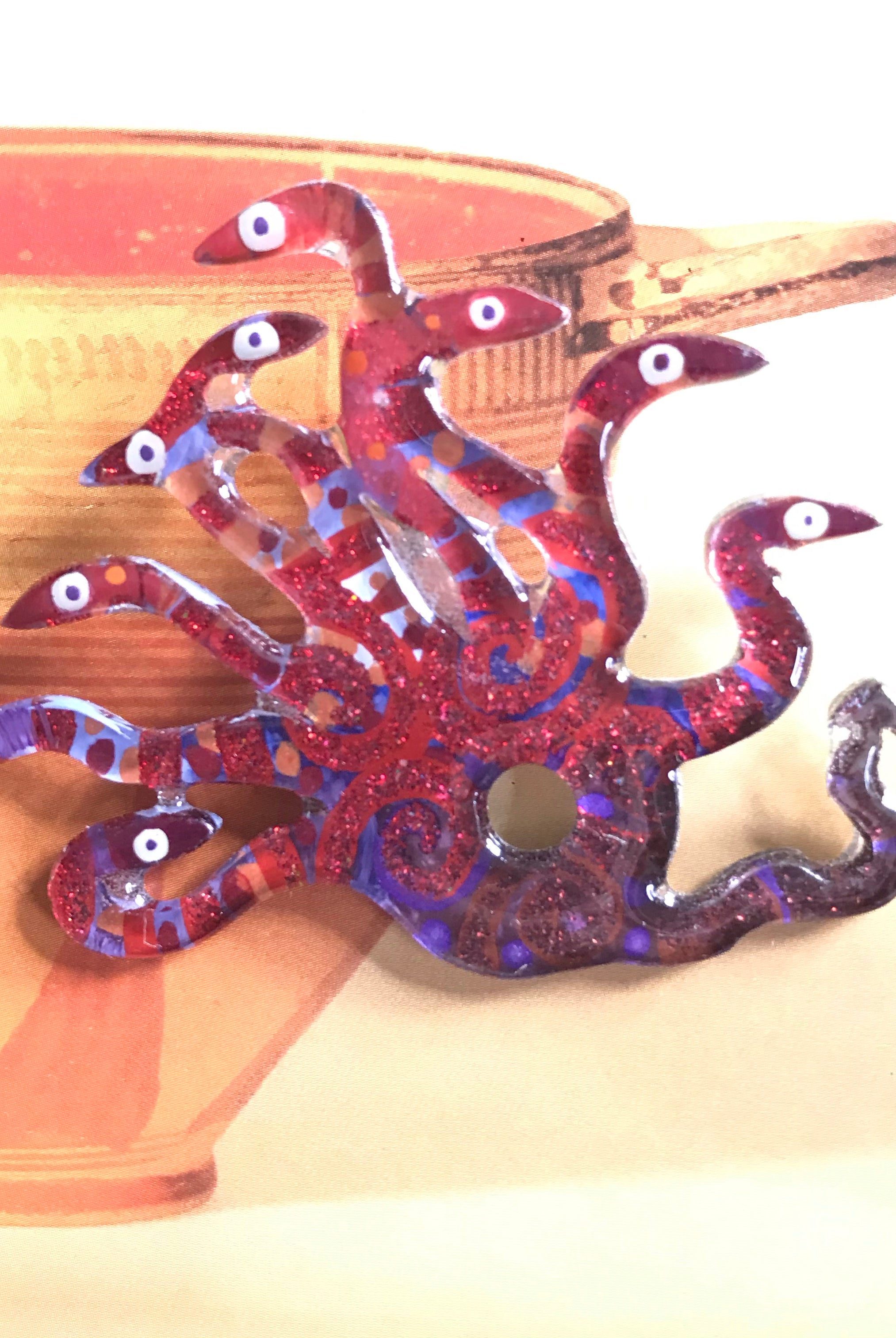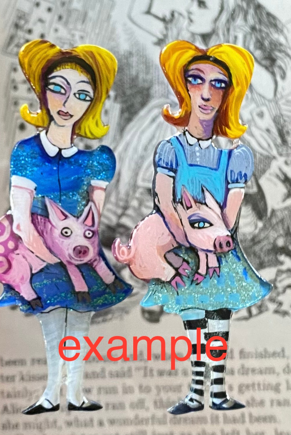 For me, these are little paintings that you can wear. If you are thinking of shrinky-dinks, I'm sure that was in my mind when I came up with lasercutting the shapes and then painting with the same paints I use on canvas. It's a multi layered process that takes a long time. The painting takes the longest, but it is the most rewarding. They are coated with a thick and sturdy glaze that brings out the depth and color.