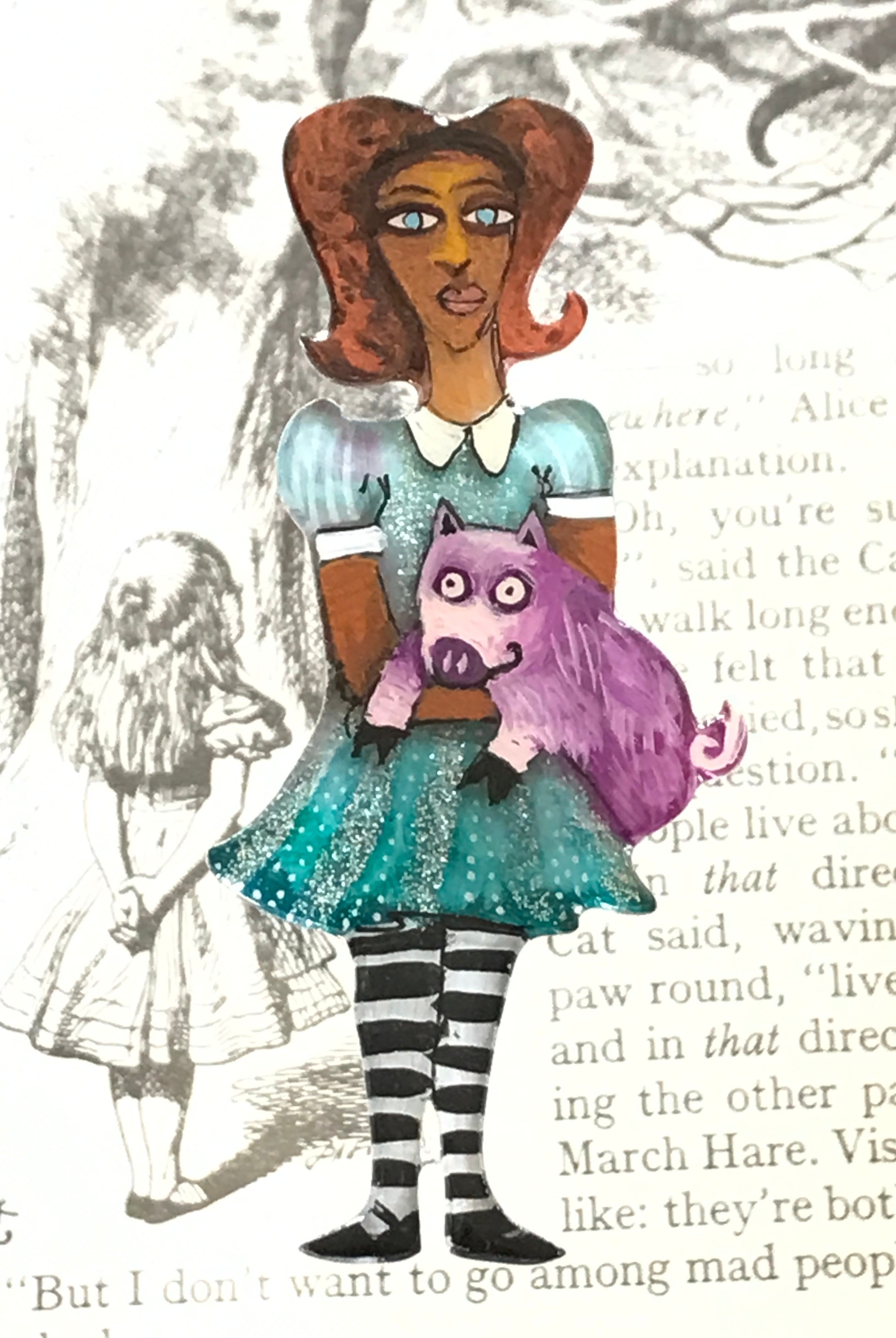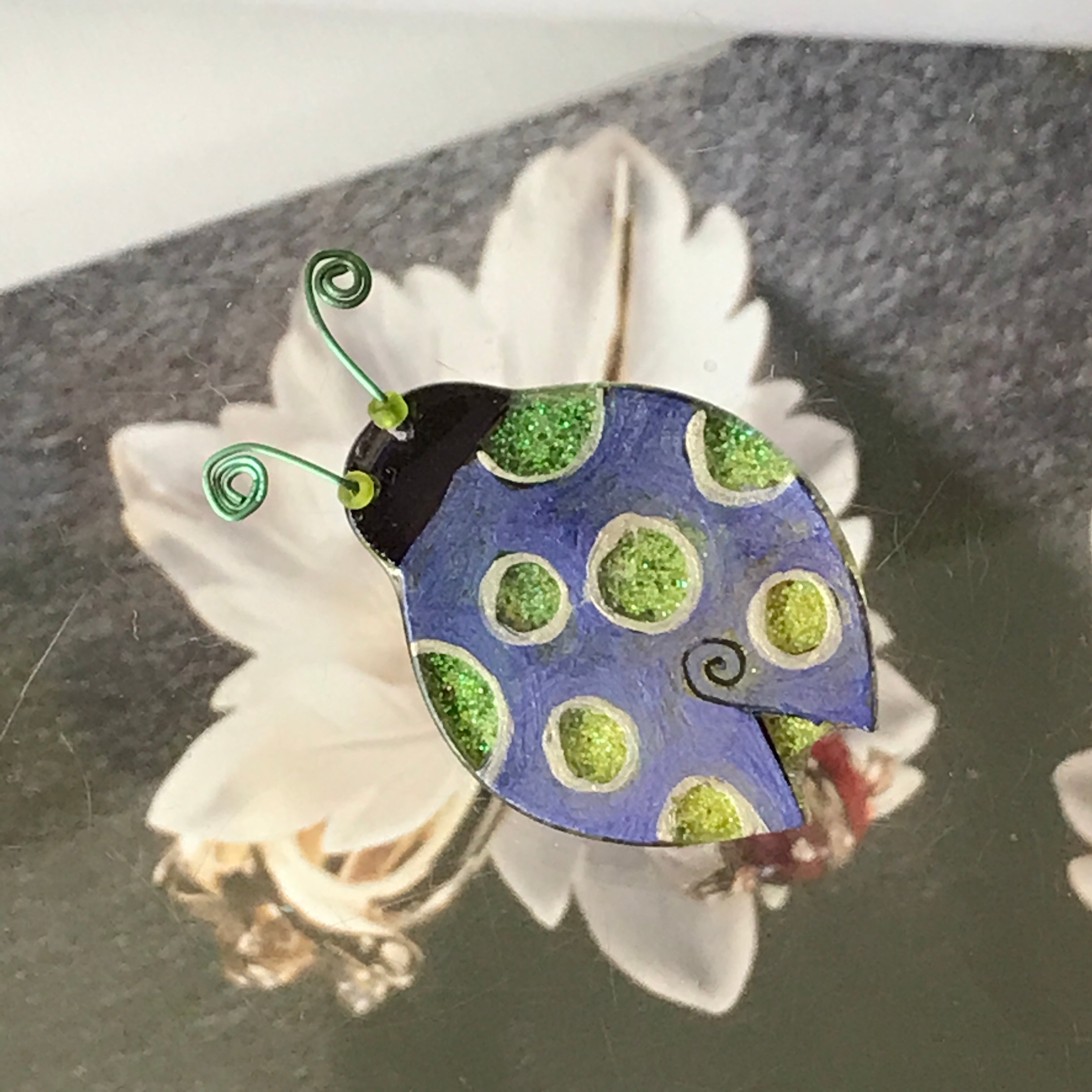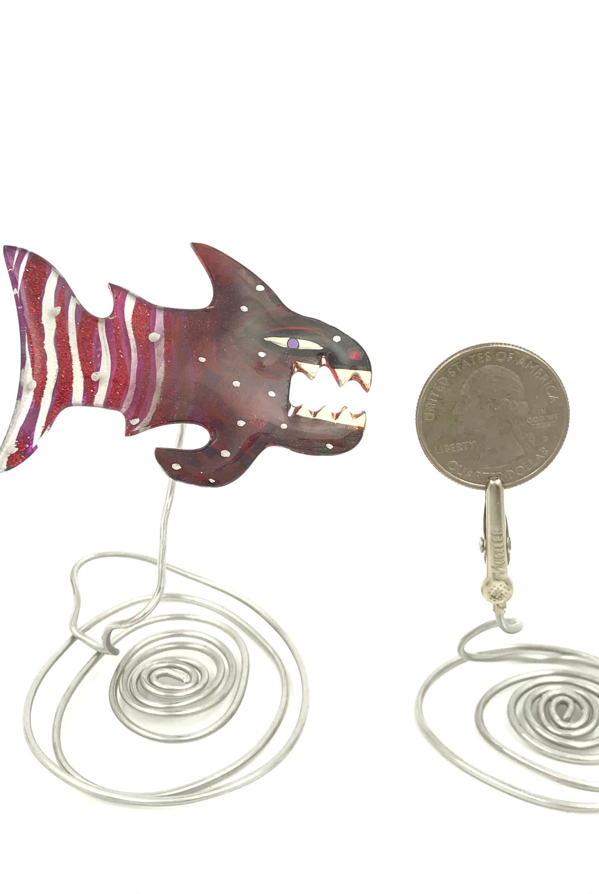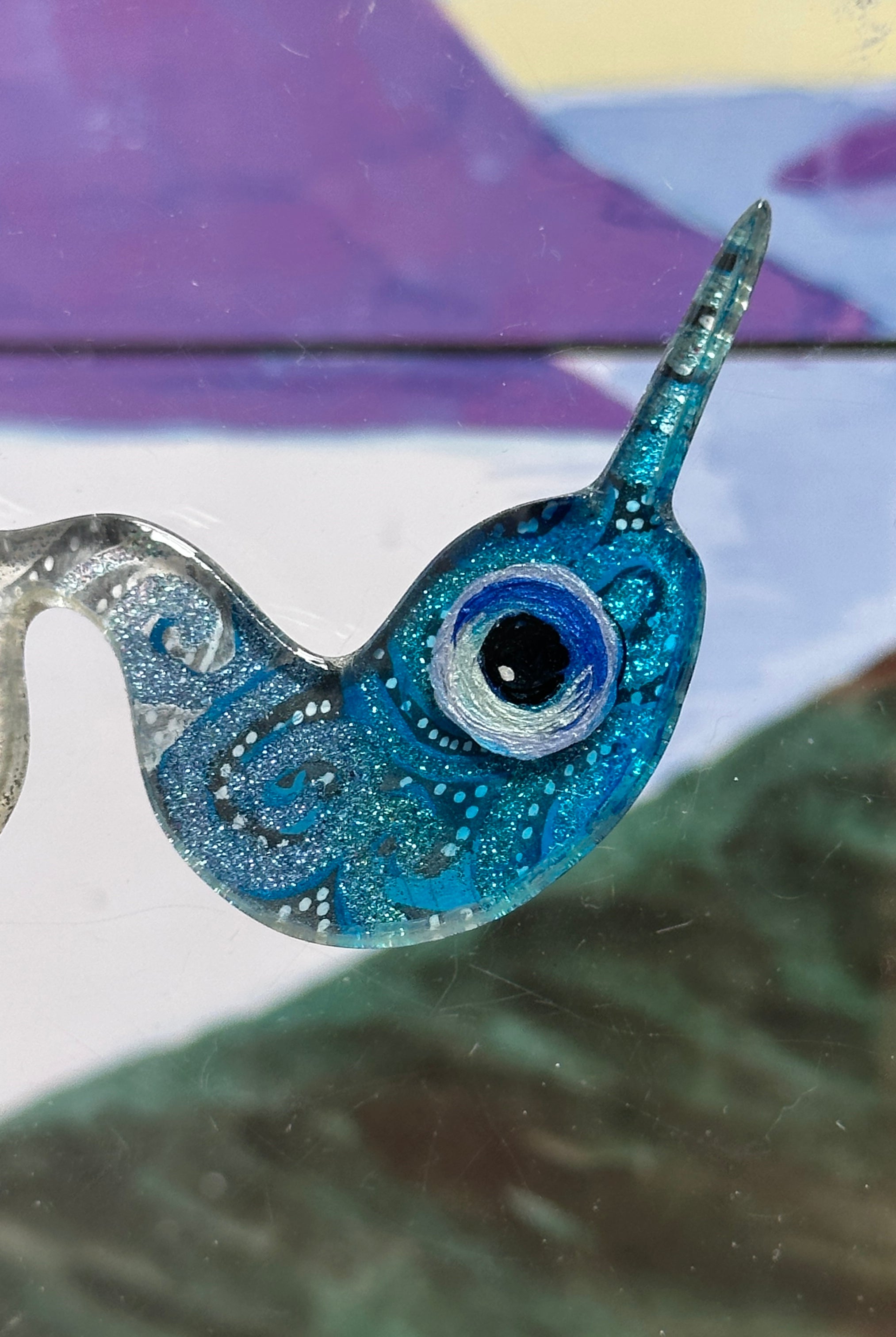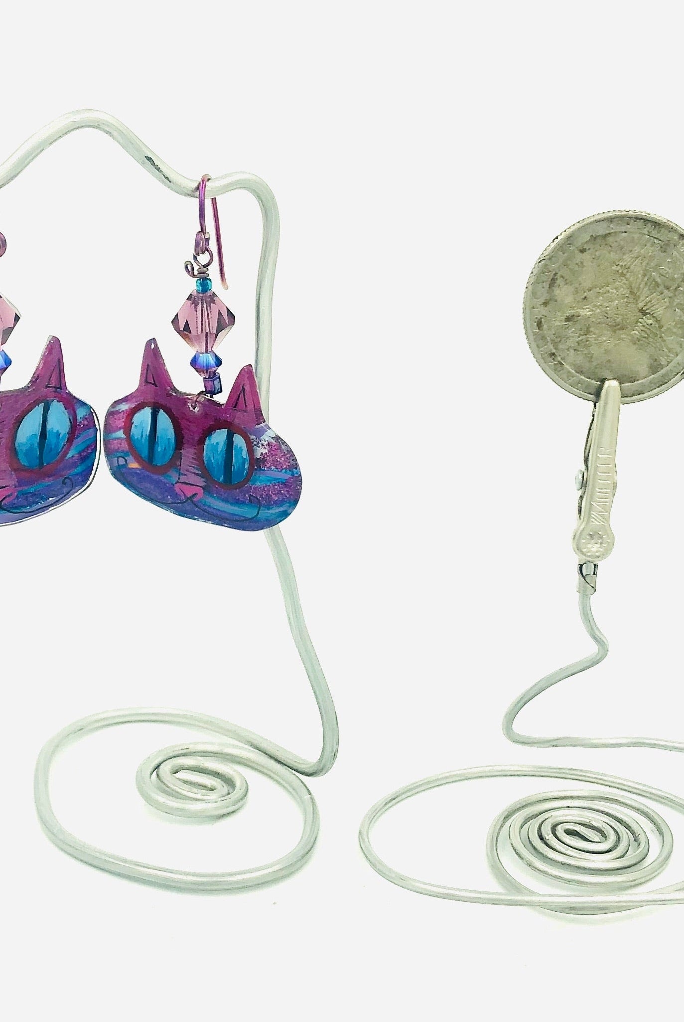 For me, these are little paintings that you can wear. If you are thinking of shrinky-dinks, I'm sure that was in my mind when I came up with lasercutting the shapes and then painting with the same paints I use on canvas. It's a multi layered process that takes a long time. The painting takes the longest, but it is the most rewarding. They are coated with a thick and sturdy glaze that brings out the depth and color.
