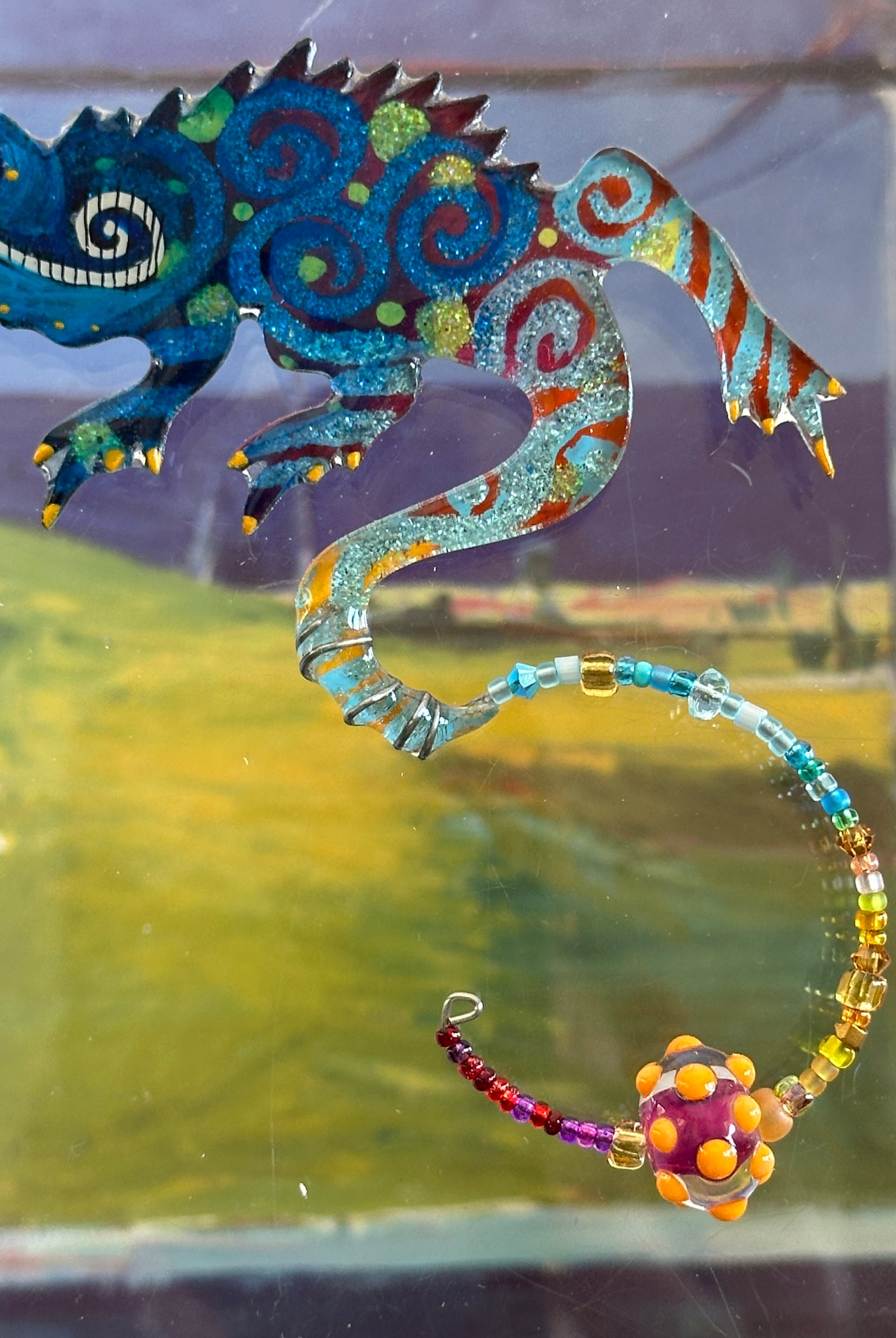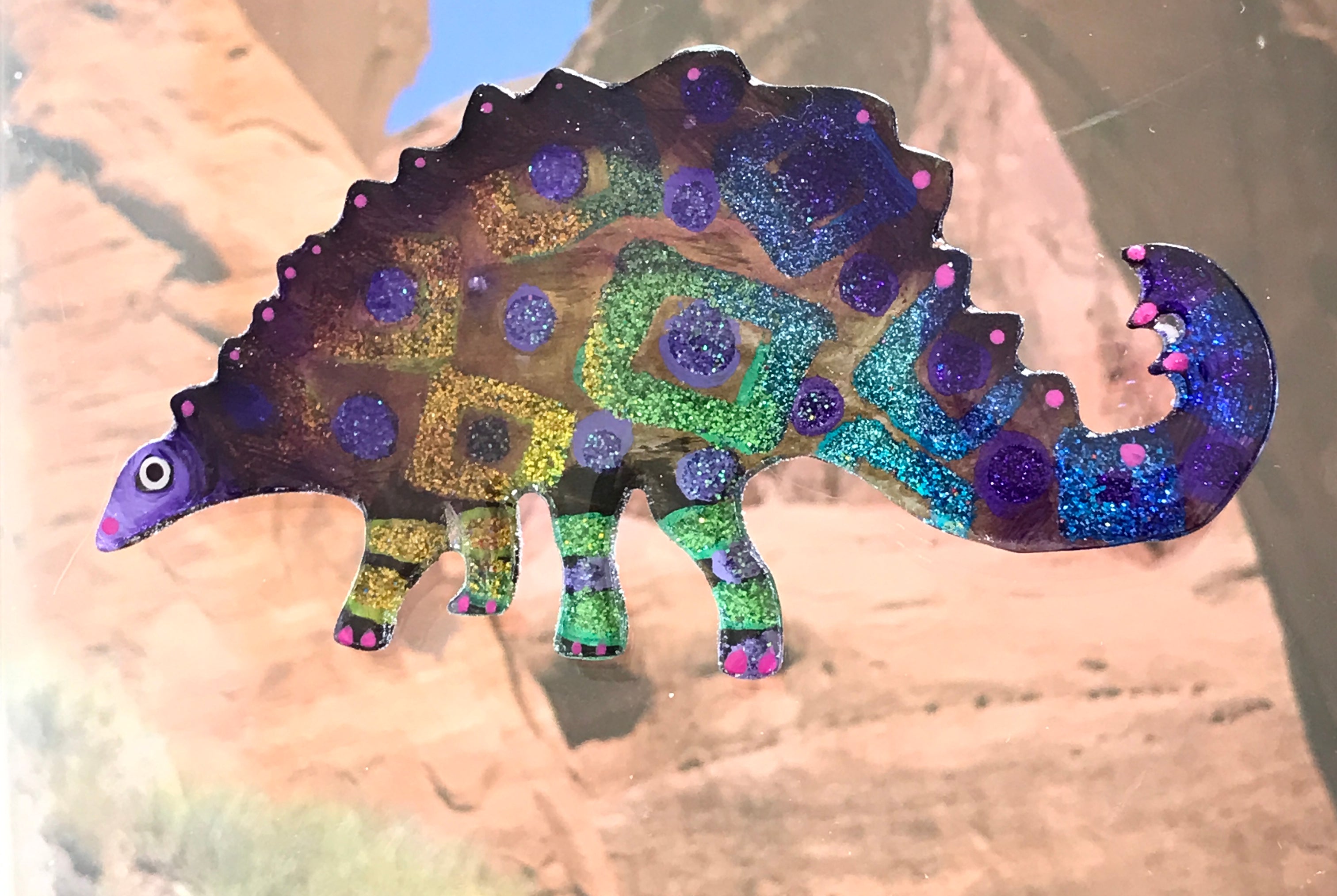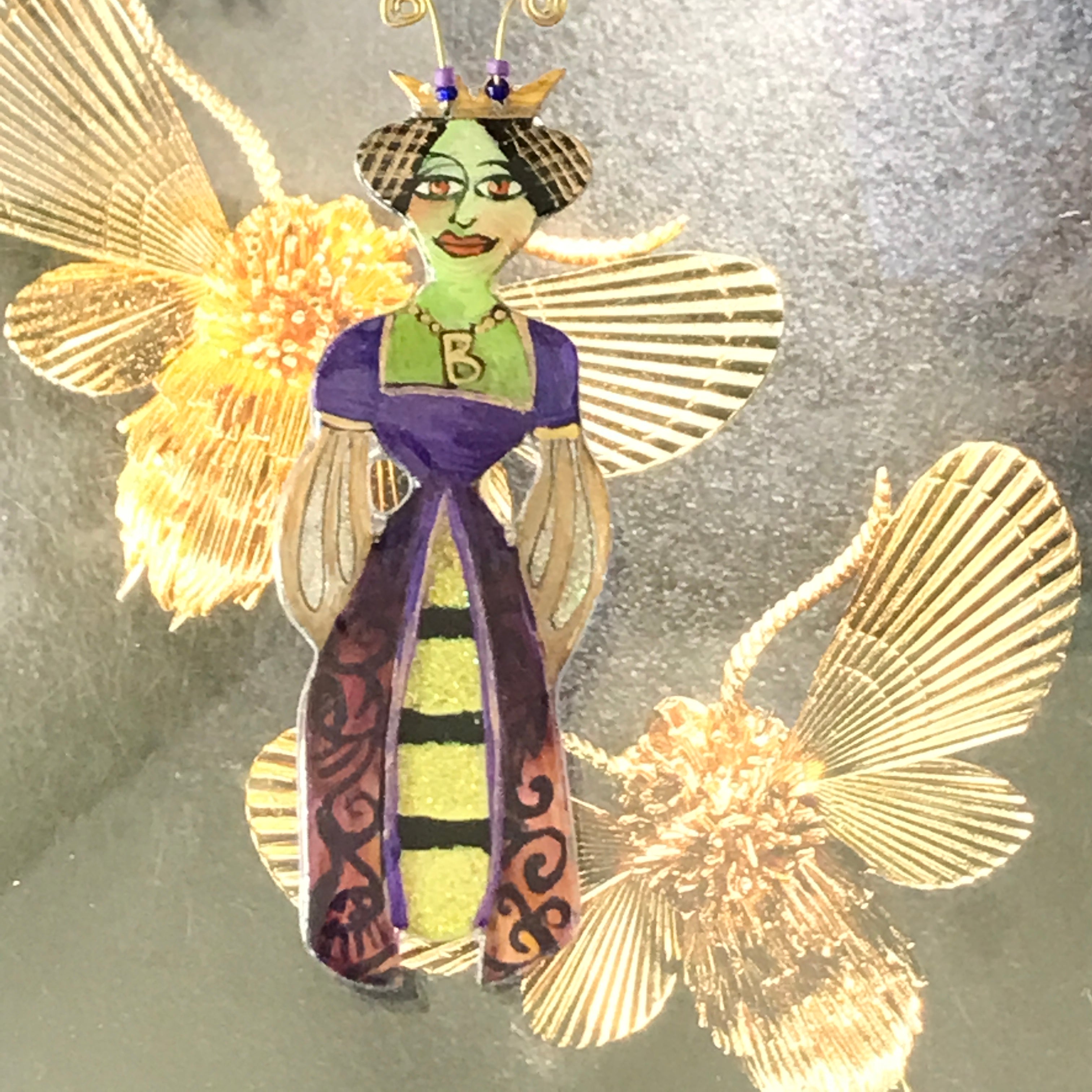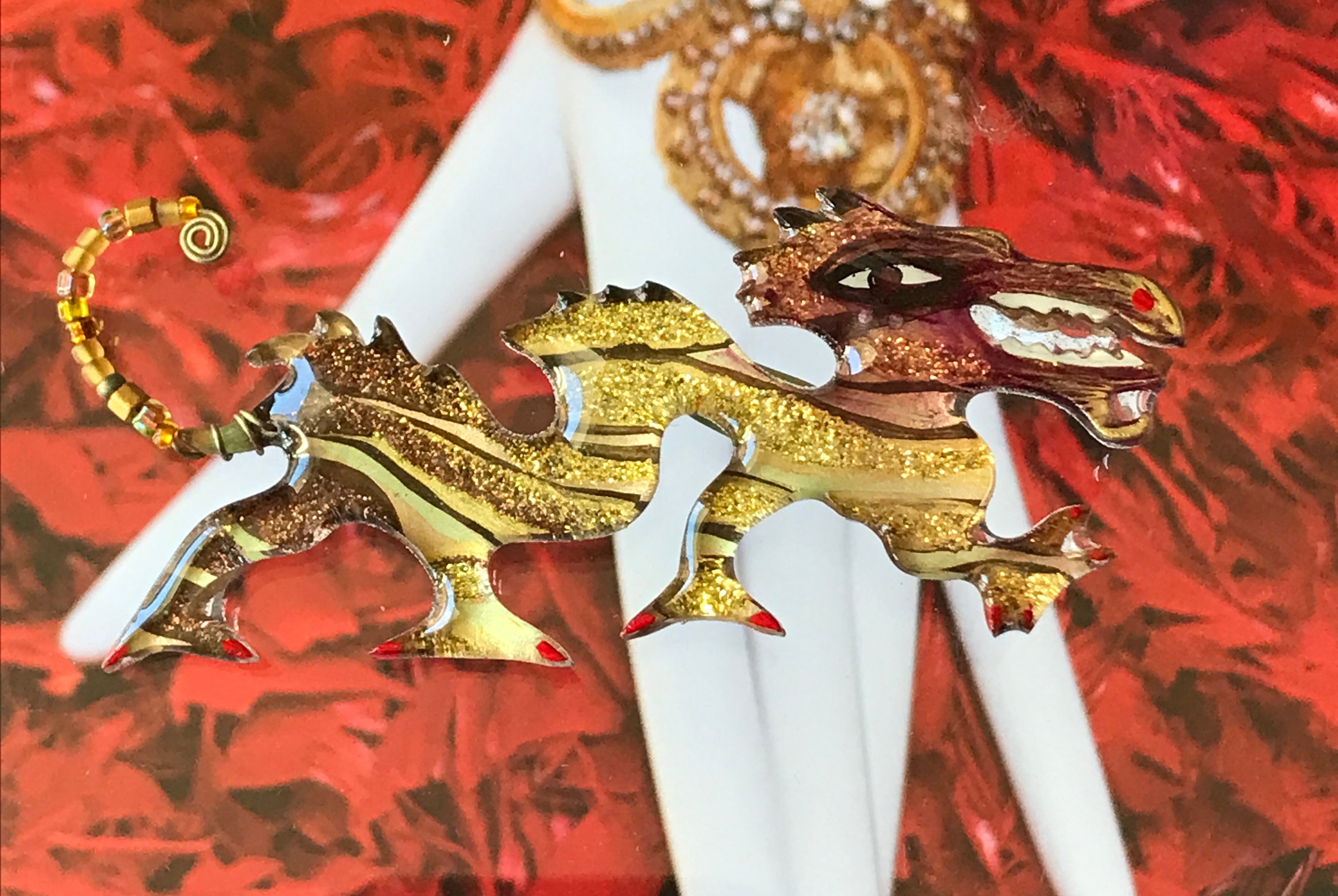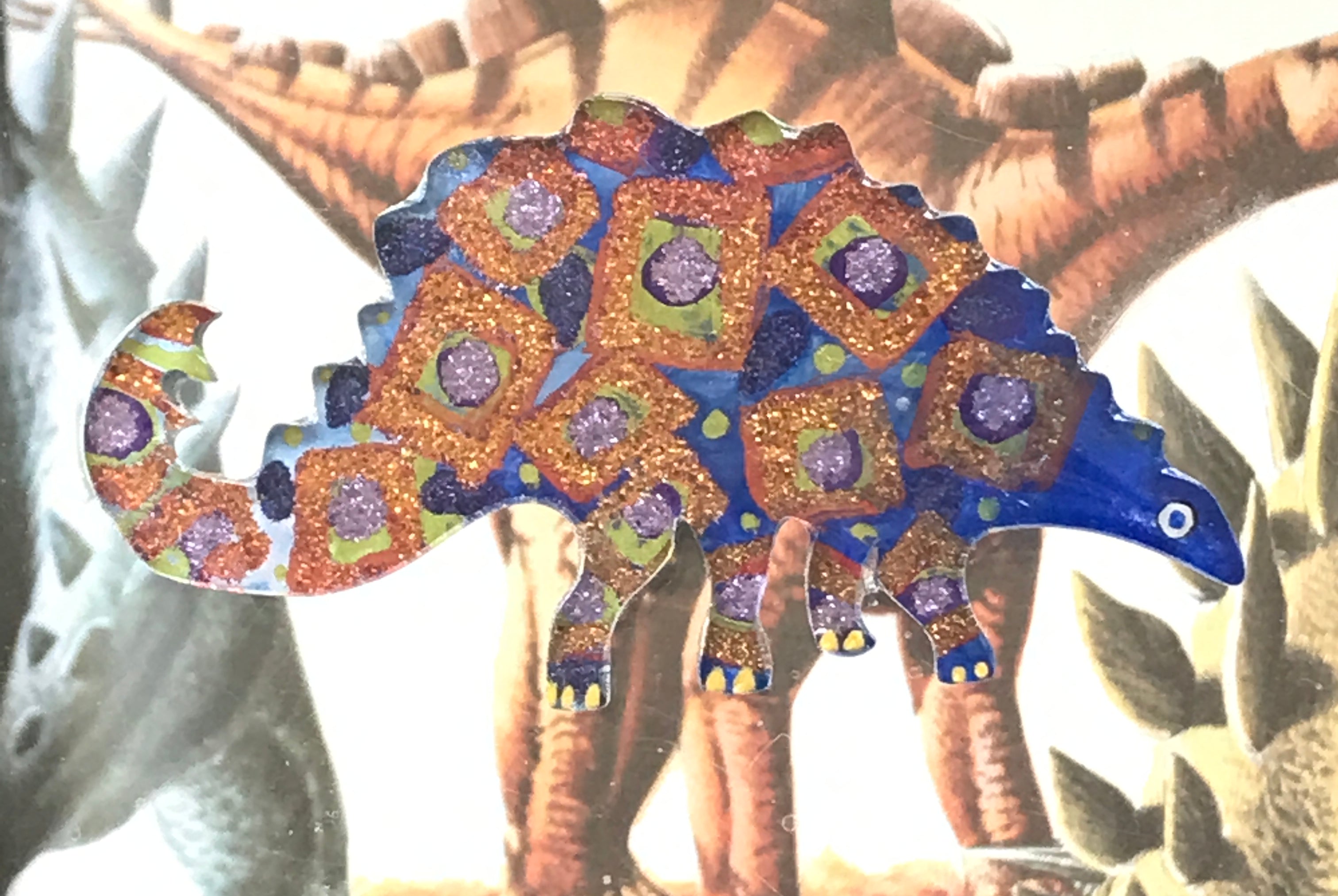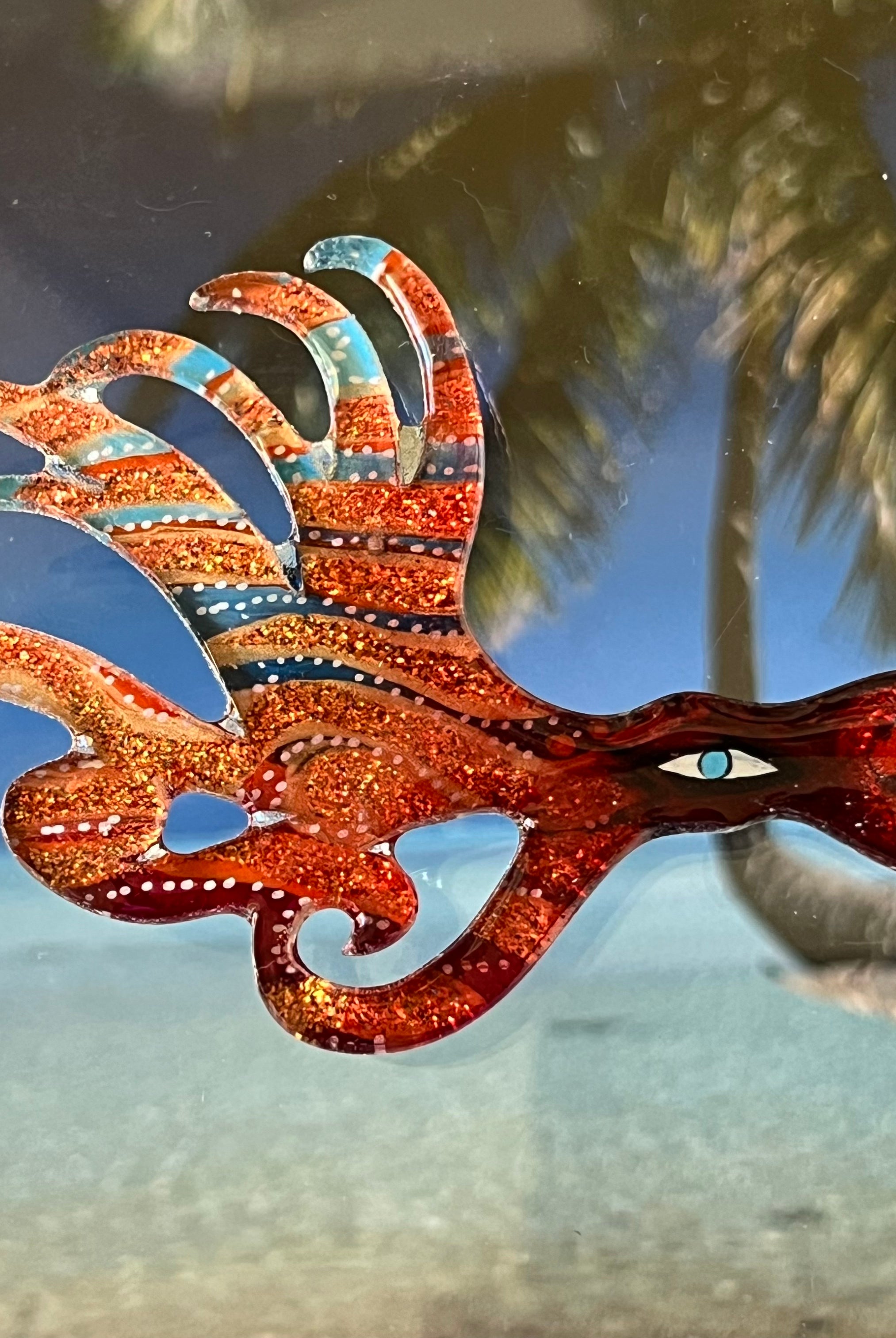 For me, these are little paintings that you can wear. If you are thinking of shrinky-dinks, I'm sure that was in my mind when I came up with lasercutting the shapes and then painting with the same paints I use on canvas. It's a multi layered process that takes a long time. The painting takes the longest, but it is the most rewarding. They are coated with a thick and sturdy glaze that brings out the depth and color.