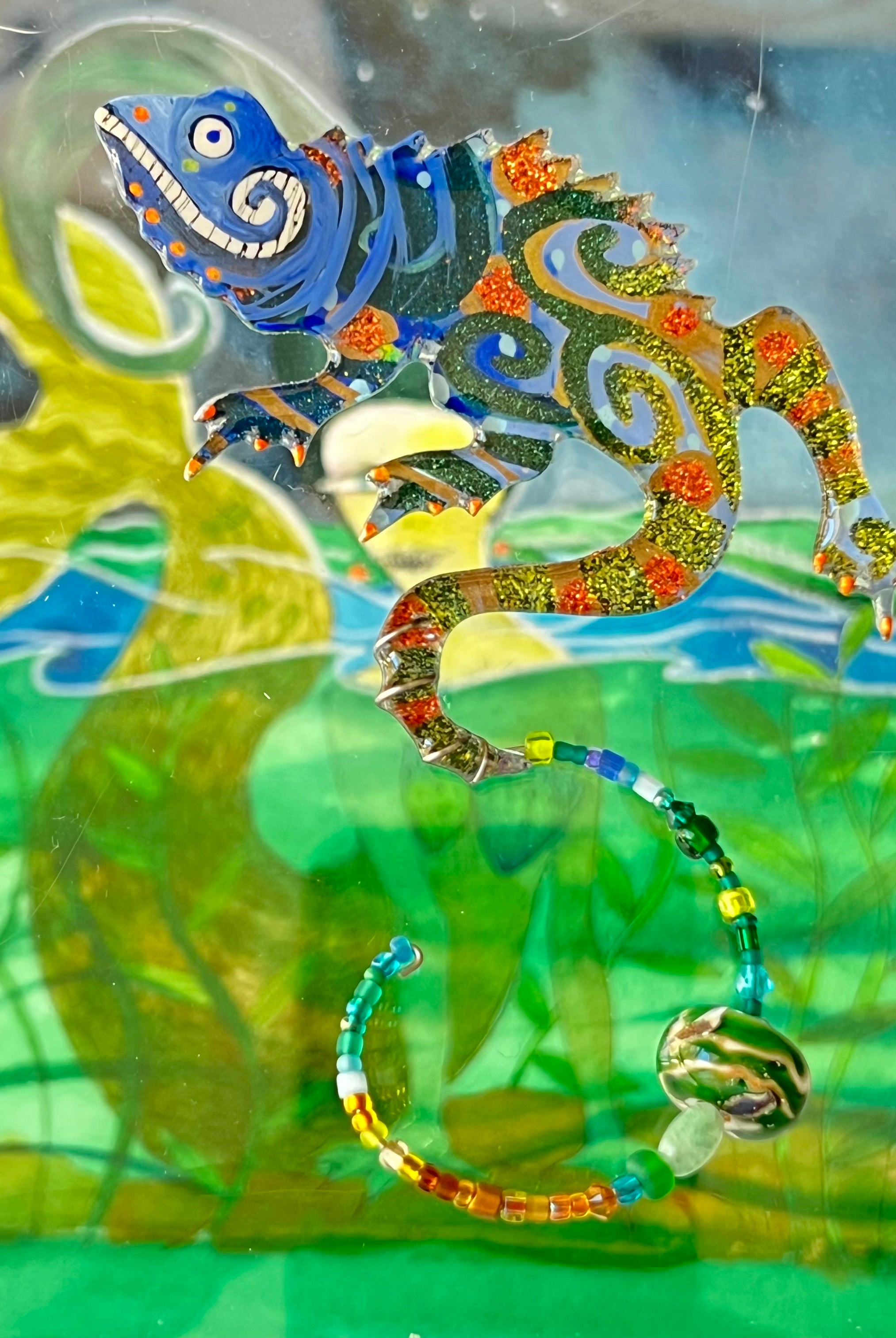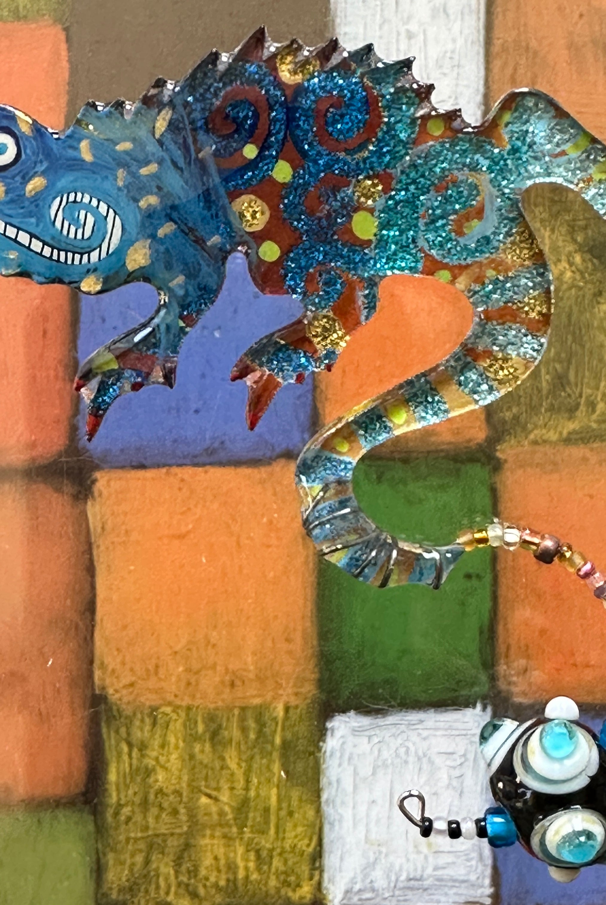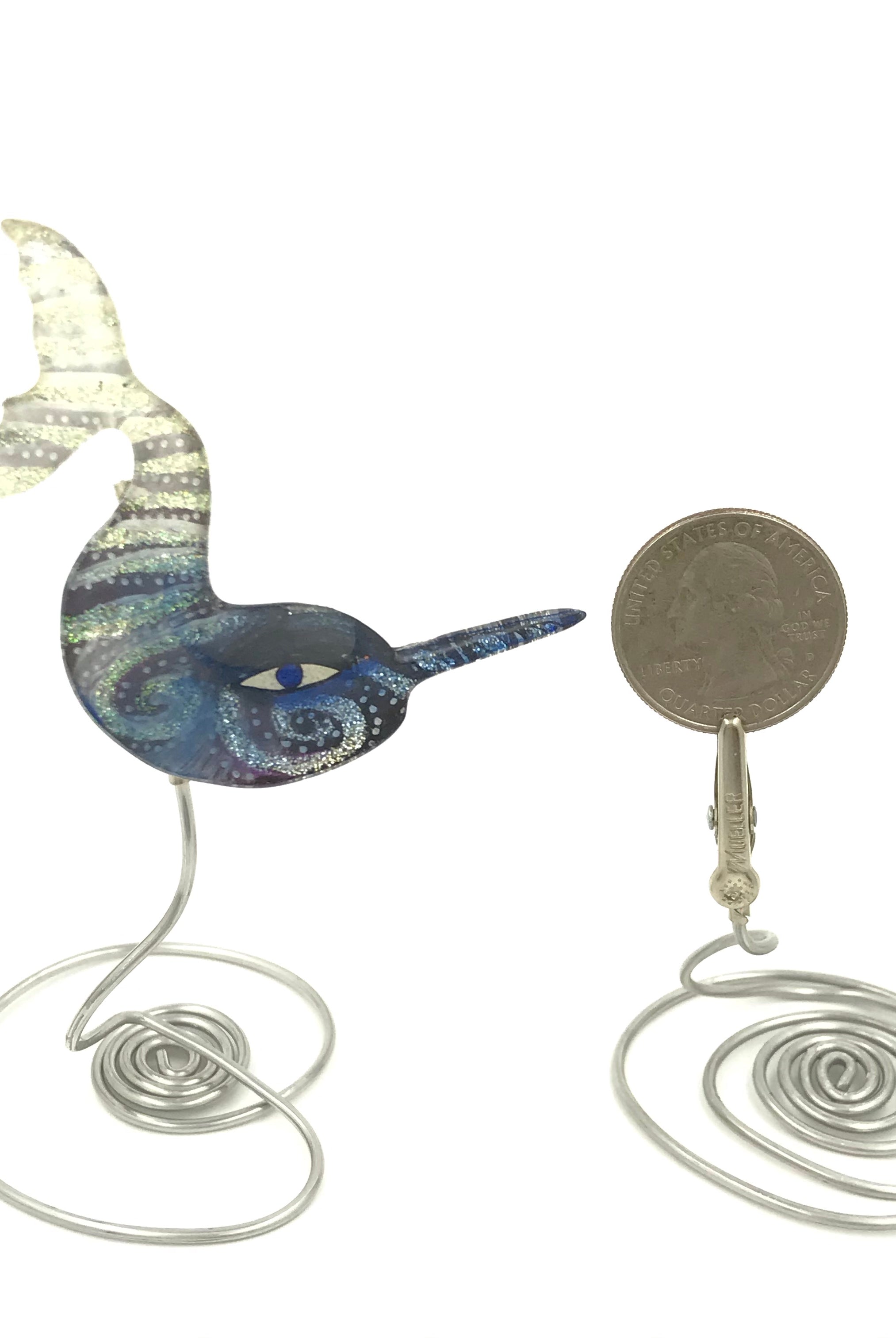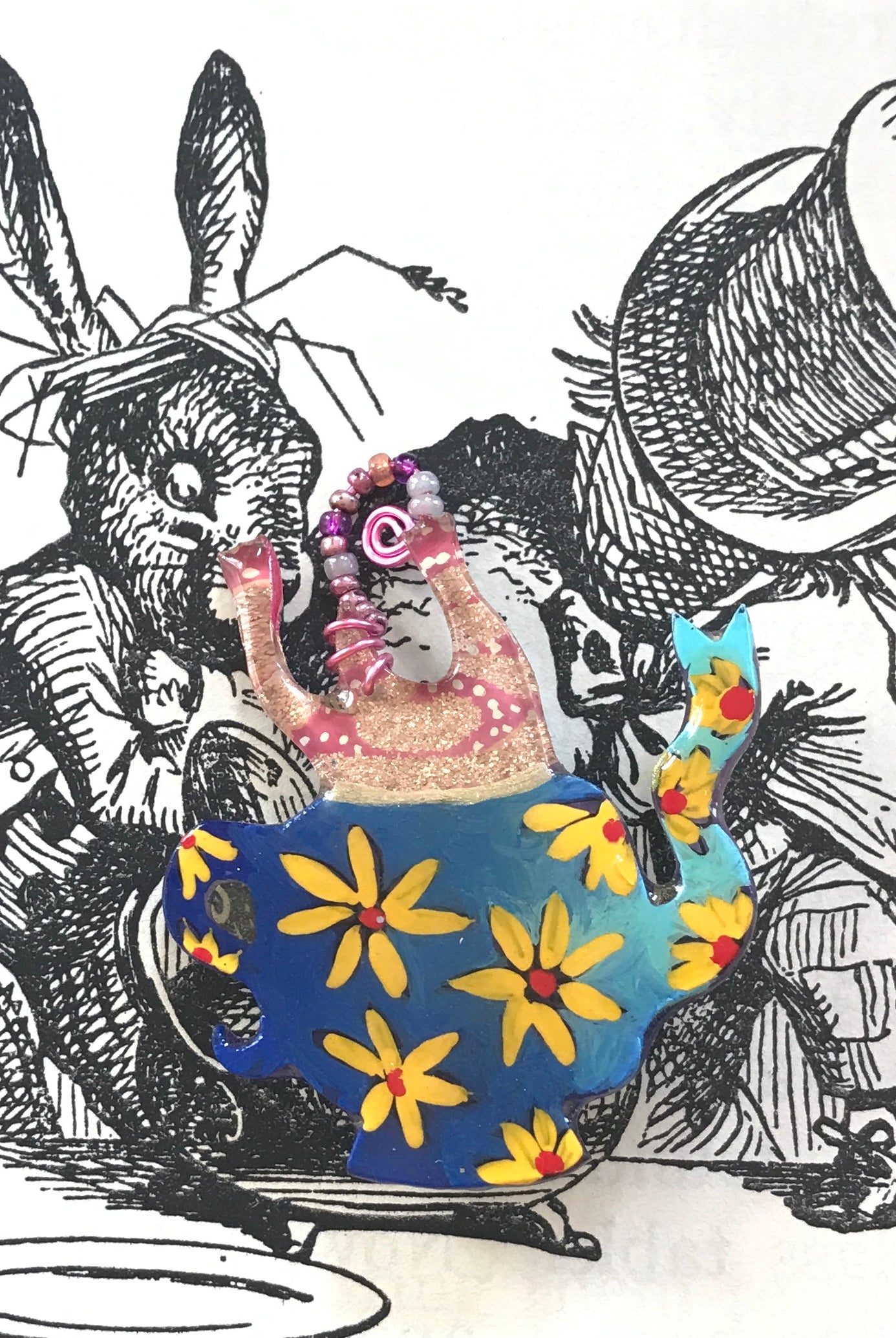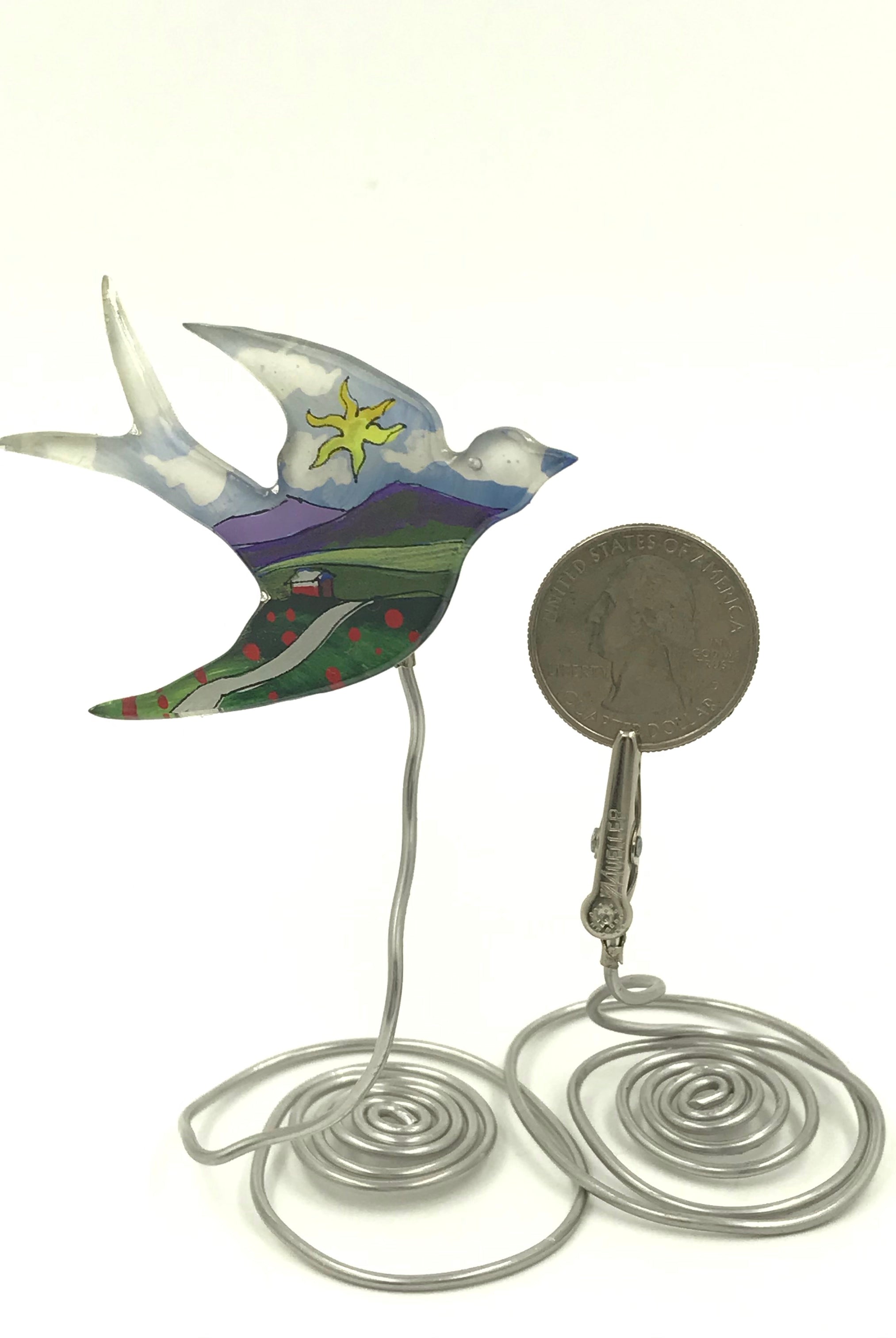 For me, these are little paintings that you can wear. If you are thinking of shrinky-dinks, I'm sure that was in my mind when I came up with lasercutting the shapes and then painting with the same paints I use on canvas. It's a multi layered process that takes a long time. The painting takes the longest, but it is the most rewarding. They are coated with a thick and sturdy glaze that brings out the depth and color.