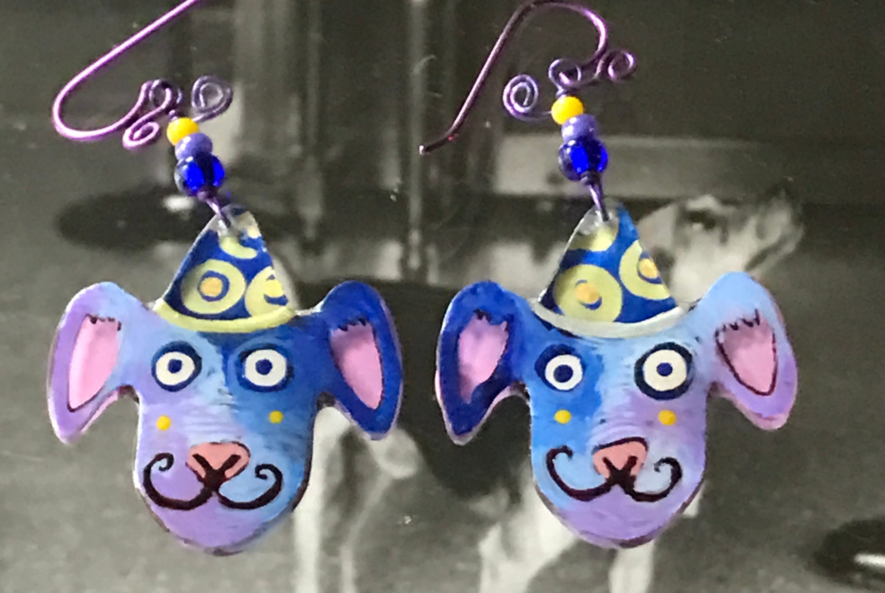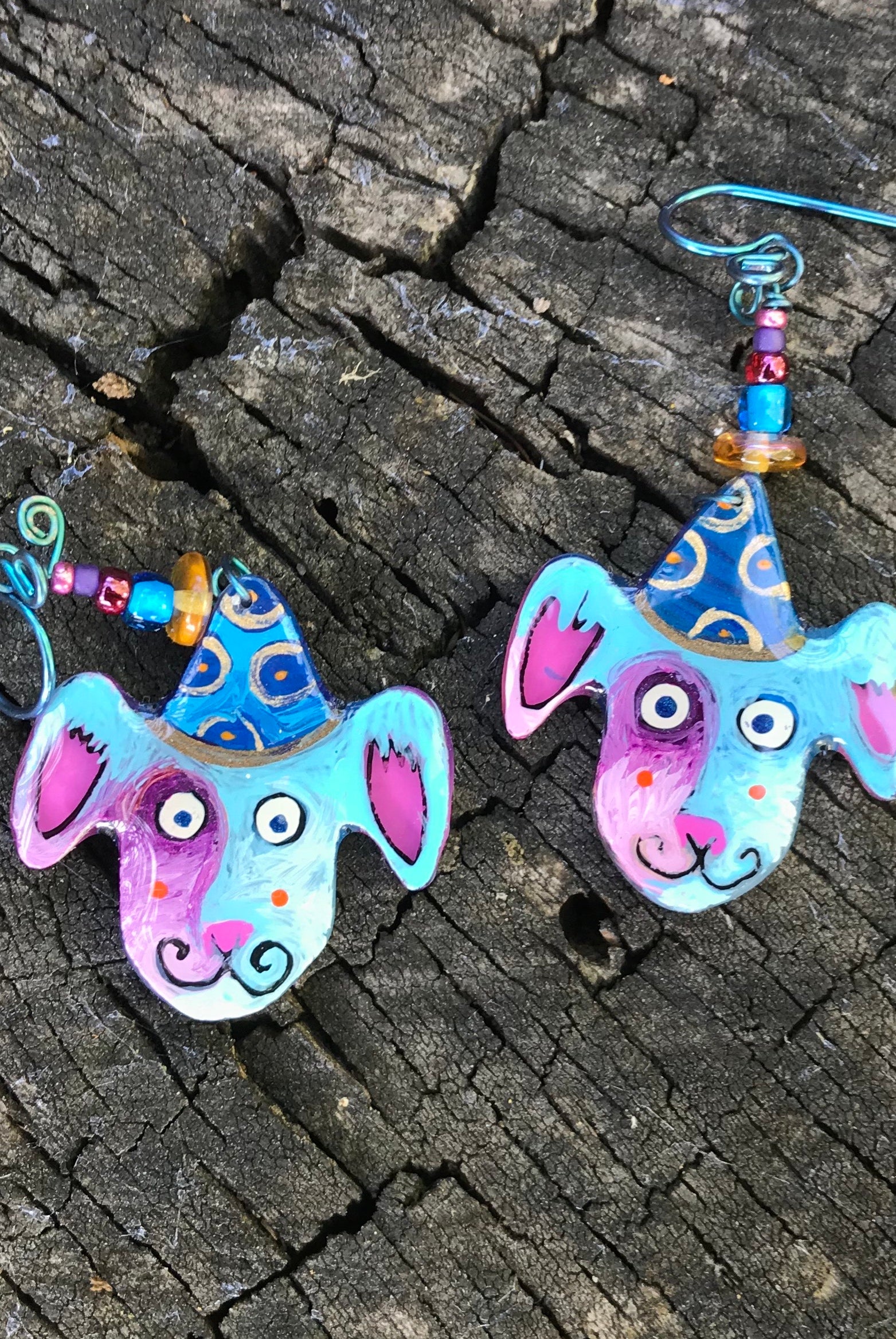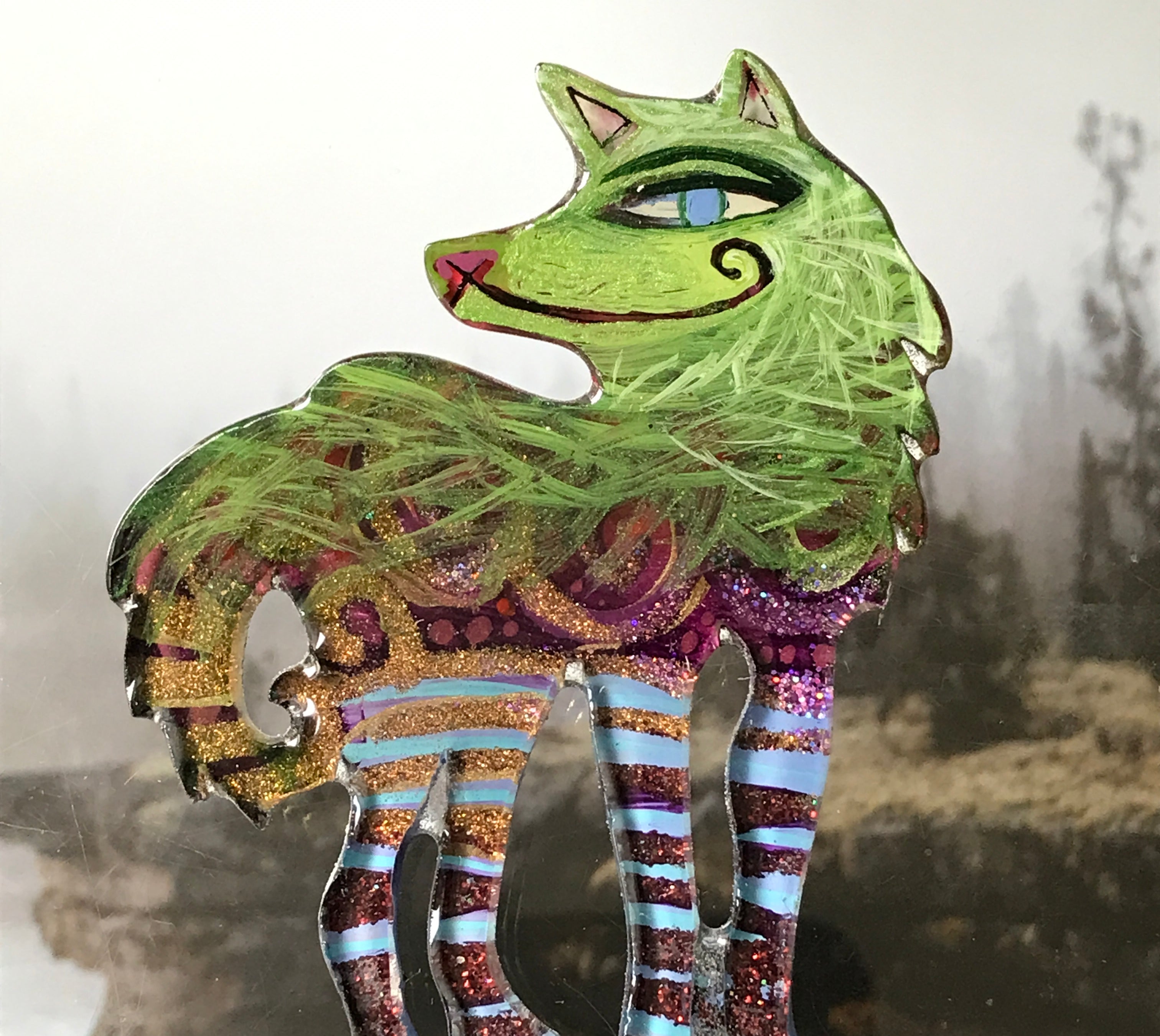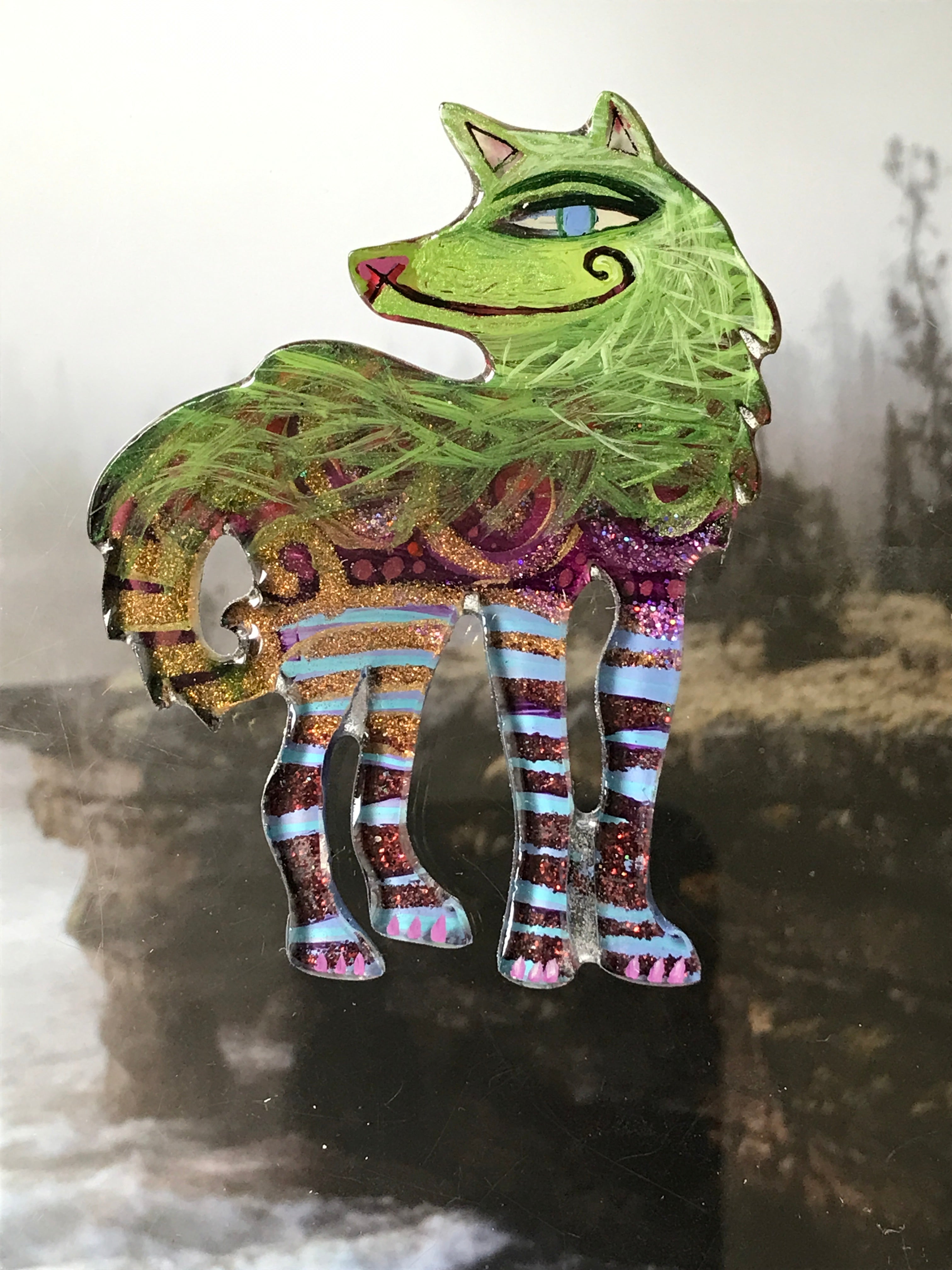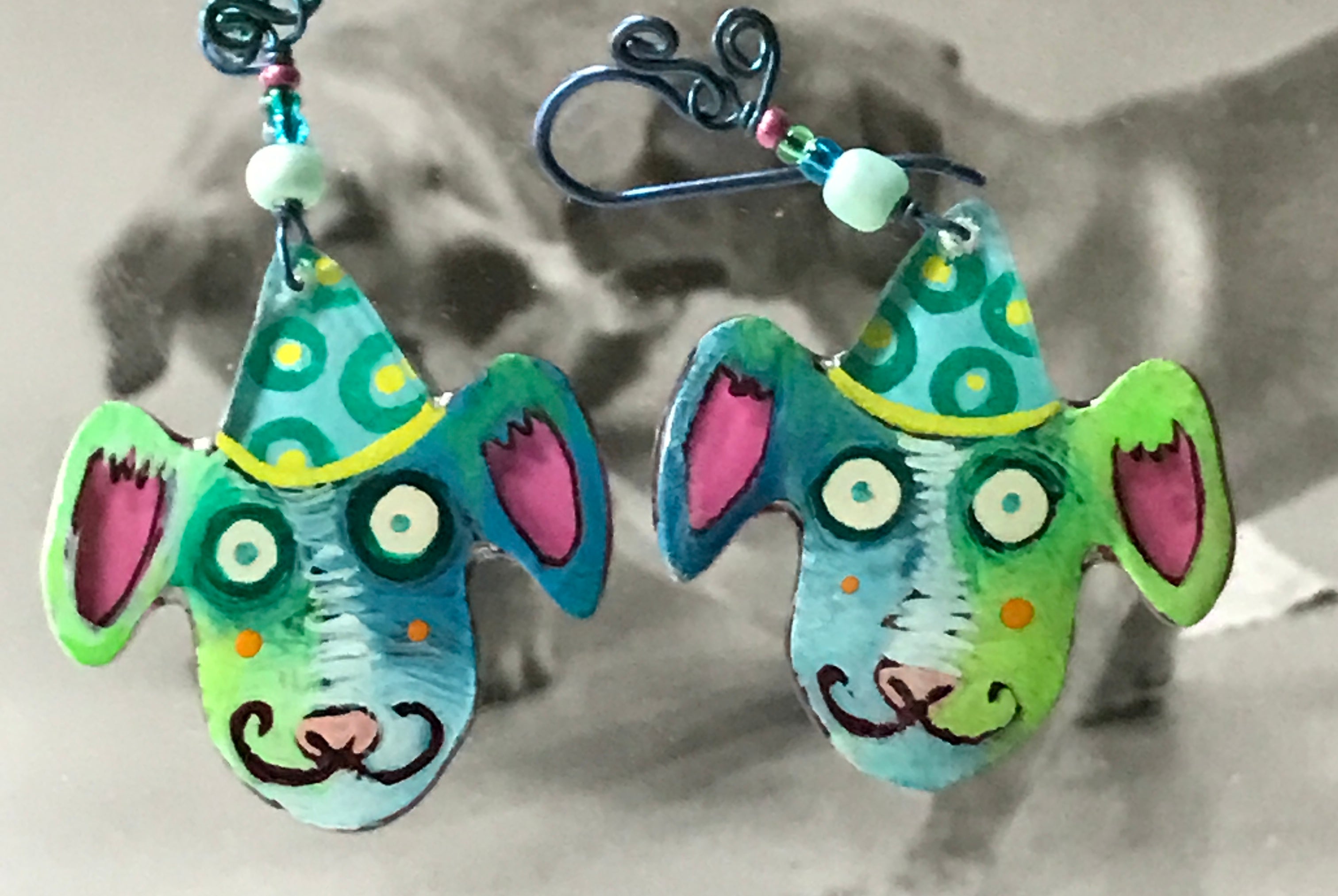For me, these are little paintings that you can wear. If you are thinking of shrinky-dinks, I'm sure that was in my mind when I came up with lasercutting the shapes and then painting with the same paints I use on canvas. It's a multi layered process that takes a long time. The painting takes the longest, but it is the most rewarding. They are coated with a thick and sturdy glaze that brings out the depth and color.