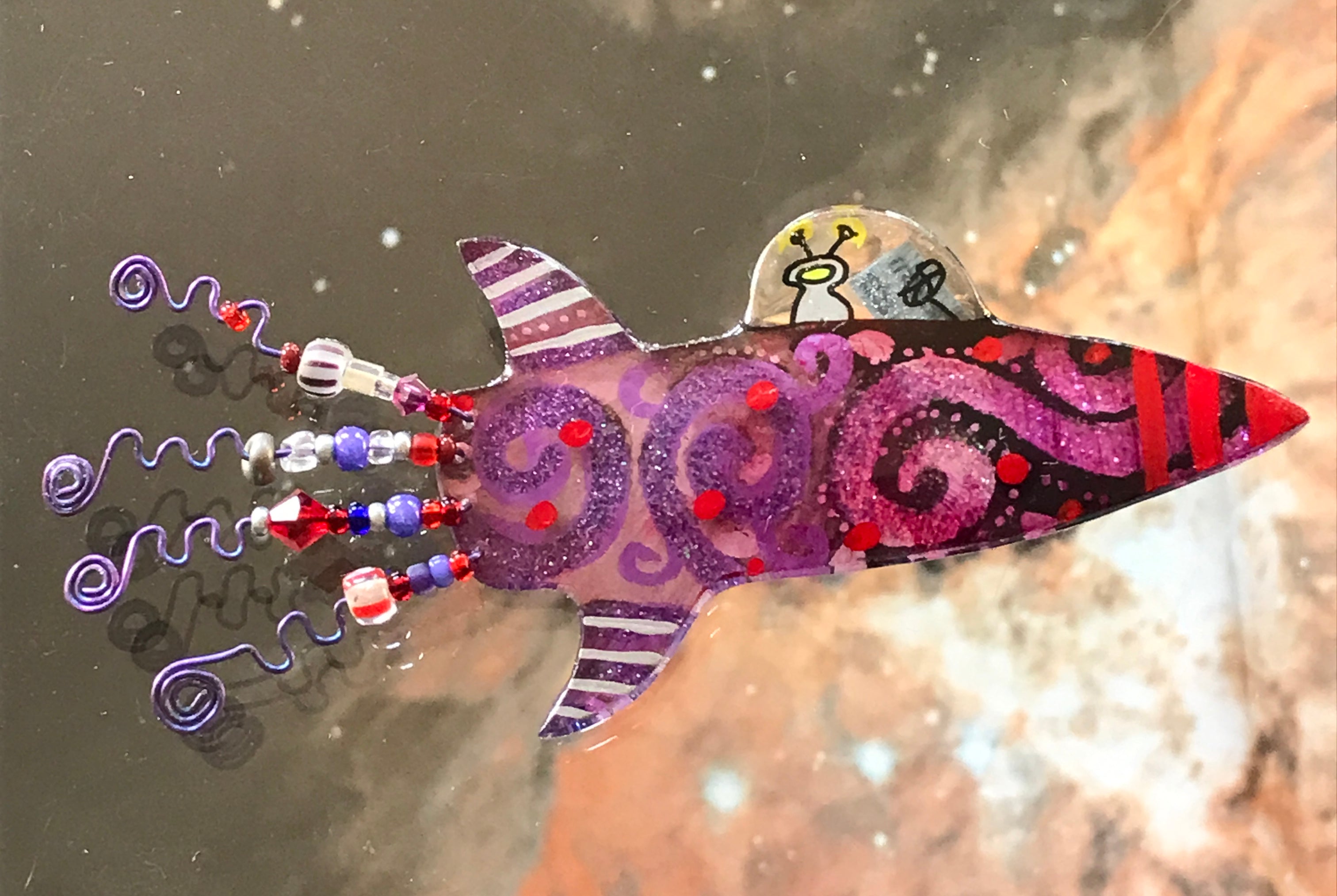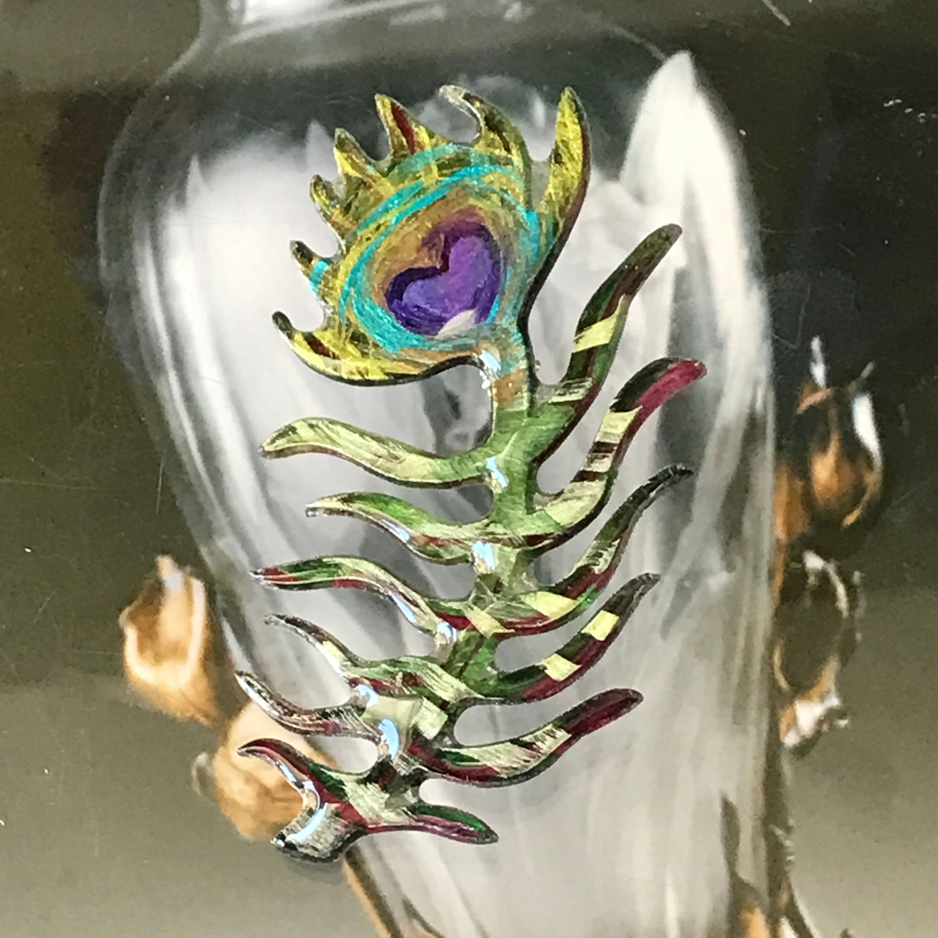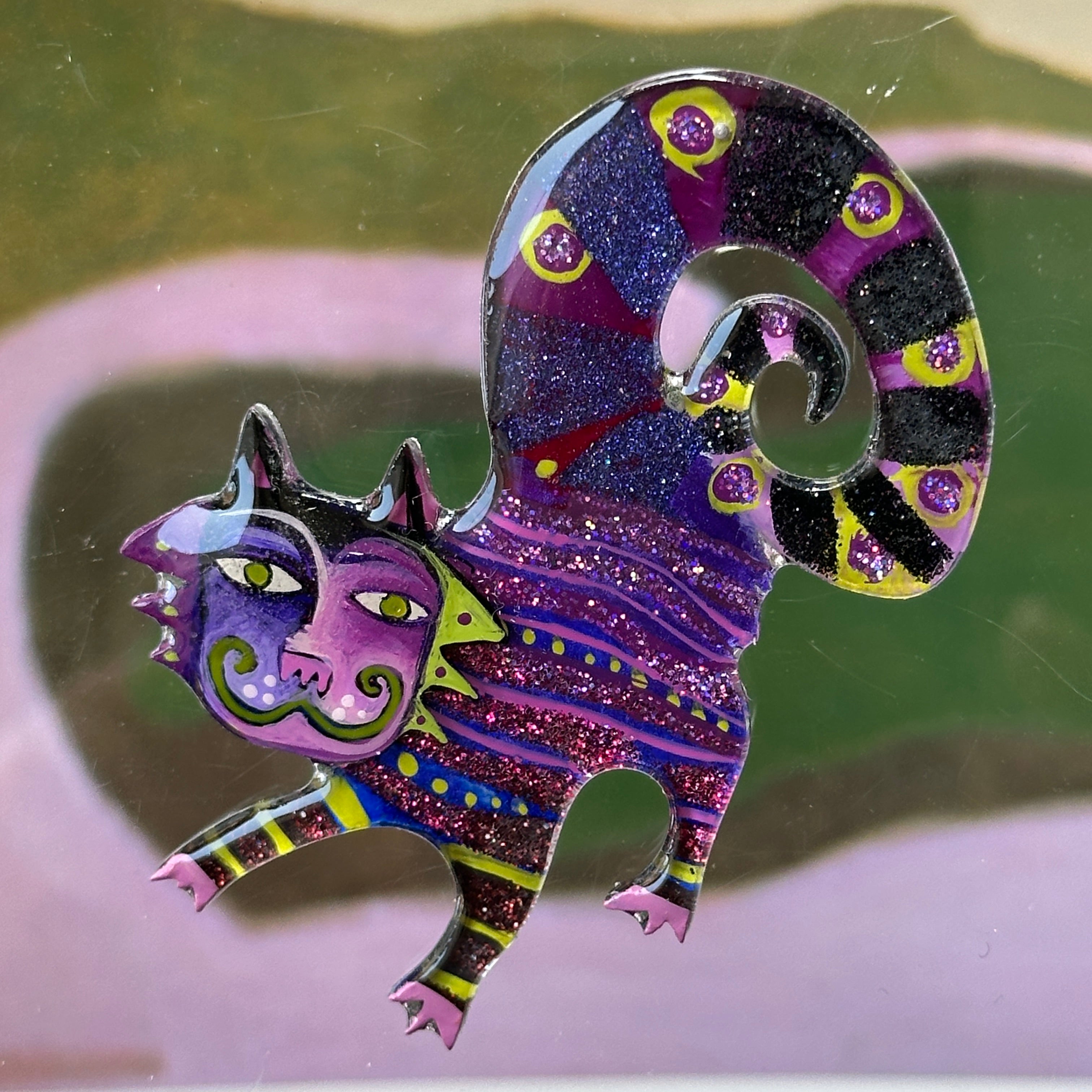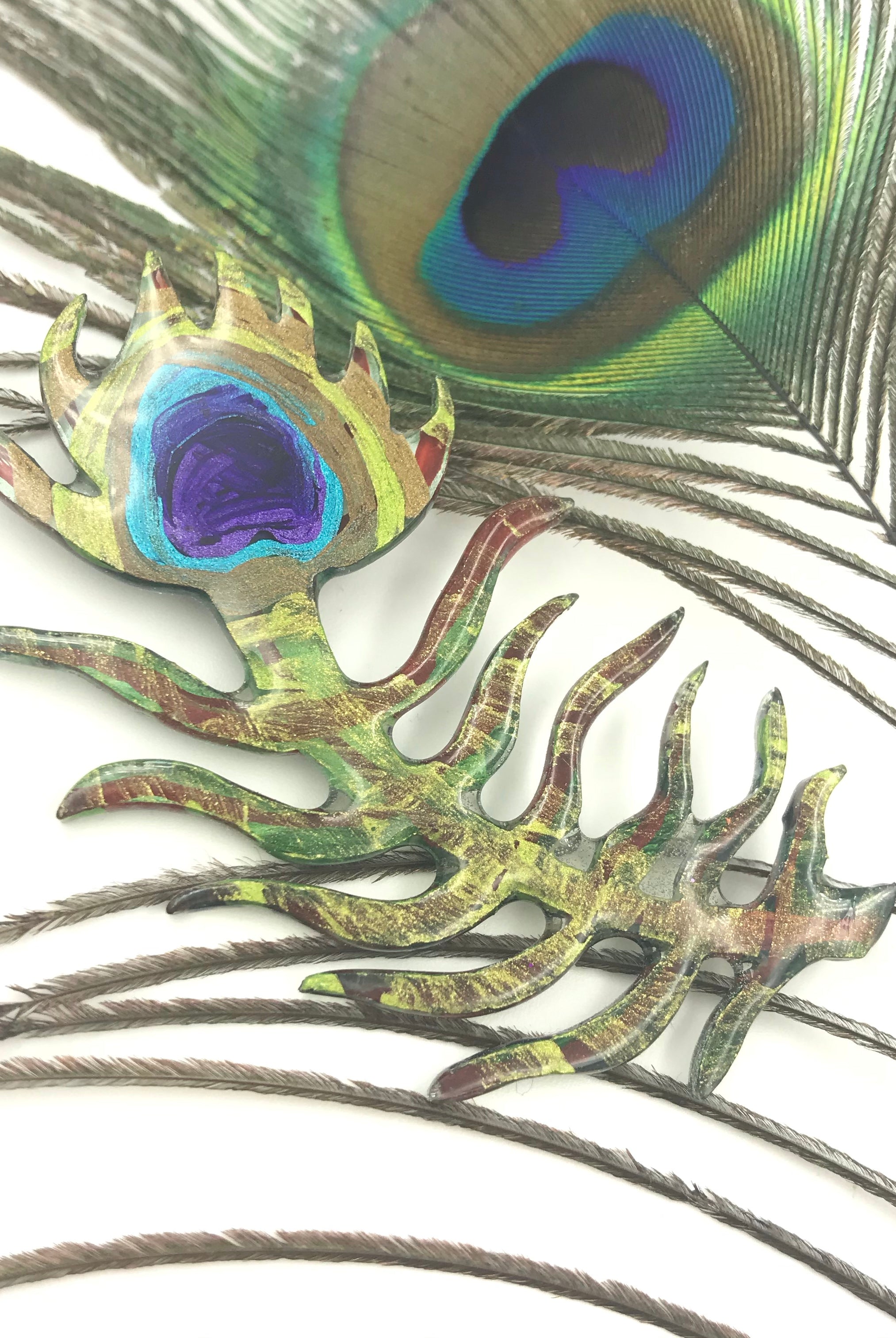 For me, these are little paintings that you can wear. If you are thinking of shrinky-dinks, I'm sure that was in my mind when I came up with lasercutting the shapes and then painting with the same paints I use on canvas. It's a multi layered process that takes a long time. The painting takes the longest, but it is the most rewarding. They are coated with a thick and sturdy glaze that brings out the depth and color.