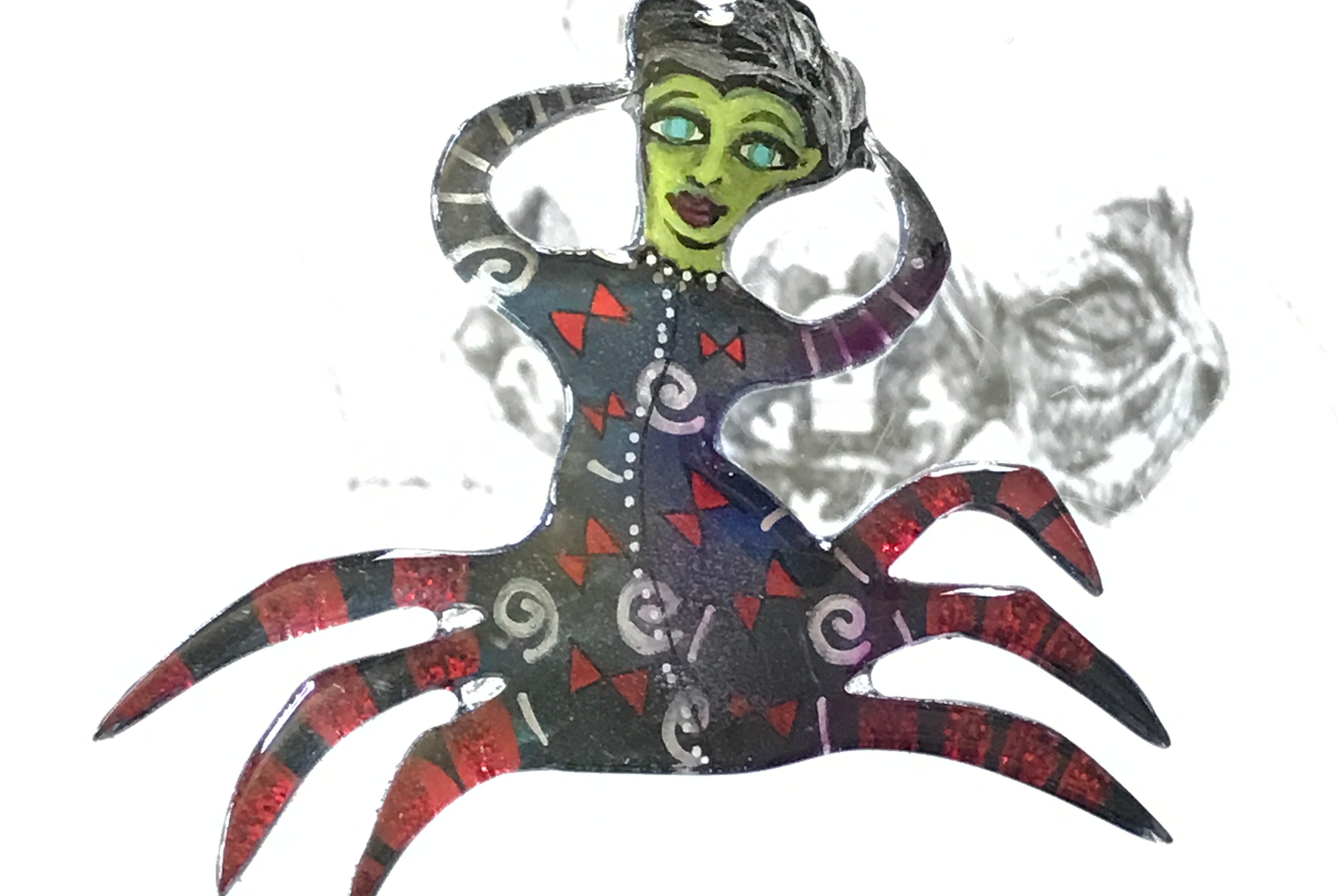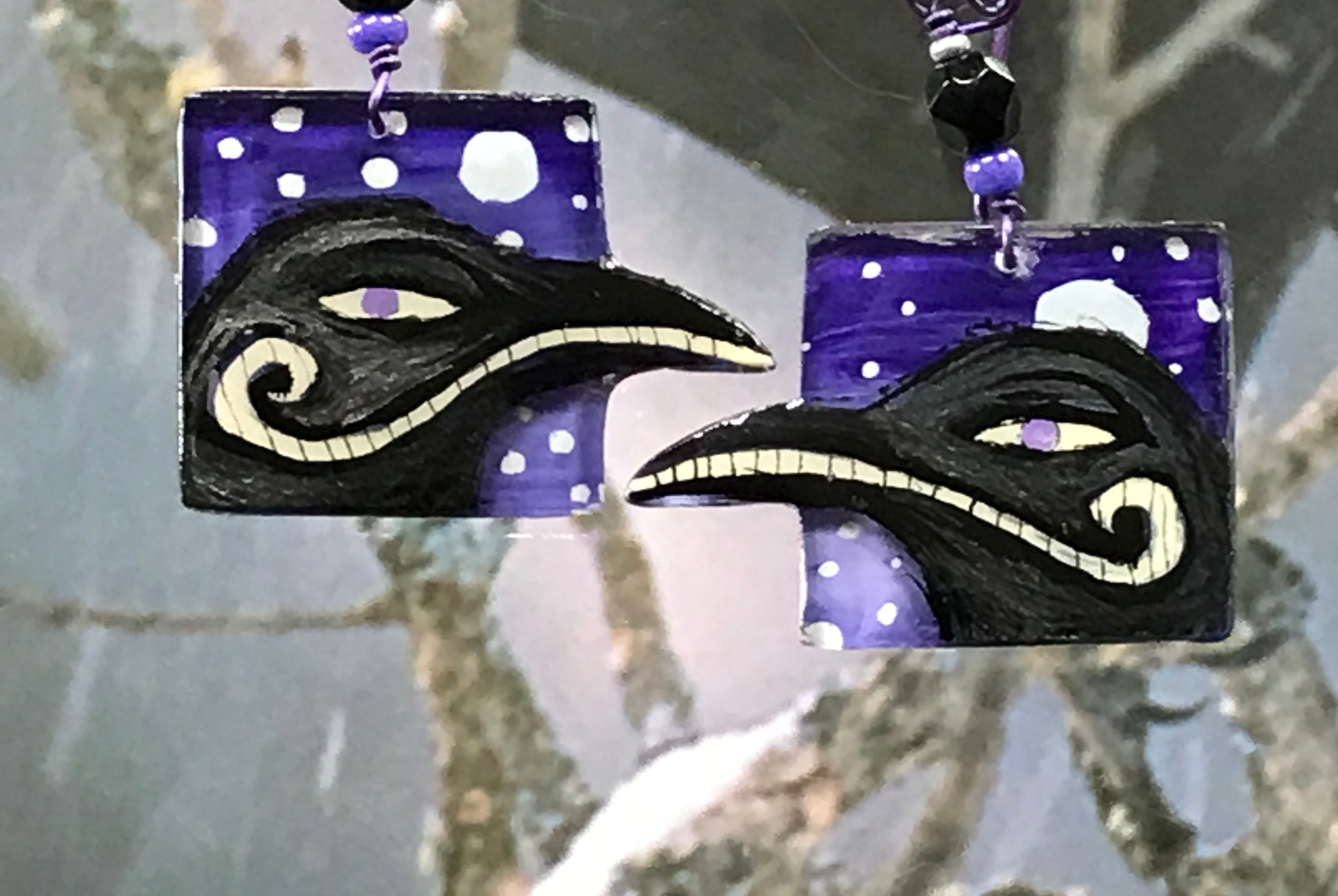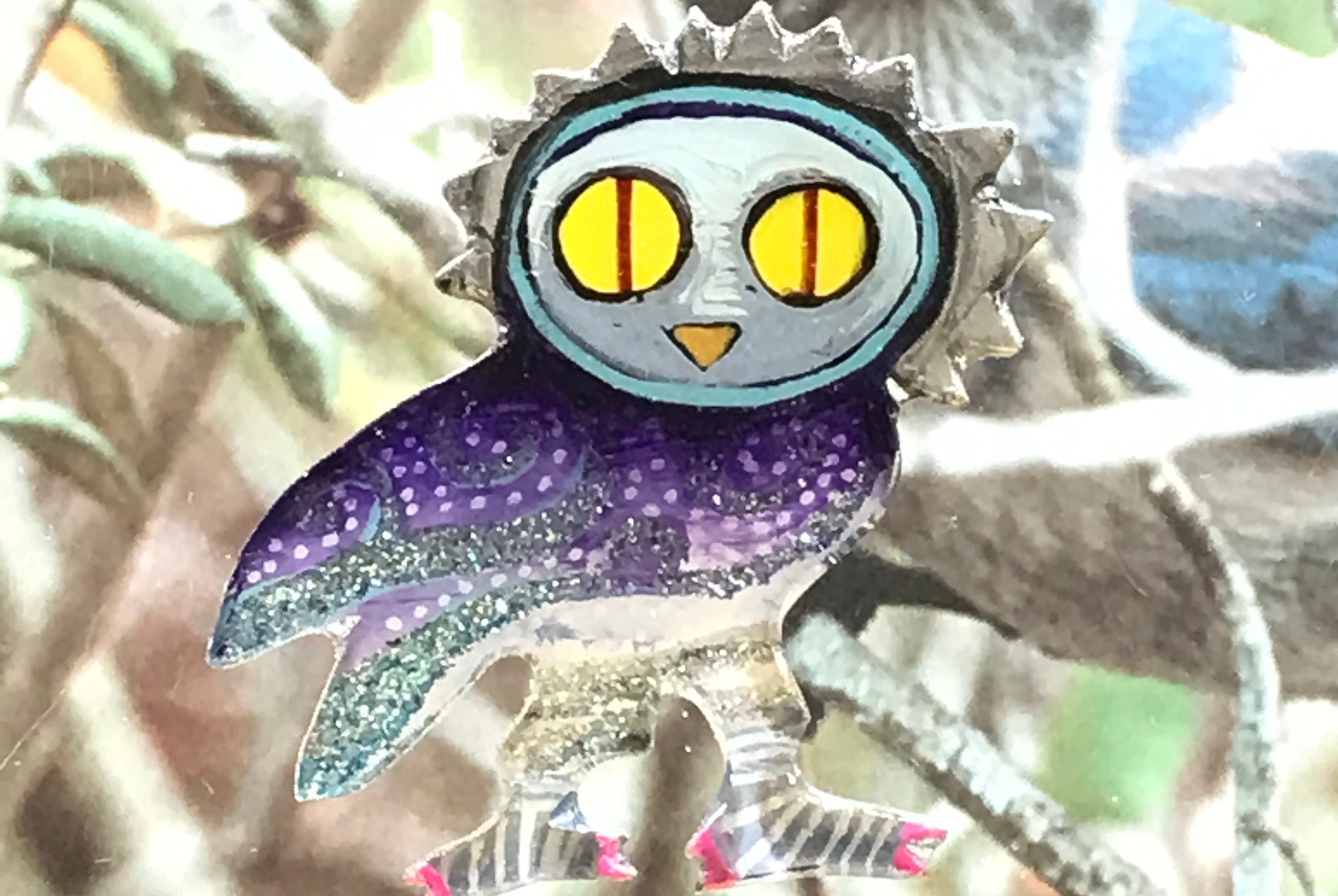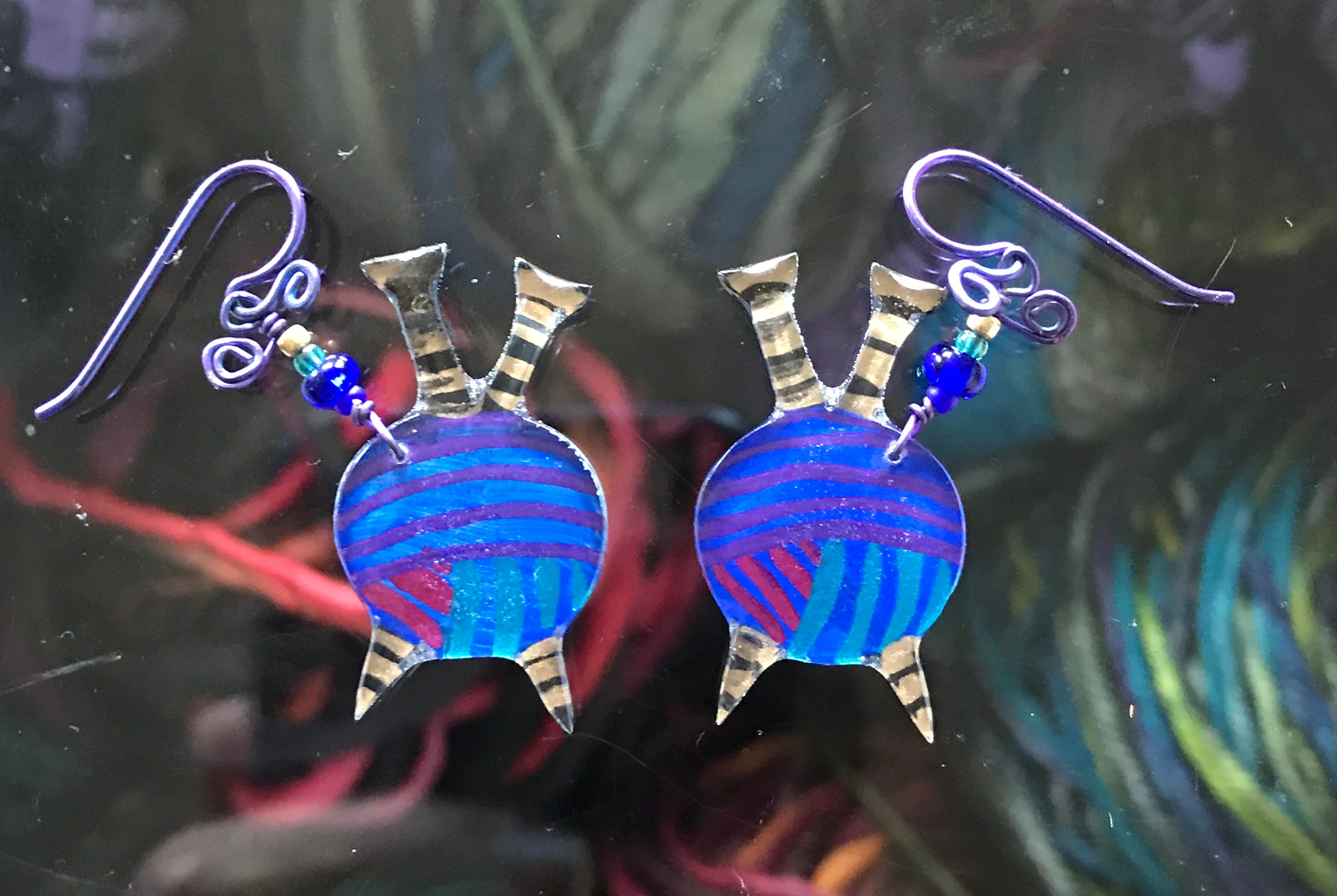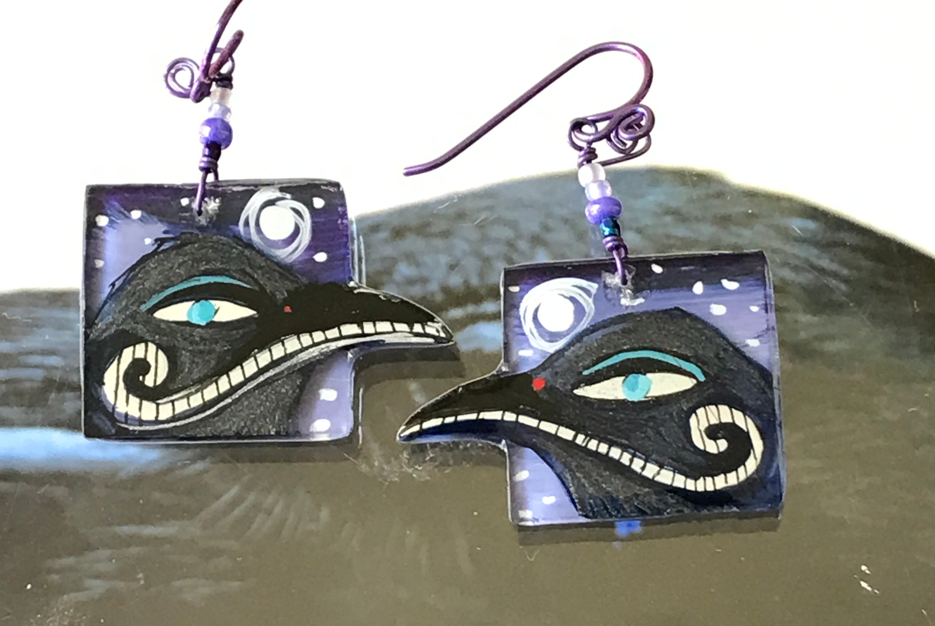 For me, these are little paintings that you can wear. If you are thinking of shrinky-dinks, I'm sure that was in my mind when I came up with lasercutting the shapes and then painting with the same paints I use on canvas. It's a multi layered process that takes a long time. The painting takes the longest, but it is the most rewarding. They are coated with a thick and sturdy glaze that brings out the depth and color.