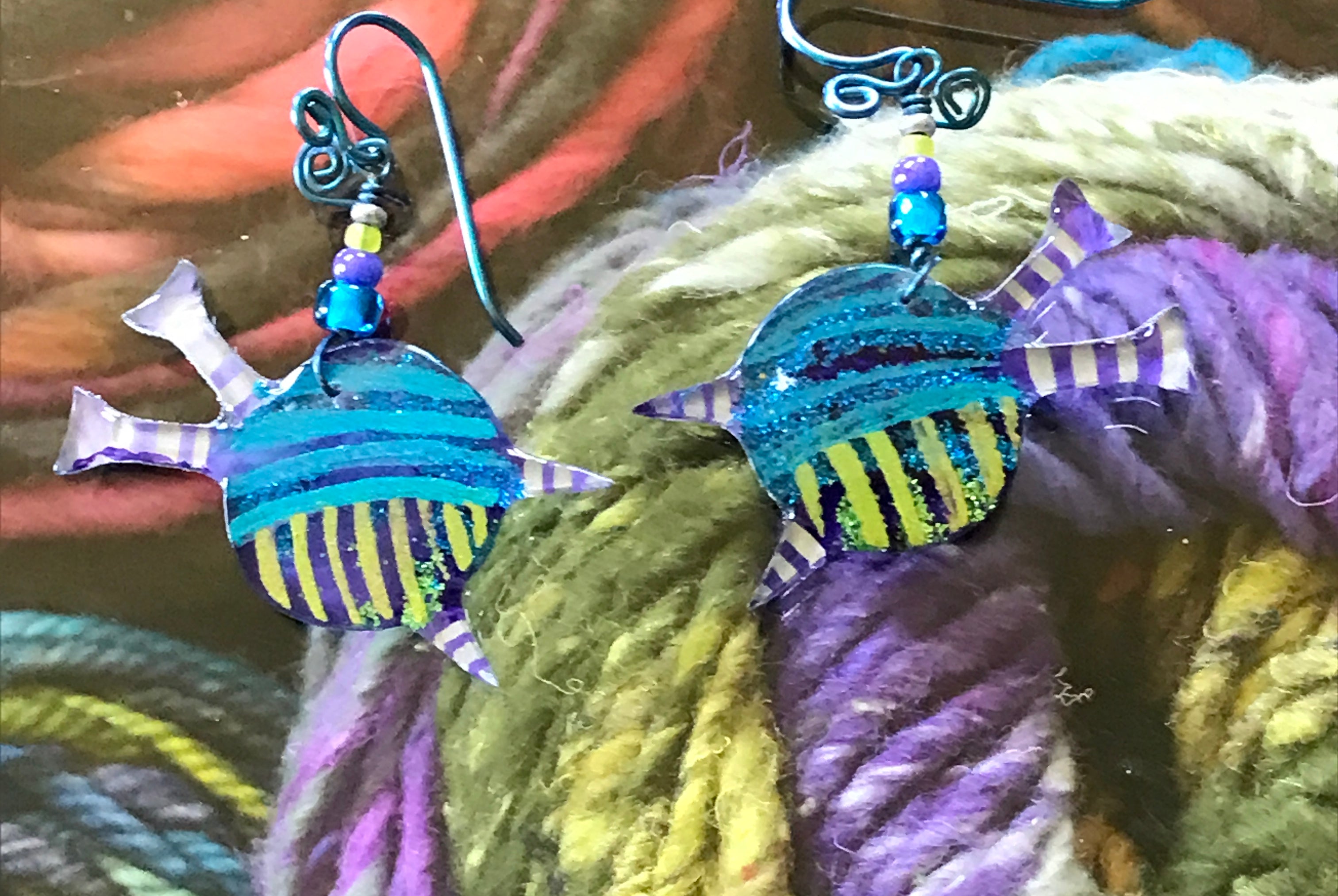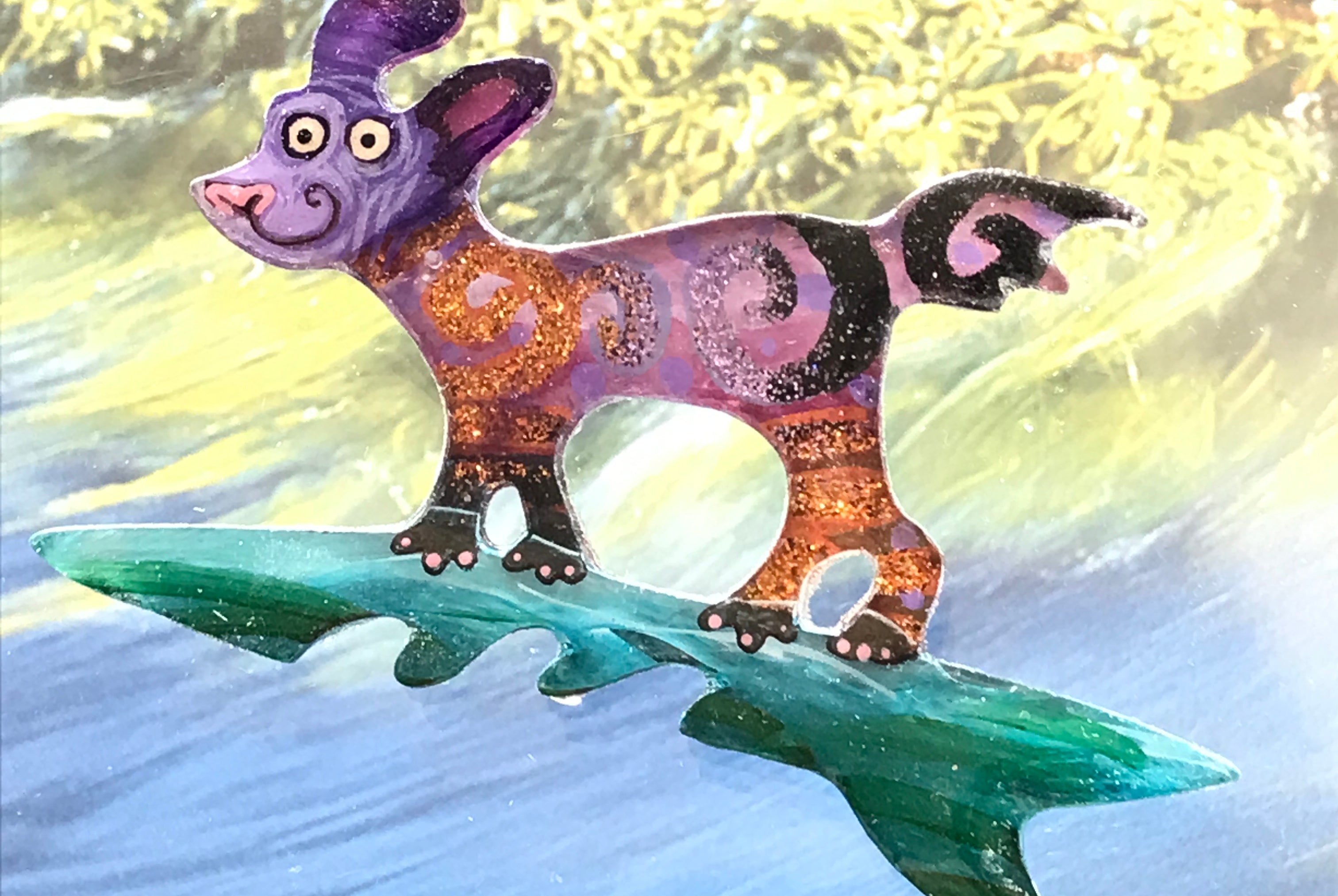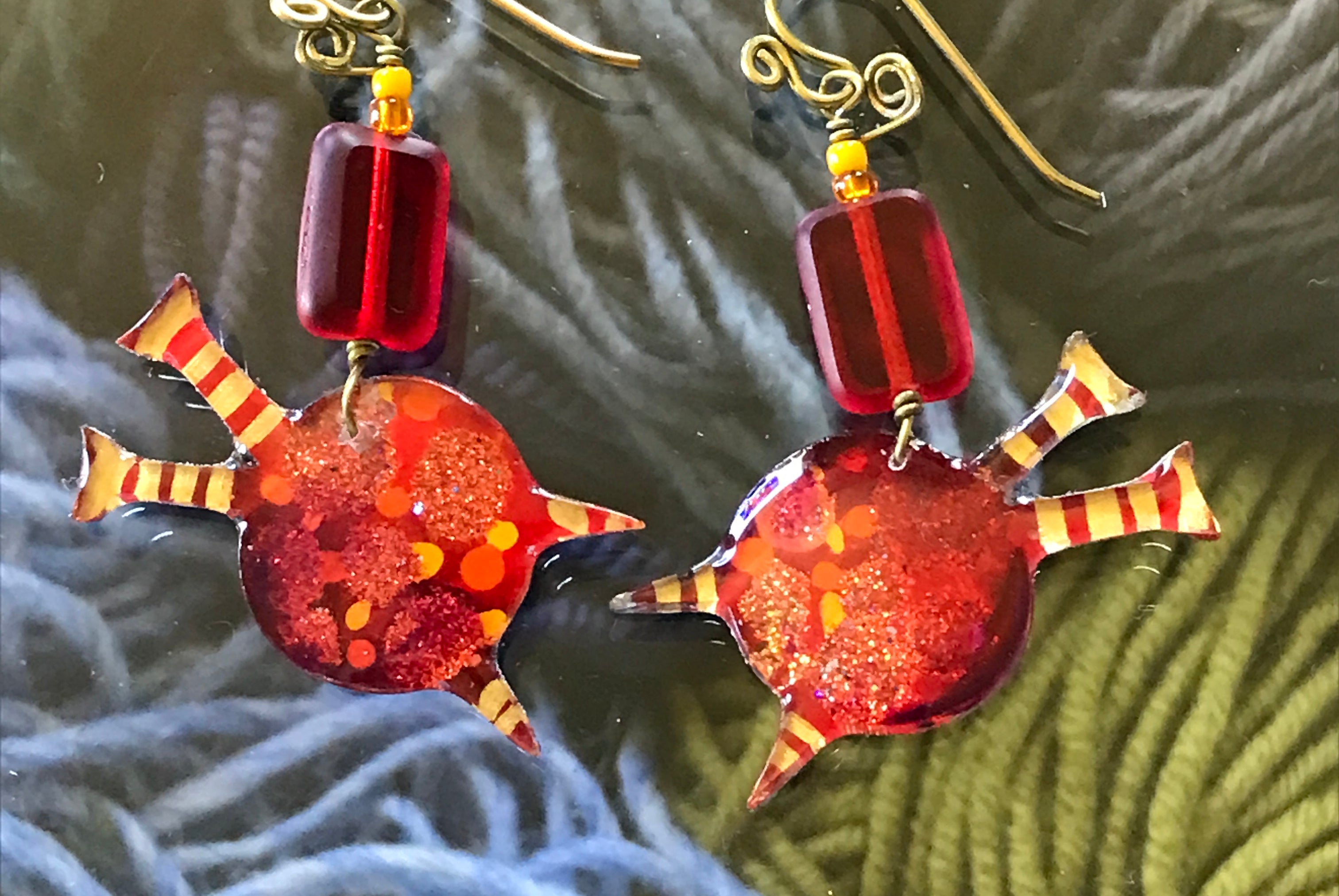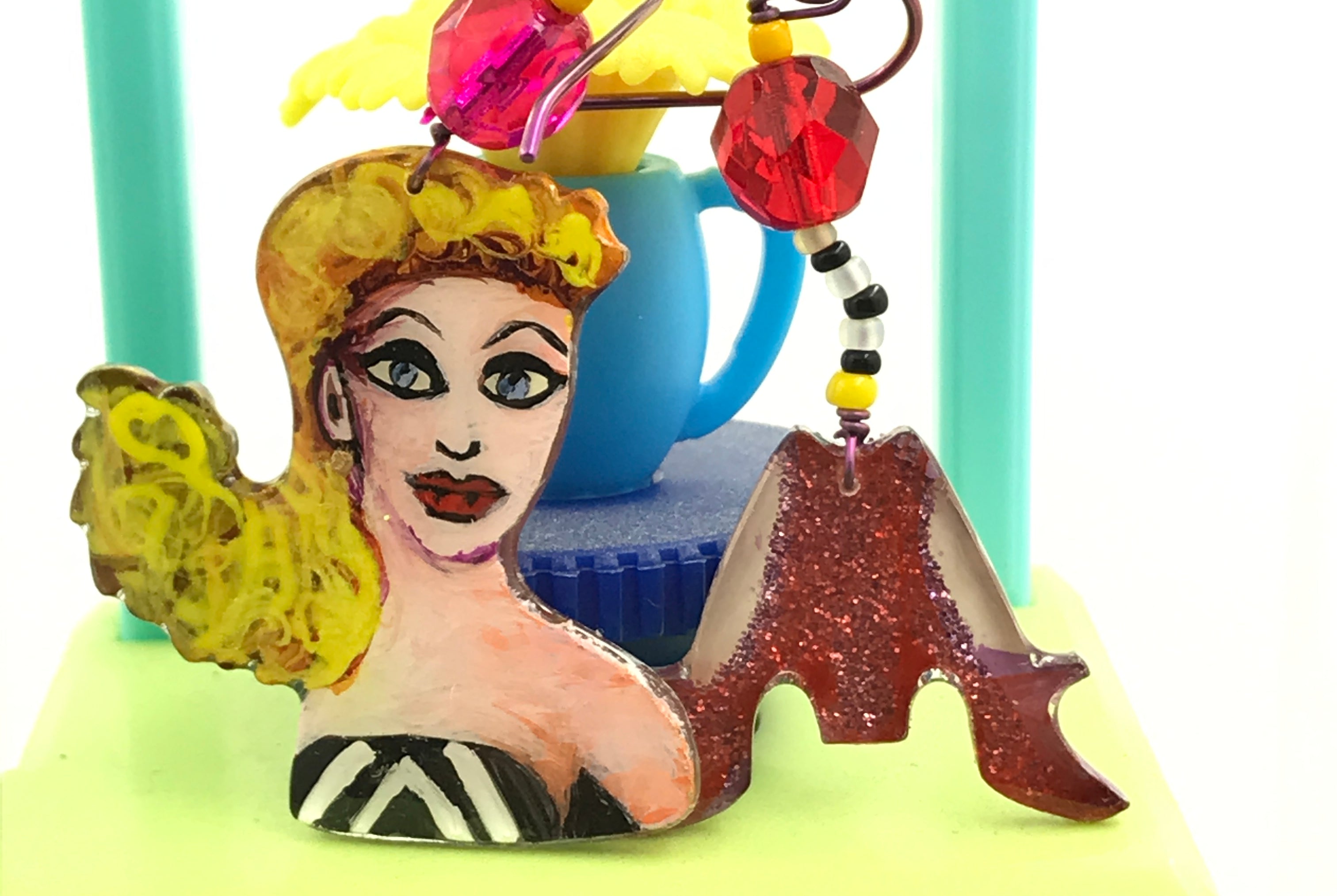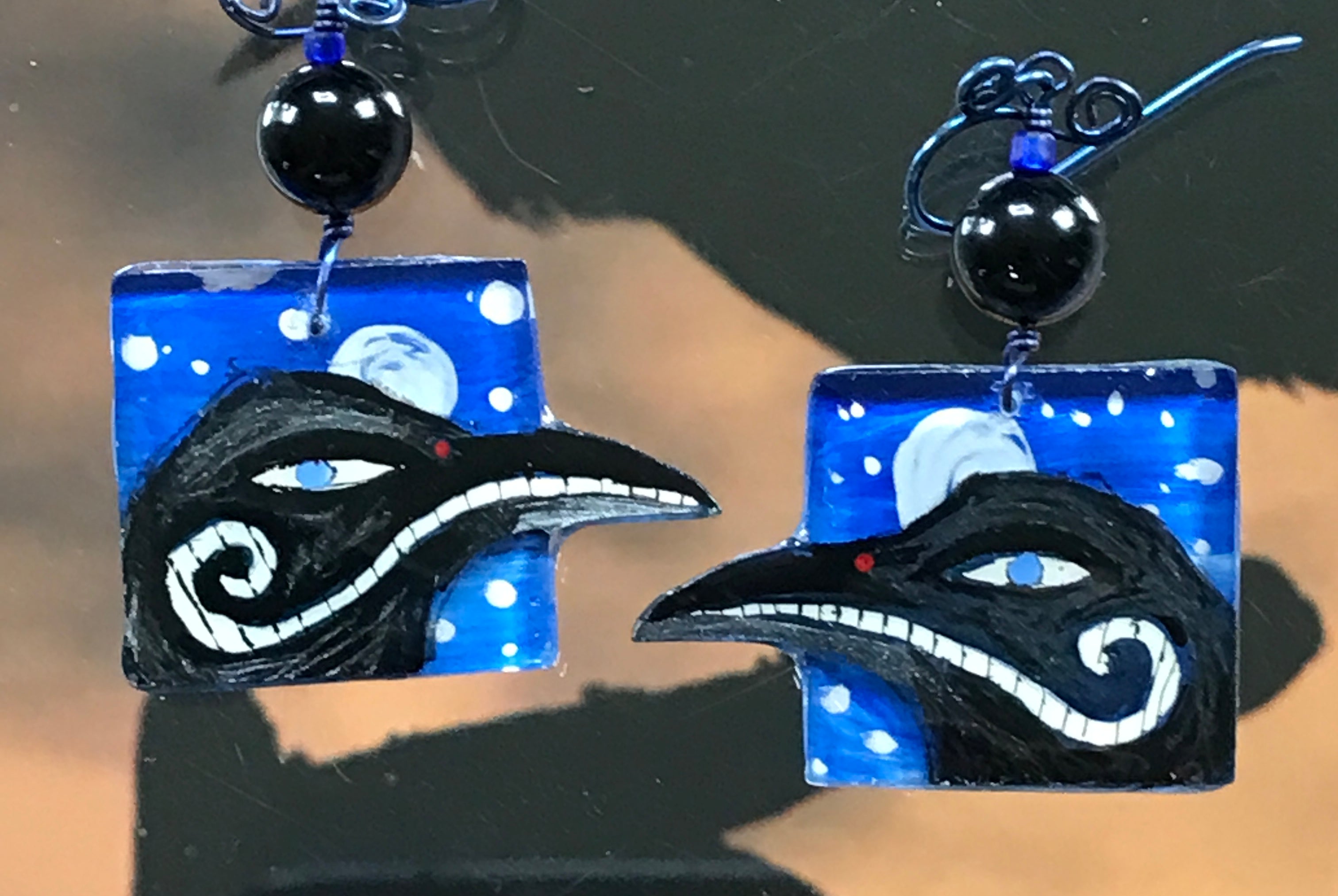 For me, these are little paintings that you can wear. If you are thinking of shrinky-dinks, I'm sure that was in my mind when I came up with lasercutting the shapes and then painting with the same paints I use on canvas. It's a multi layered process that takes a long time. The painting takes the longest, but it is the most rewarding. They are coated with a thick and sturdy glaze that brings out the depth and color.