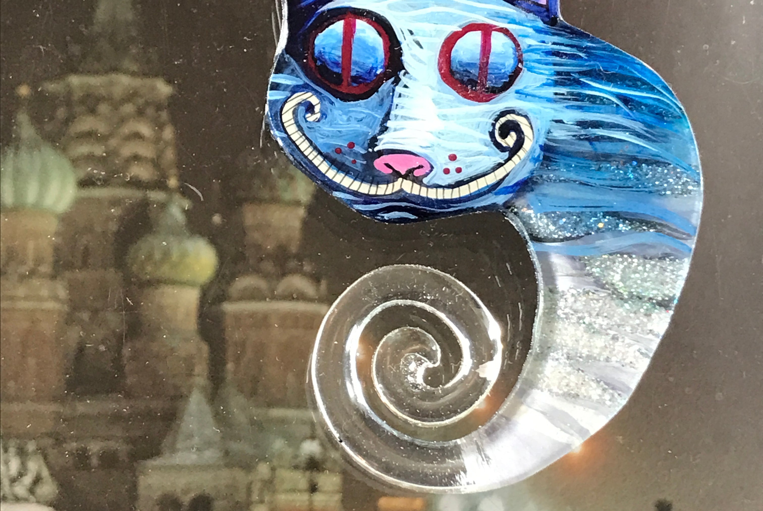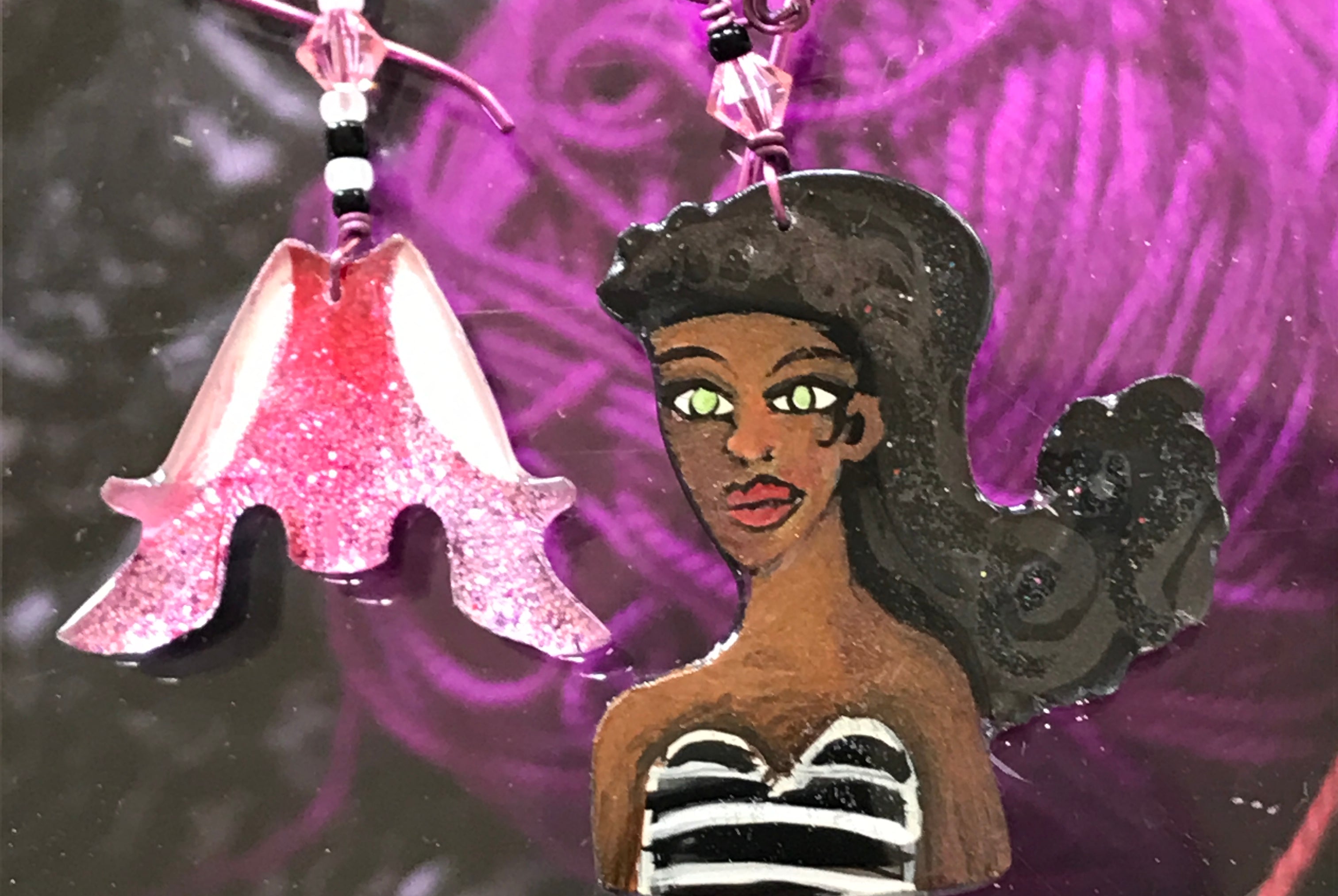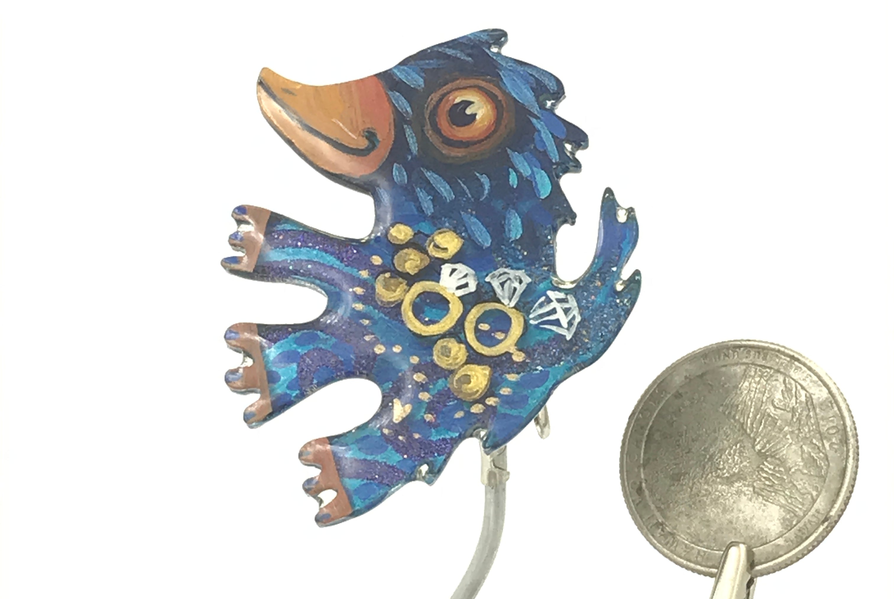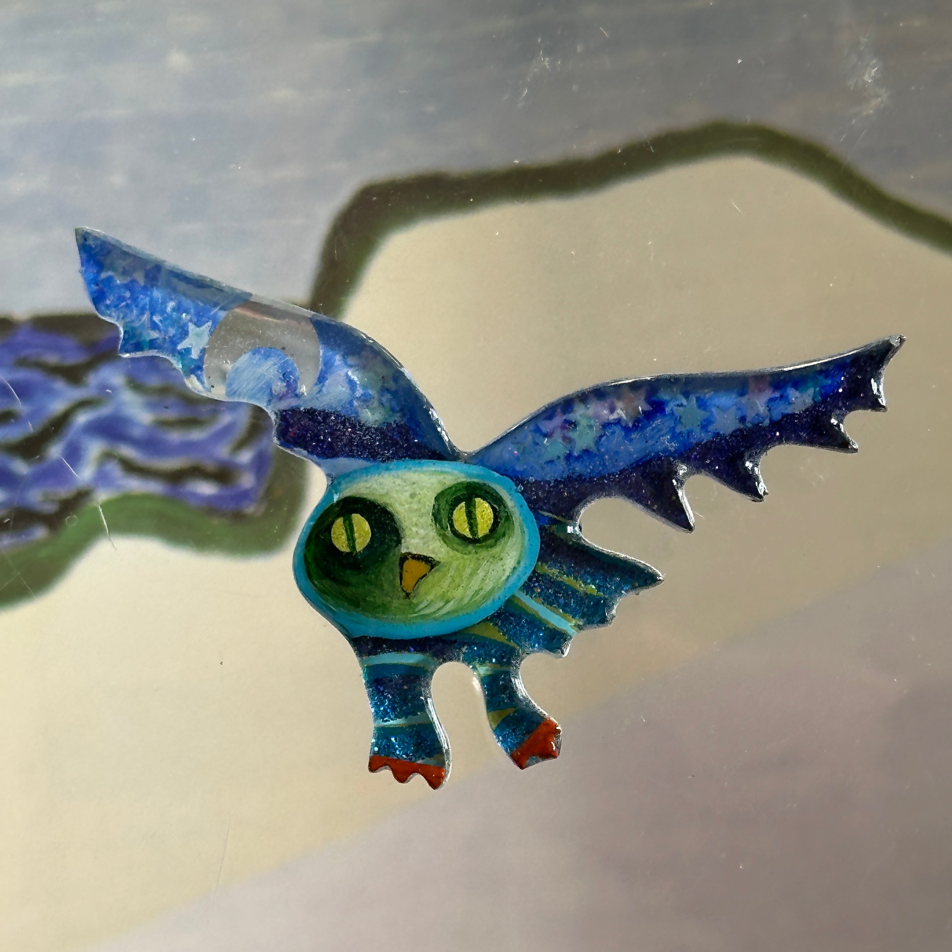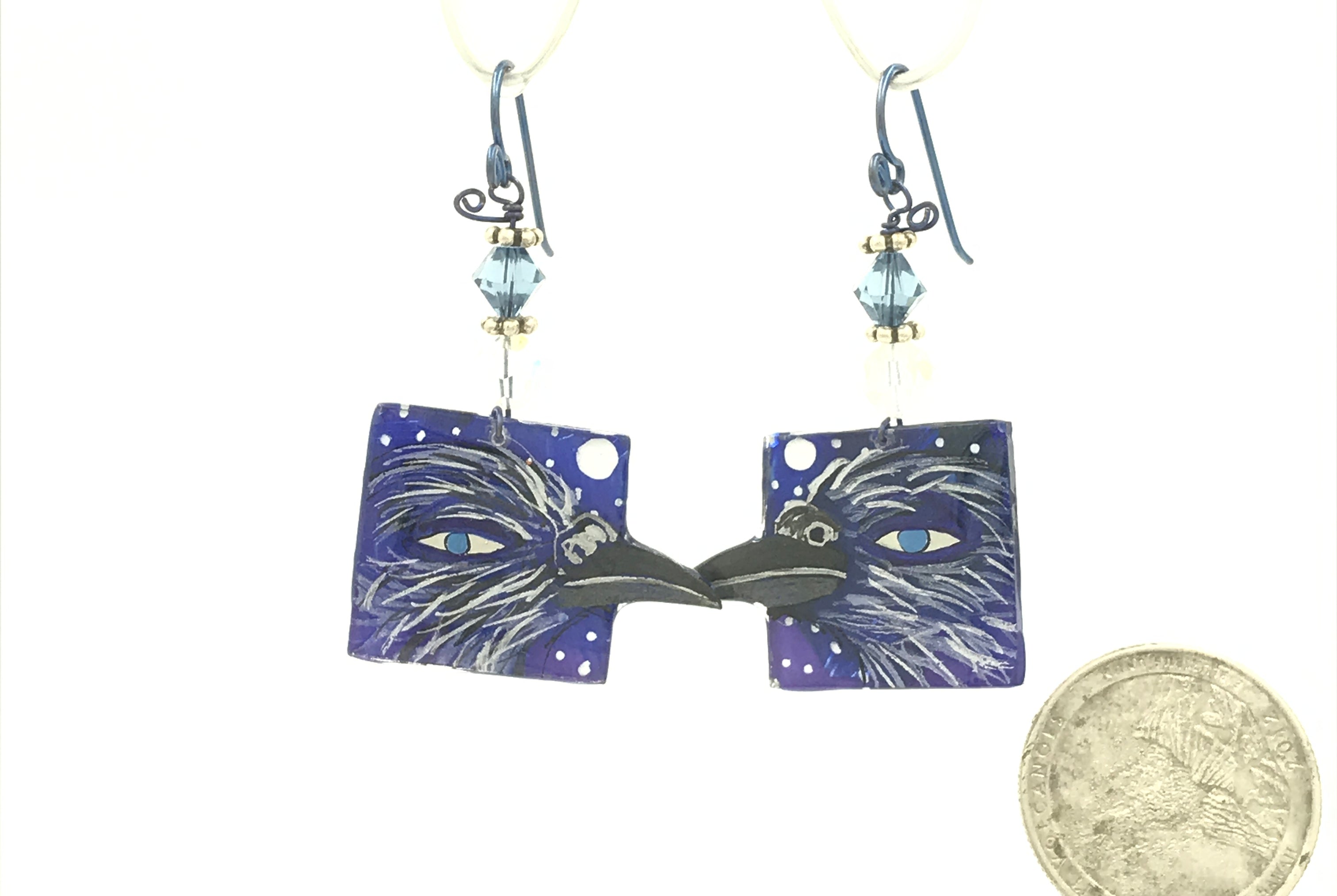 For me, these are little paintings that you can wear. If you are thinking of shrinky-dinks, I'm sure that was in my mind when I came up with lasercutting the shapes and then painting with the same paints I use on canvas. It's a multi layered process that takes a long time. The painting takes the longest, but it is the most rewarding. They are coated with a thick and sturdy glaze that brings out the depth and color.