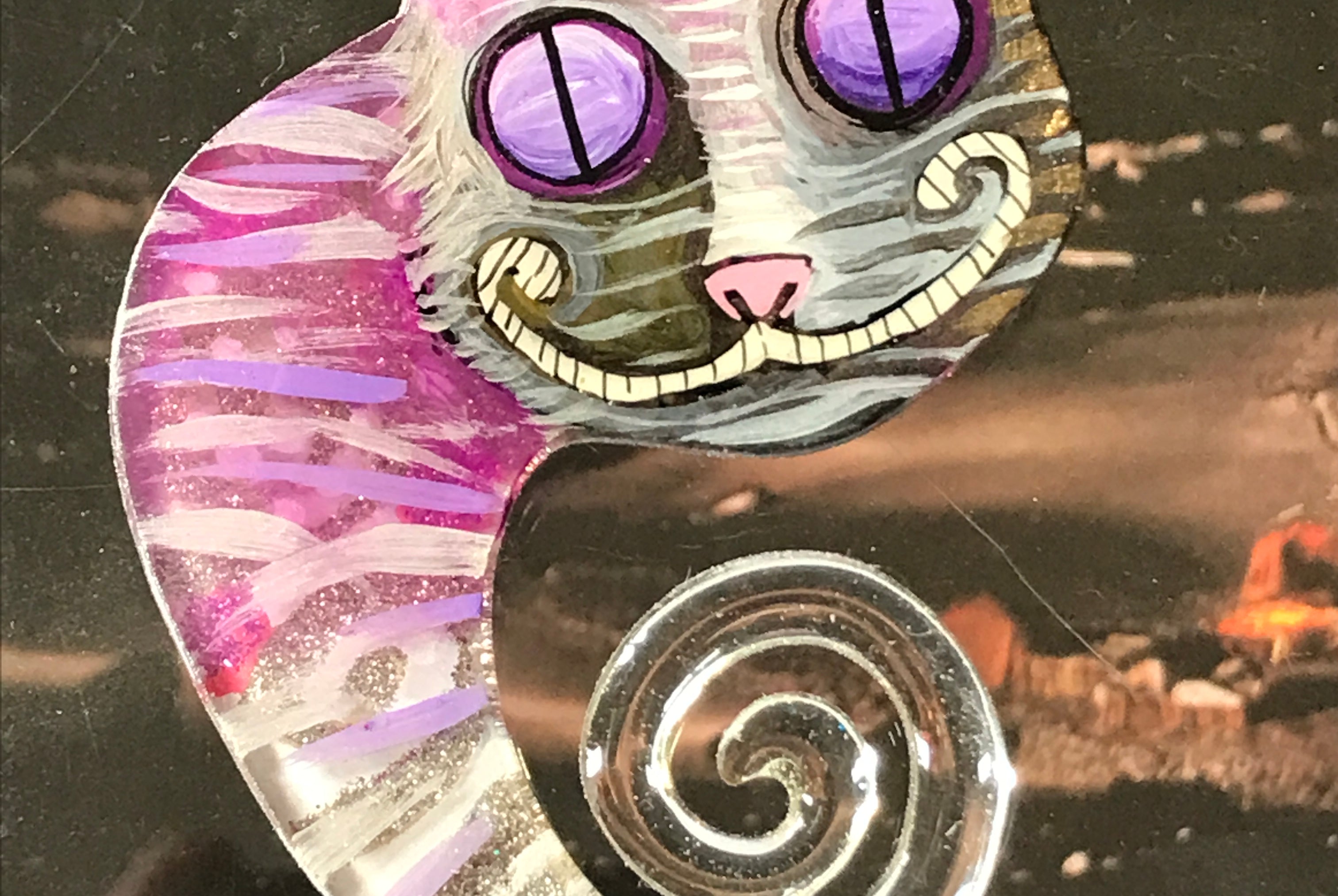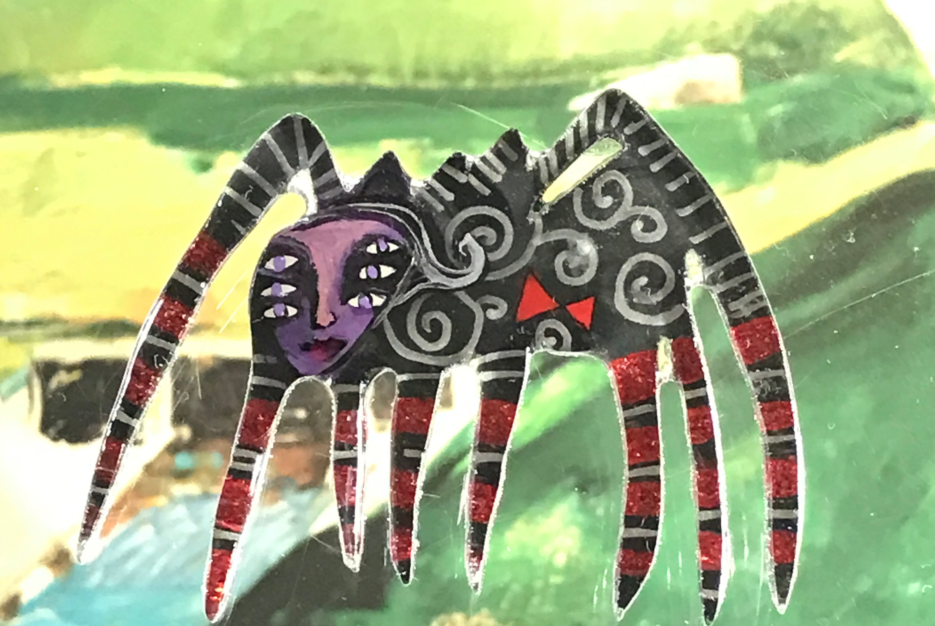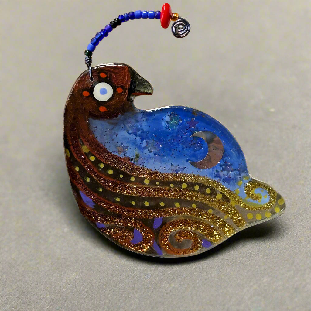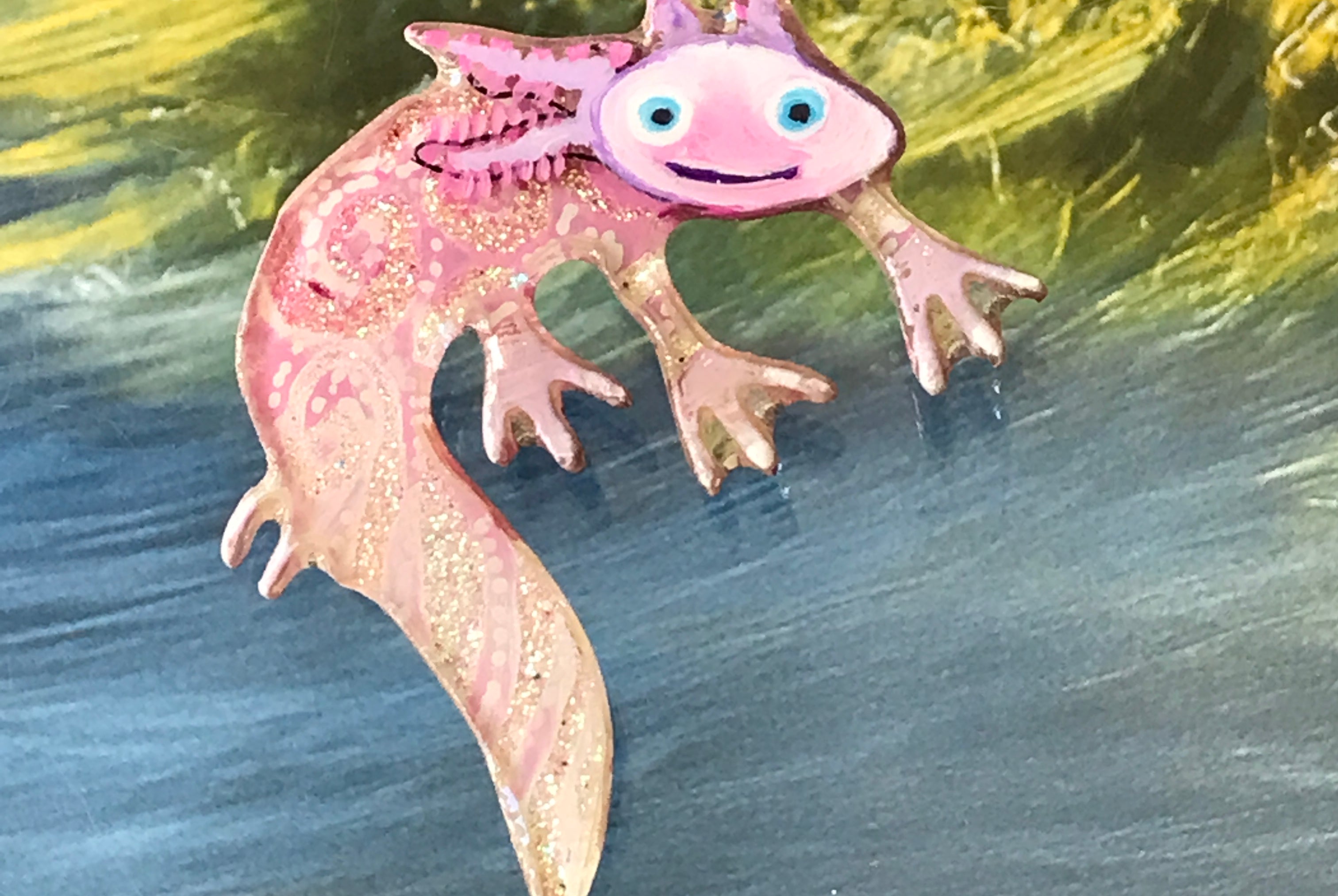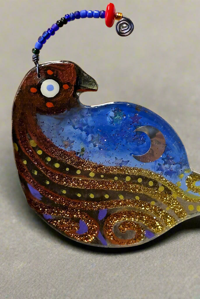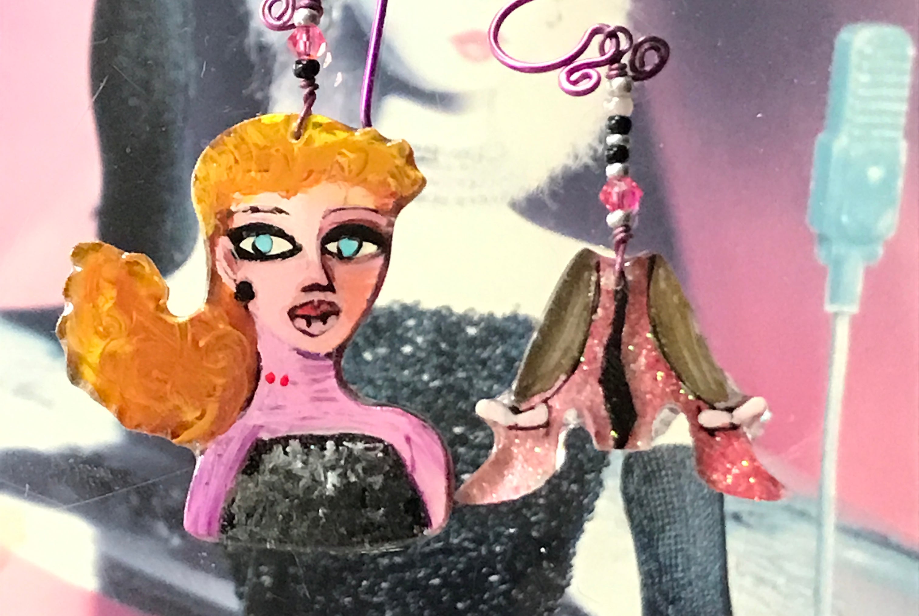 For me, these are little paintings that you can wear. If you are thinking of shrinky-dinks, I'm sure that was in my mind when I came up with lasercutting the shapes and then painting with the same paints I use on canvas. It's a multi layered process that takes a long time. The painting takes the longest, but it is the most rewarding. They are coated with a thick and sturdy glaze that brings out the depth and color.