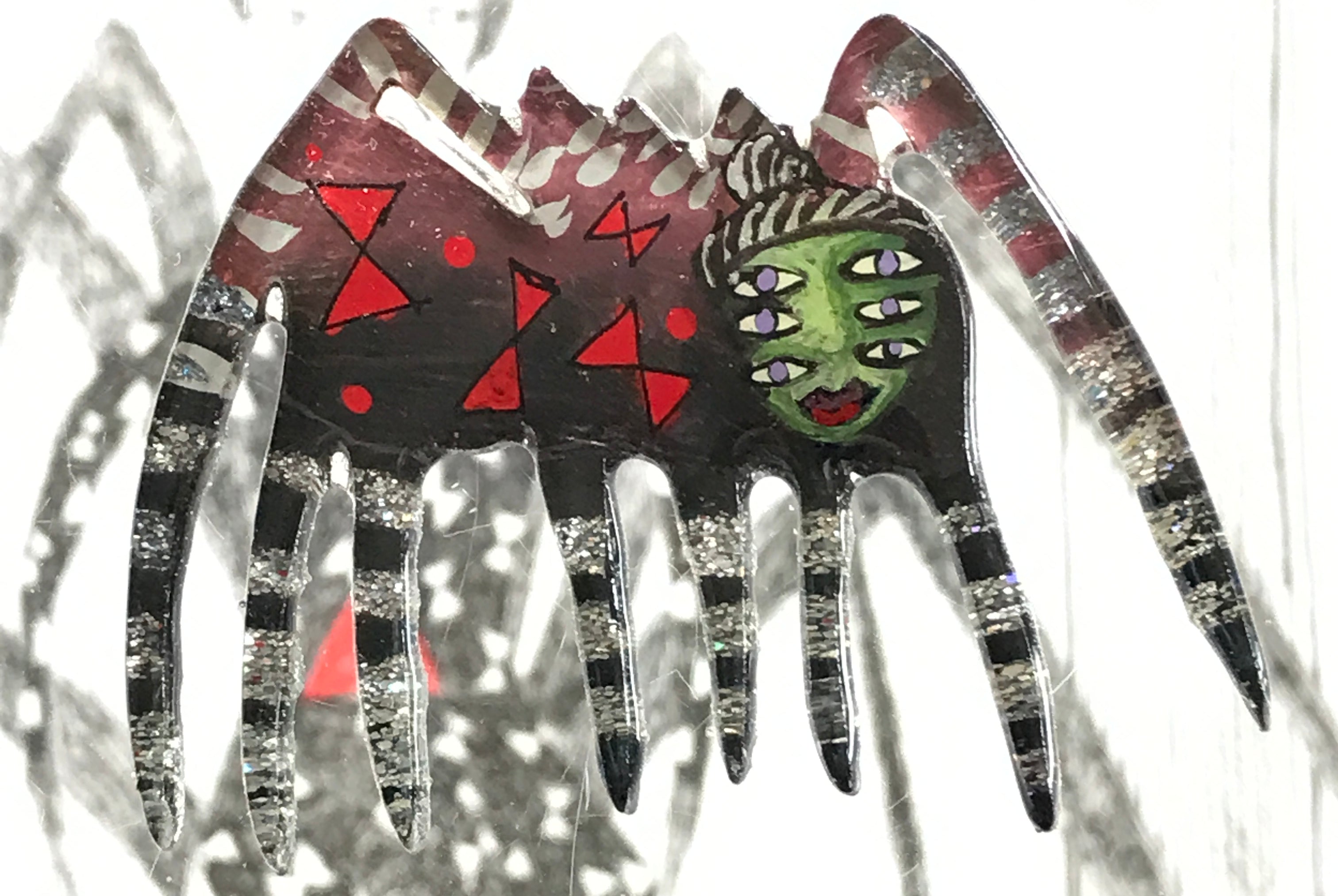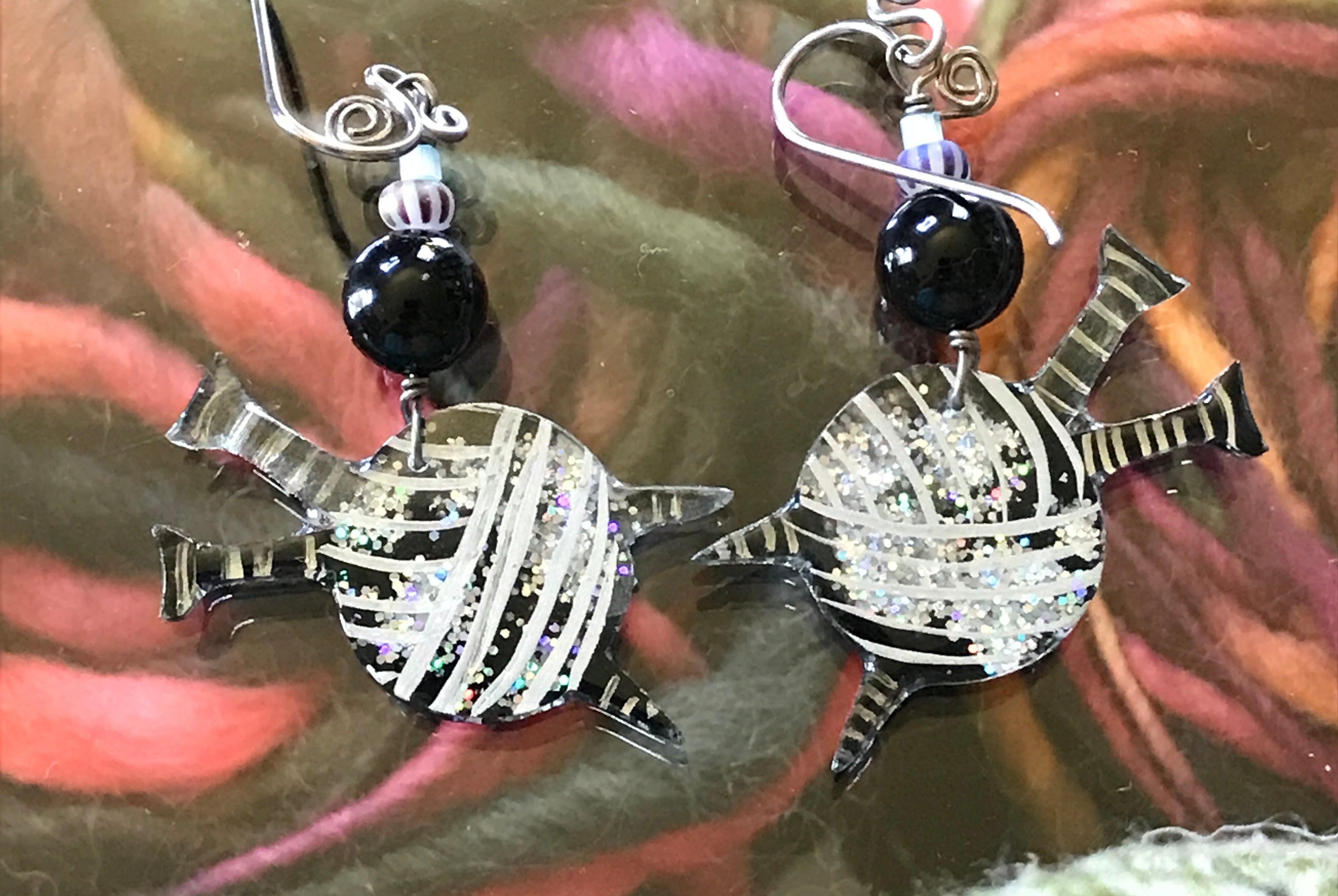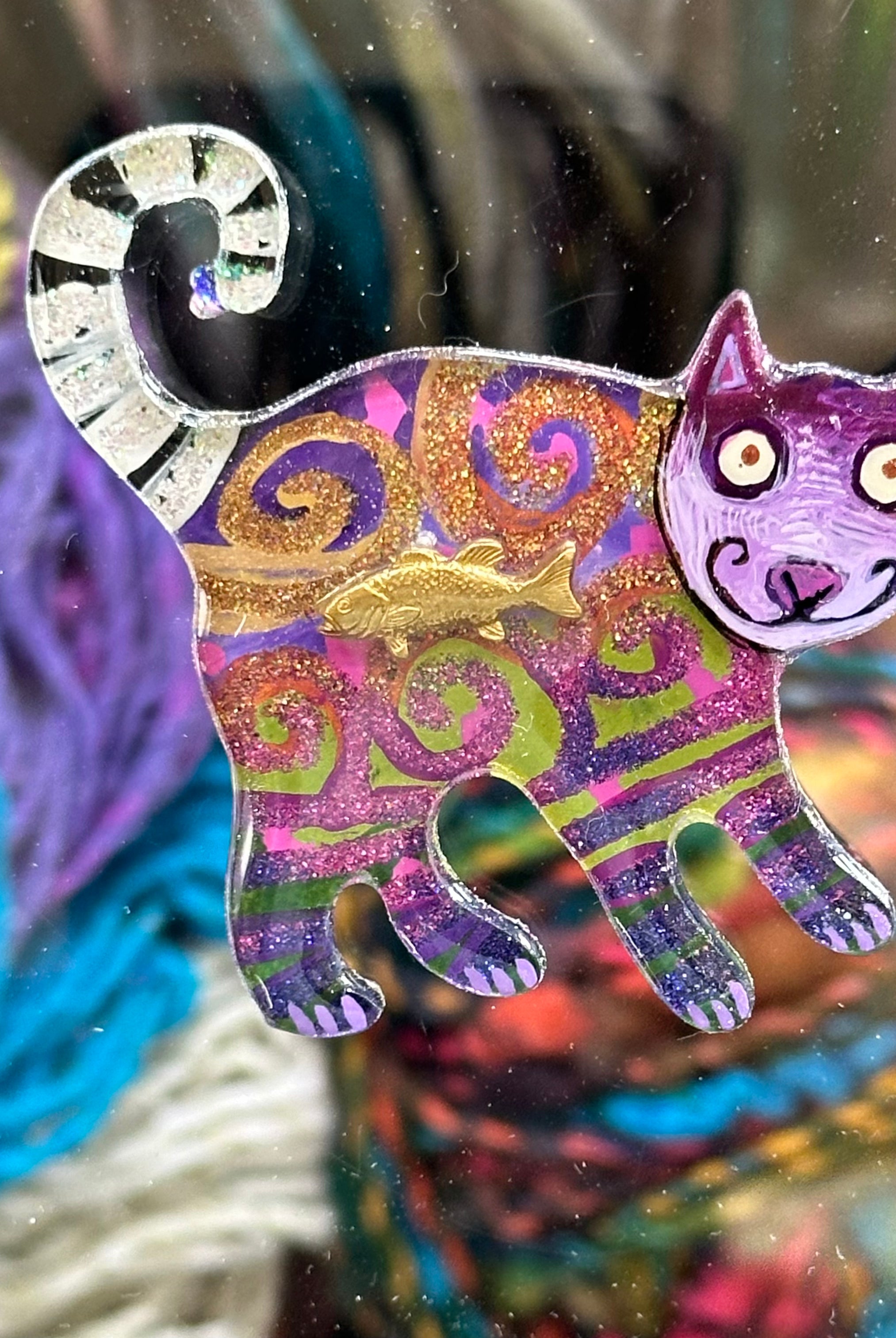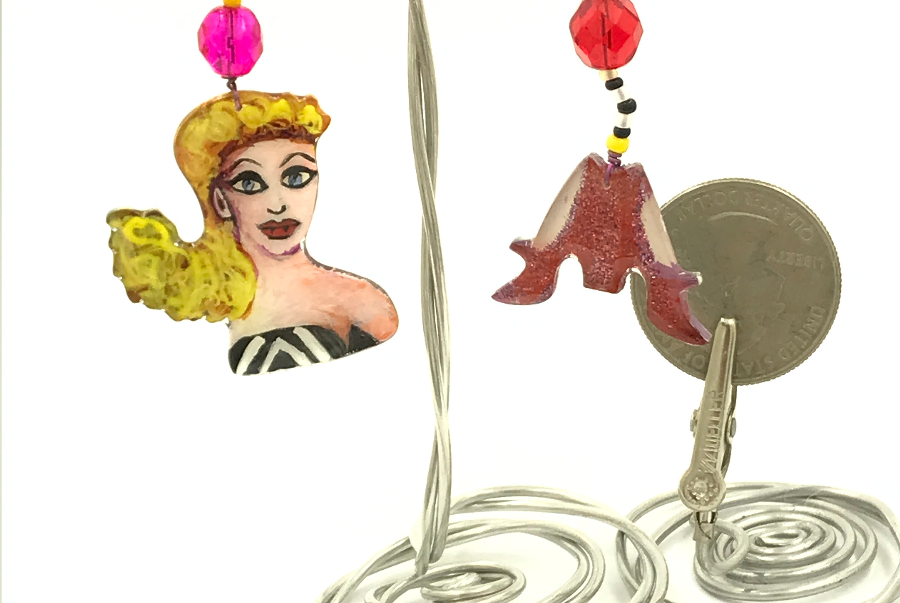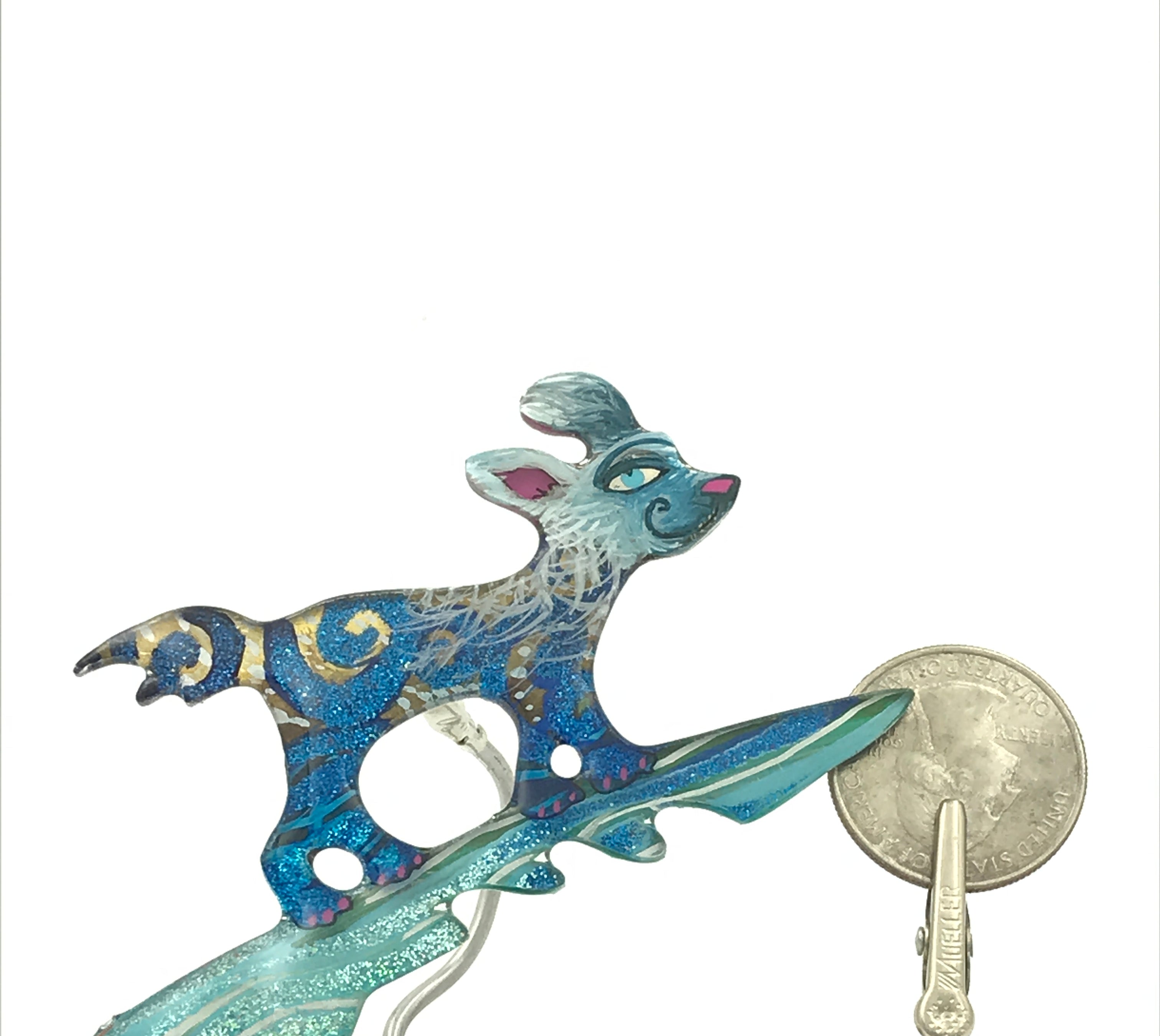 For me, these are little paintings that you can wear. If you are thinking of shrinky-dinks, I'm sure that was in my mind when I came up with lasercutting the shapes and then painting with the same paints I use on canvas. It's a multi layered process that takes a long time. The painting takes the longest, but it is the most rewarding. They are coated with a thick and sturdy glaze that brings out the depth and color.