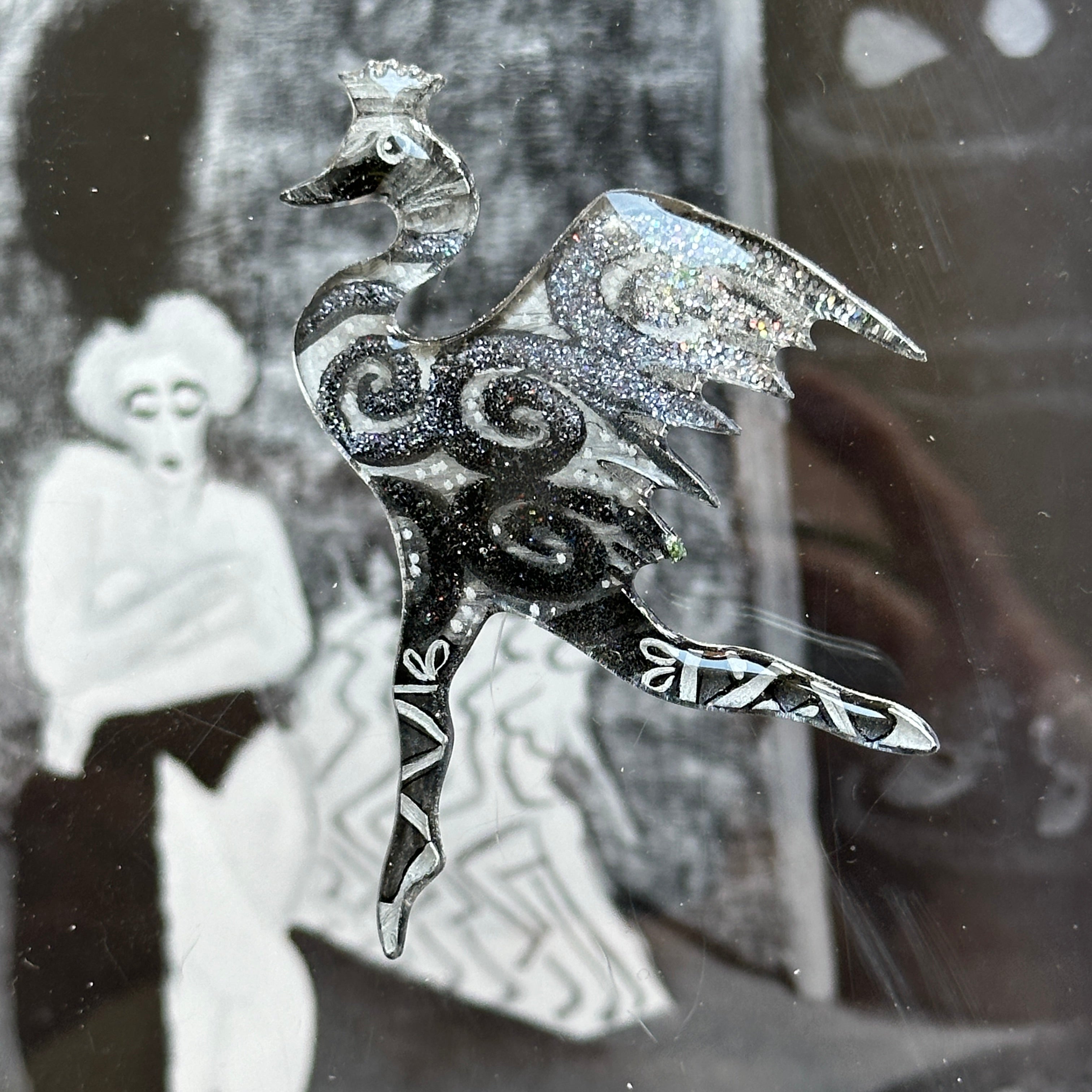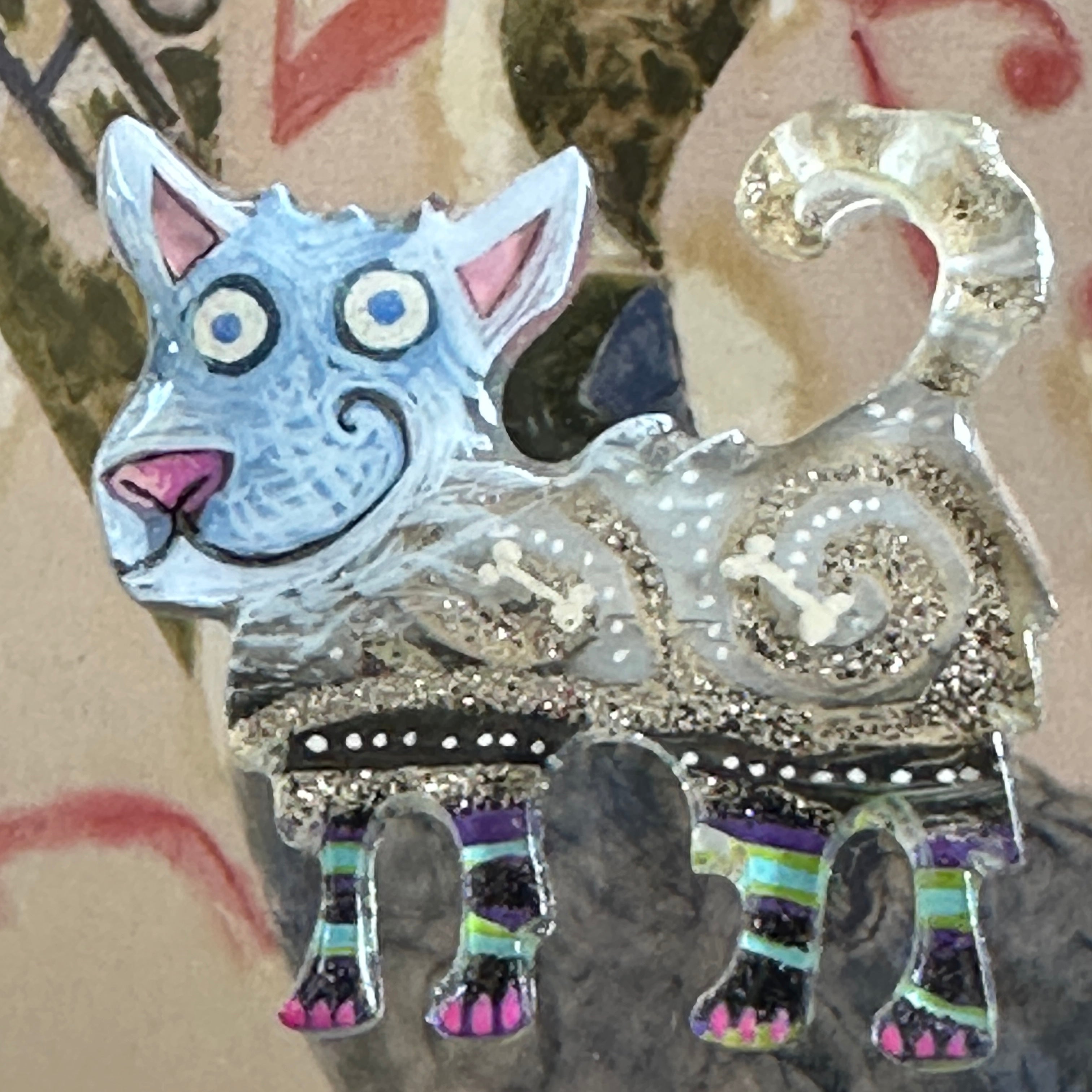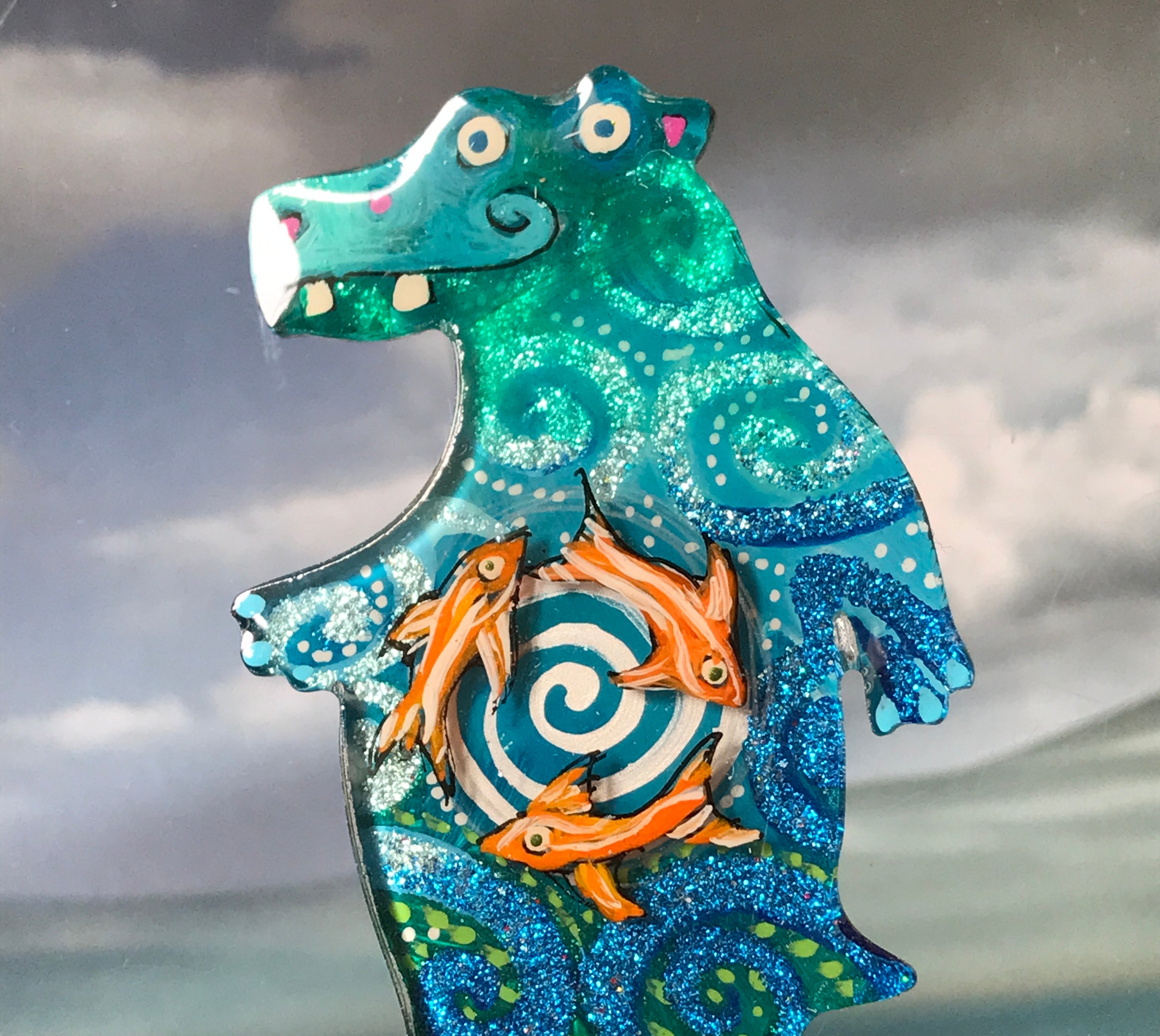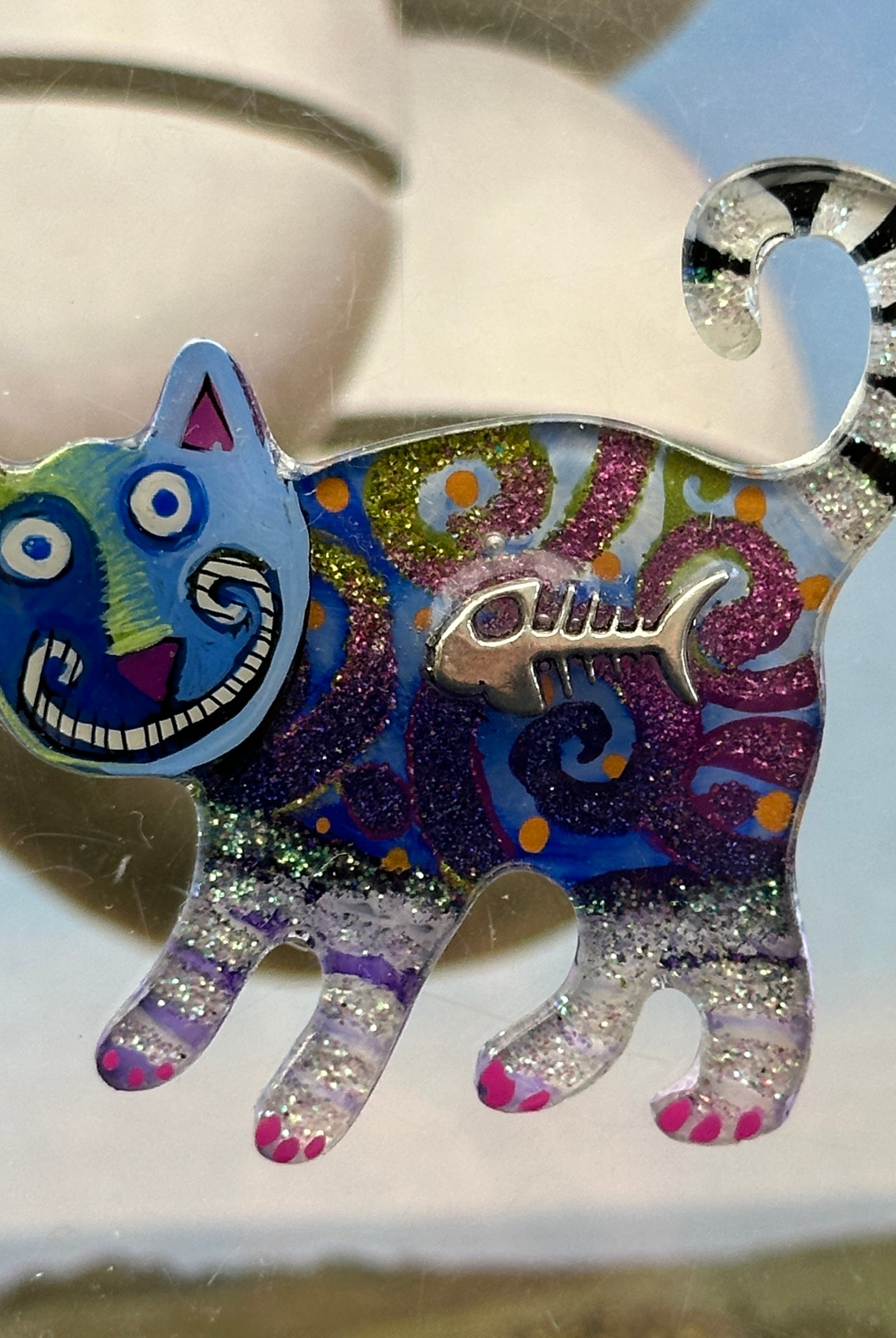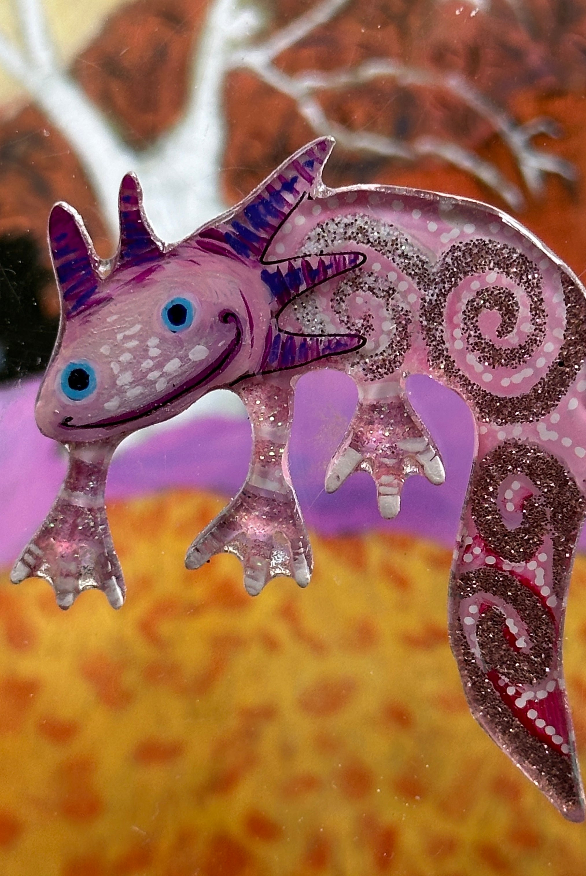 For me, these are little paintings that you can wear. If you are thinking of shrinky-dinks, I'm sure that was in my mind when I came up with lasercutting the shapes and then painting with the same paints I use on canvas. It's a multi layered process that takes a long time. The painting takes the longest, but it is the most rewarding. They are coated with a thick and sturdy glaze that brings out the depth and color.