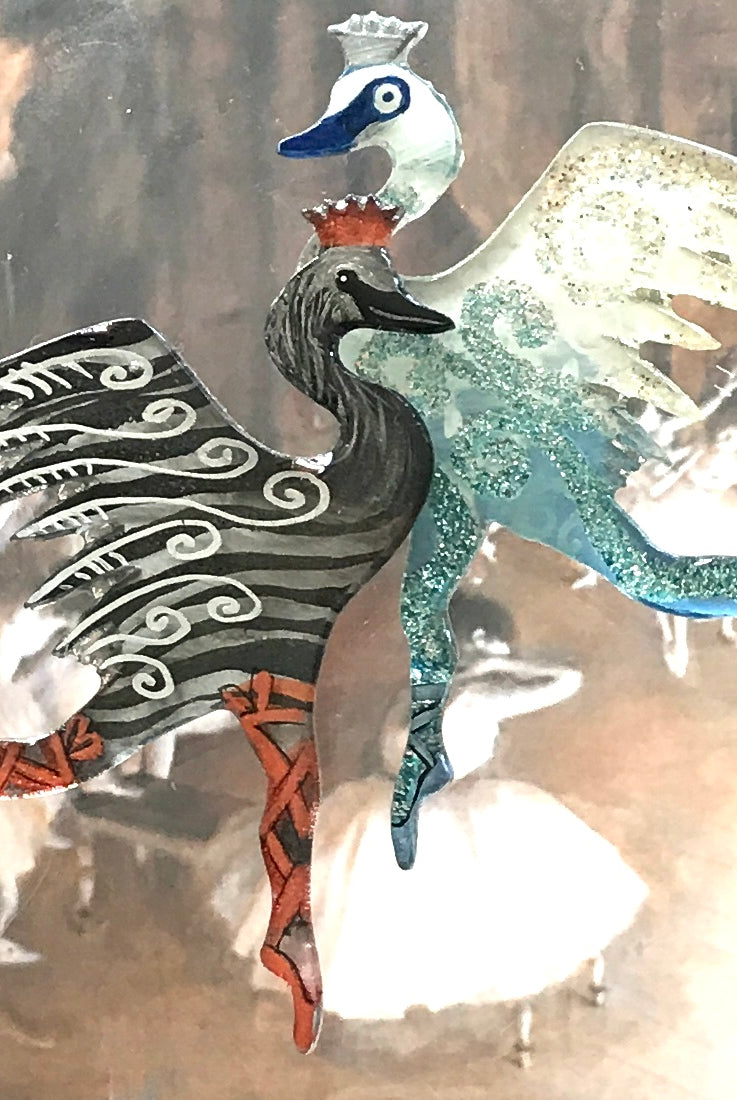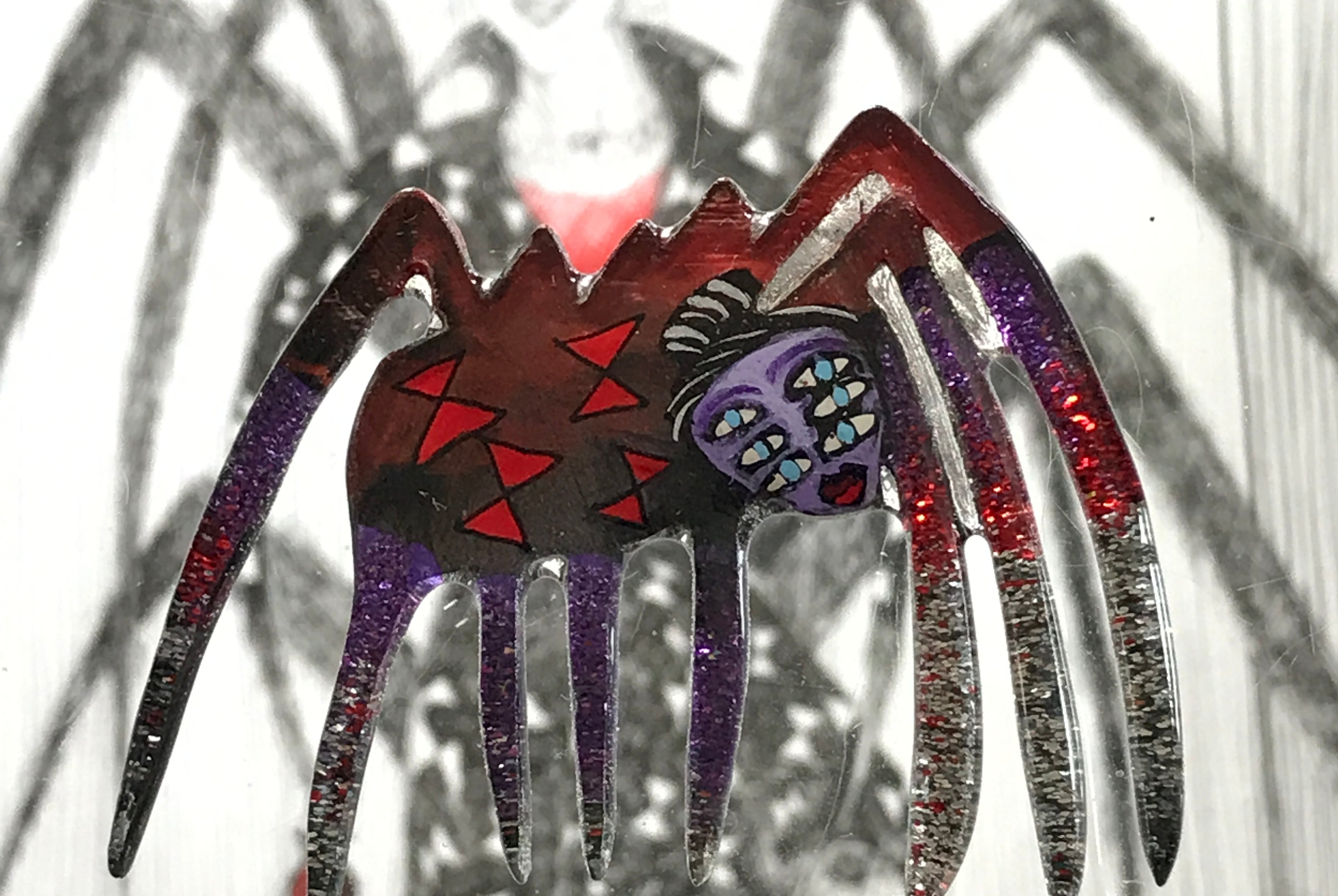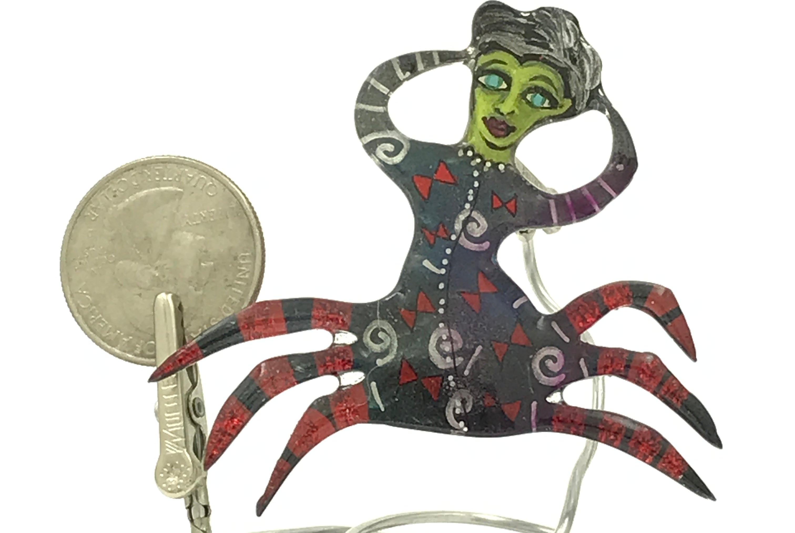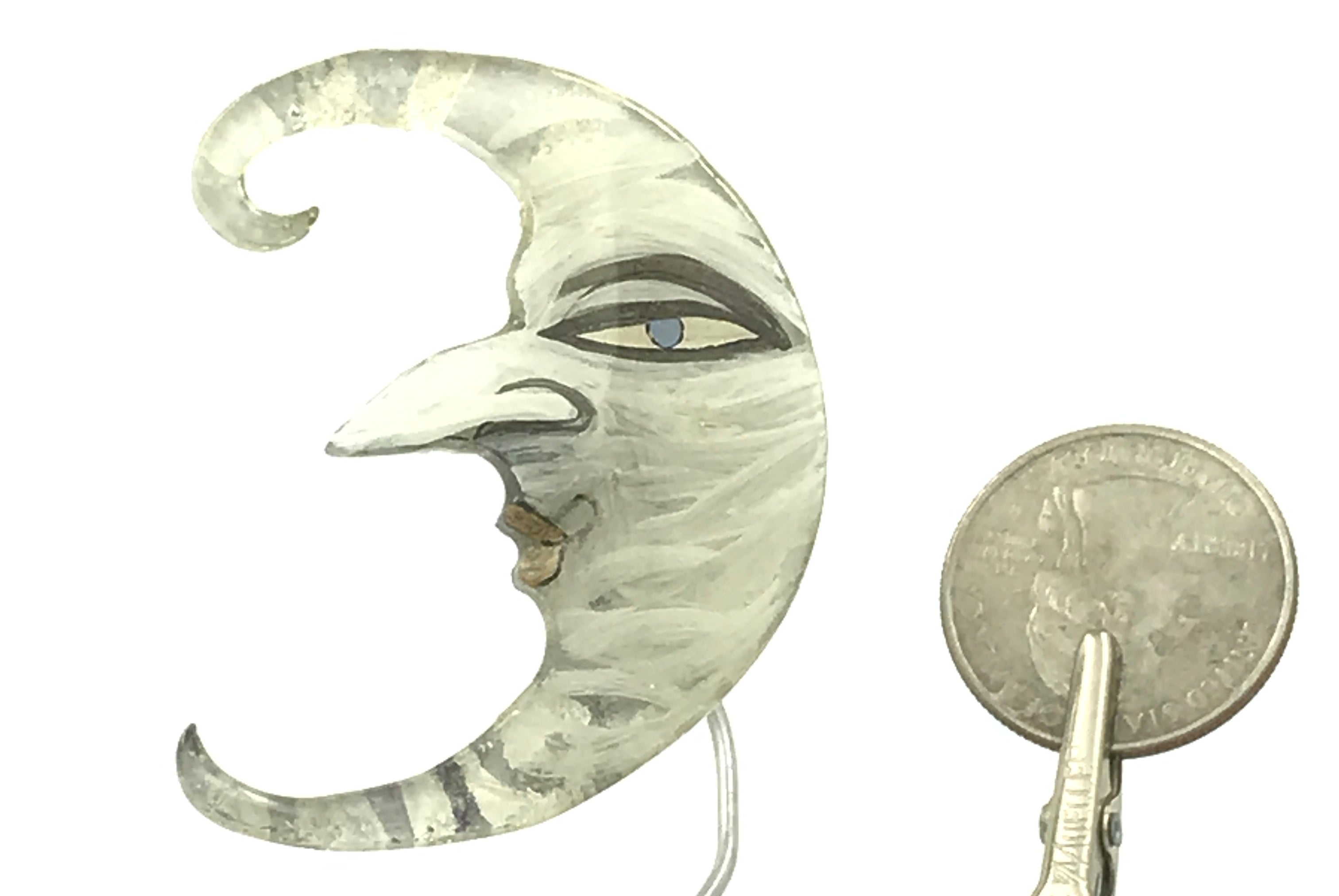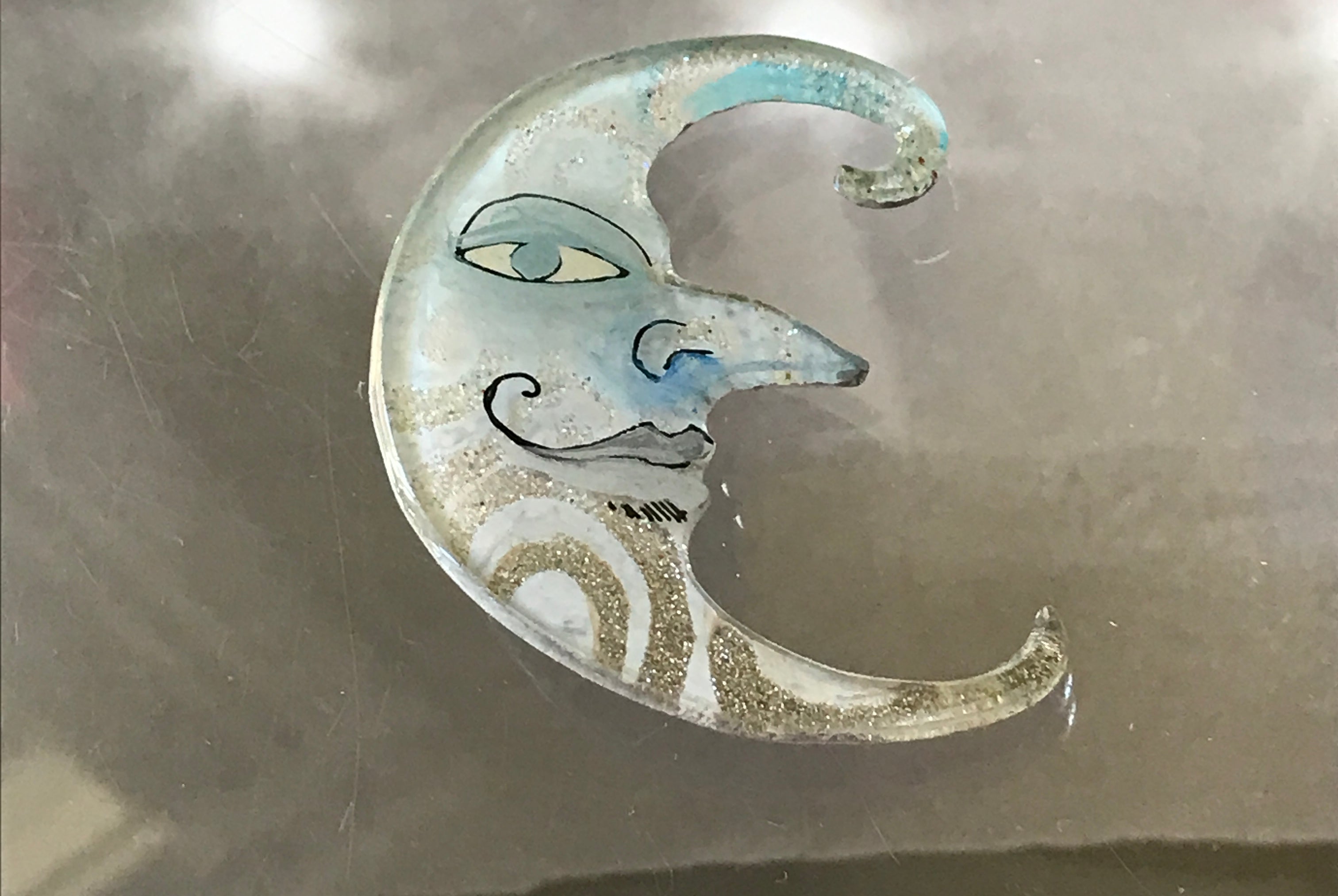 For me, these are little paintings that you can wear. If you are thinking of shrinky-dinks, I'm sure that was in my mind when I came up with lasercutting the shapes and then painting with the same paints I use on canvas. It's a multi layered process that takes a long time. The painting takes the longest, but it is the most rewarding. They are coated with a thick and sturdy glaze that brings out the depth and color.