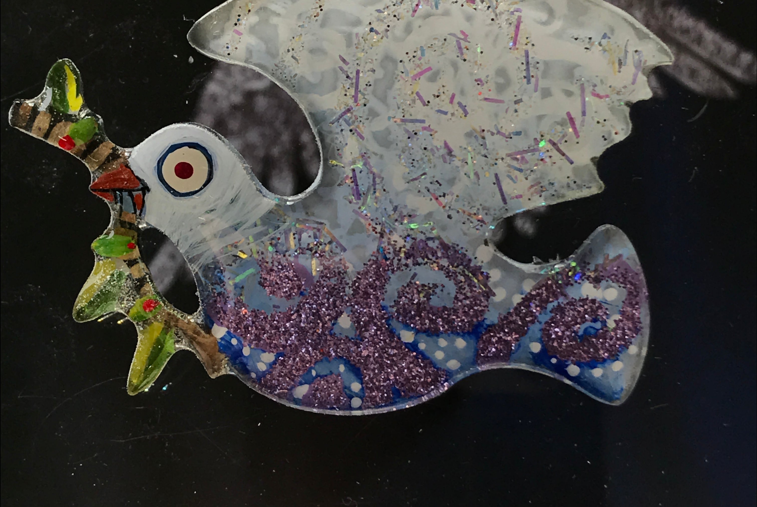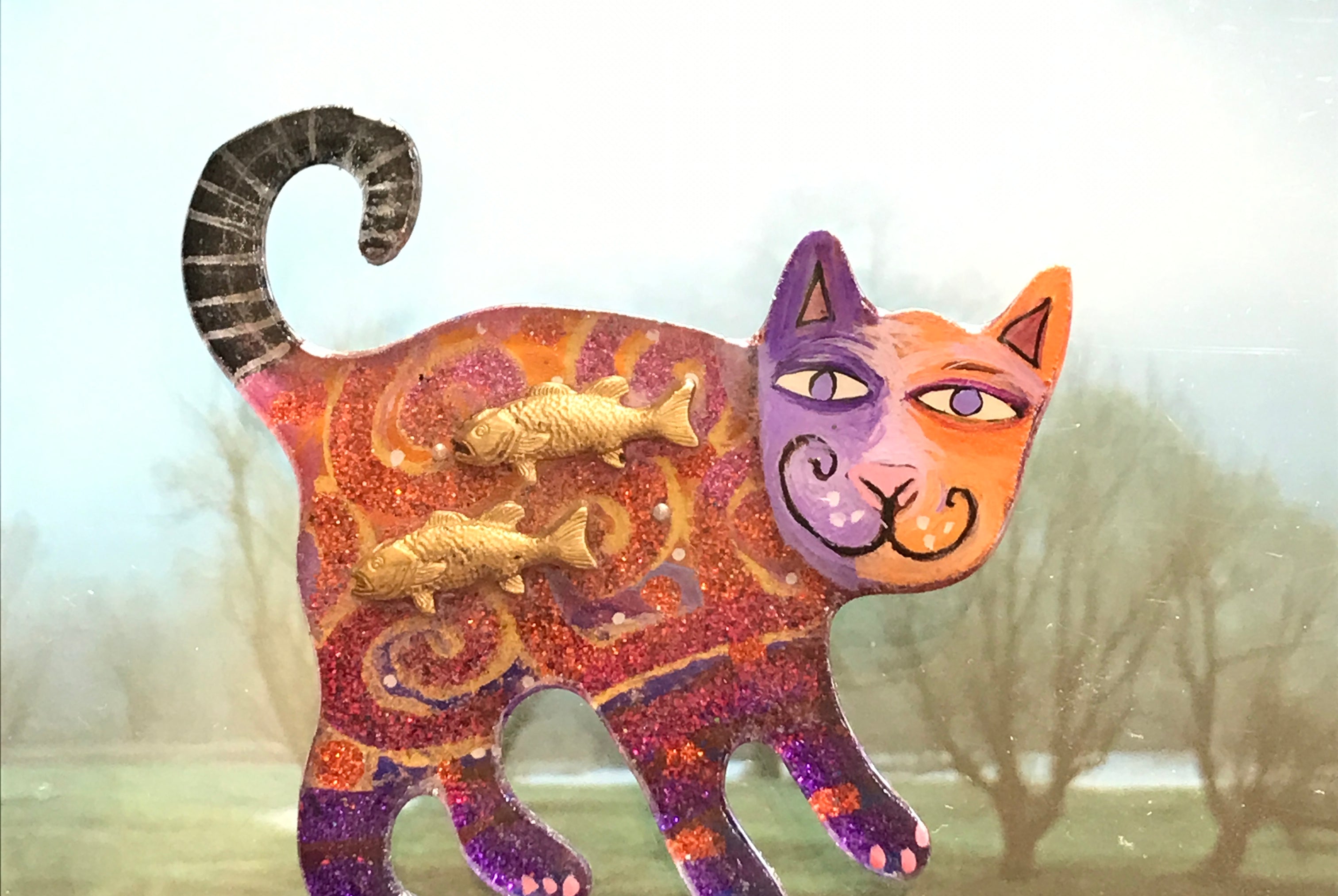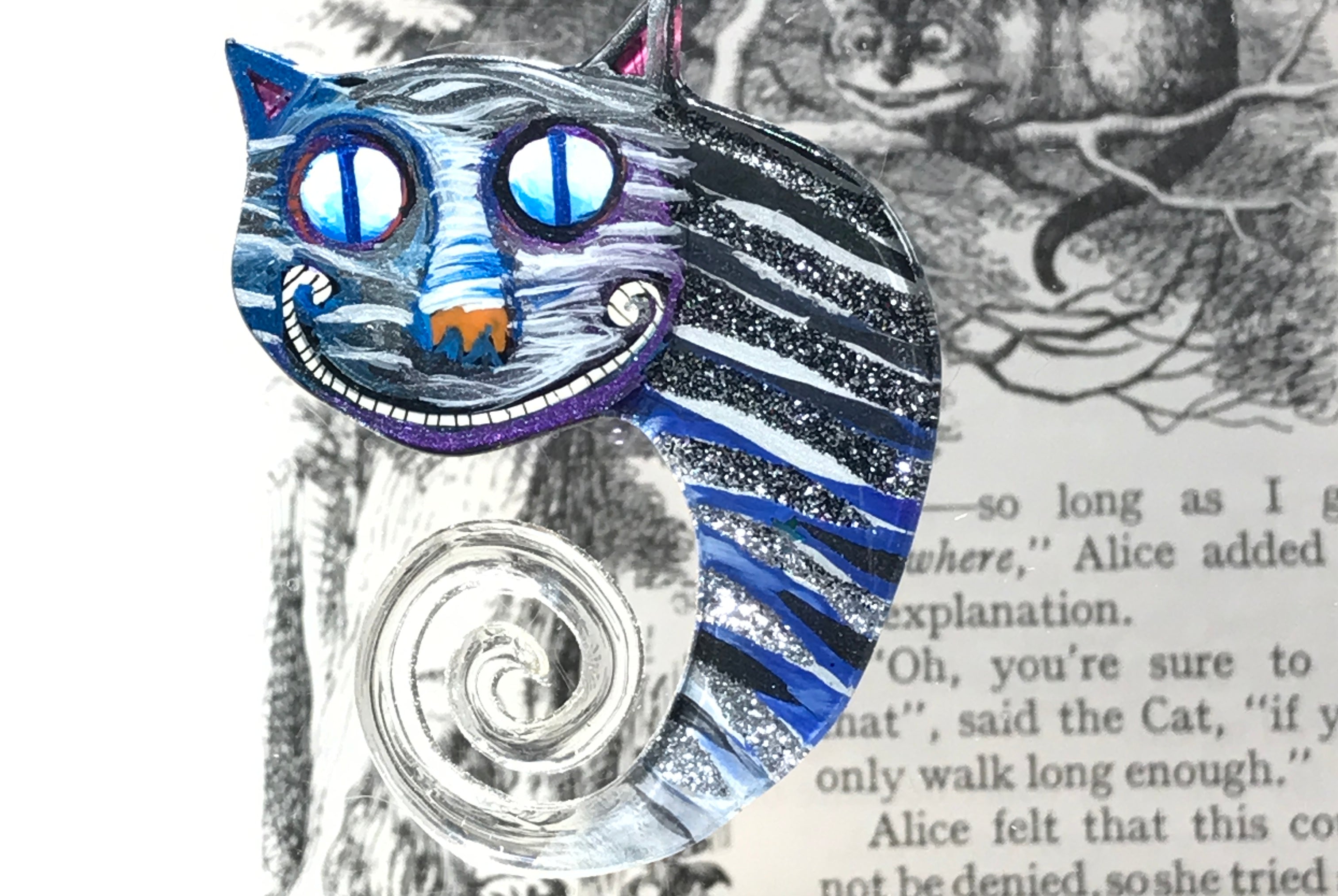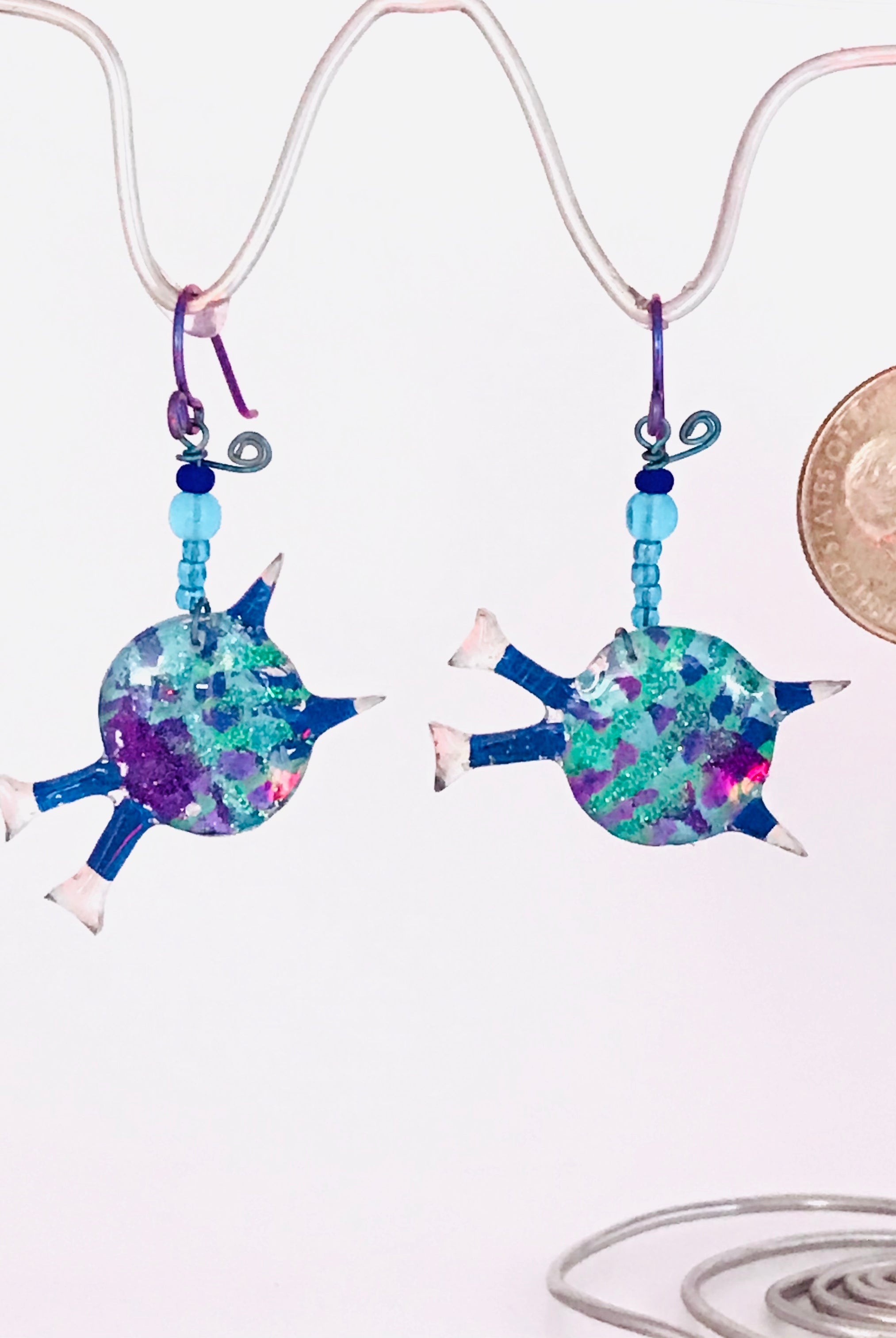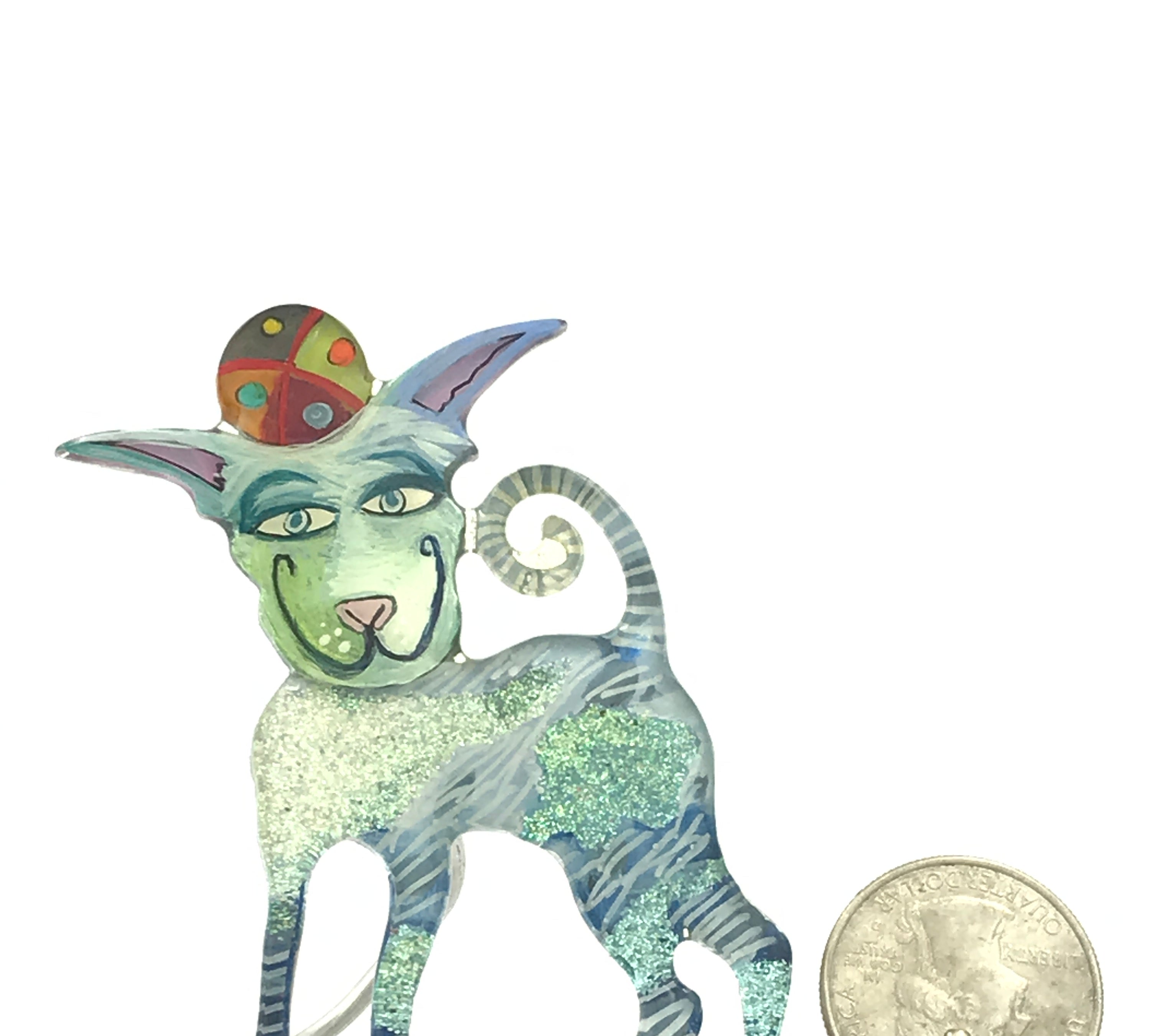 For me, these are little paintings that you can wear. If you are thinking of shrinky-dinks, I'm sure that was in my mind when I came up with lasercutting the shapes and then painting with the same paints I use on canvas. It's a multi layered process that takes a long time. The painting takes the longest, but it is the most rewarding. They are coated with a thick and sturdy glaze that brings out the depth and color.