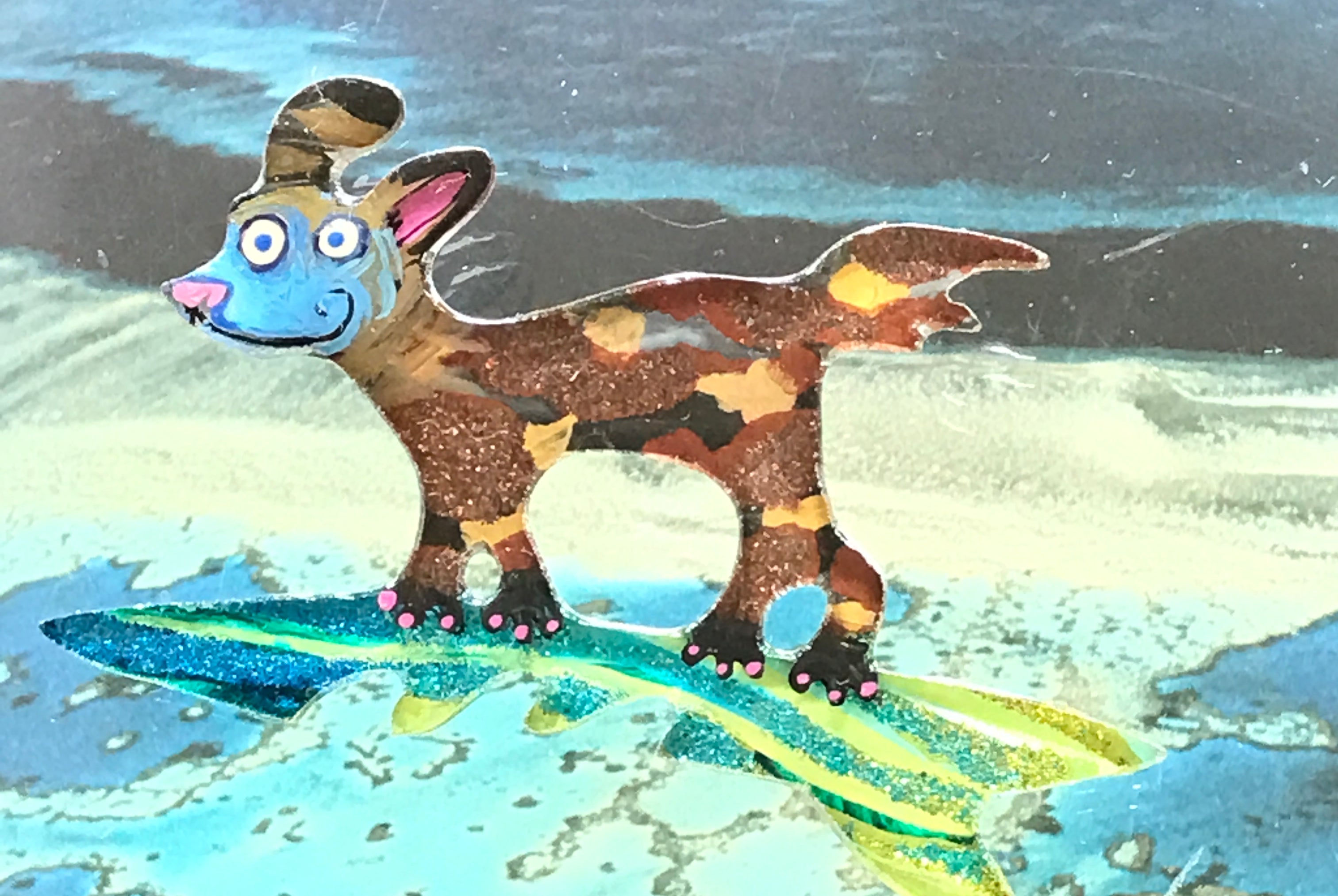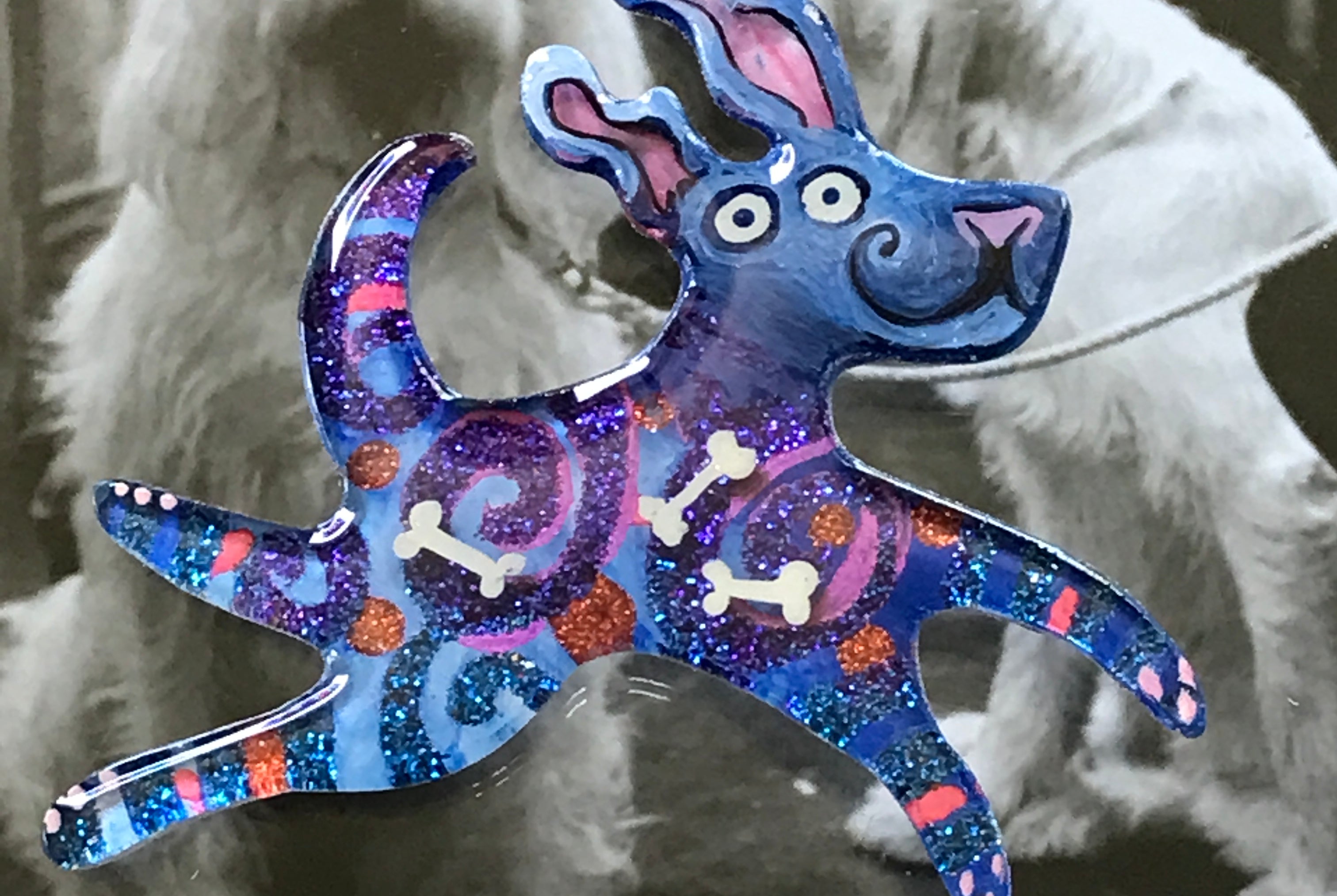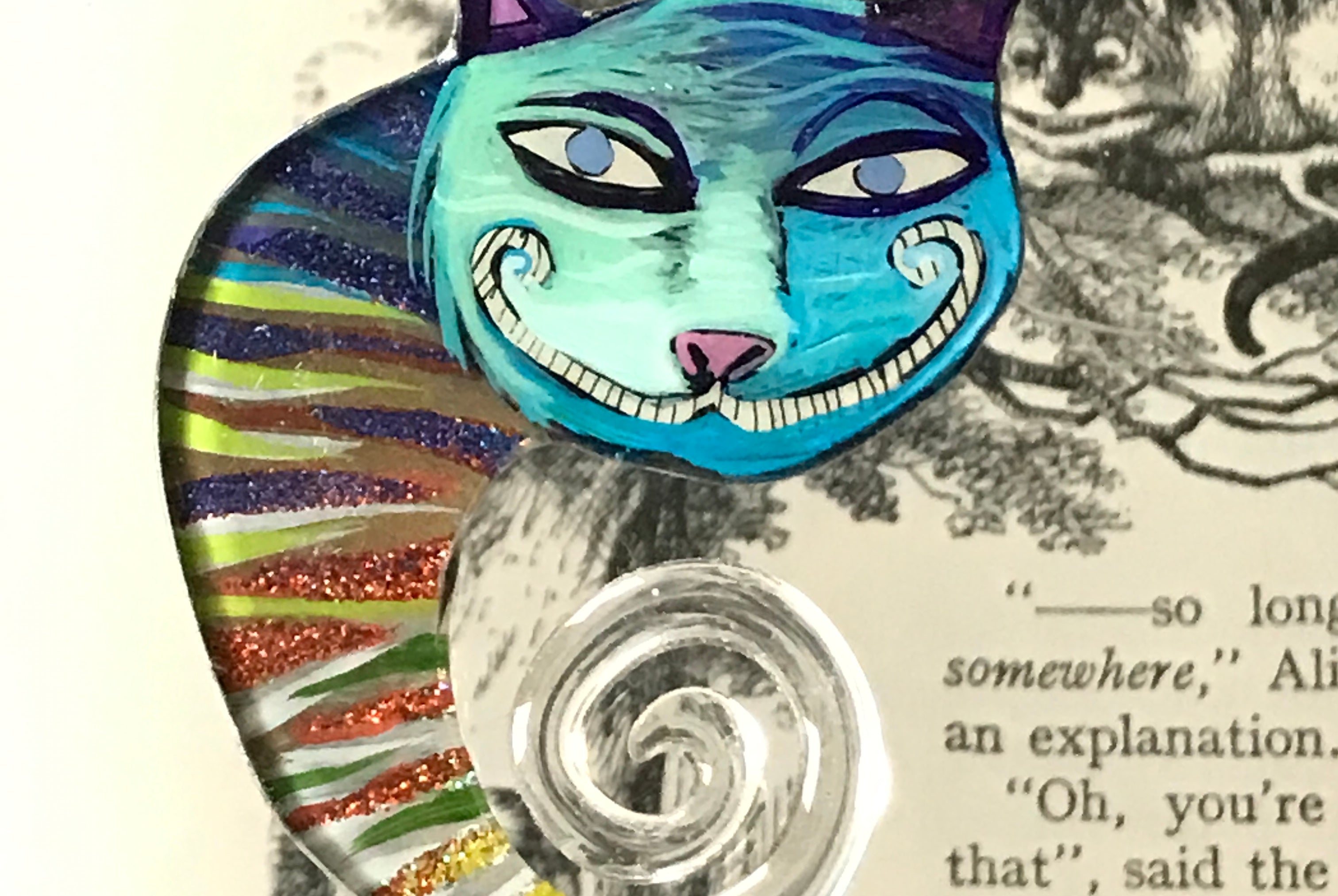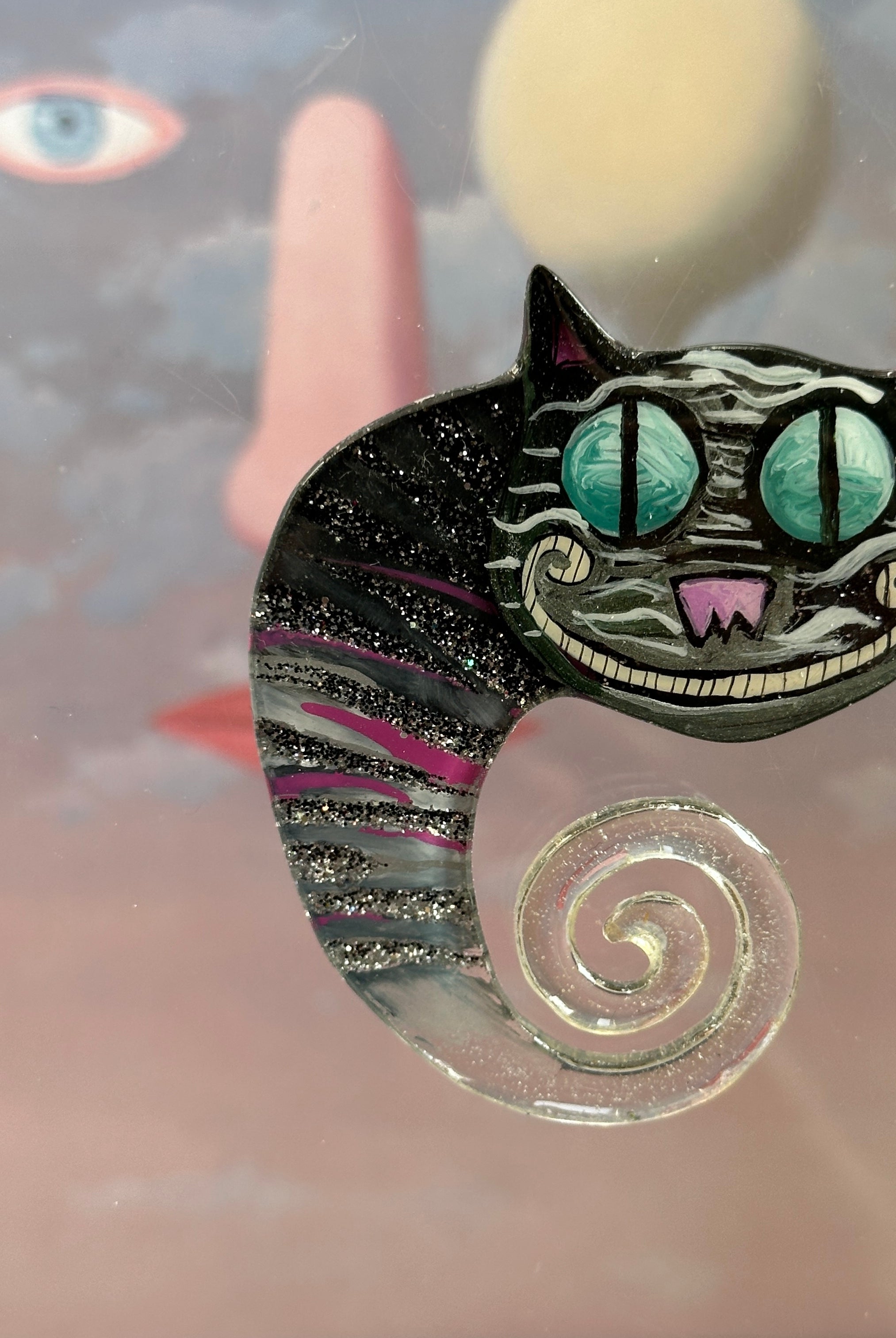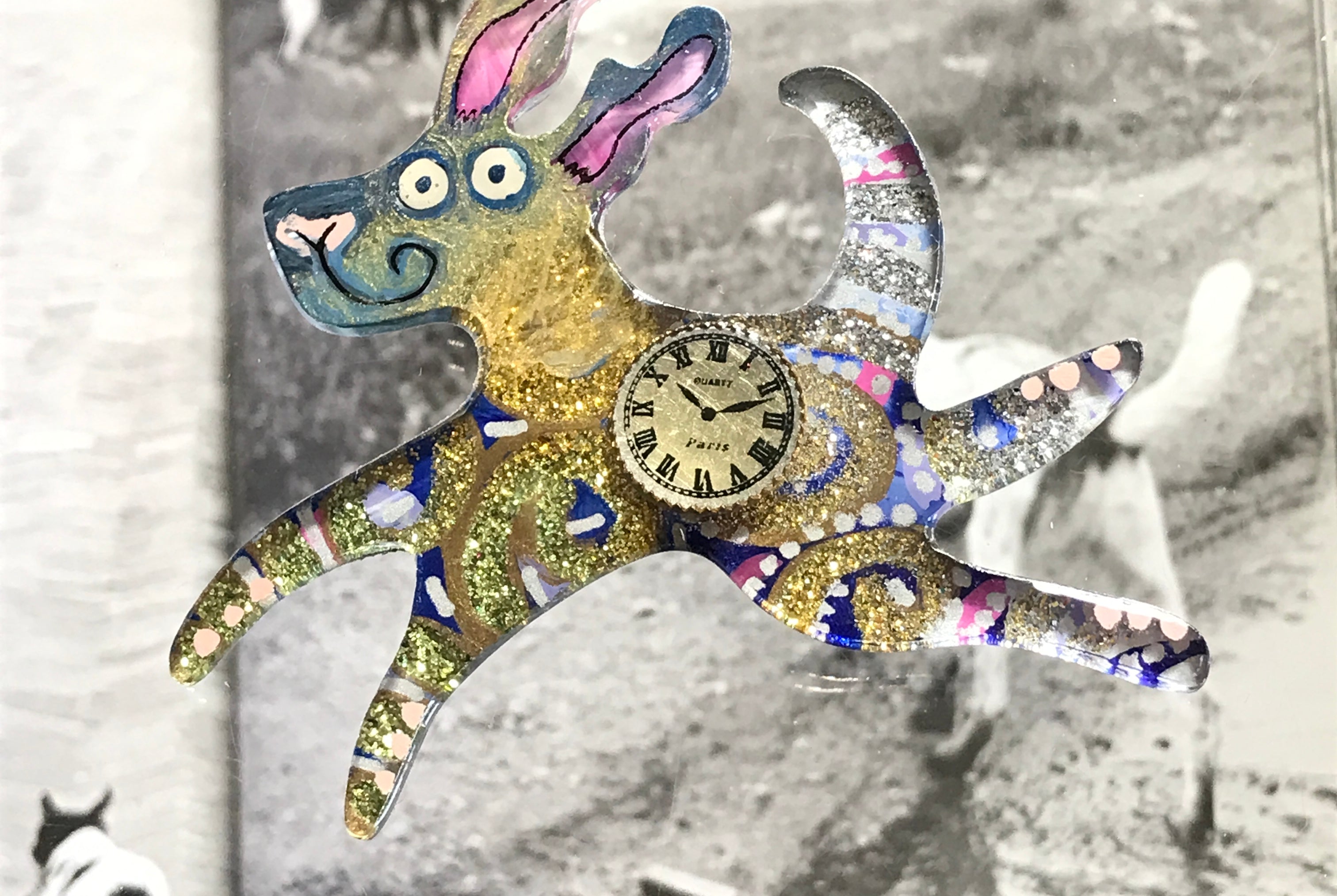 For me, these are little paintings that you can wear. If you are thinking of shrinky-dinks, I'm sure that was in my mind when I came up with lasercutting the shapes and then painting with the same paints I use on canvas. It's a multi layered process that takes a long time. The painting takes the longest, but it is the most rewarding. They are coated with a thick and sturdy glaze that brings out the depth and color.