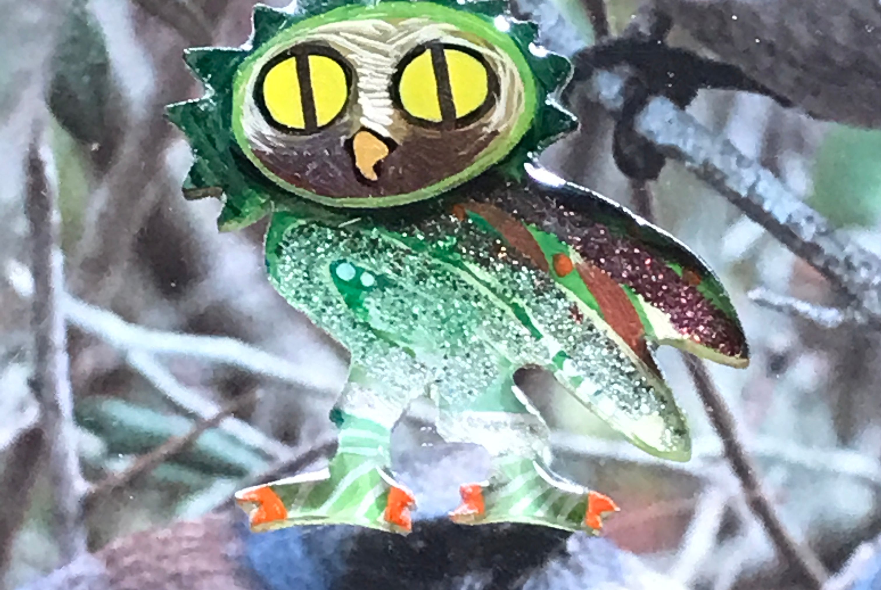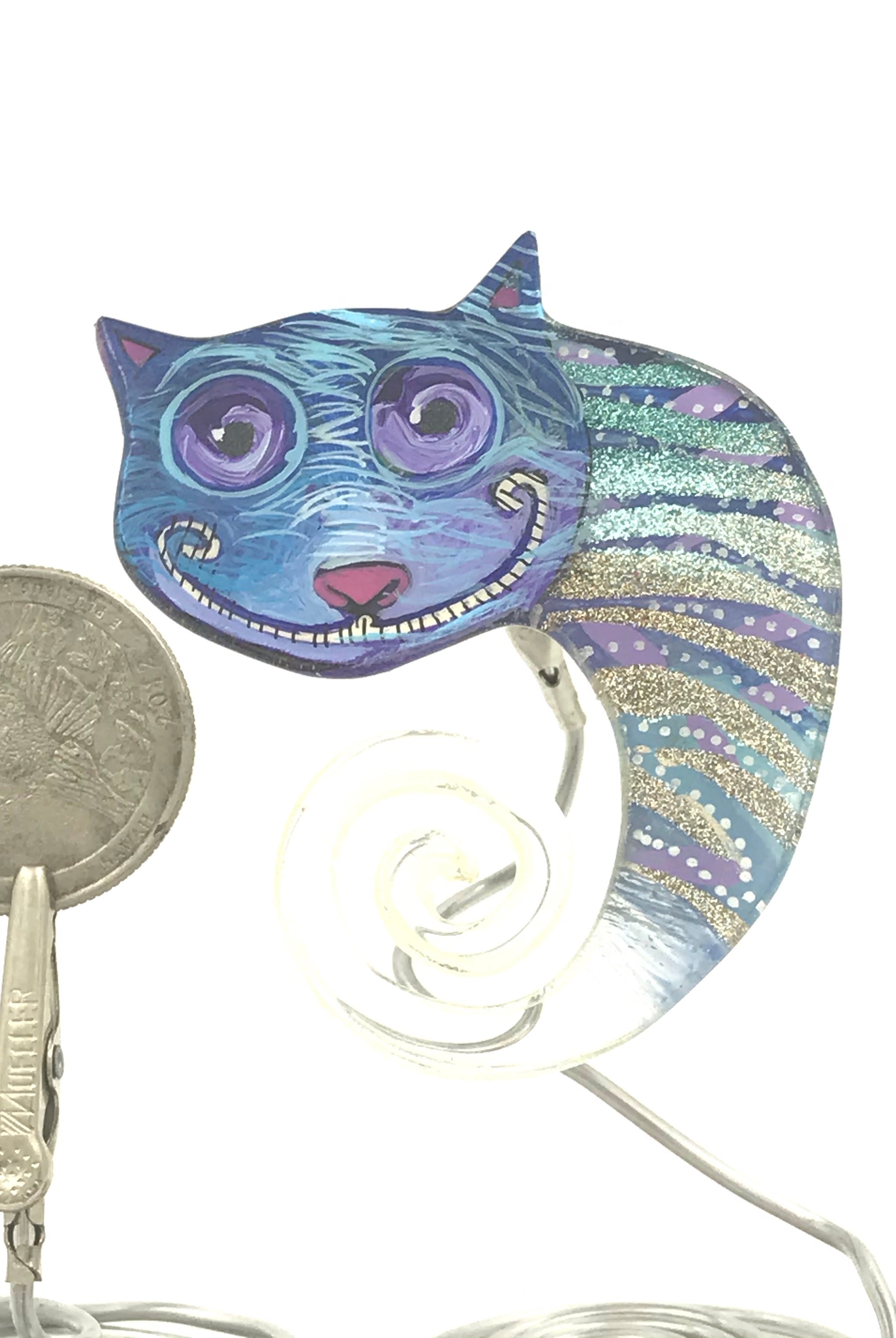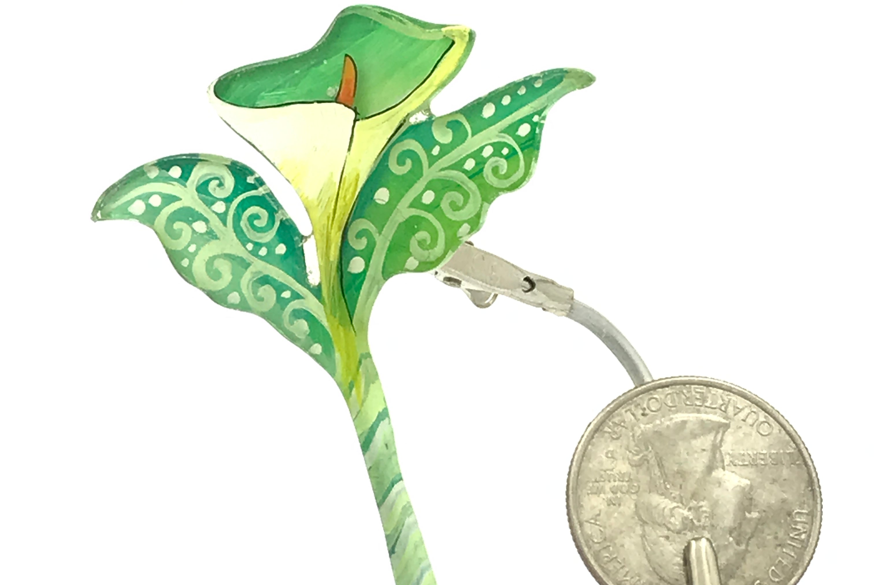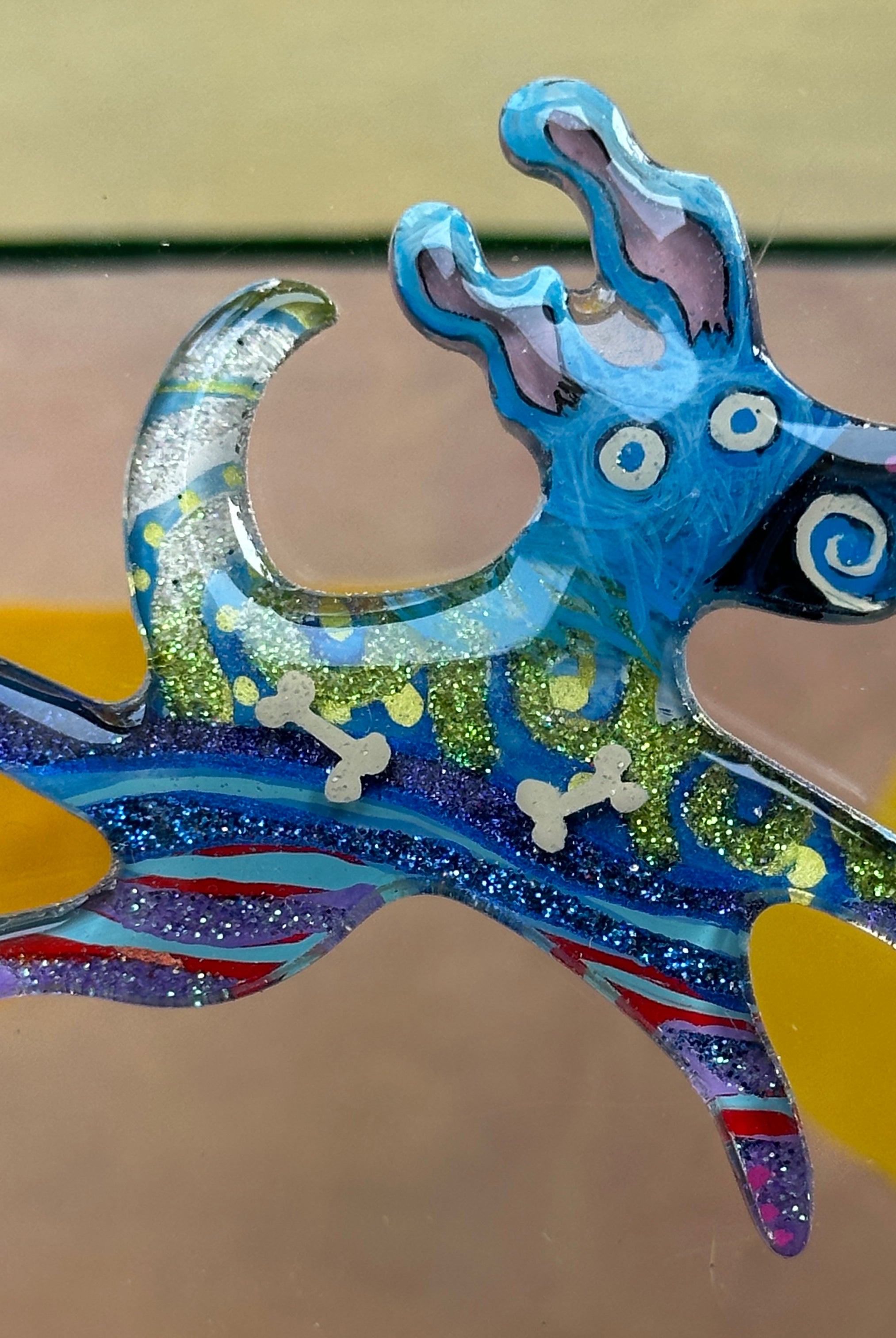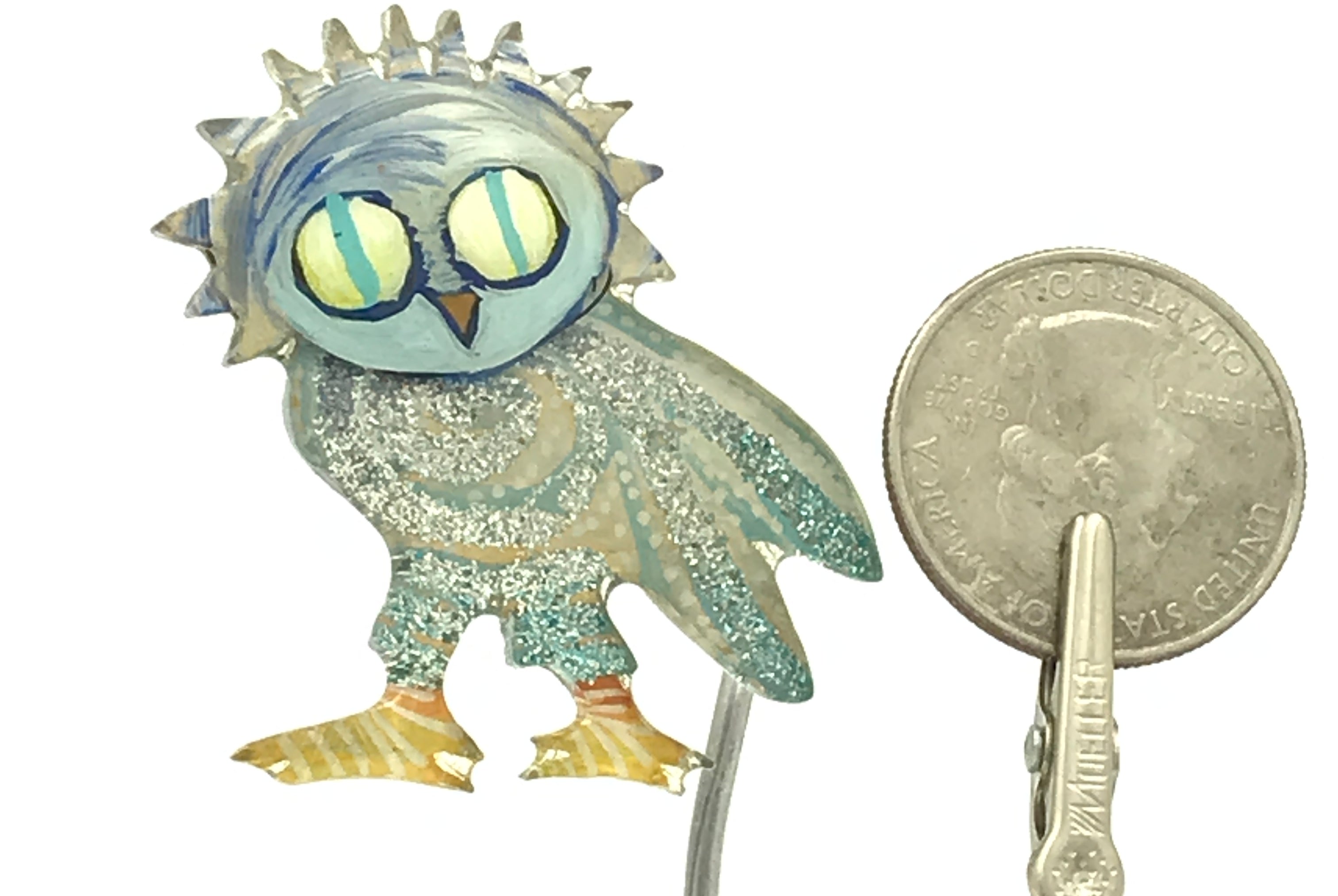 For me, these are little paintings that you can wear. If you are thinking of shrinky-dinks, I'm sure that was in my mind when I came up with lasercutting the shapes and then painting with the same paints I use on canvas. It's a multi layered process that takes a long time. The painting takes the longest, but it is the most rewarding. They are coated with a thick and sturdy glaze that brings out the depth and color.