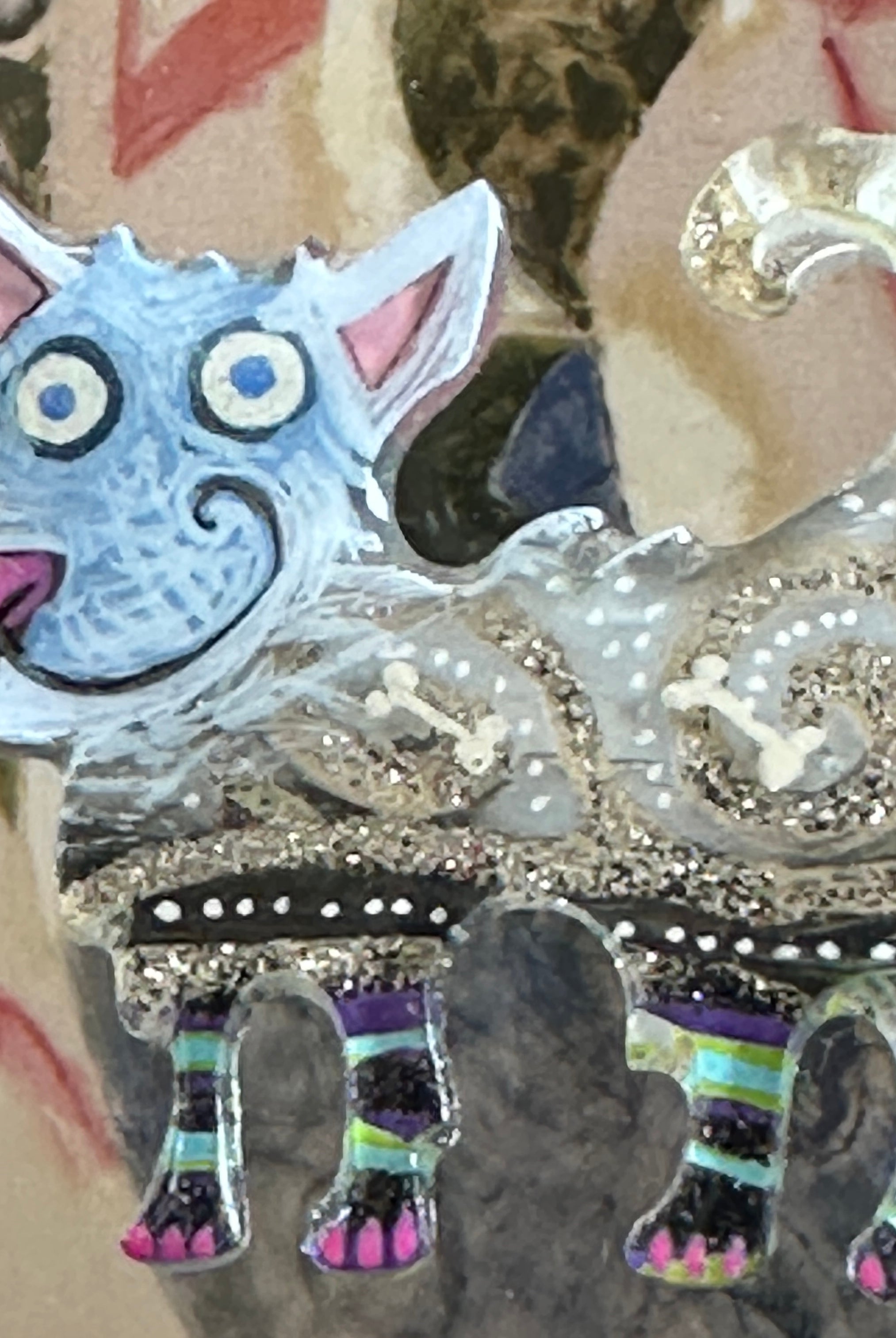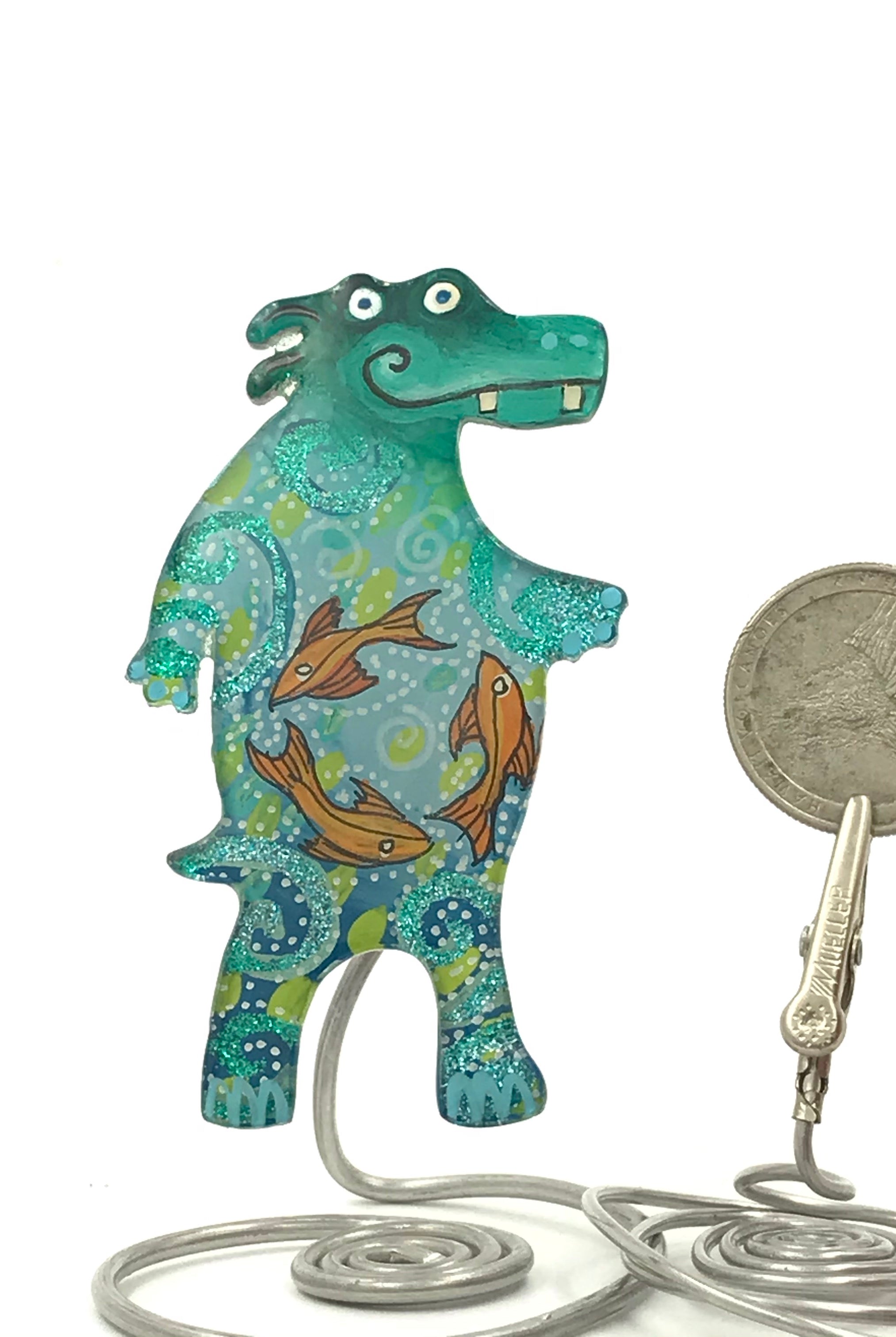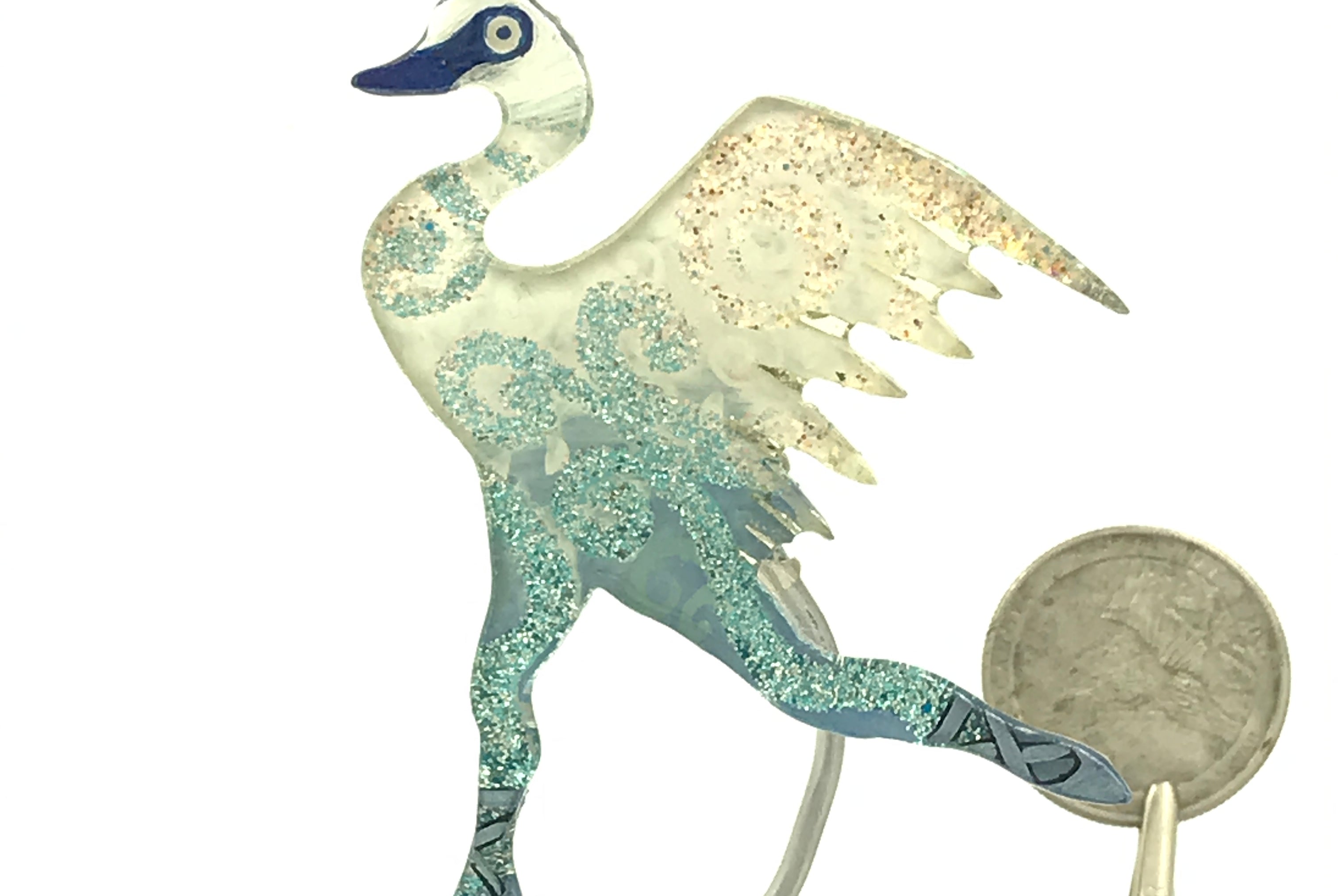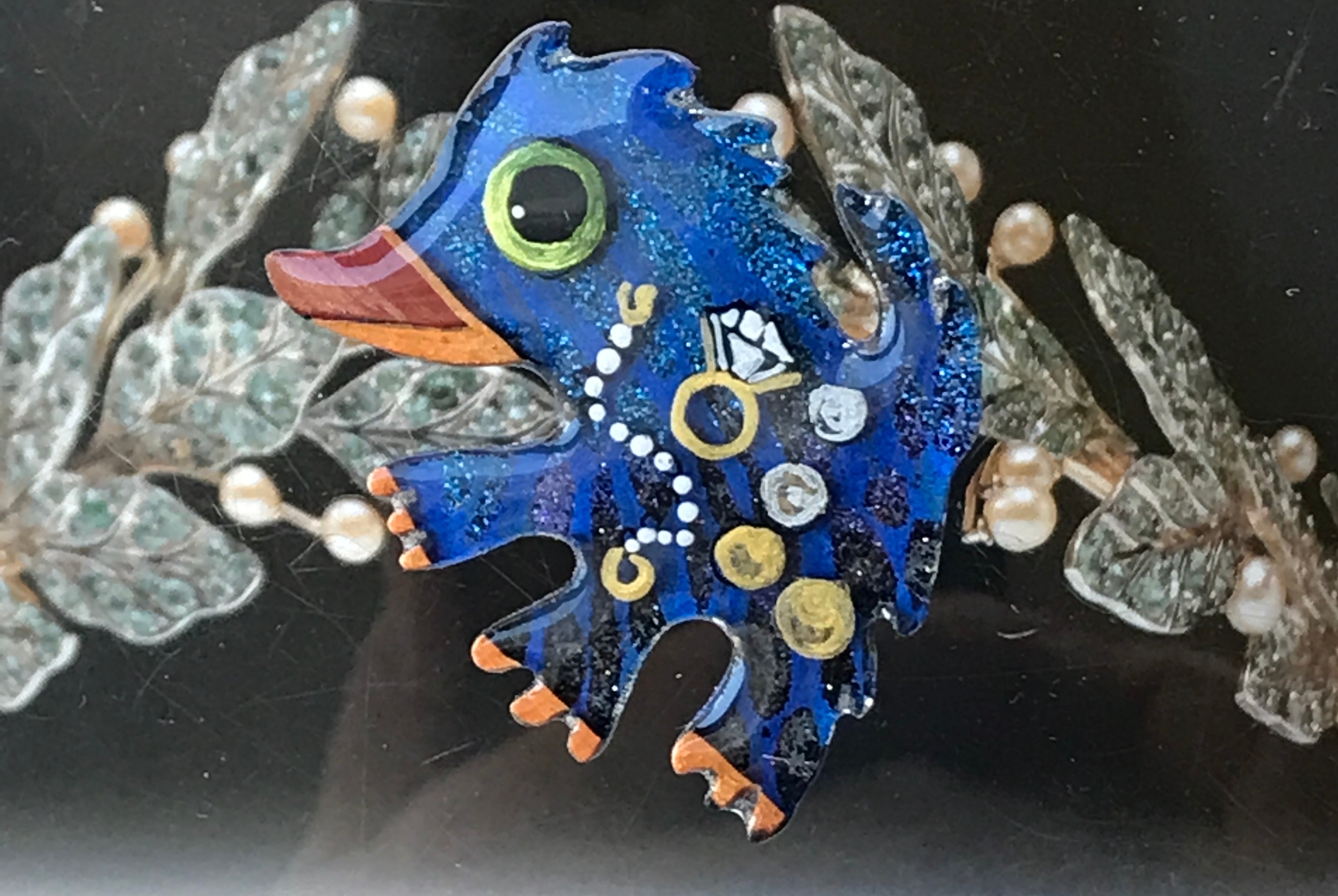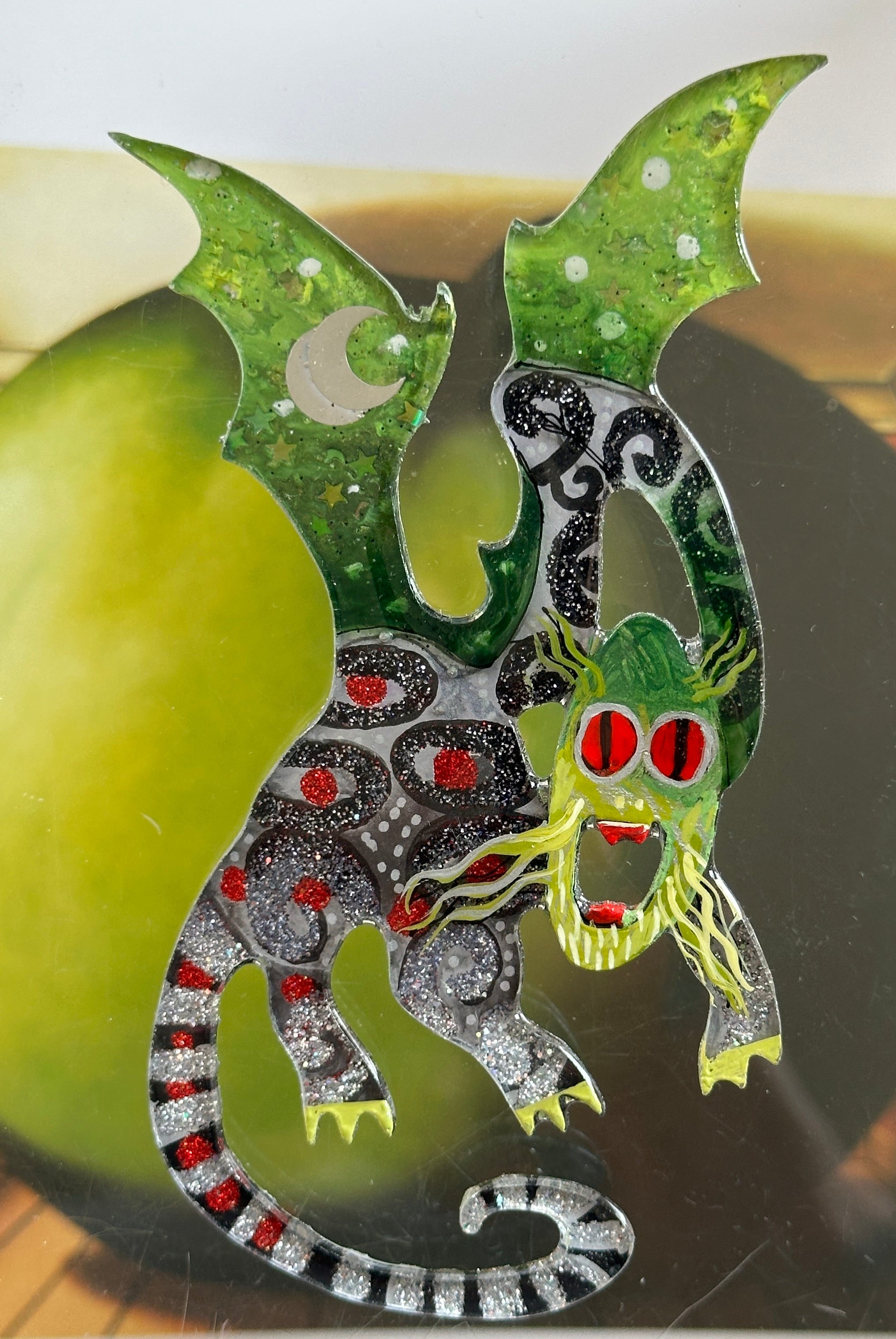 For me, these are little paintings that you can wear. If you are thinking of shrinky-dinks, I'm sure that was in my mind when I came up with lasercutting the shapes and then painting with the same paints I use on canvas. It's a multi layered process that takes a long time. The painting takes the longest, but it is the most rewarding. They are coated with a thick and sturdy glaze that brings out the depth and color.