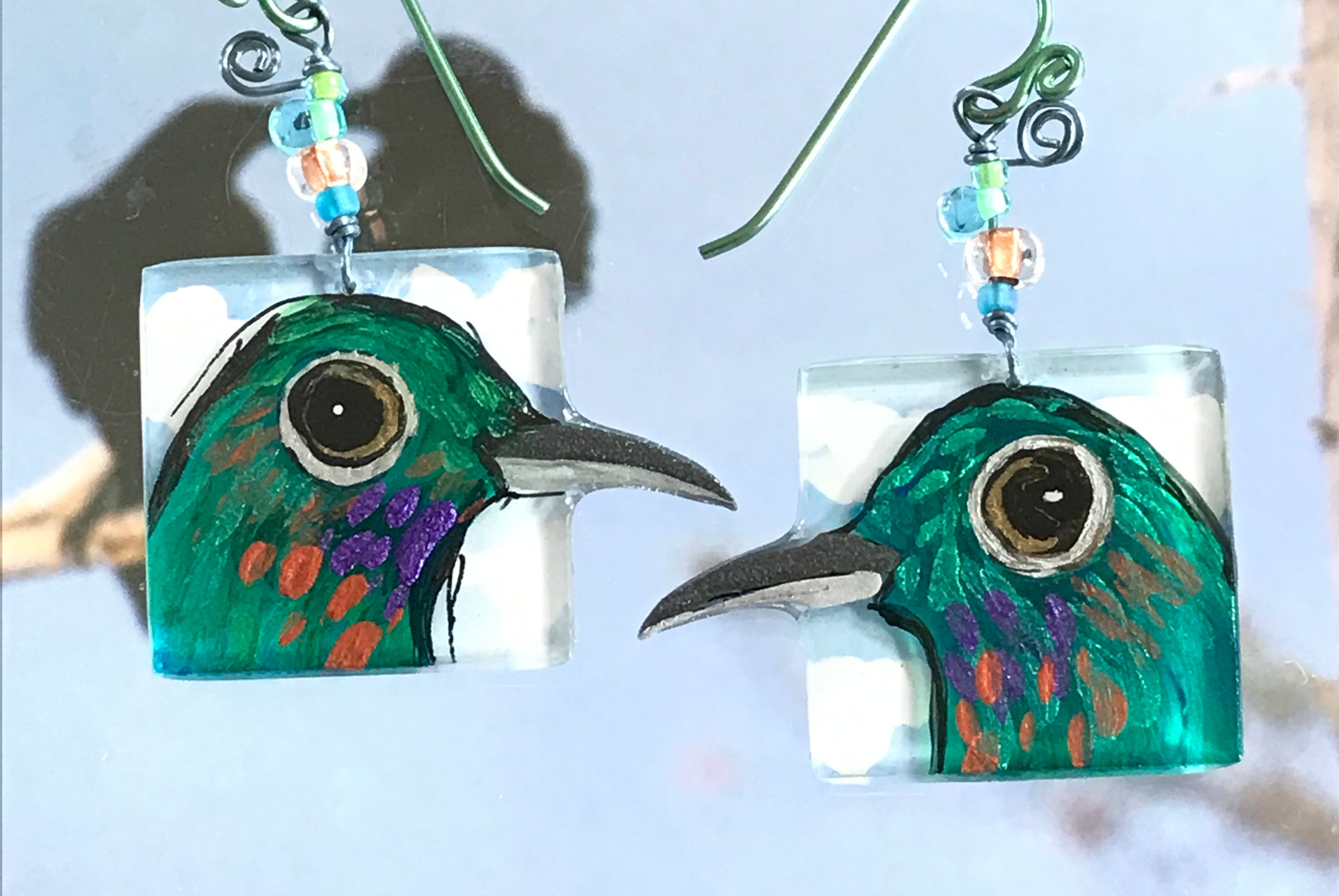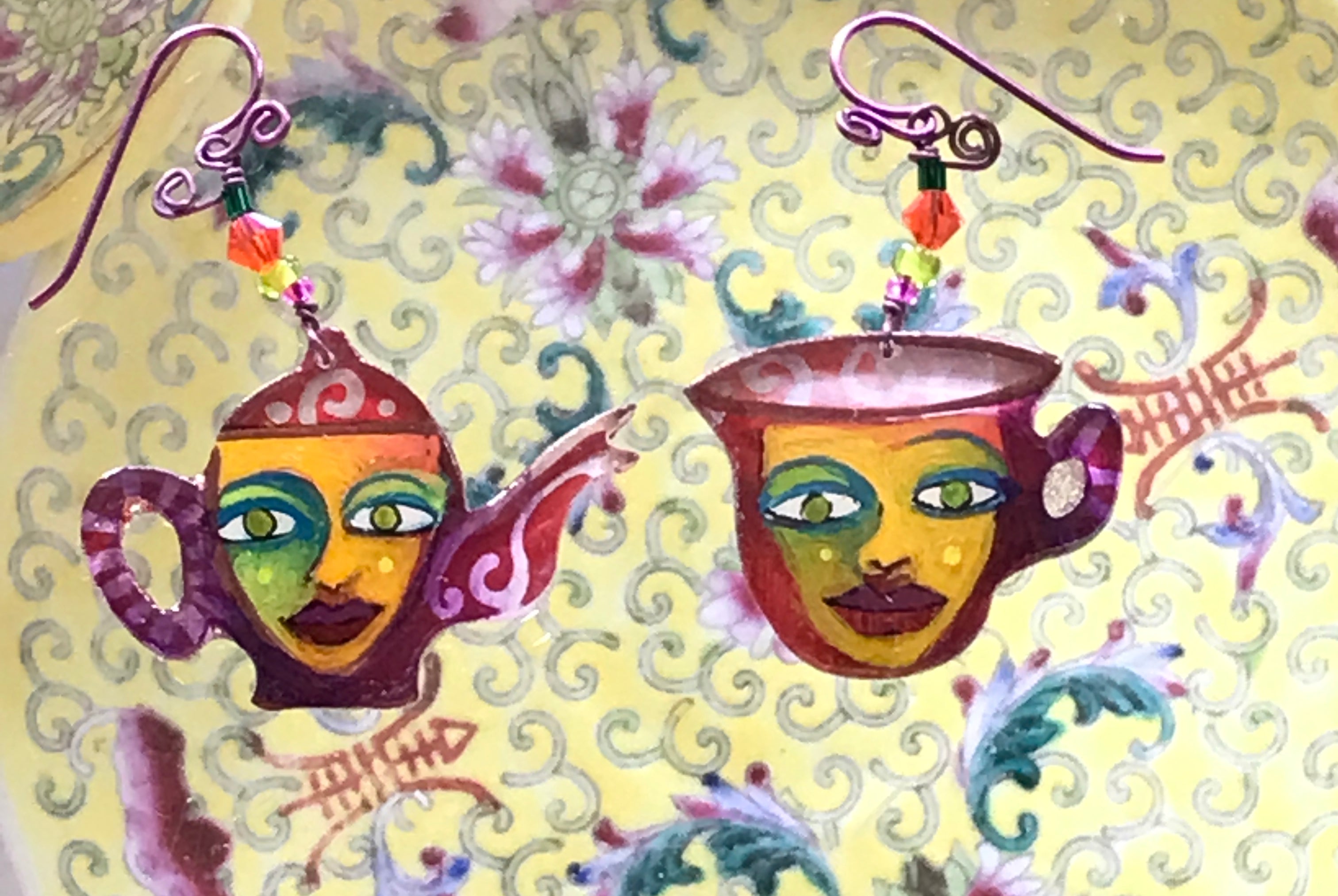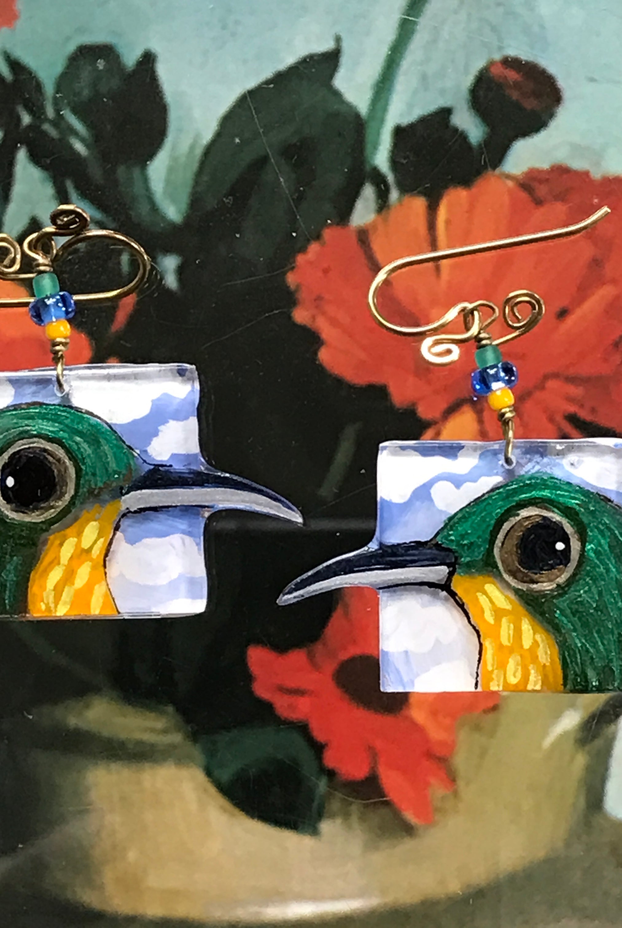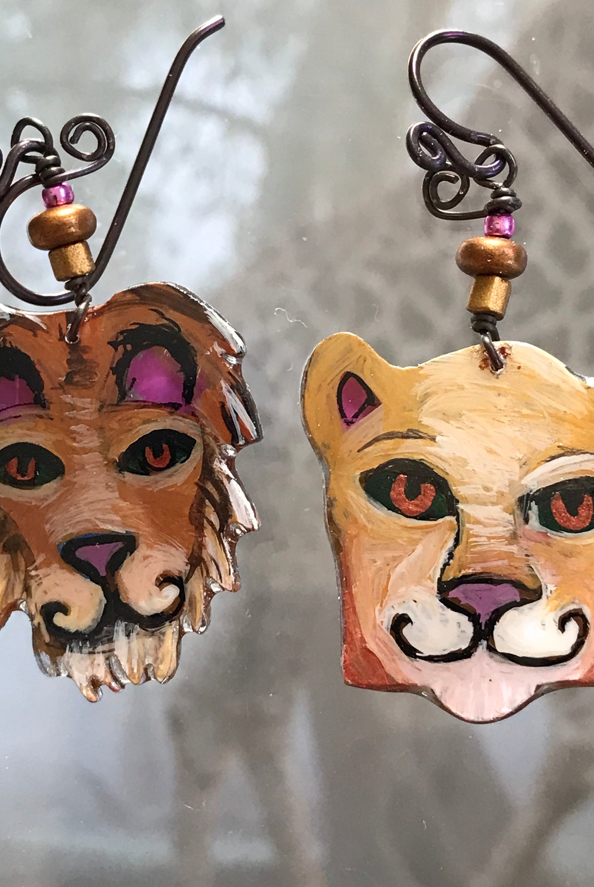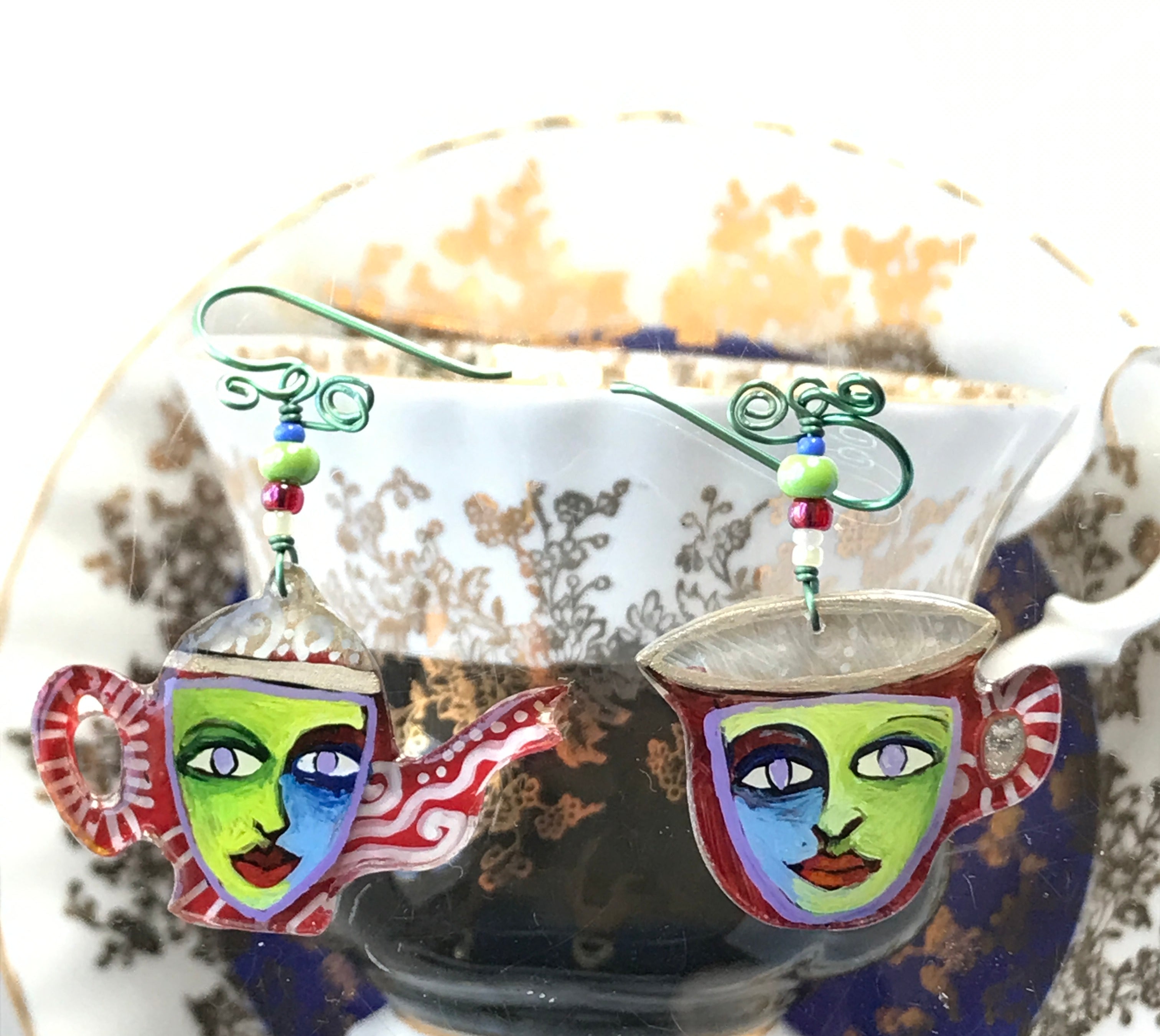 For me, these are little paintings that you can wear. If you are thinking of shrinky-dinks, I'm sure that was in my mind when I came up with lasercutting the shapes and then painting with the same paints I use on canvas. It's a multi layered process that takes a long time. The painting takes the longest, but it is the most rewarding. They are coated with a thick and sturdy glaze that brings out the depth and color.