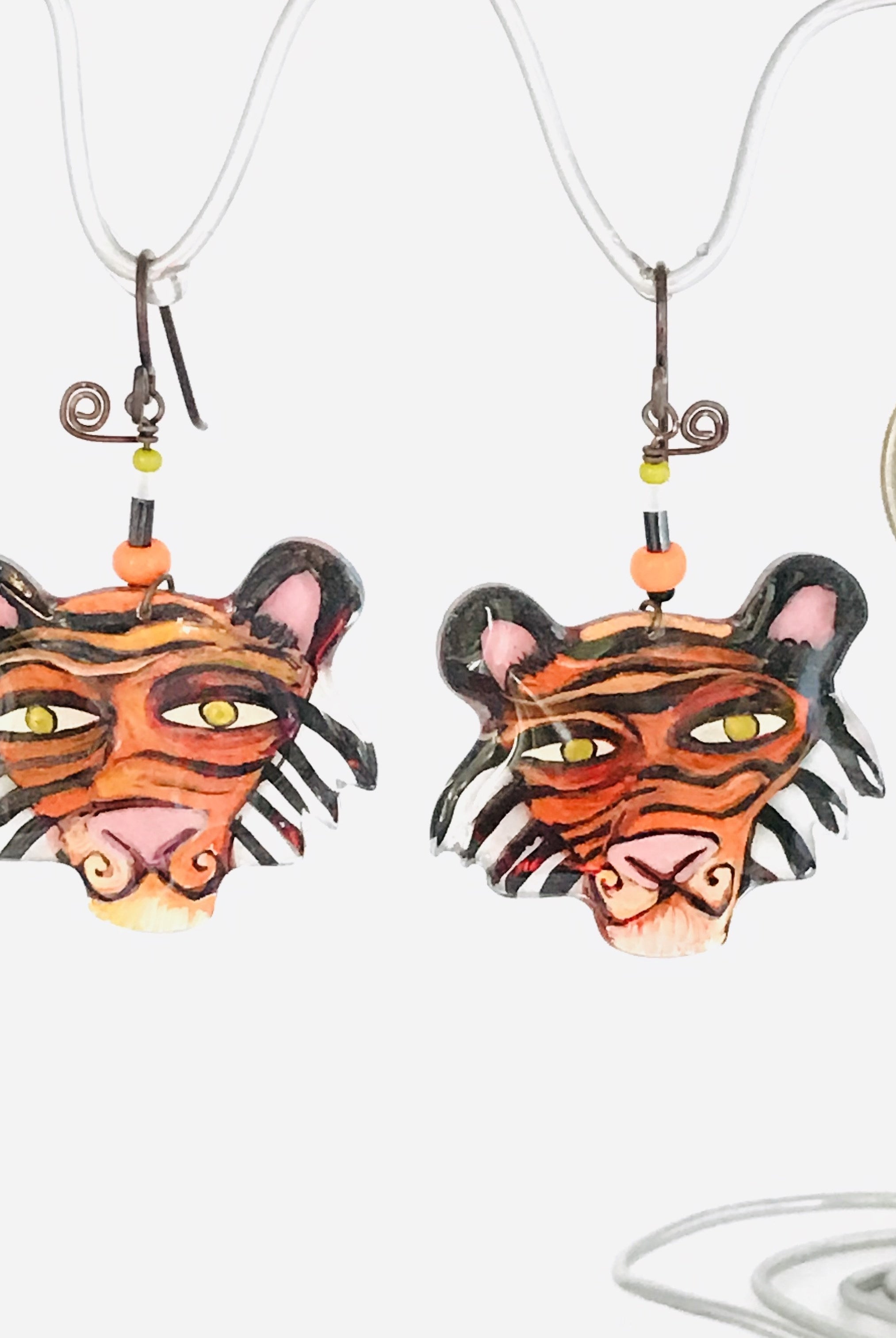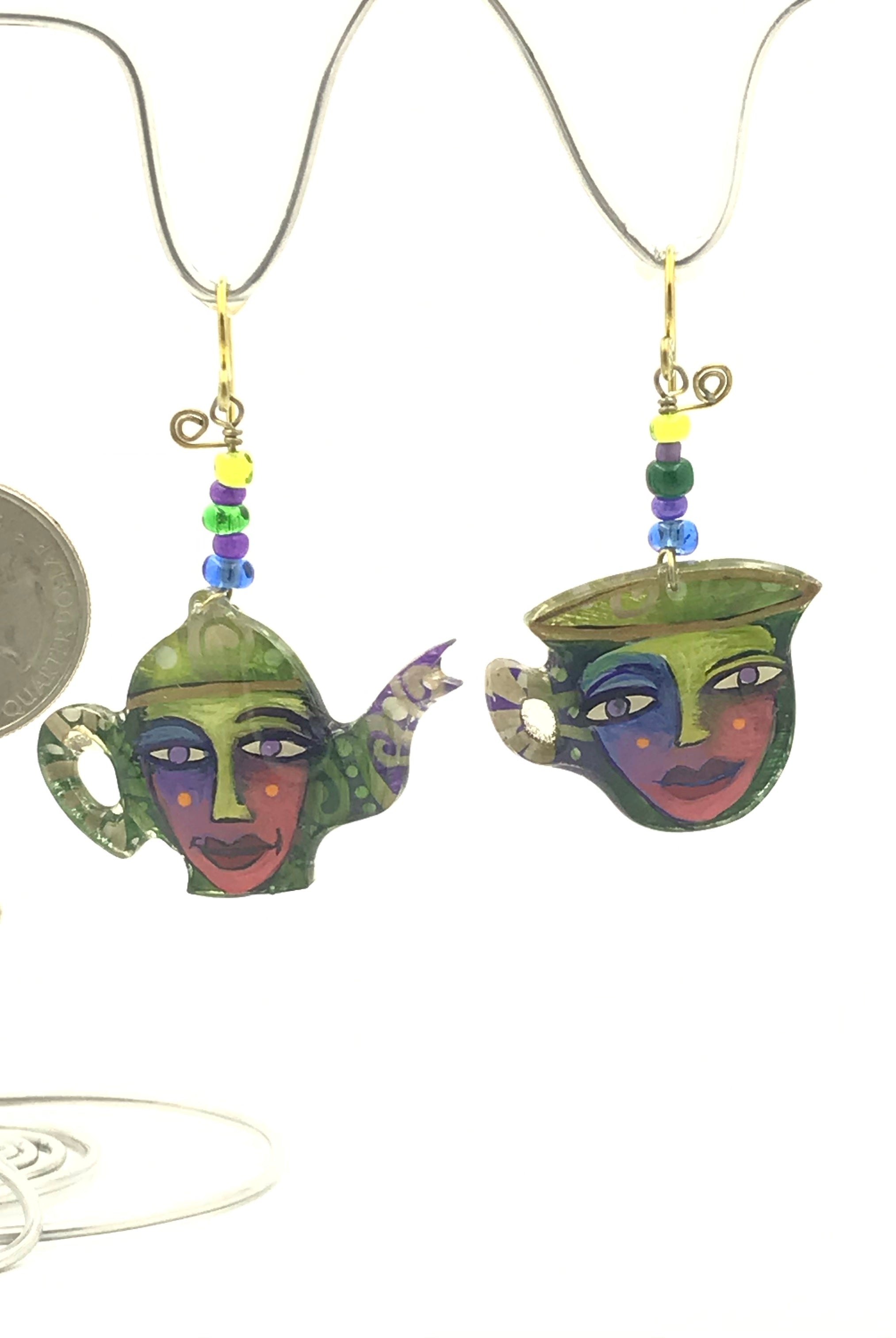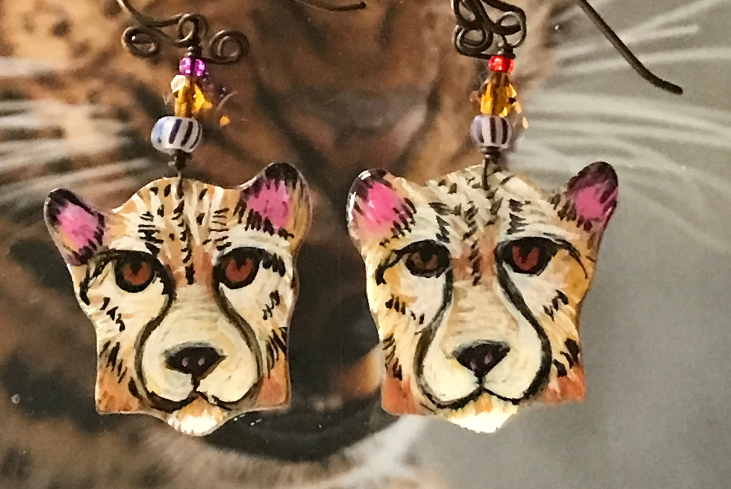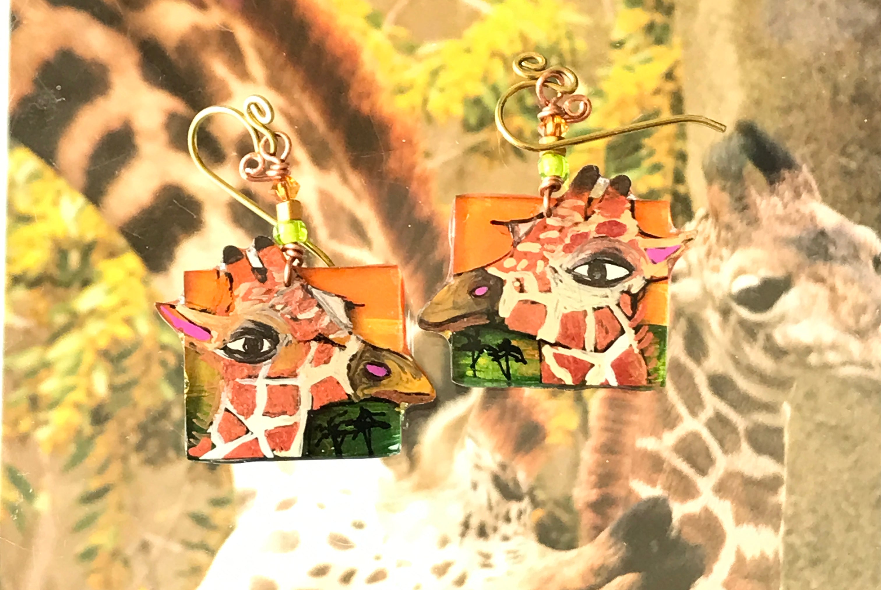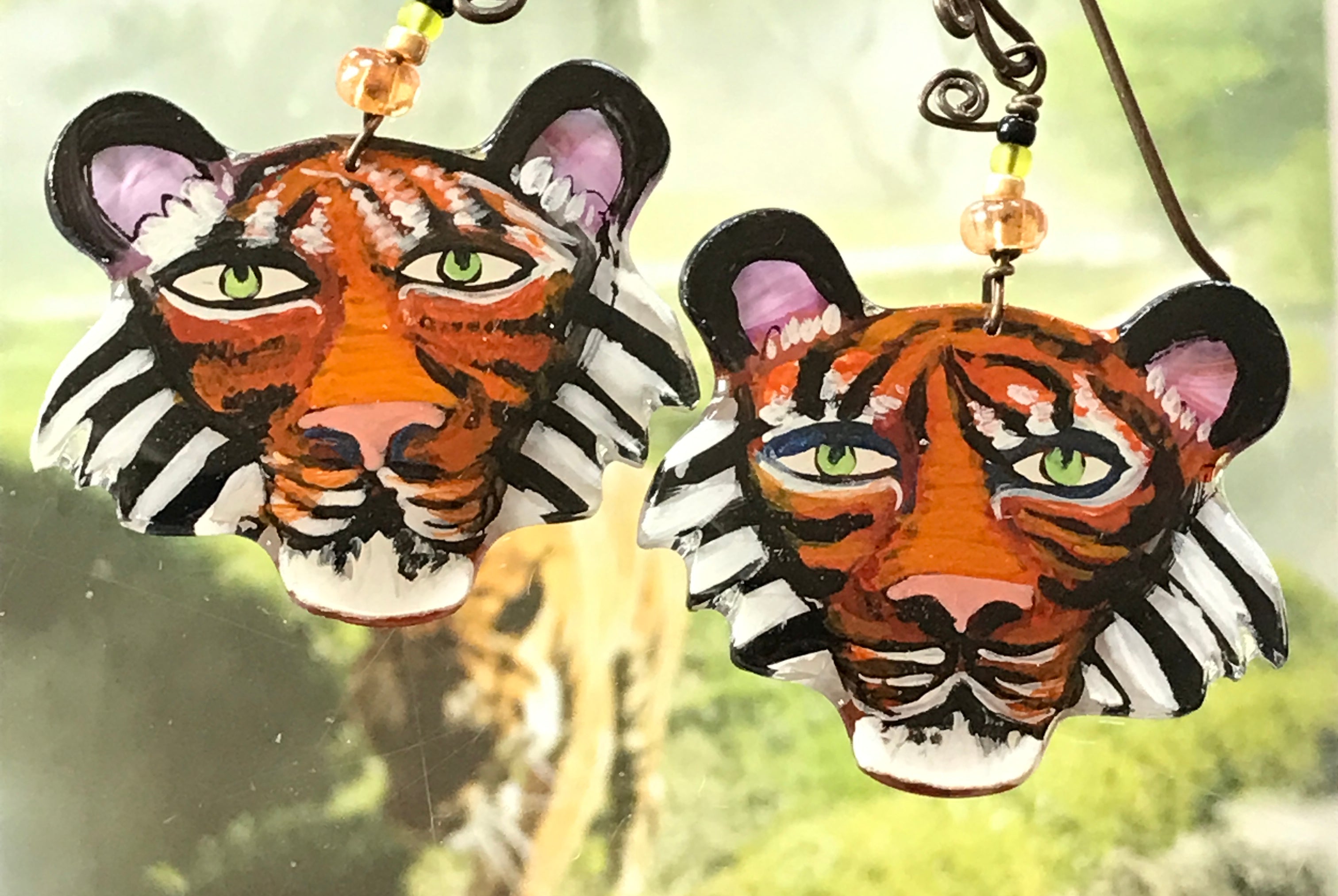 For me, these are little paintings that you can wear. If you are thinking of shrinky-dinks, I'm sure that was in my mind when I came up with lasercutting the shapes and then painting with the same paints I use on canvas. It's a multi layered process that takes a long time. The painting takes the longest, but it is the most rewarding. They are coated with a thick and sturdy glaze that brings out the depth and color.