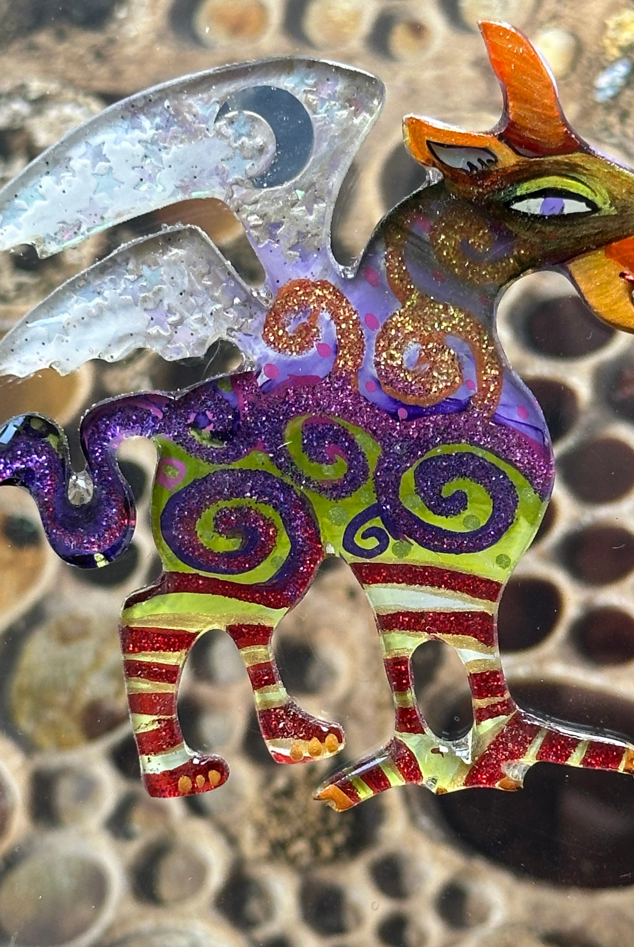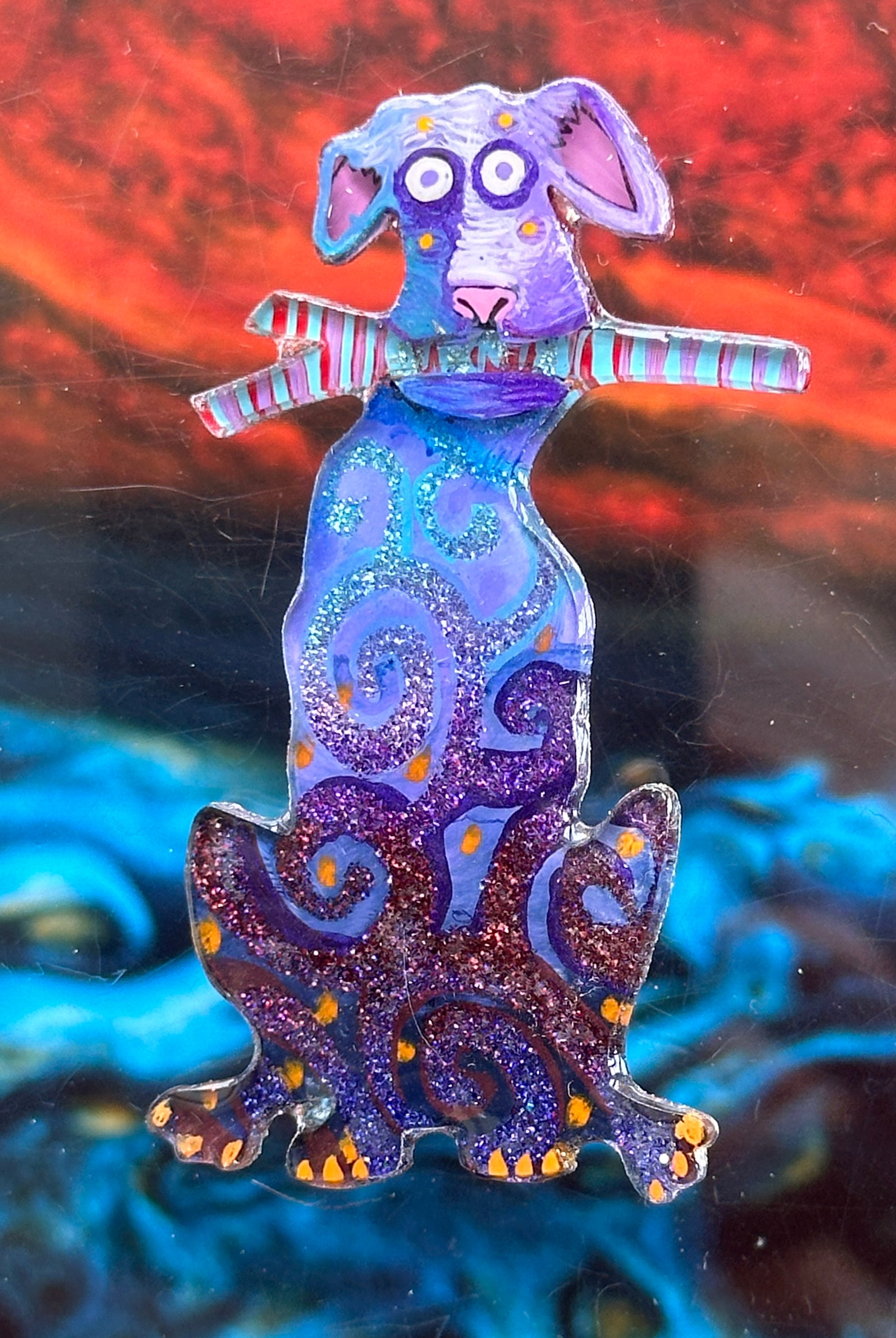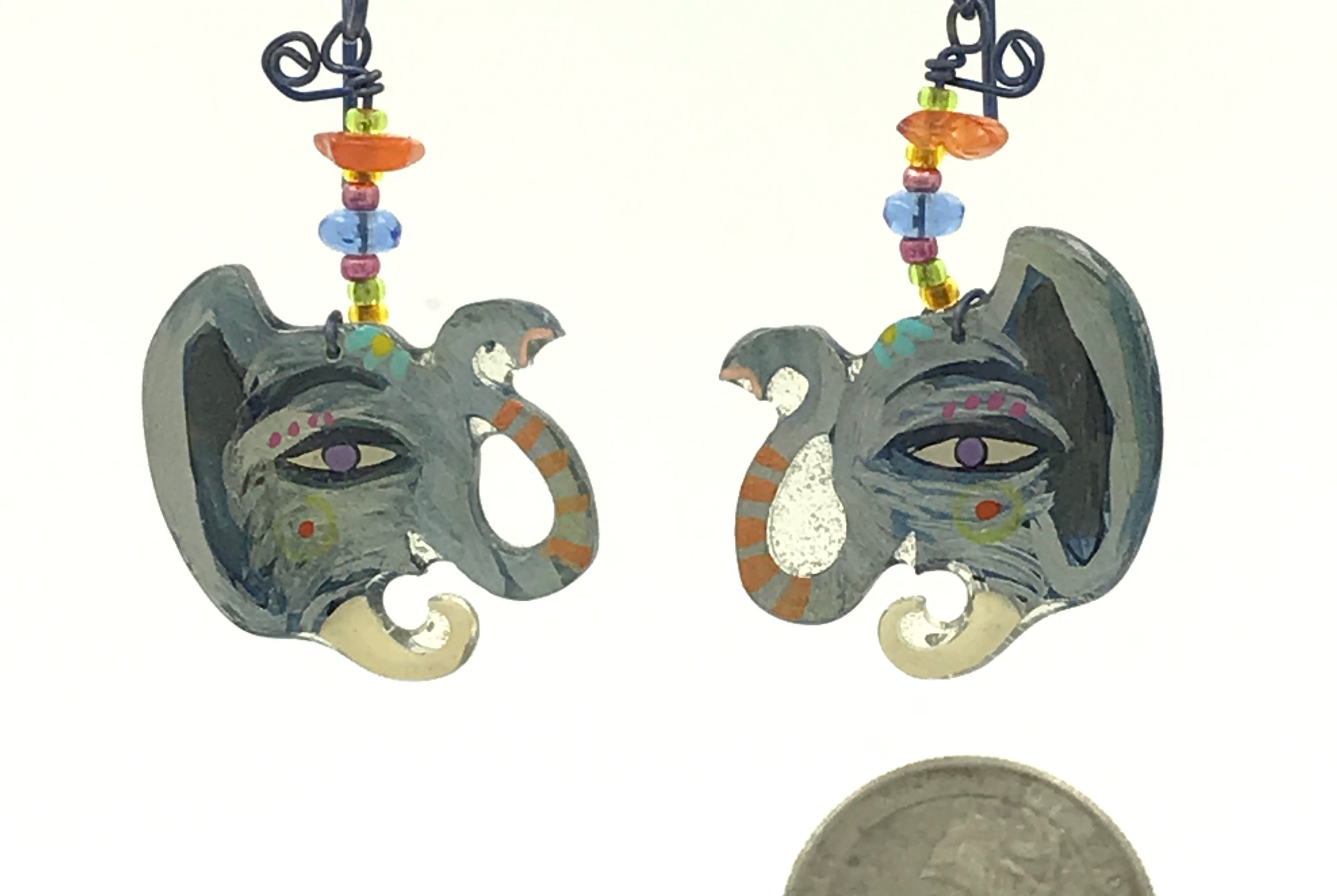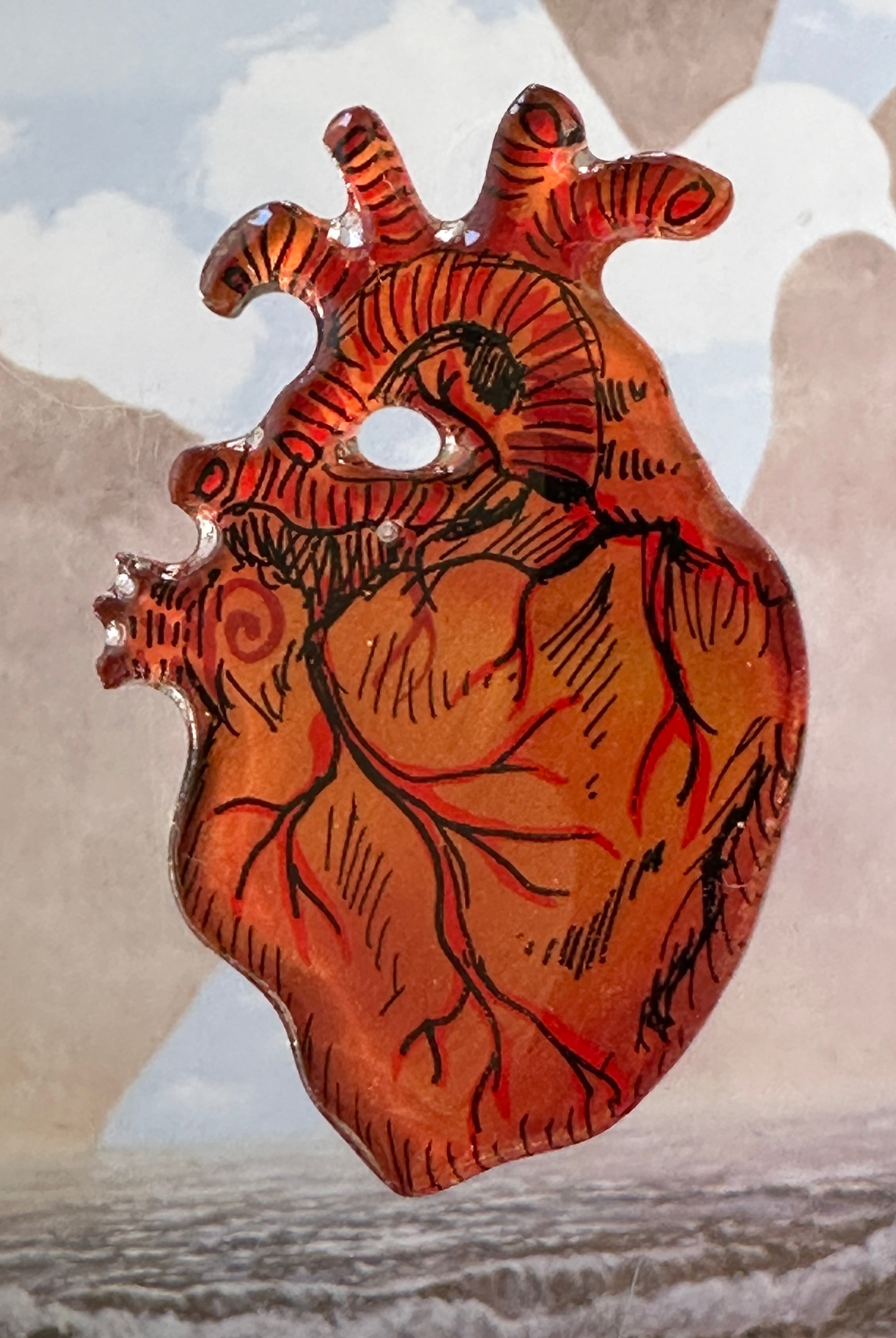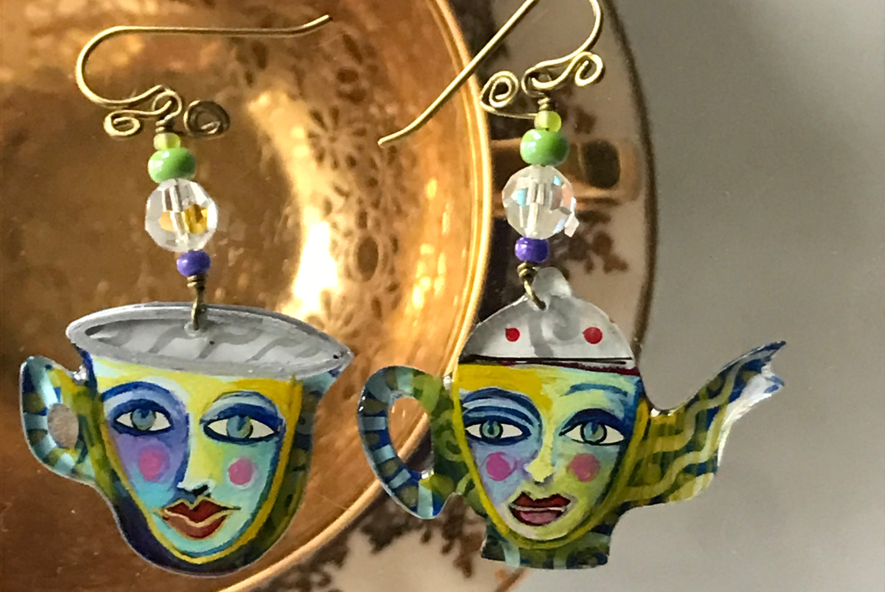 For me, these are little paintings that you can wear. If you are thinking of shrinky-dinks, I'm sure that was in my mind when I came up with lasercutting the shapes and then painting with the same paints I use on canvas. It's a multi layered process that takes a long time. The painting takes the longest, but it is the most rewarding. They are coated with a thick and sturdy glaze that brings out the depth and color.