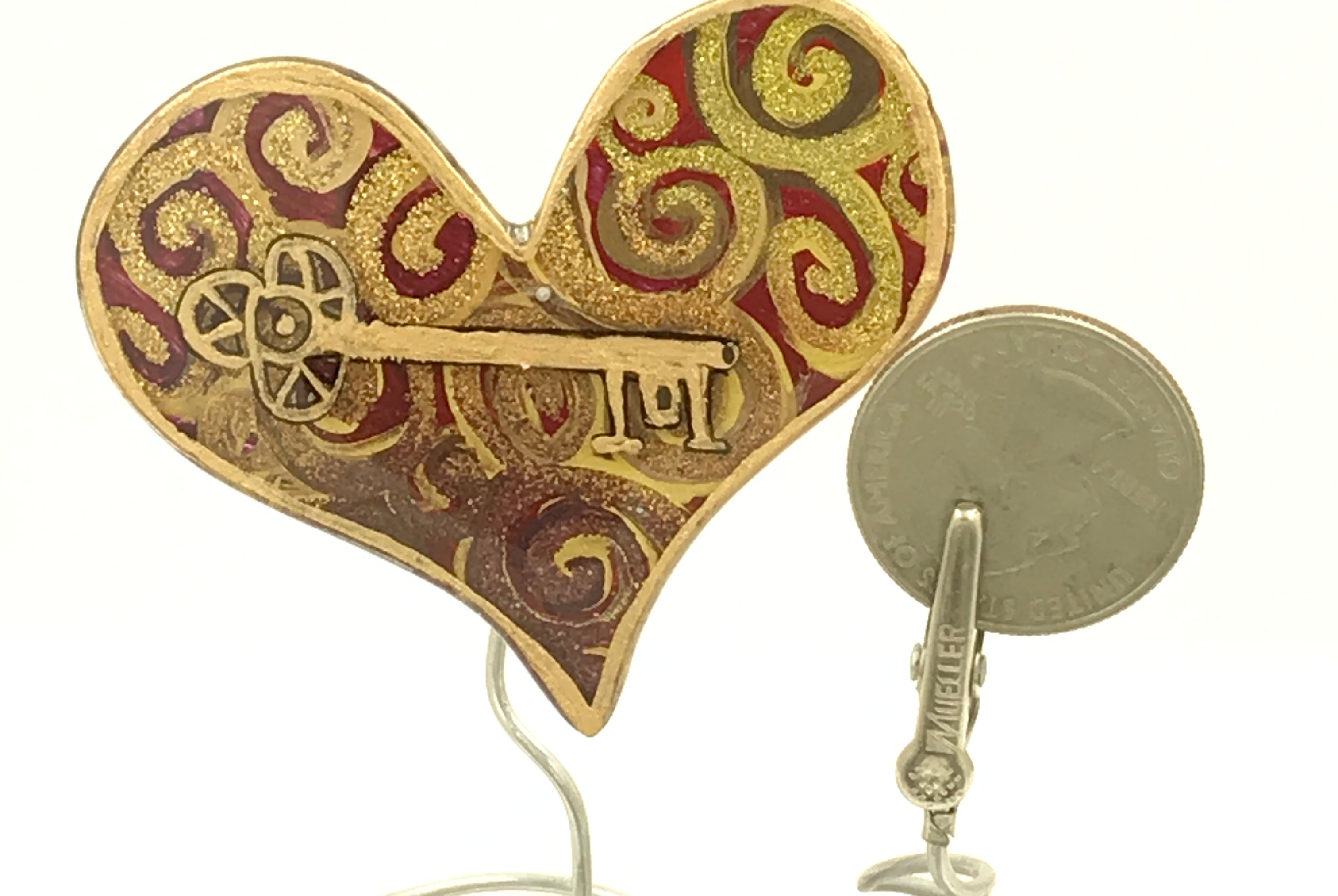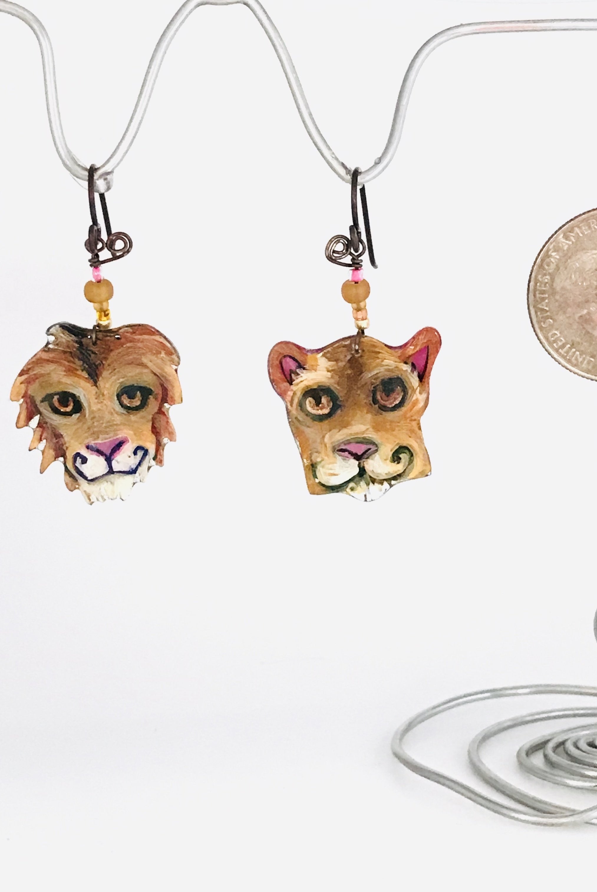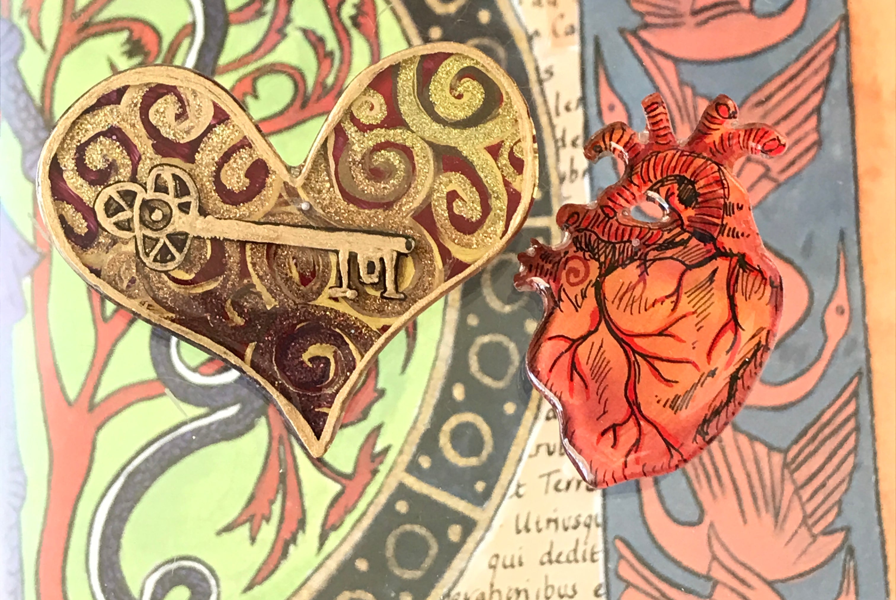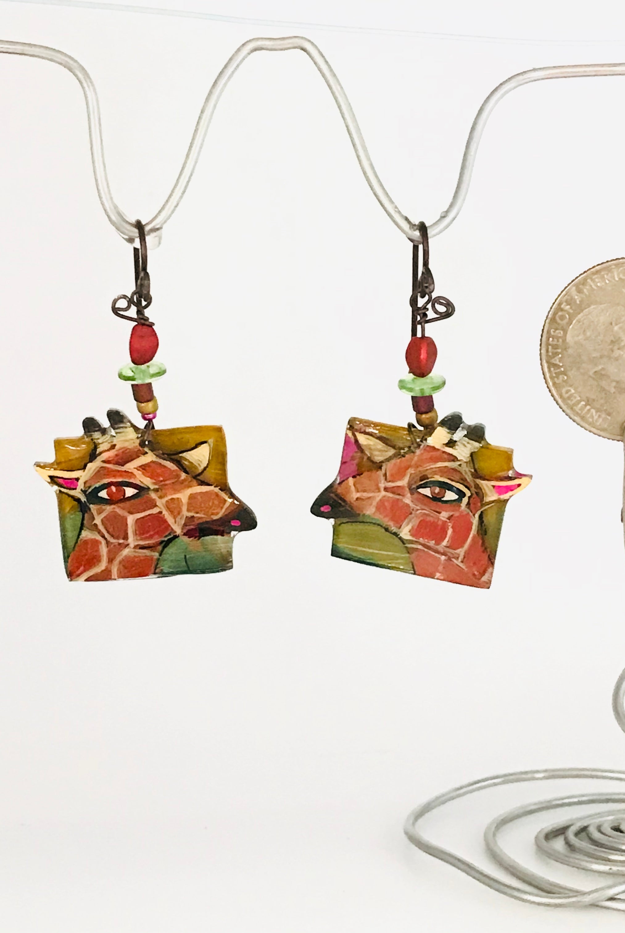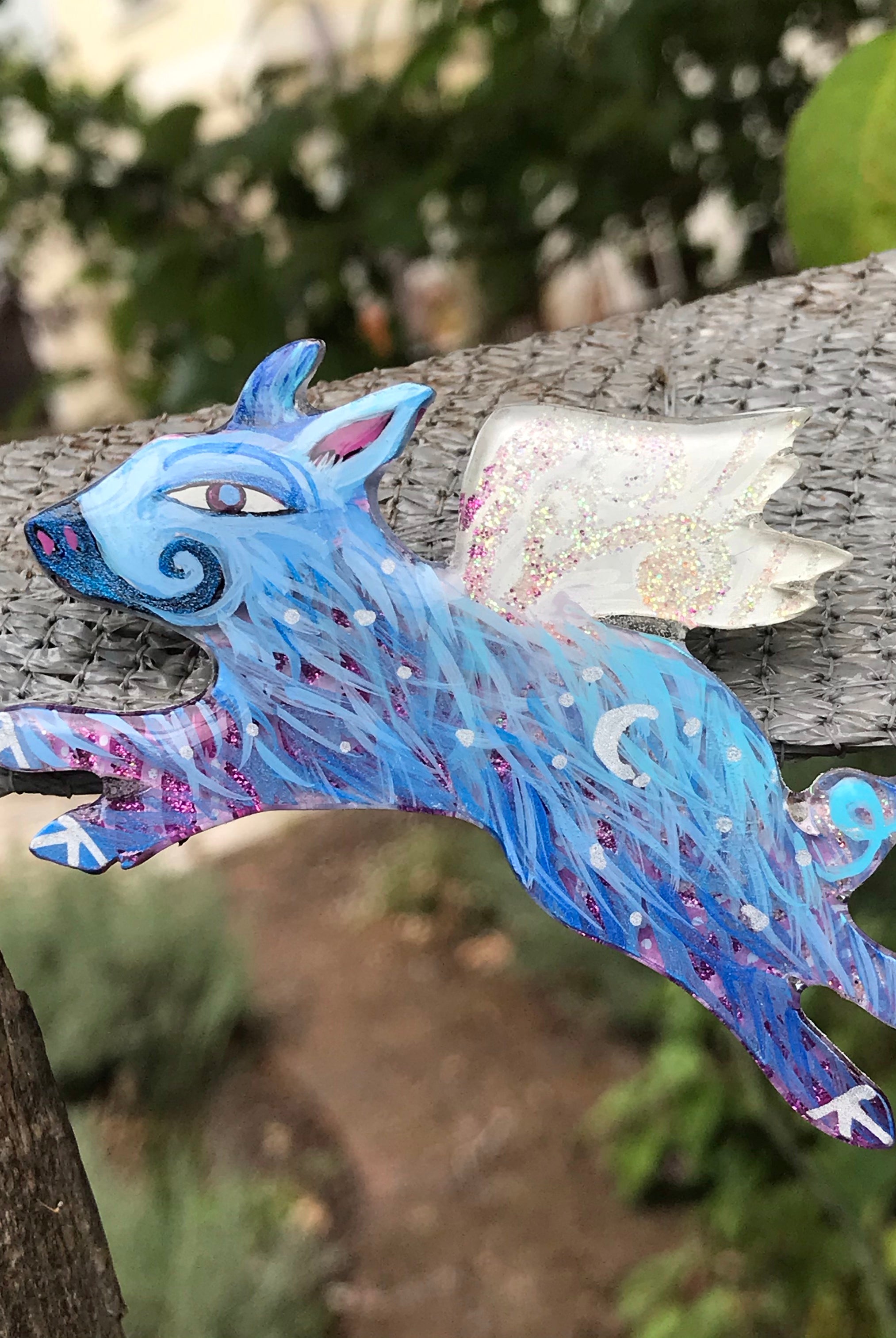 For me, these are little paintings that you can wear. If you are thinking of shrinky-dinks, I'm sure that was in my mind when I came up with lasercutting the shapes and then painting with the same paints I use on canvas. It's a multi layered process that takes a long time. The painting takes the longest, but it is the most rewarding. They are coated with a thick and sturdy glaze that brings out the depth and color.