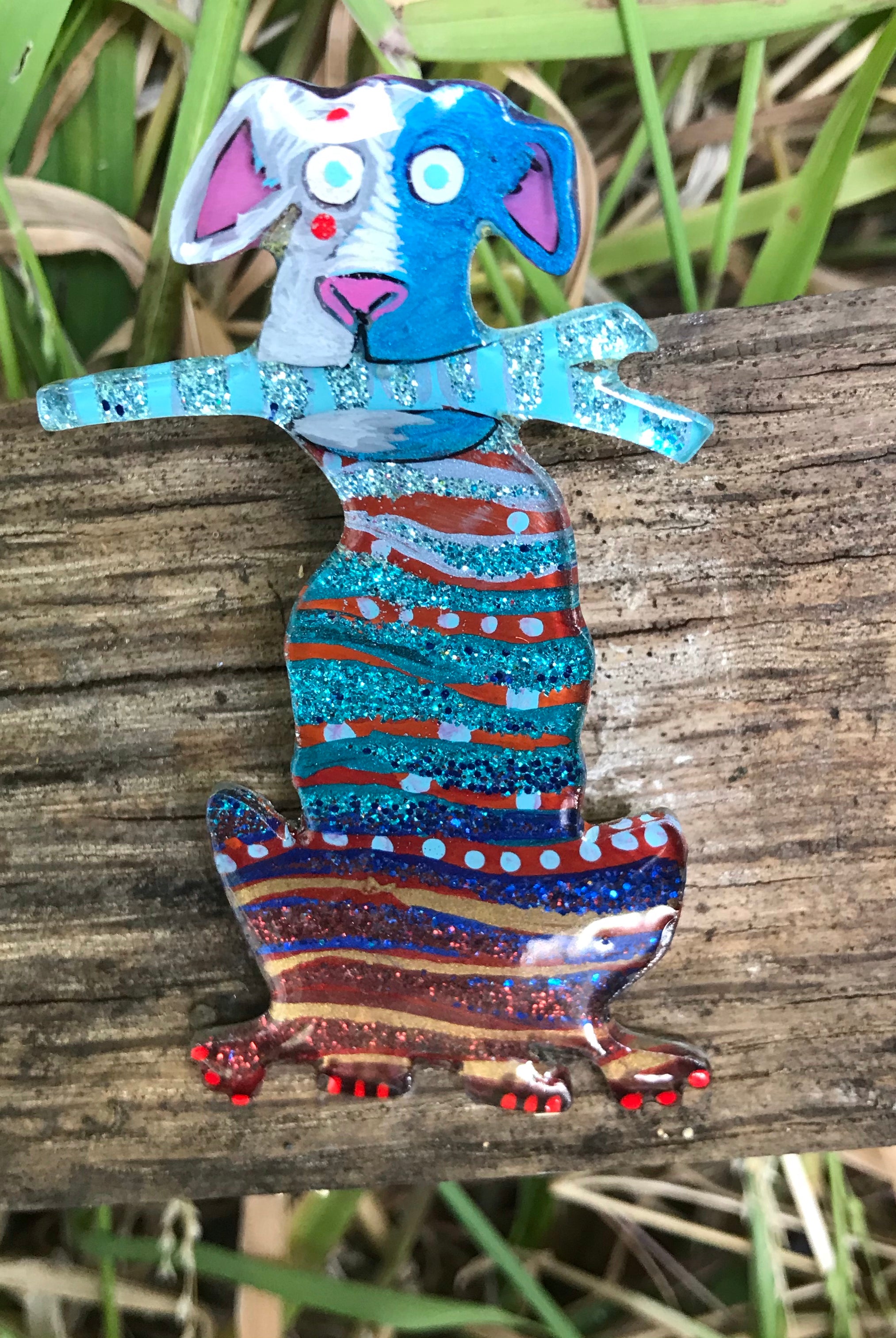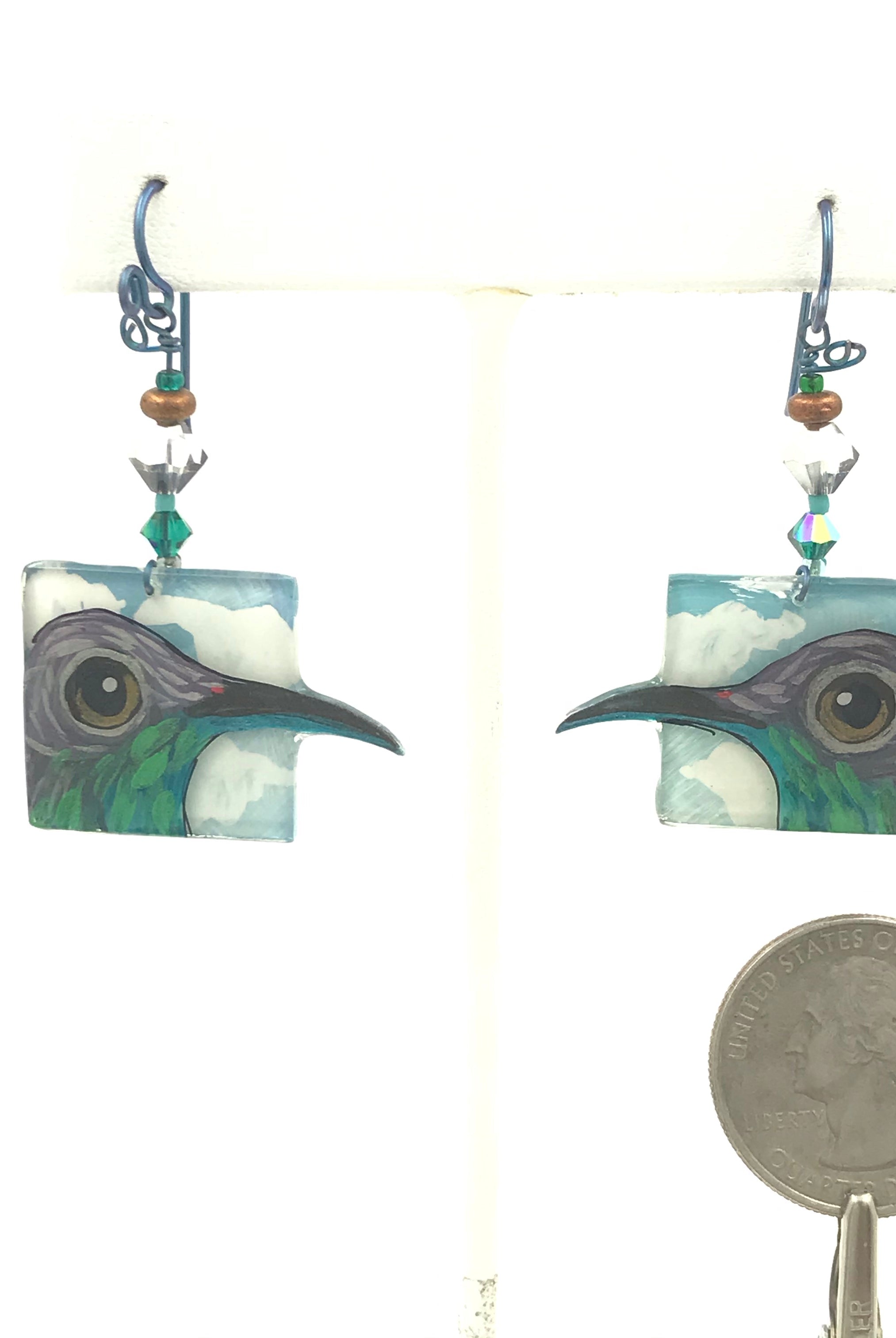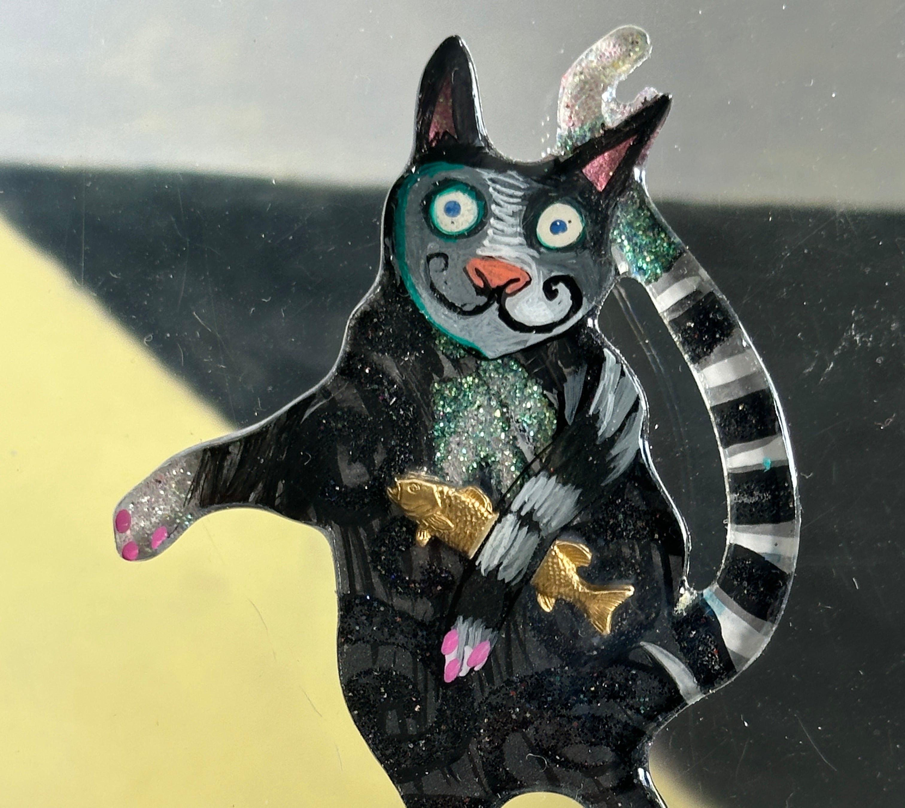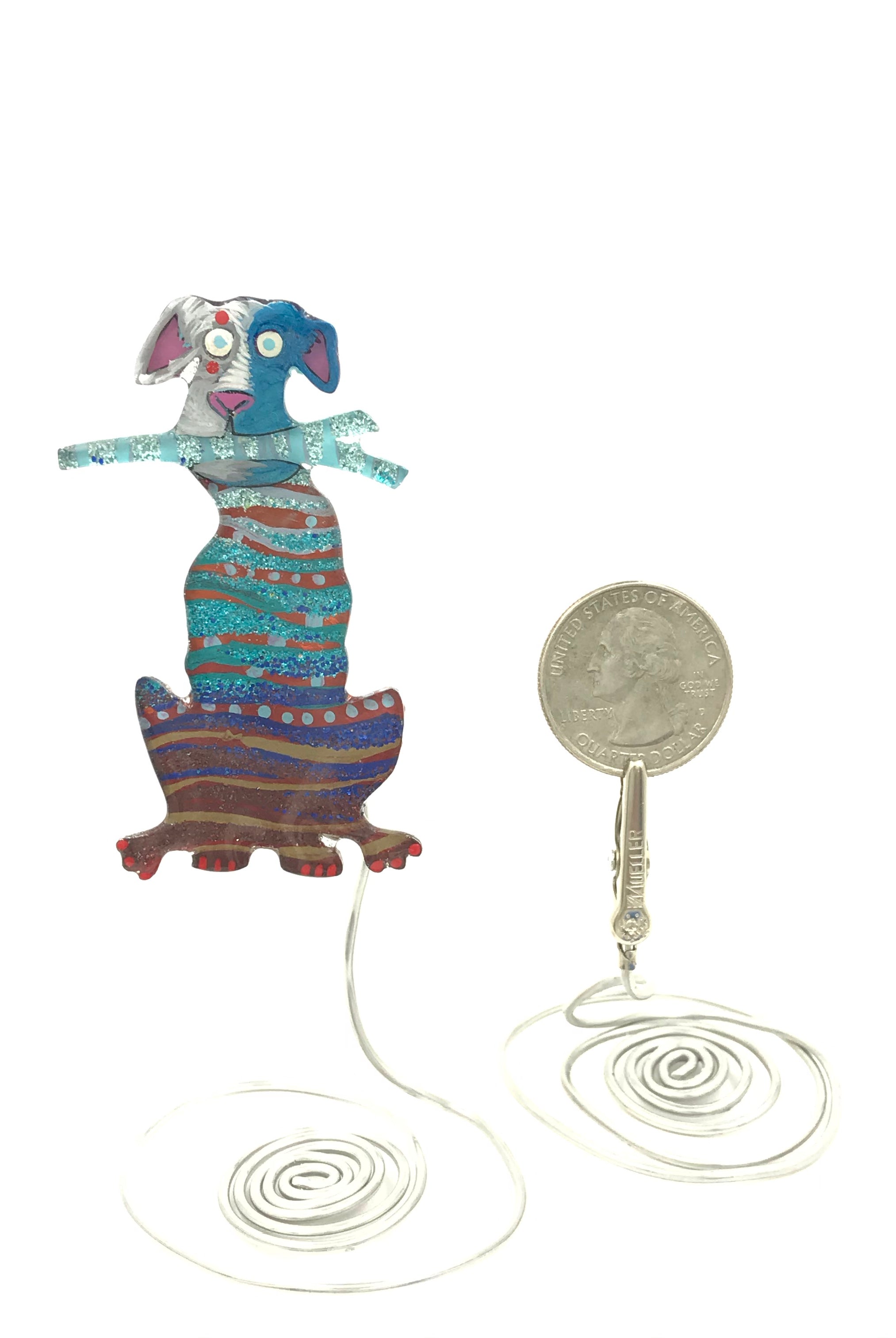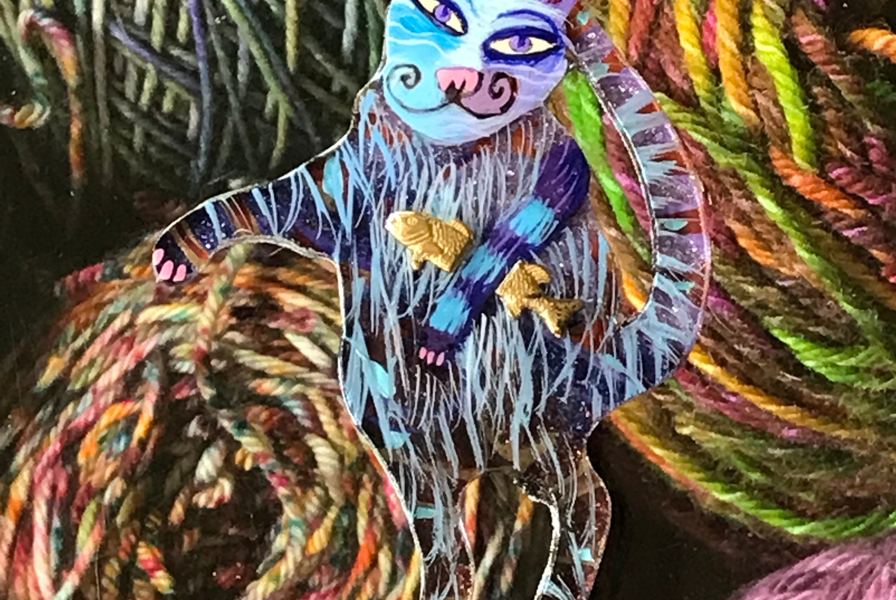 For me, these are little paintings that you can wear. If you are thinking of shrinky-dinks, I'm sure that was in my mind when I came up with lasercutting the shapes and then painting with the same paints I use on canvas. It's a multi layered process that takes a long time. The painting takes the longest, but it is the most rewarding. They are coated with a thick and sturdy glaze that brings out the depth and color.